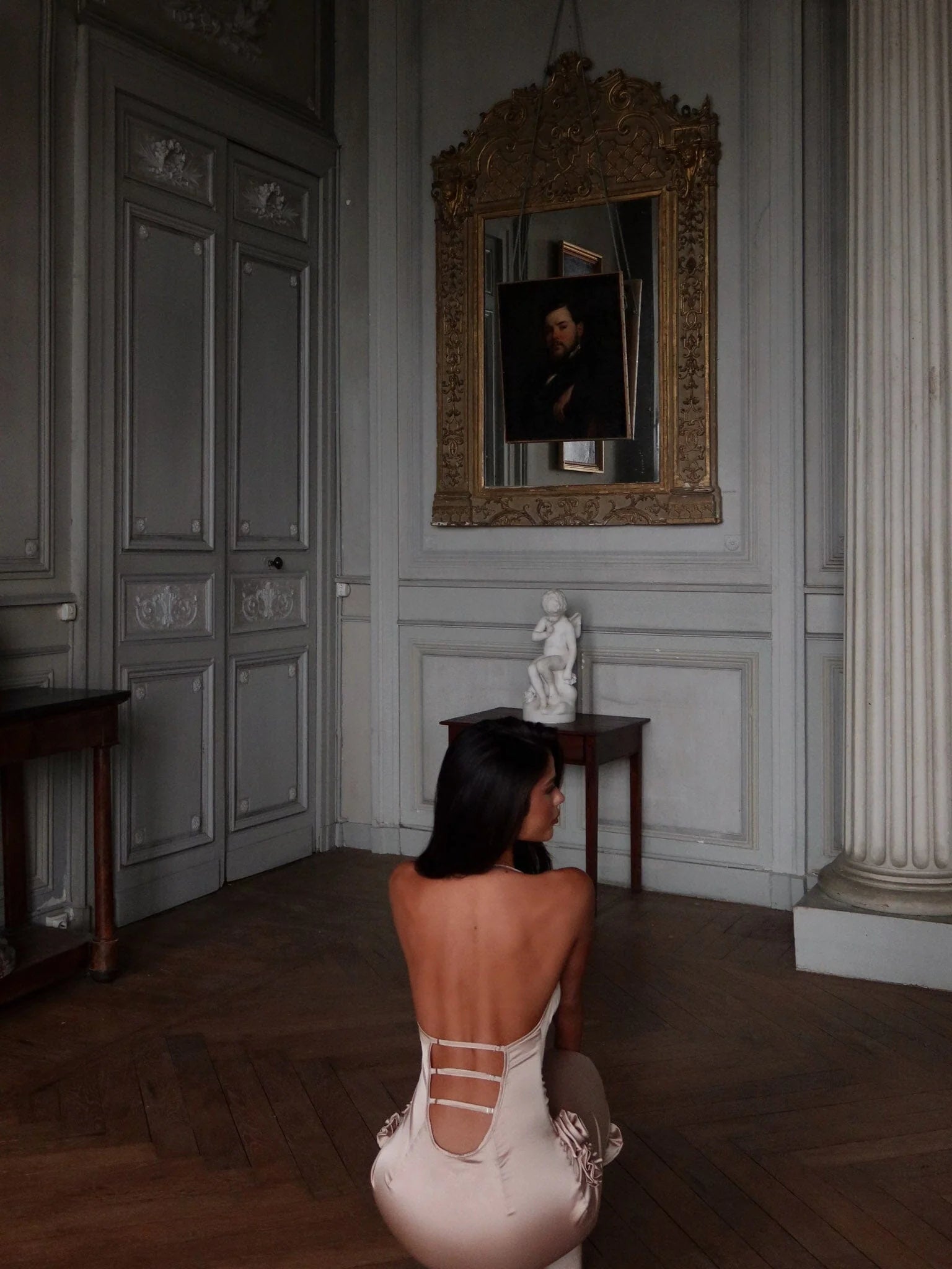 Make an unforgettable entrance with the 'Abella Satin Maxi Dress' in Champagne!