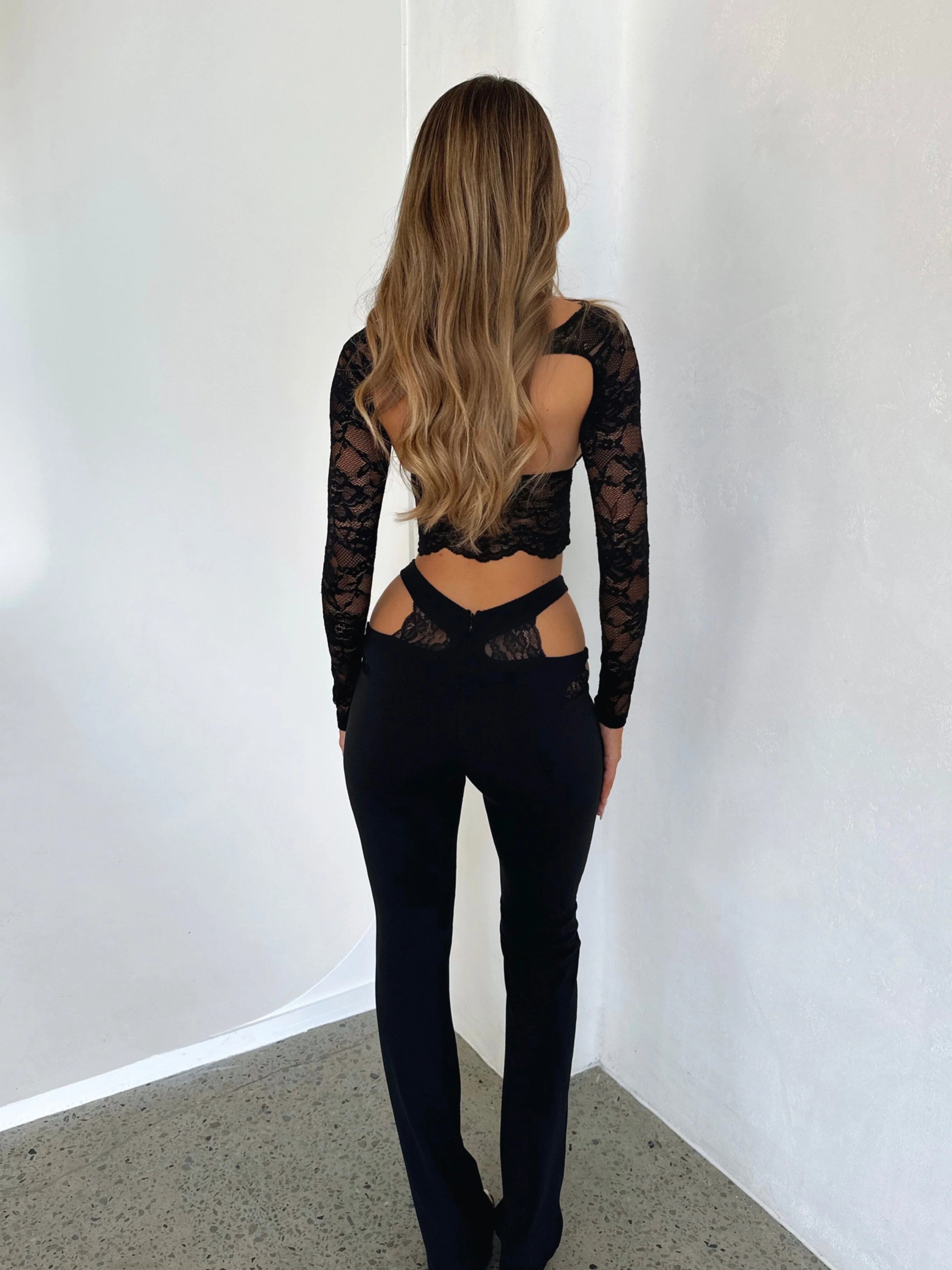 Adeline is crafted from a mesh and lace fabrication that hugs and compliments your figure. She features side cut out designs at the hips, with lace detailing?that?exudes?femininity?and a slight flare at the leg. She is complete with a mid-high rise fit!