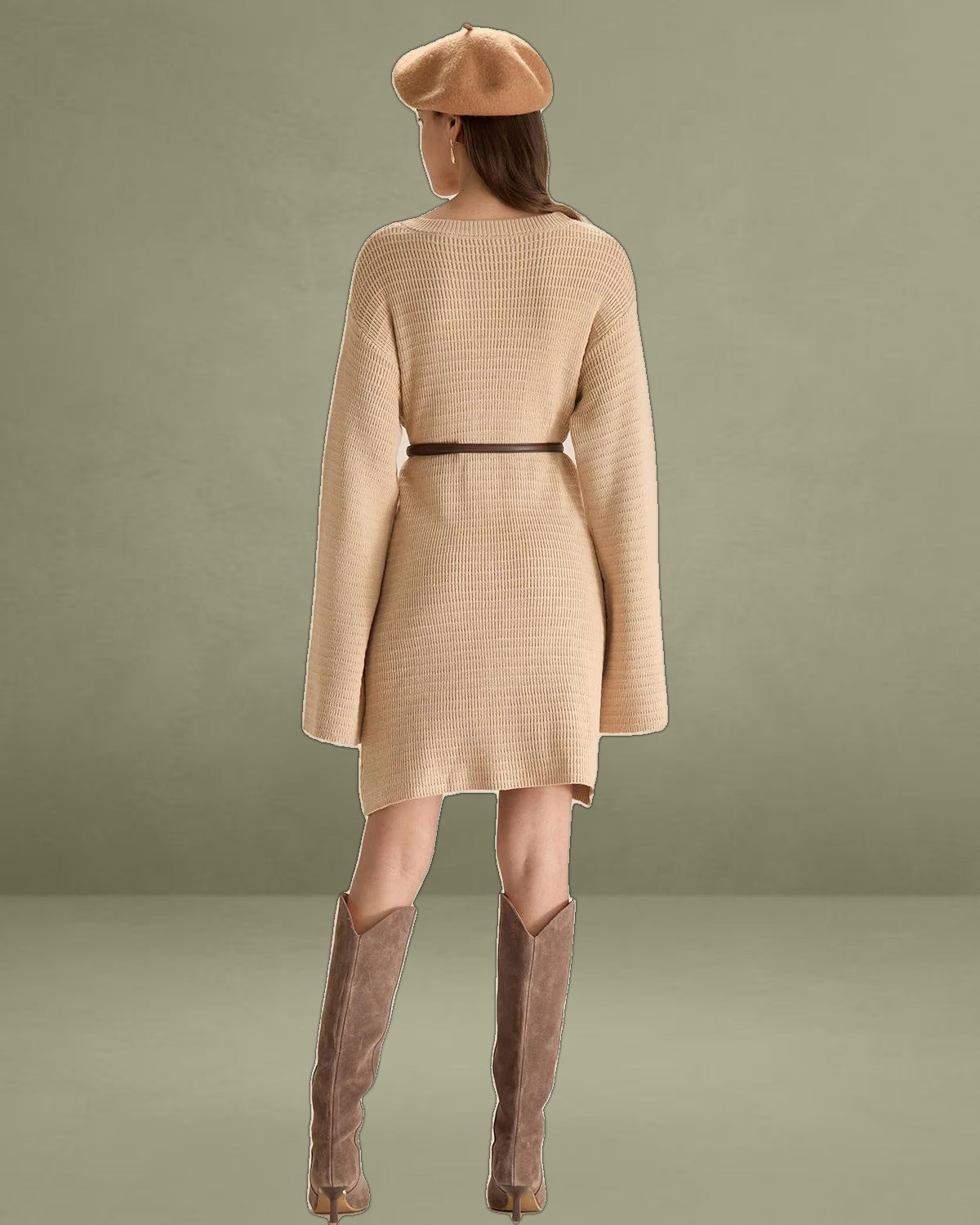 Made from soft, warm knit fabric, it features a relaxed drop-shoulder design for a laid-back vibe. The mini length adds a touch of playful elegance, while the ribbed cuffs and hem provide subtle structure.