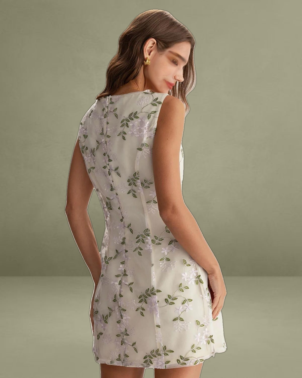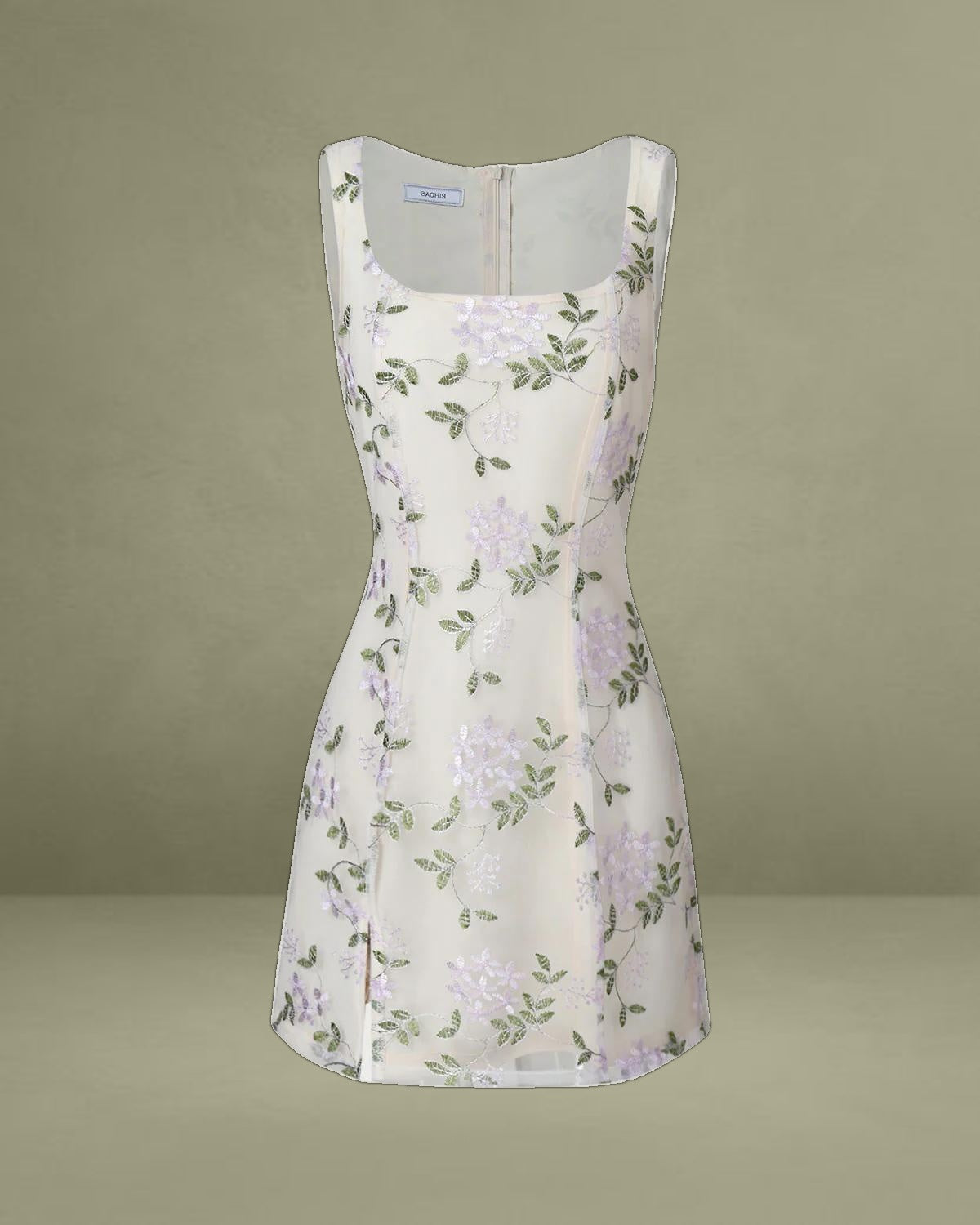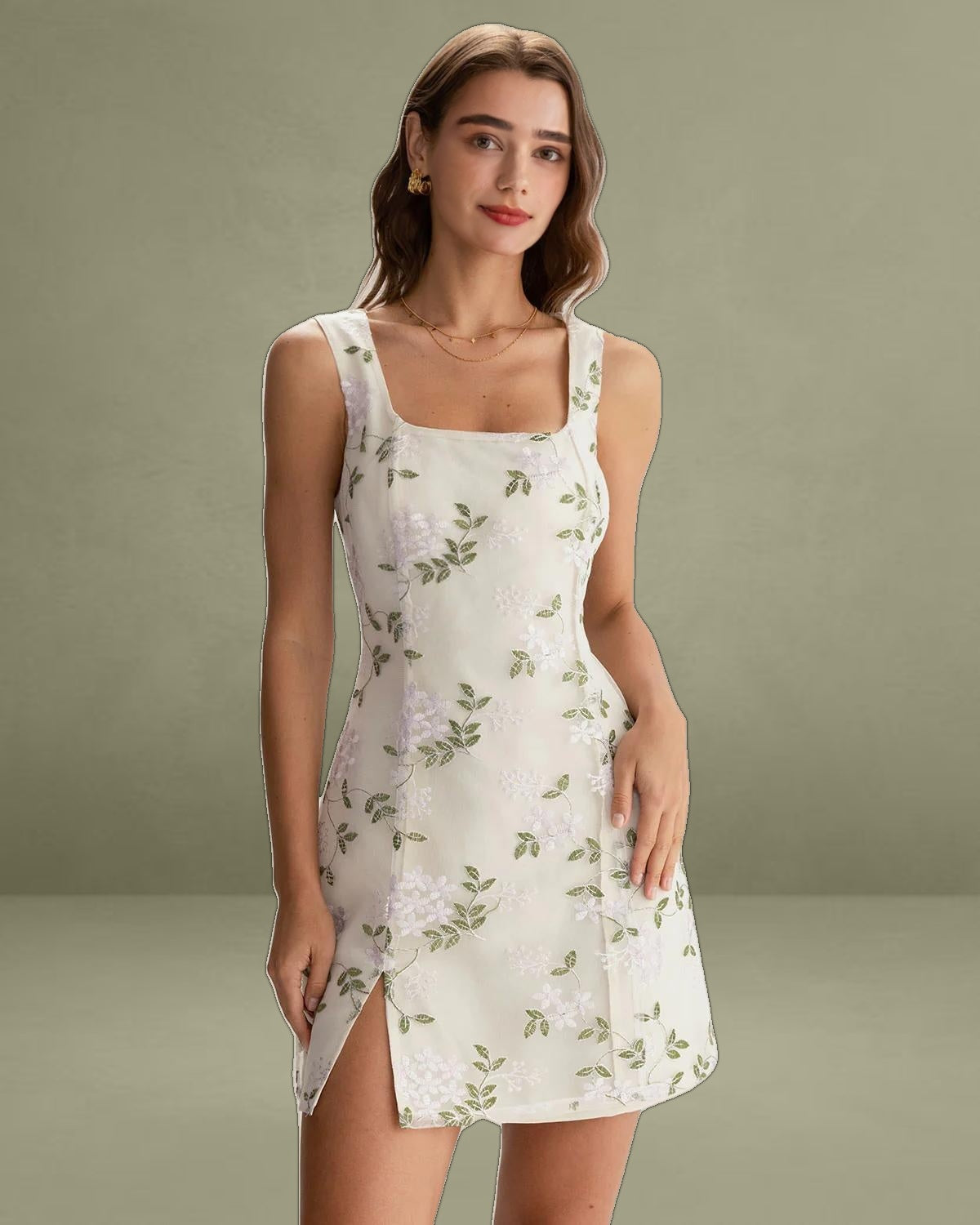 Featuring a chic square neckline, delicate embroidery details, and a subtle side slit, this mini dress offers a perfect blend of sophistication and femininity. Crafted from lightweight fabric, it ensures comfort while maintaining a flattering silhouette.