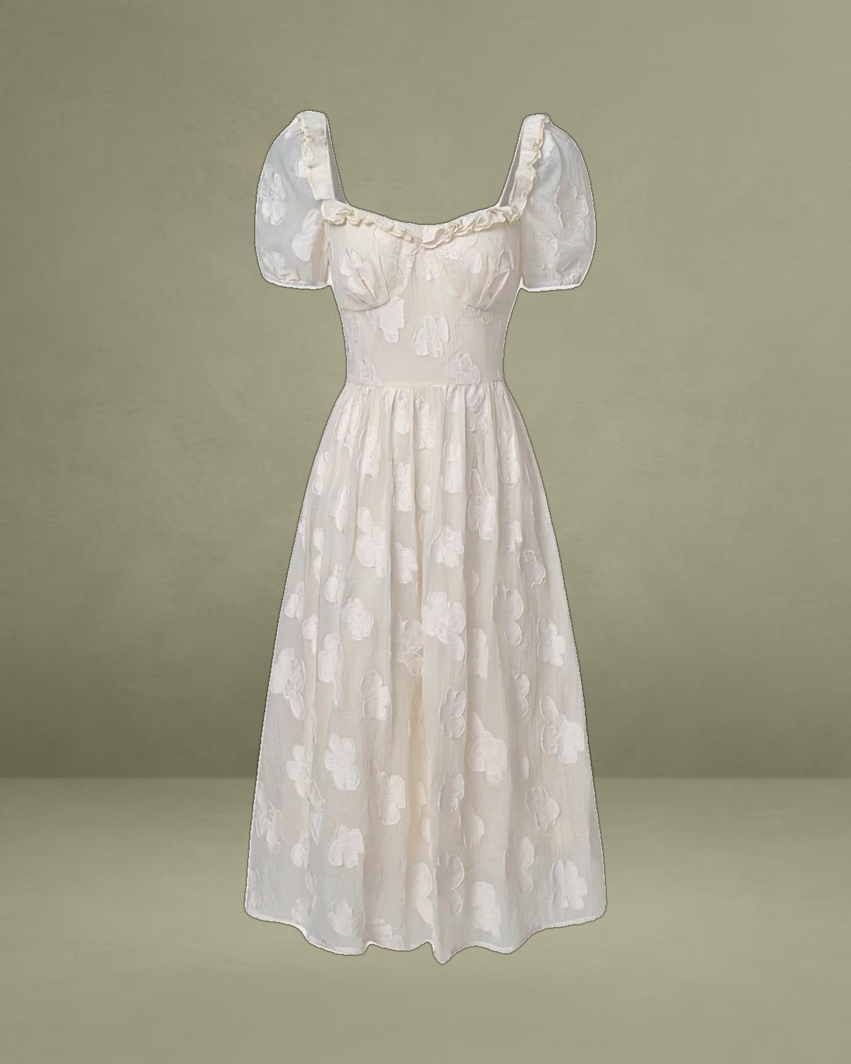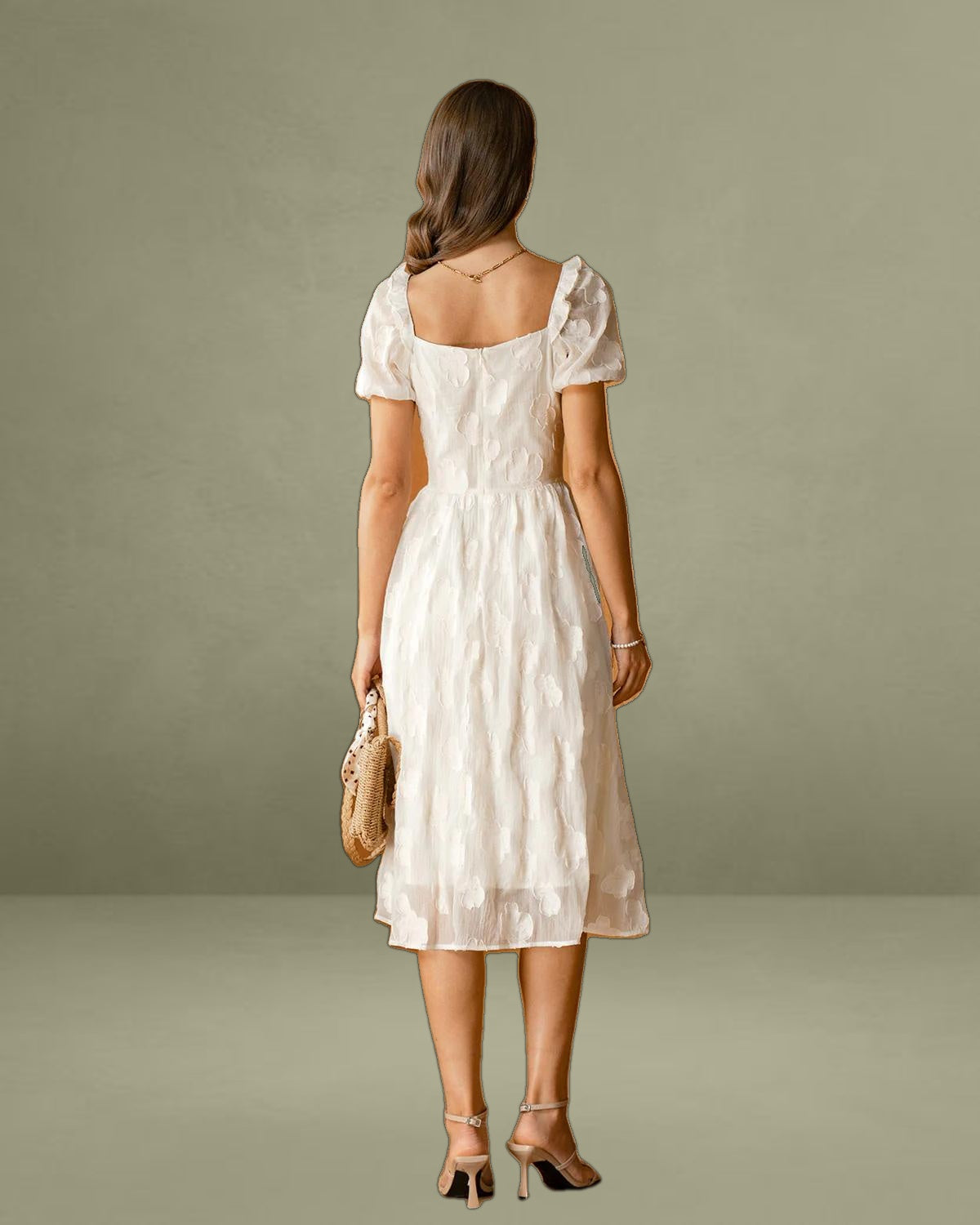 Featuring a flattering square neckline, soft puffed sleeves, and a flowing midi-length skirt, this dress creates a graceful, feminine silhouette. Crafted from lightweight, breathable fabric, it's perfect for everything from brunch dates to garden parties.