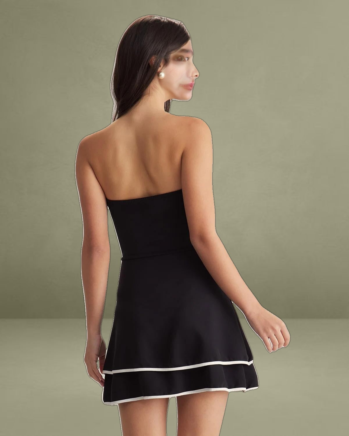 Designed with a strapless neckline, it highlights your shoulders and décolletage, while the contrasting details add a modern, eye-catching touch. The fitted silhouette flatters your figure, and the mini length keeps the look playful and fun.