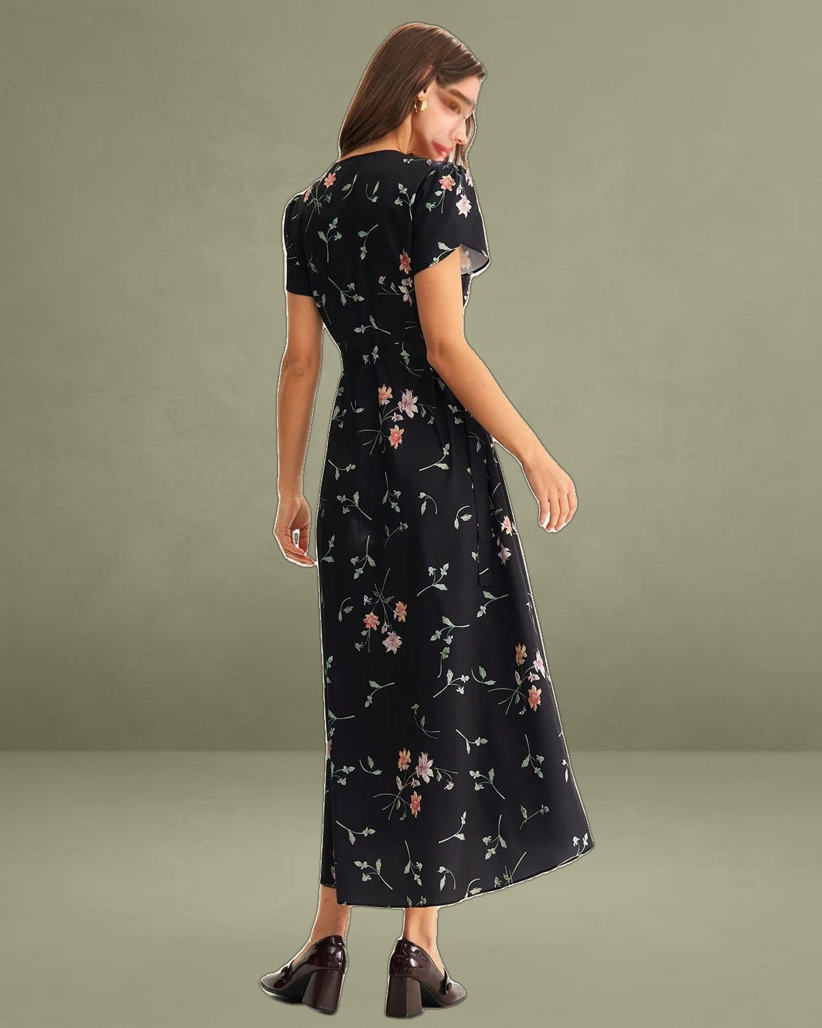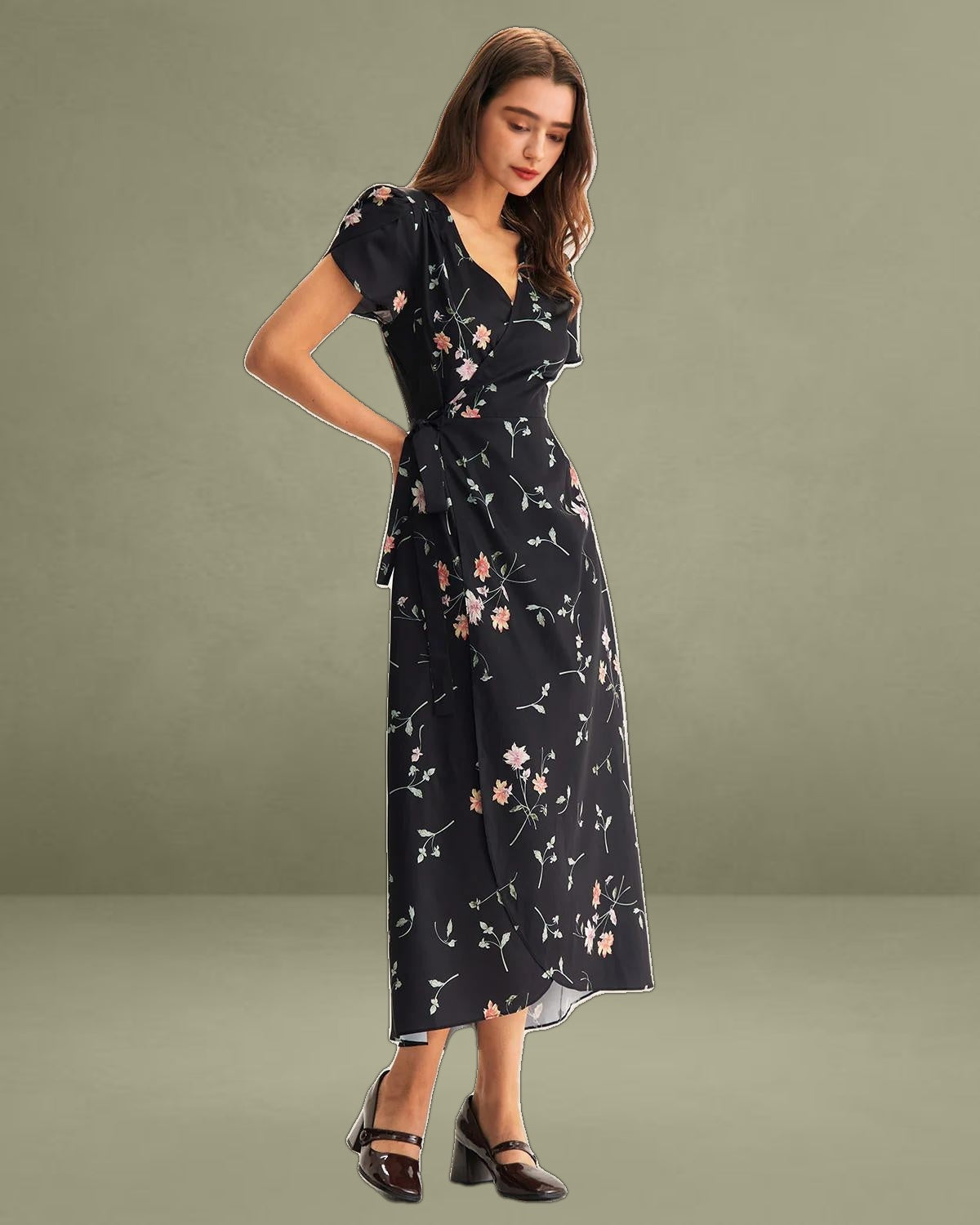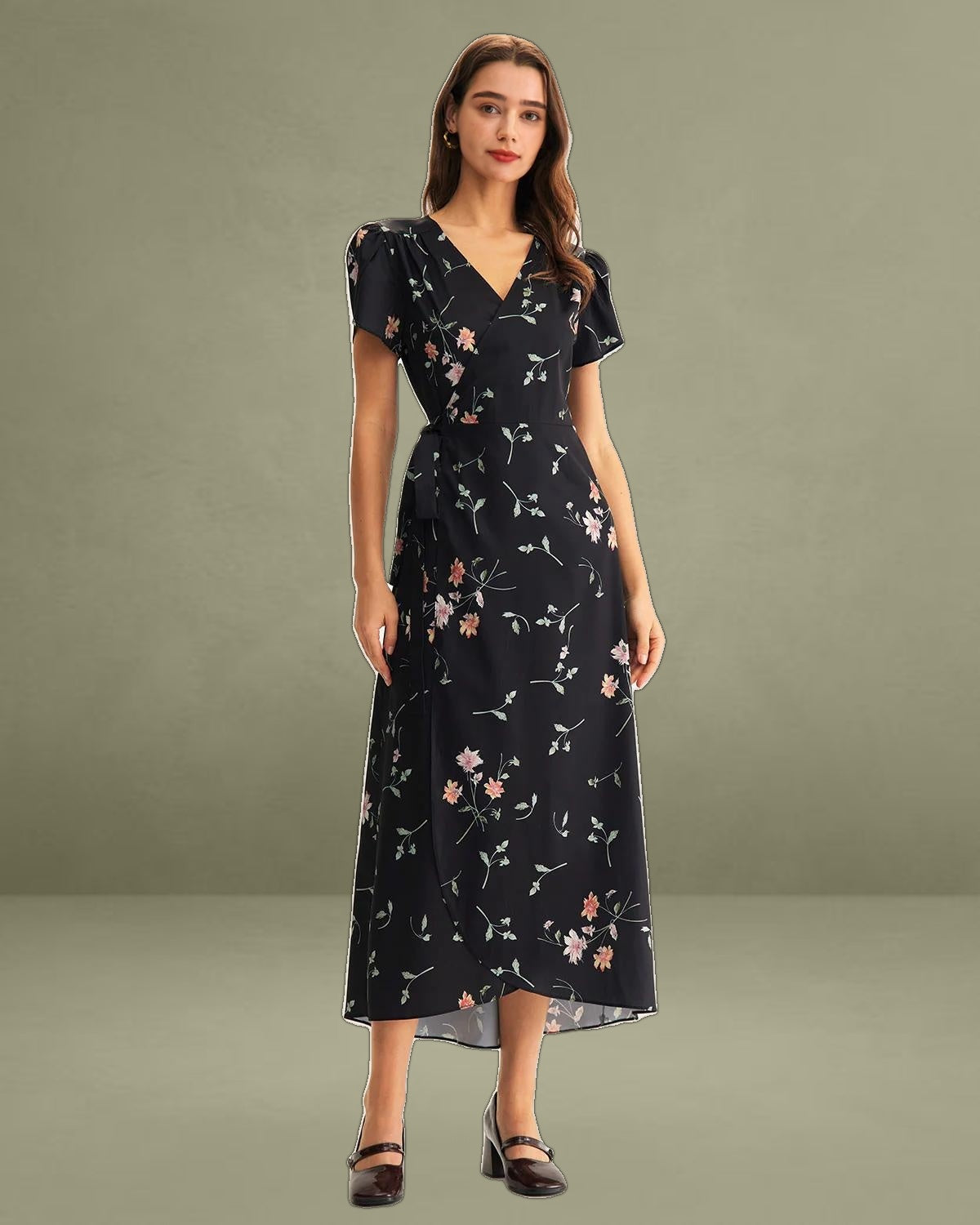 Its wrap design flatters the figure by cinching the waist, while the flowing maxi length creates an effortlessly graceful look. The black background highlights the vibrant floral print, making it suitable for both day and evening wear.