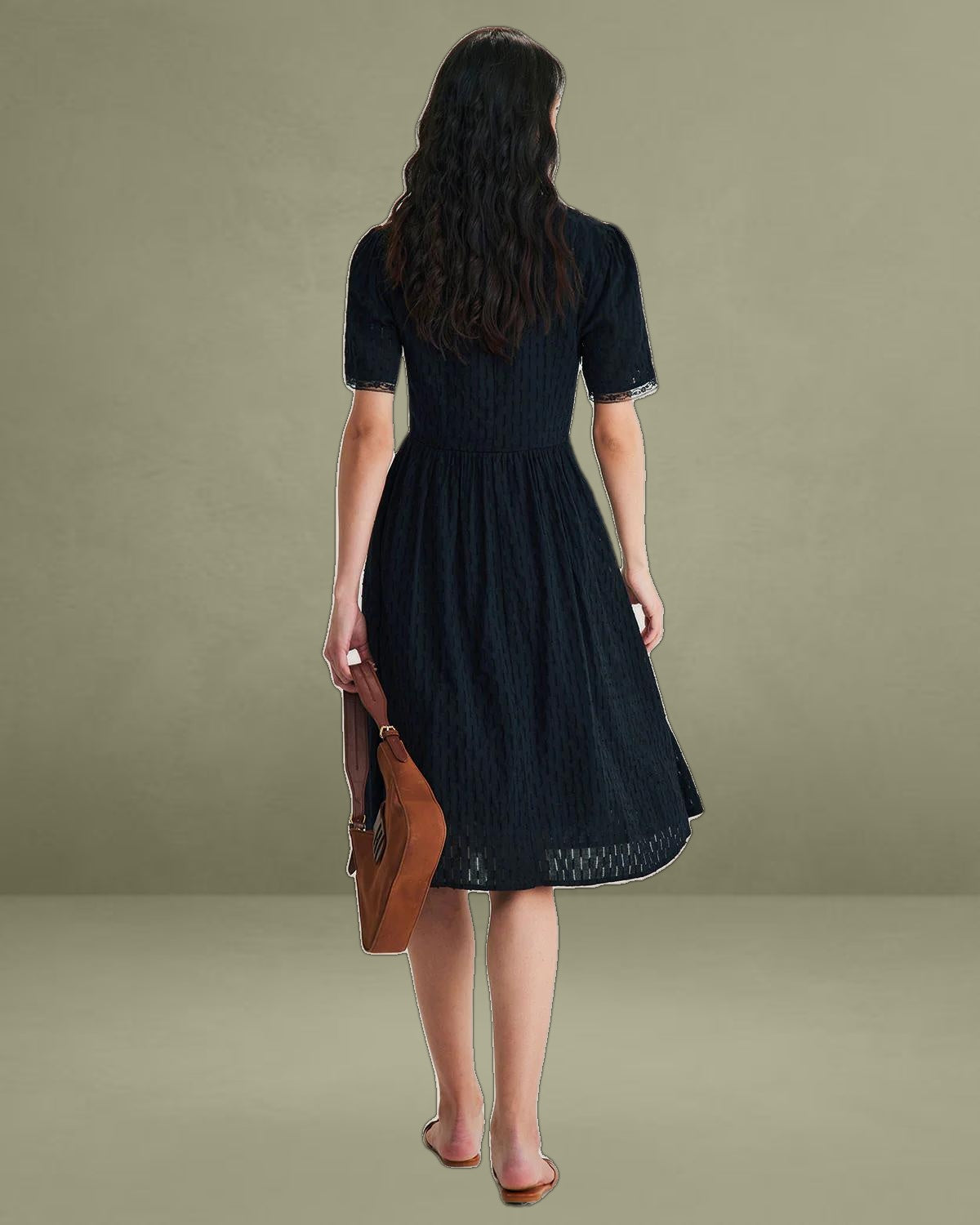 Featuring intricate lace detailing and a flattering button-down front, this dress exudes elegance and charm. The fitted bodice and midi length create a graceful silhouette, while the delicate lace adds a touch of romantic allure.
