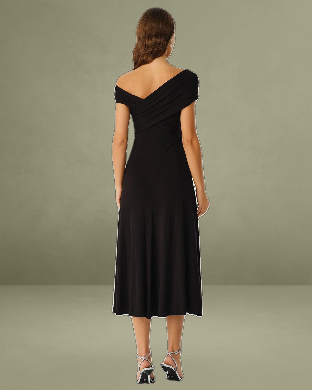 - Has a one-shoulder back neckline