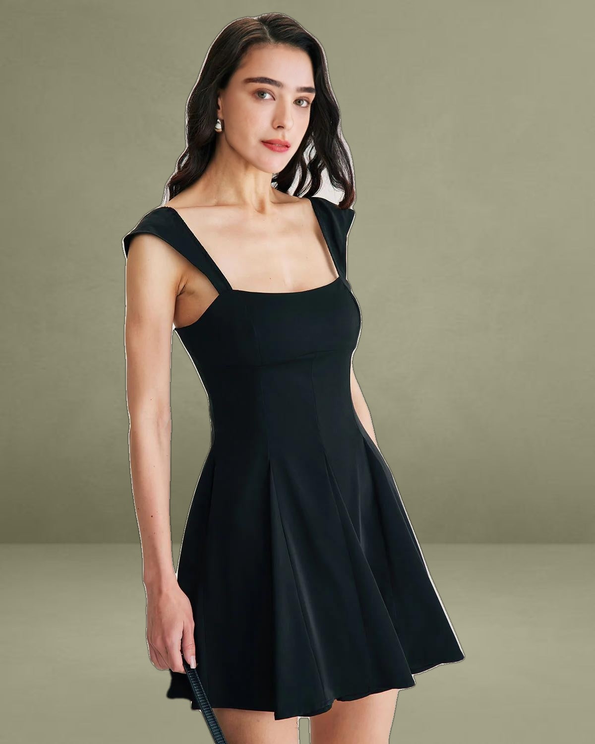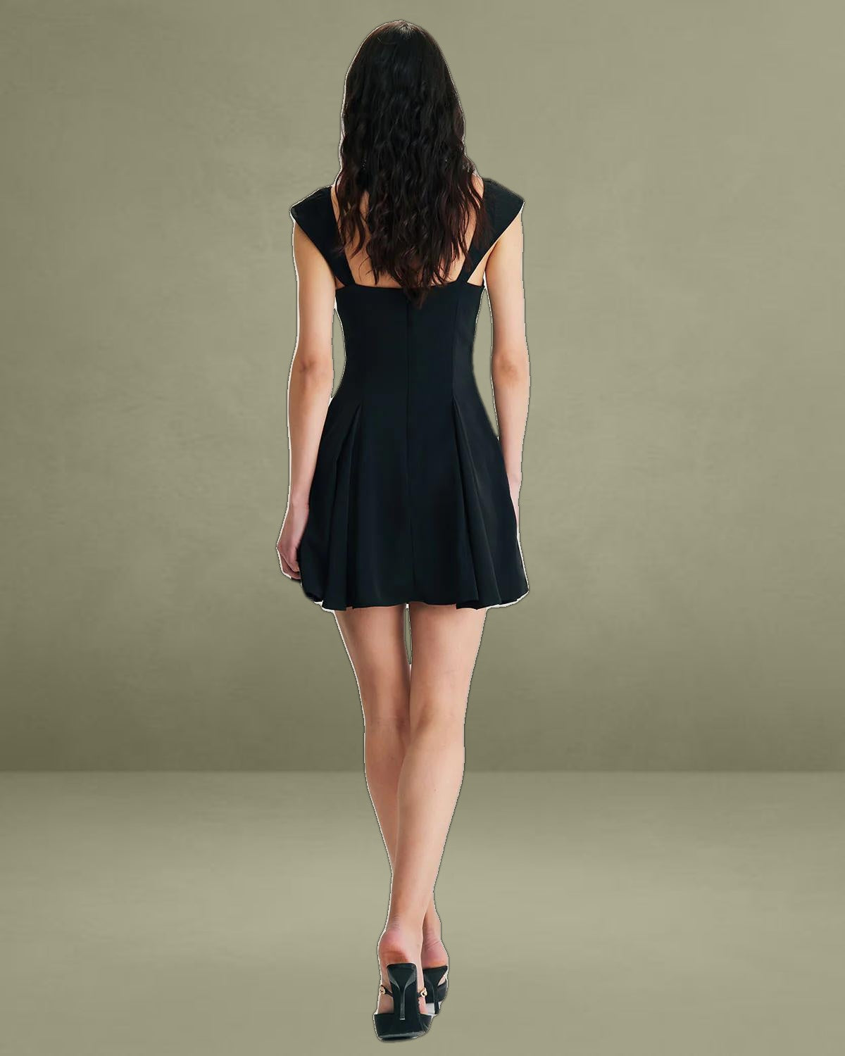 Designed with a flattering square neckline, it beautifully frames your collarbone for an elegant touch. The fitted bodice flows into a pleated mini skirt, adding movement and texture to the silhouette.
