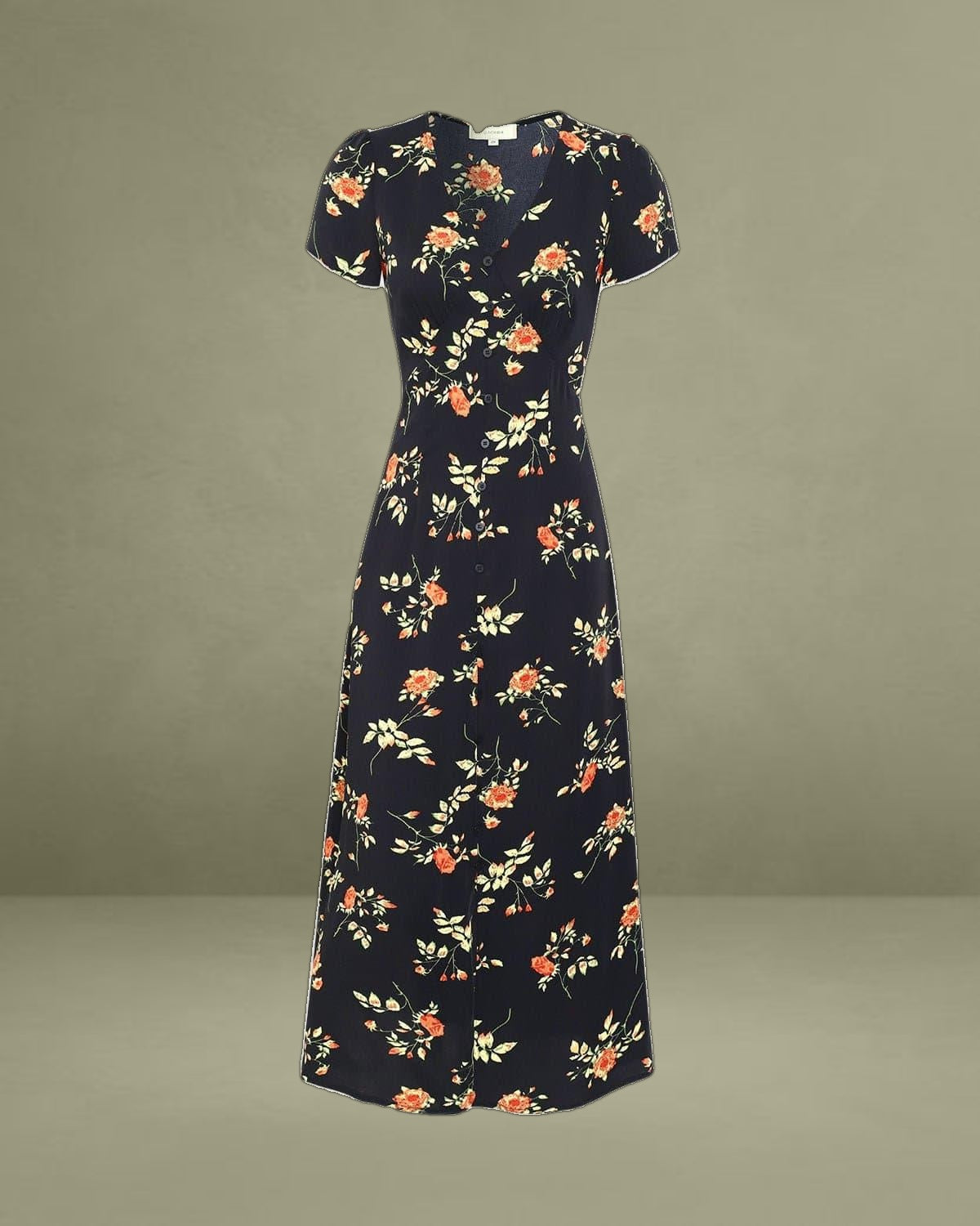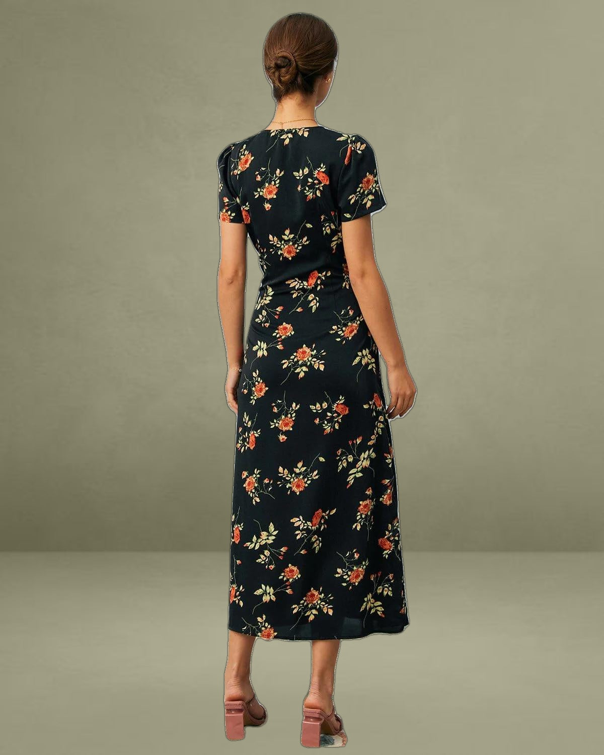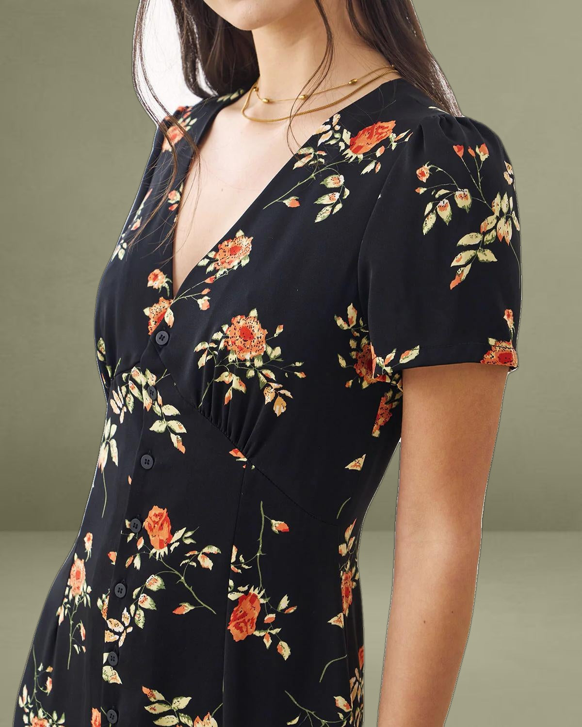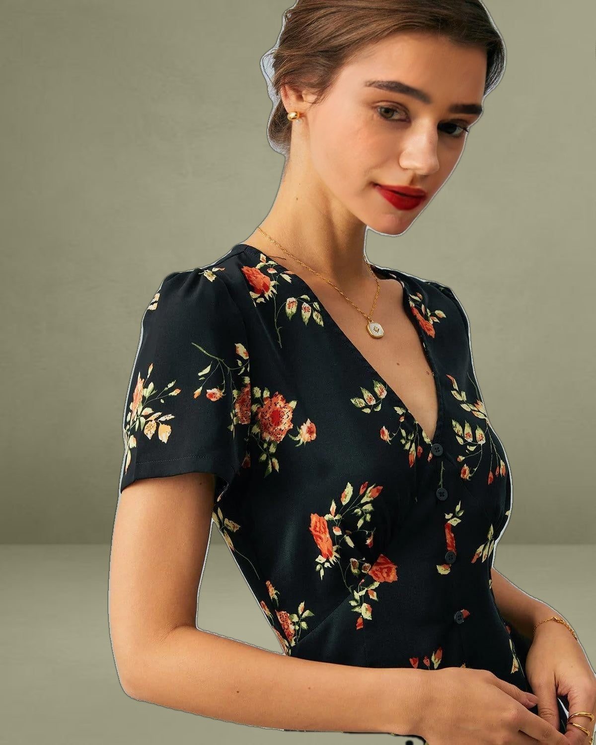 This V-neck maxi dress suits any event. Its form-fitting style enhances your figure, making you feel self-assured and attractive. The buttons, zipper, and floral pattern bring a feminine charm, making it ideal for various occasions. Whether you're on a date or at a formal gathering, this dress will surely draw attention and make you feel wonderful.