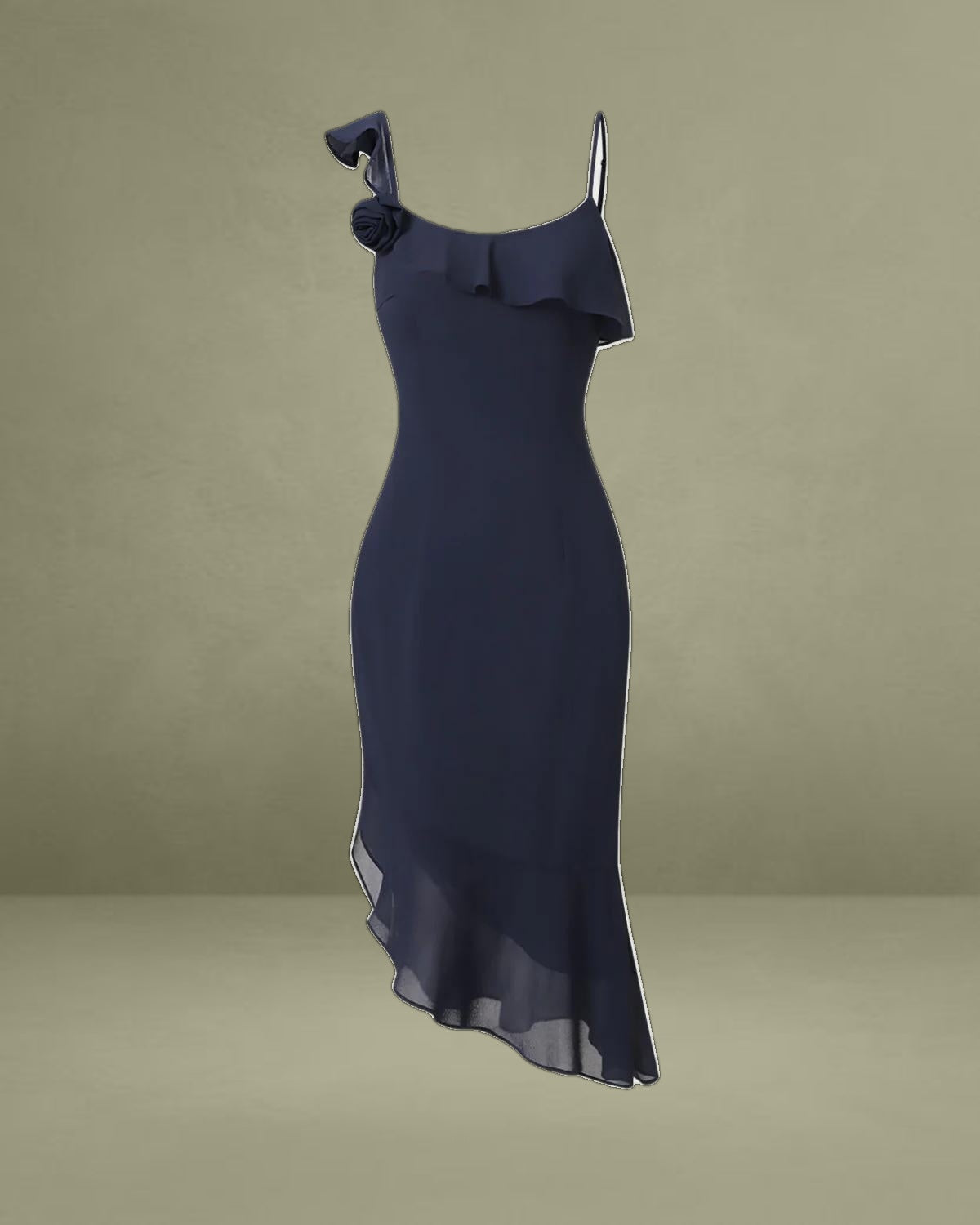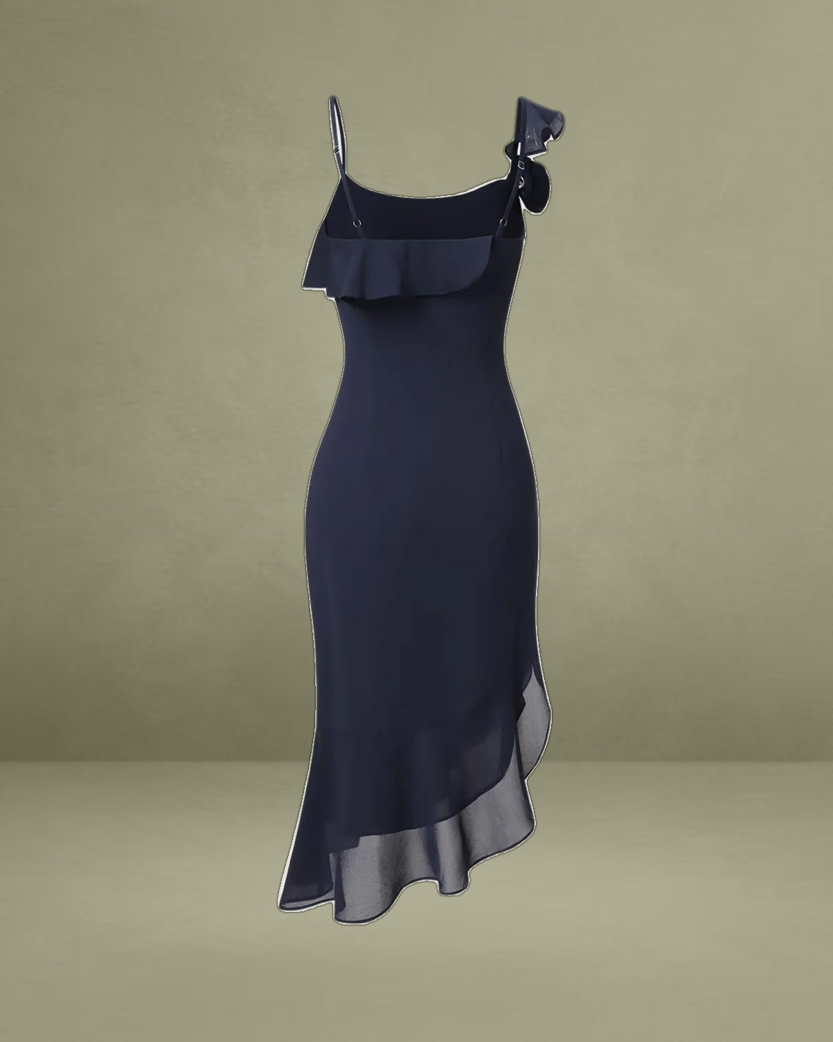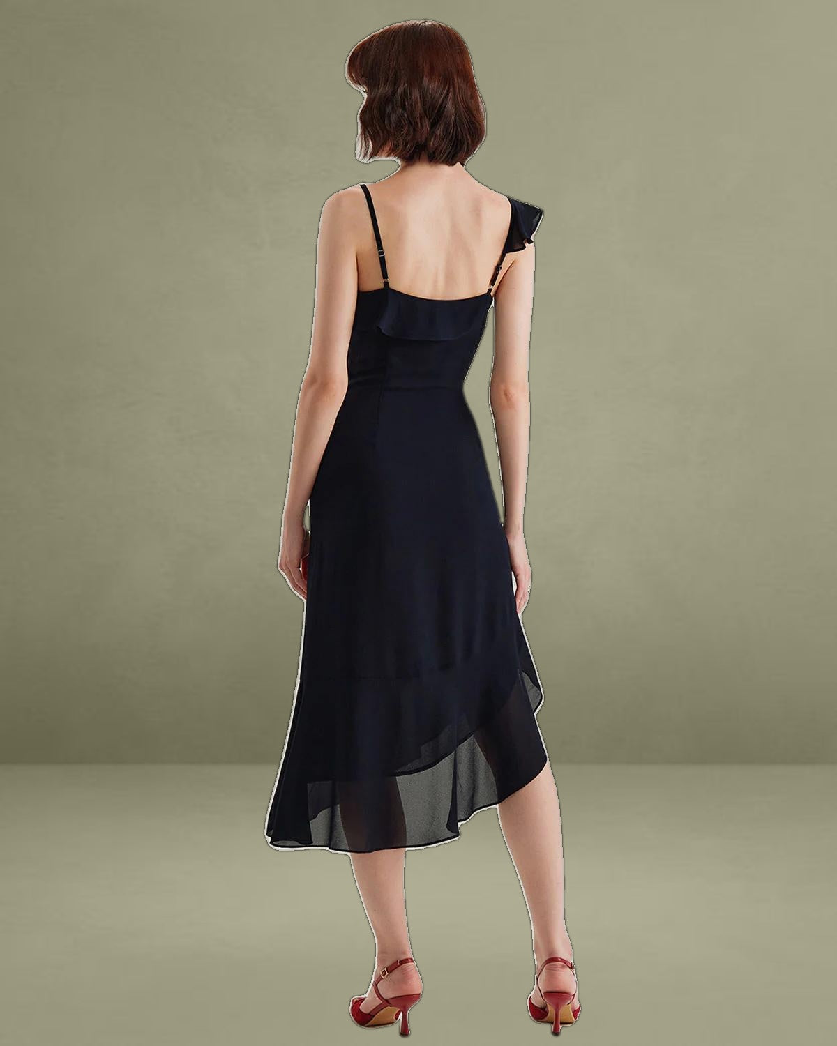 Crafted from lightweight chiffon, this dress features delicate ruffle detailing along the hem and neckline, adding a touch of grace and movement. The slip style and midi length create a flattering, flowy silhouette, making it perfect for both casual and semi-formal events.
