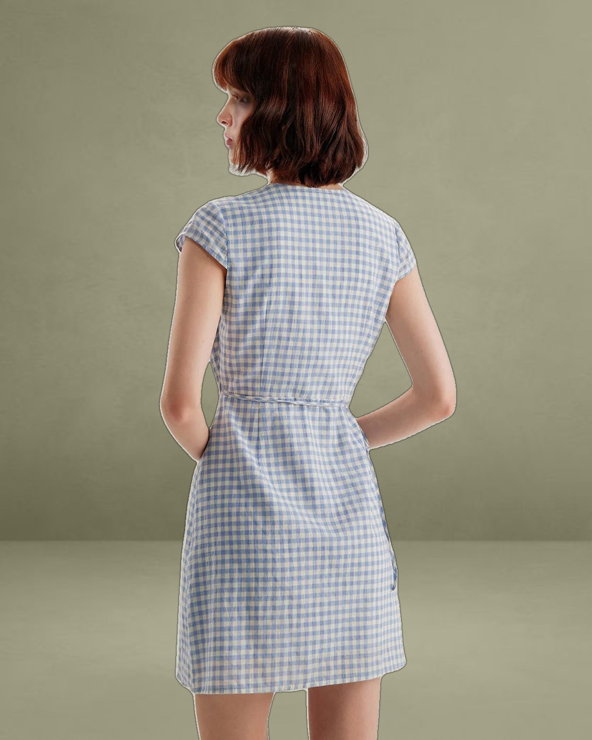 Featuring a classic plaid pattern in fresh blue tones, this dress combines cap sleeves and a flattering wrap silhouette for a feminine, laid-back look. The mini length adds a flirty finish, perfect for casual outings, weekend brunches, or warm-weather strolls.