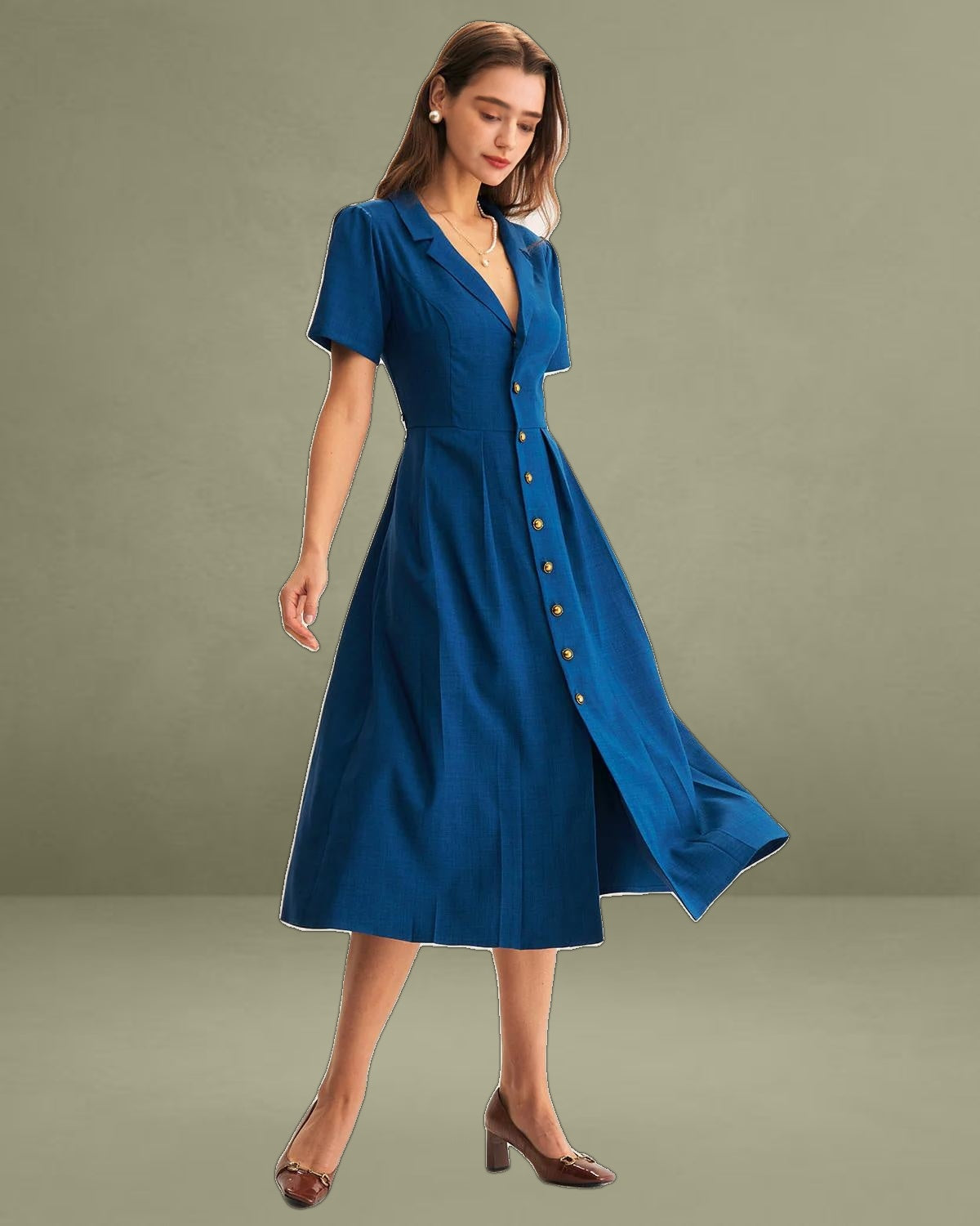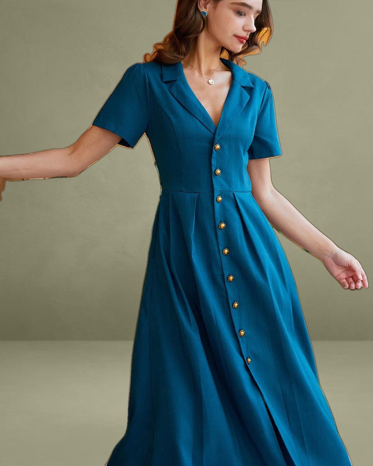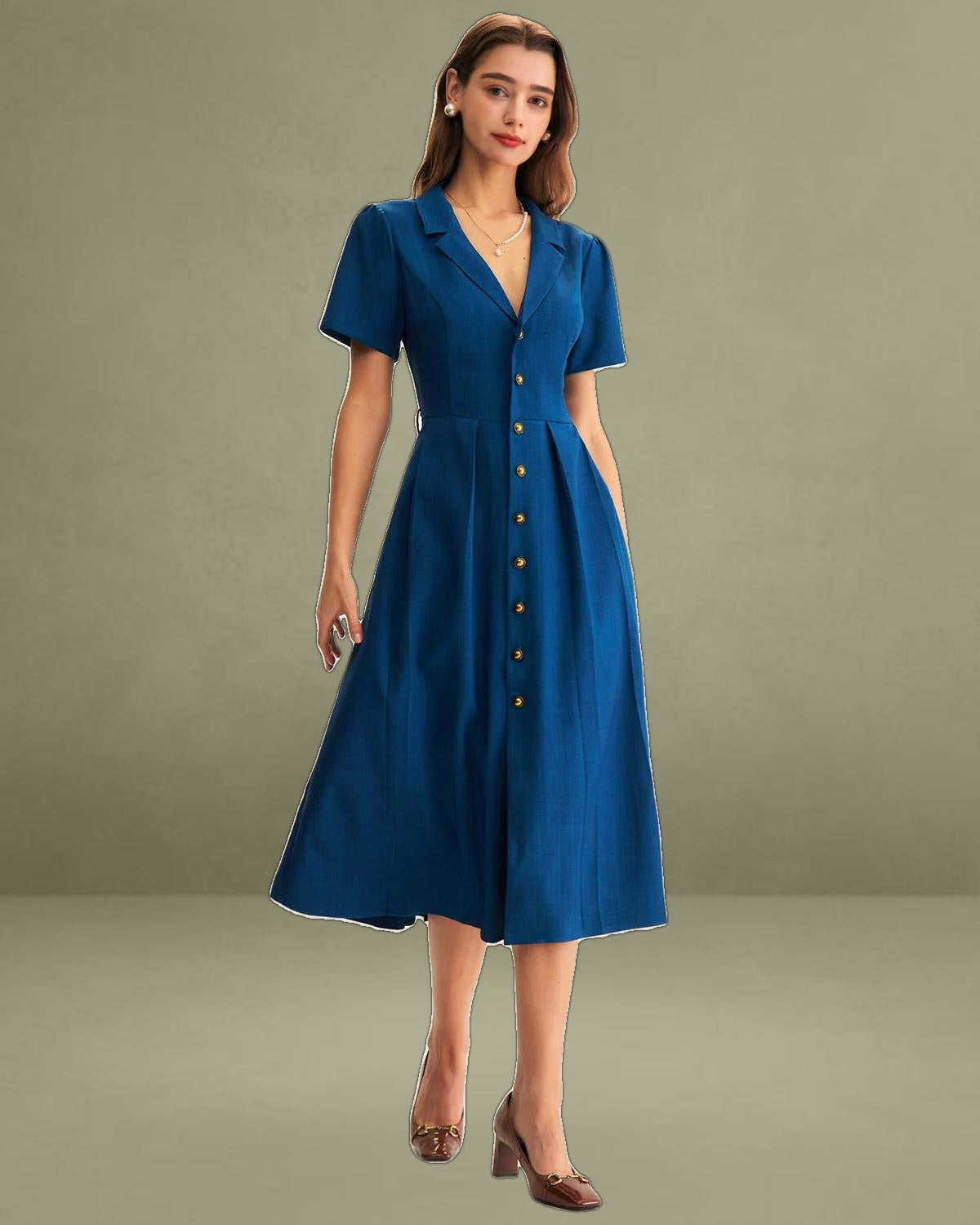 This timeless piece features a flattering V-neckline and delicate pleats that add texture and movement, while the button-down front brings a classic, sophisticated touch. The midi length offers versatile styling options—perfect for both casual outings and work occasions.
