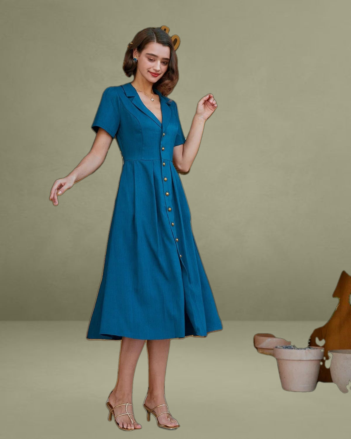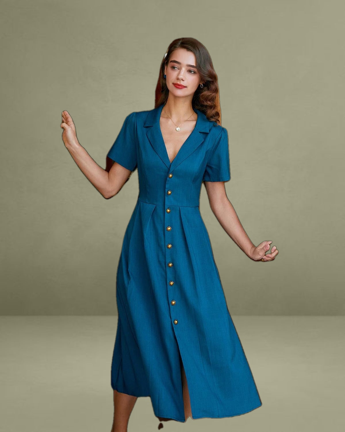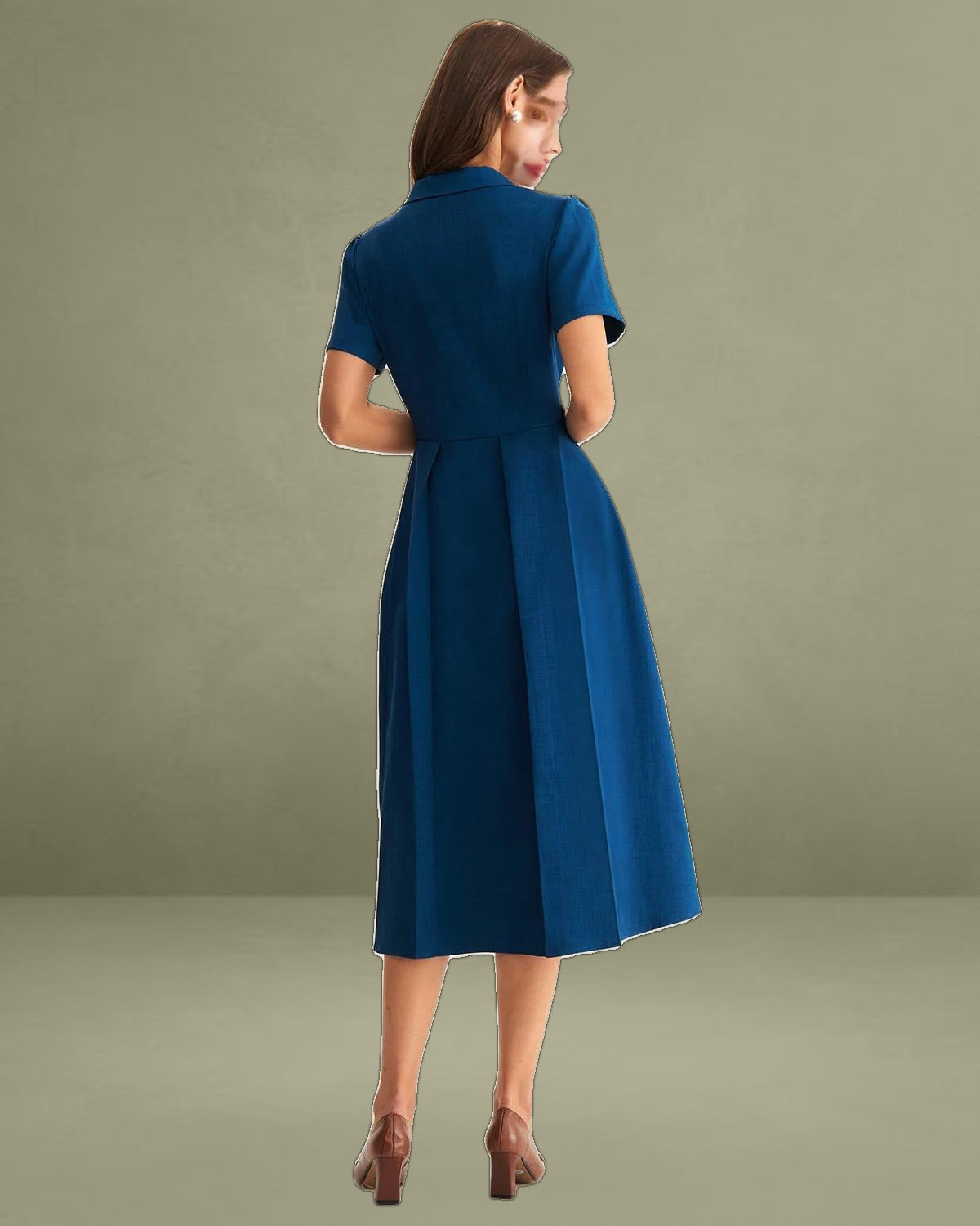This timeless piece features a flattering V-neckline and delicate pleats that add texture and movement, while the button-down front brings a classic, sophisticated touch. The midi length offers versatile styling options—perfect for both casual outings and work occasions.