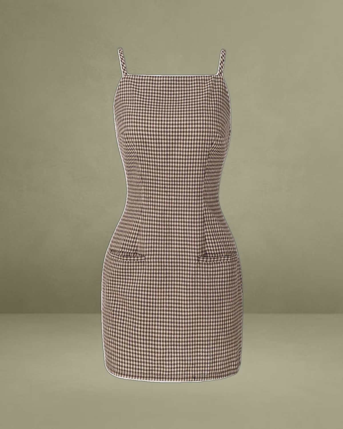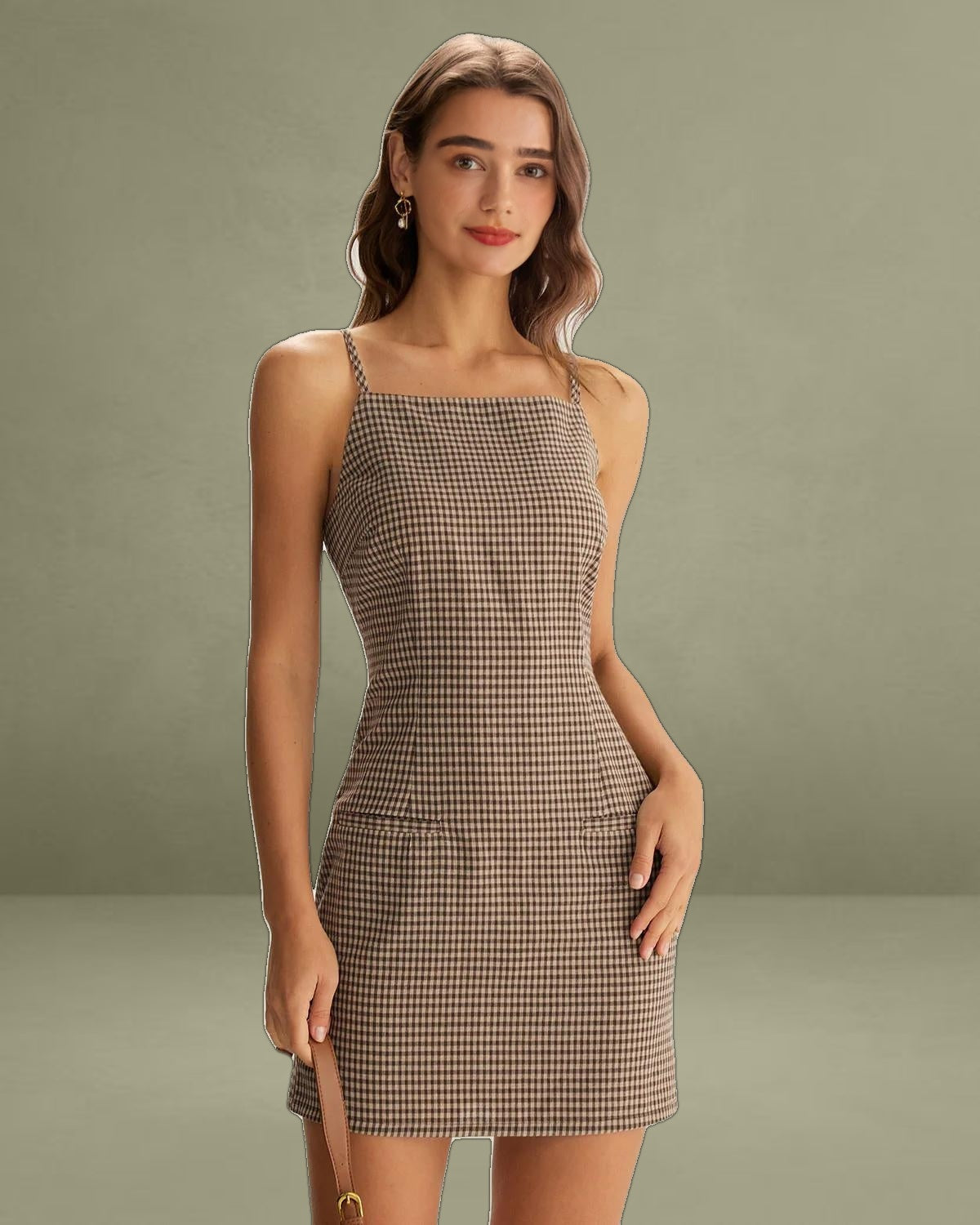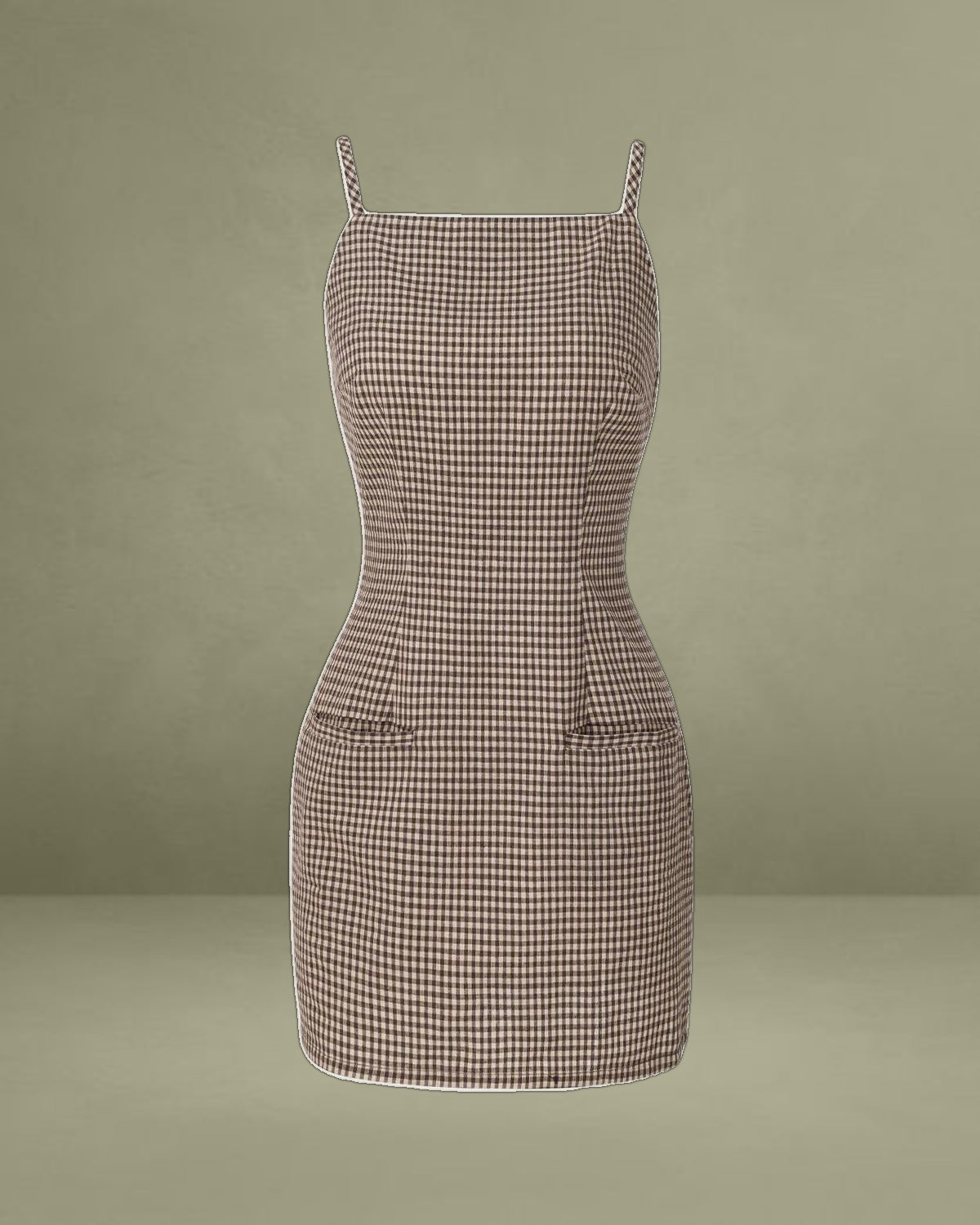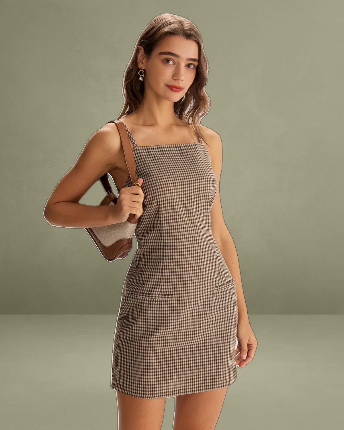 Boasting a classic plaid pattern in warm brown hues, this mini dress showcases a flattering slip style that is both easy to wear and highly adaptable. Ideal for layering, it can be paired with a turtleneck and boots for a cozy autumn look or worn solo with sneakers for a casual and relaxed feel.