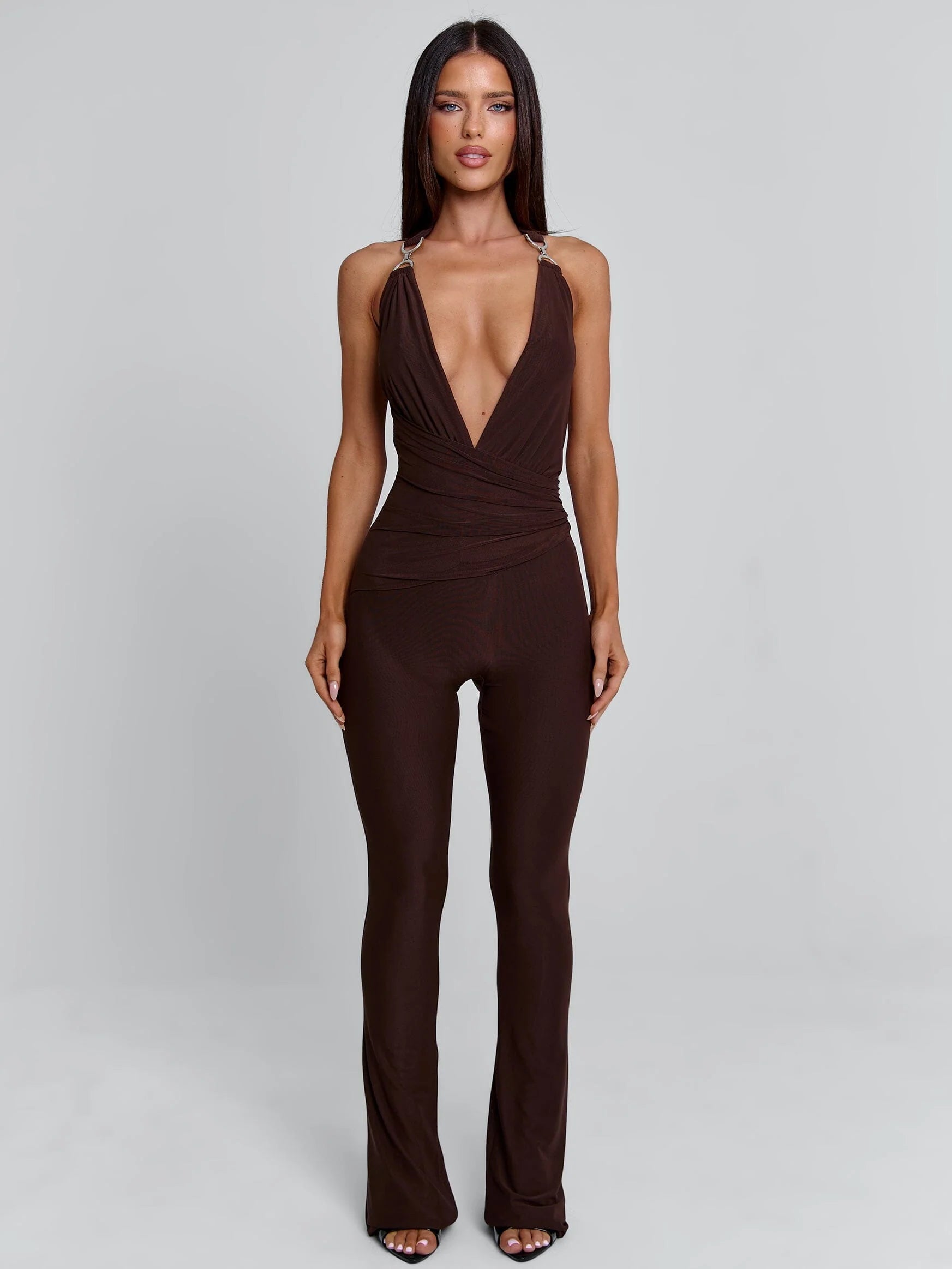 Get ready to turn heads in the show-stopping 'Carys Jumpsuit' in Chocolate!
