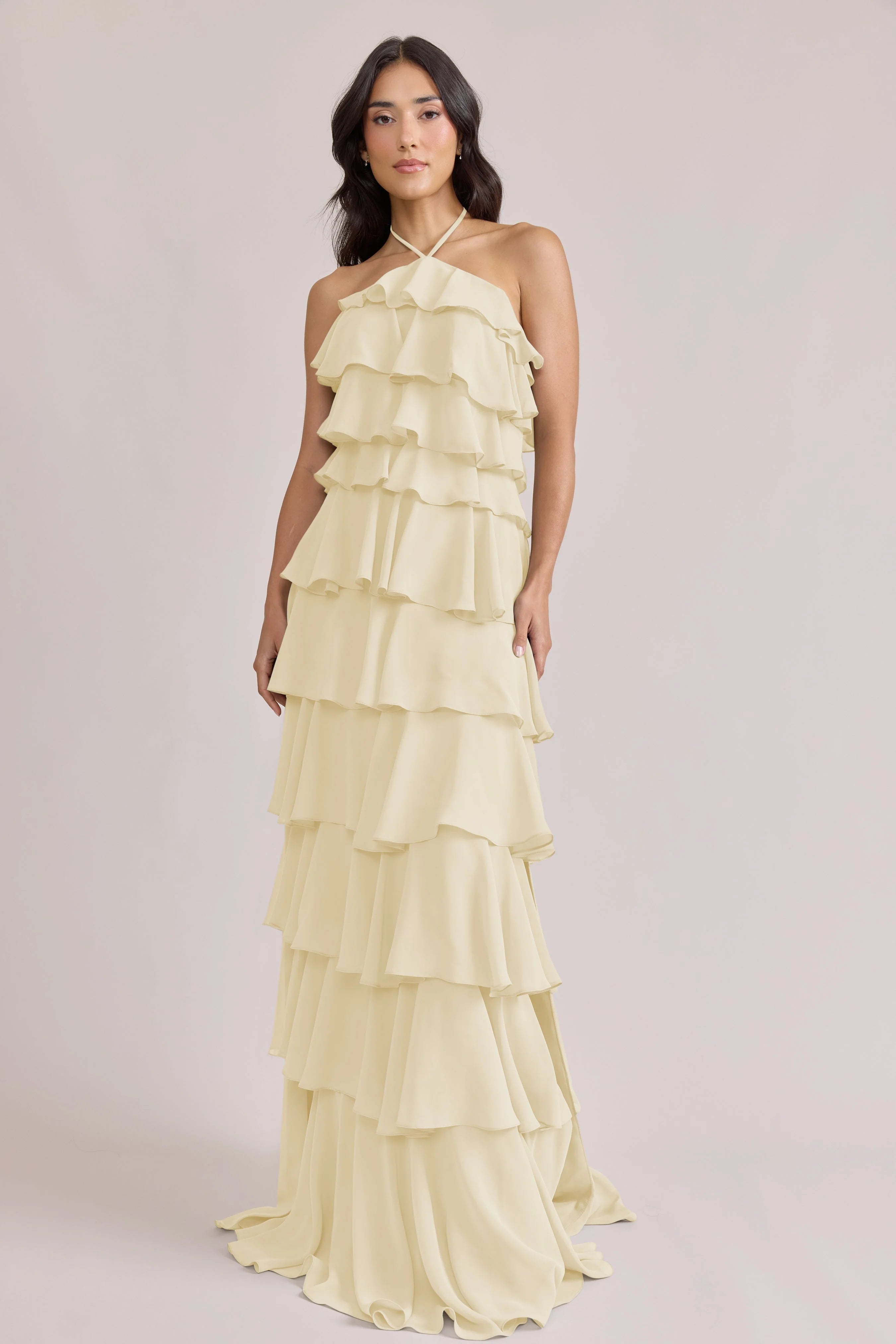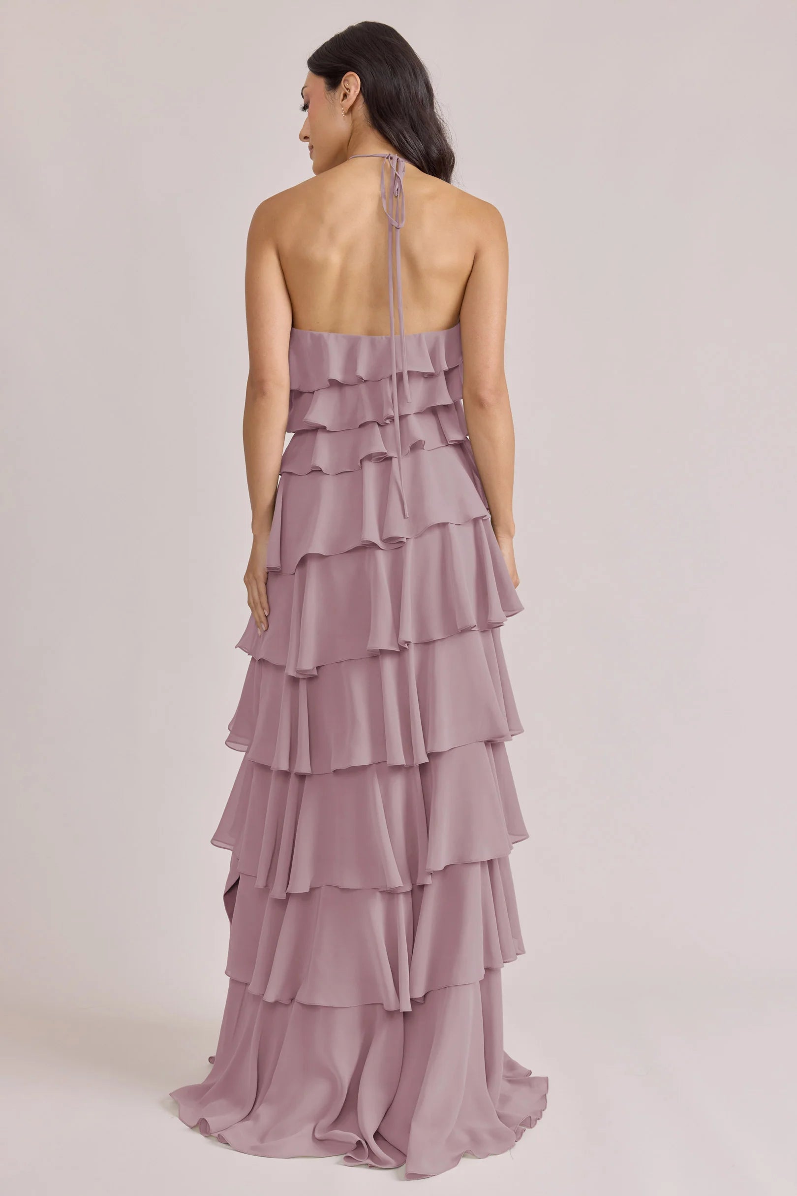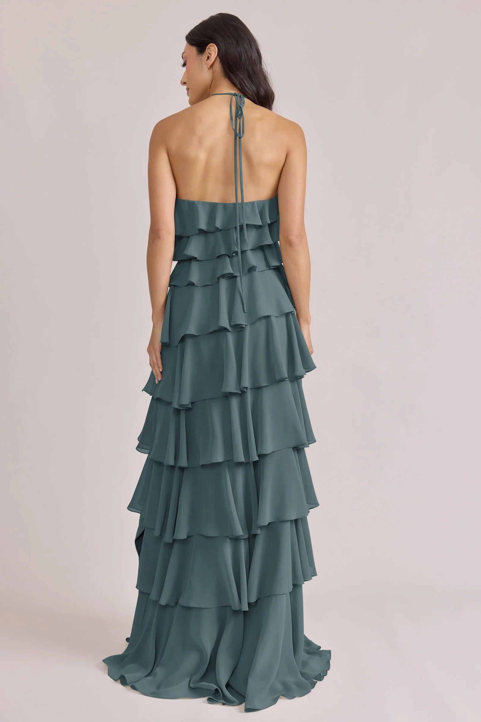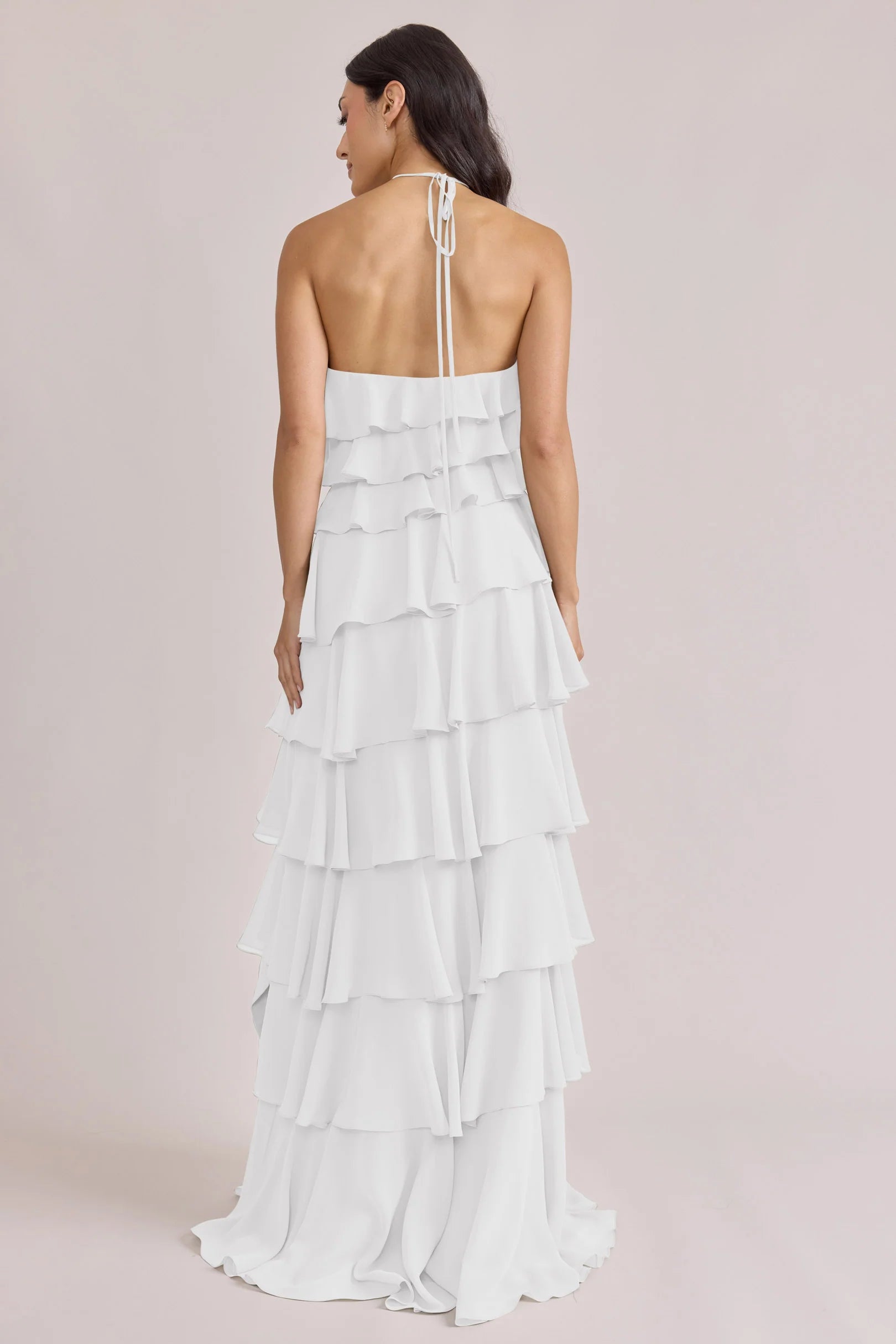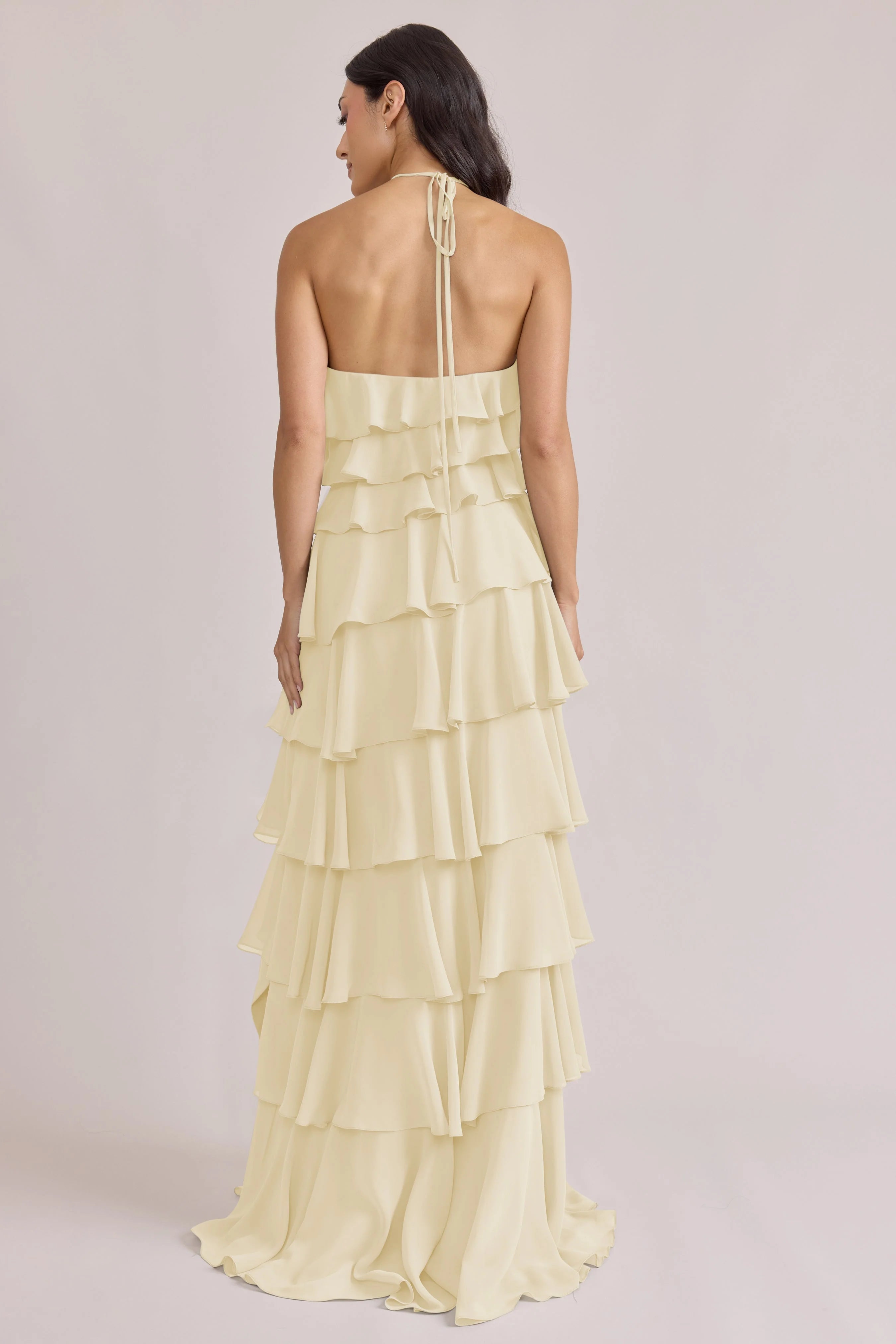 The iconic Tulle Dress reimagined in chiffon. Get ready to turn heads in the Carrie Chiffon Dress! With playful asymmetrical ruffles throughout the length of the dress, this chic and modern dress is perfect for any occasion. Carrie is finished with thin spaghetti halter ties that self-tie at the nape of the neck and a mid-open back for an even flirtier vibe!