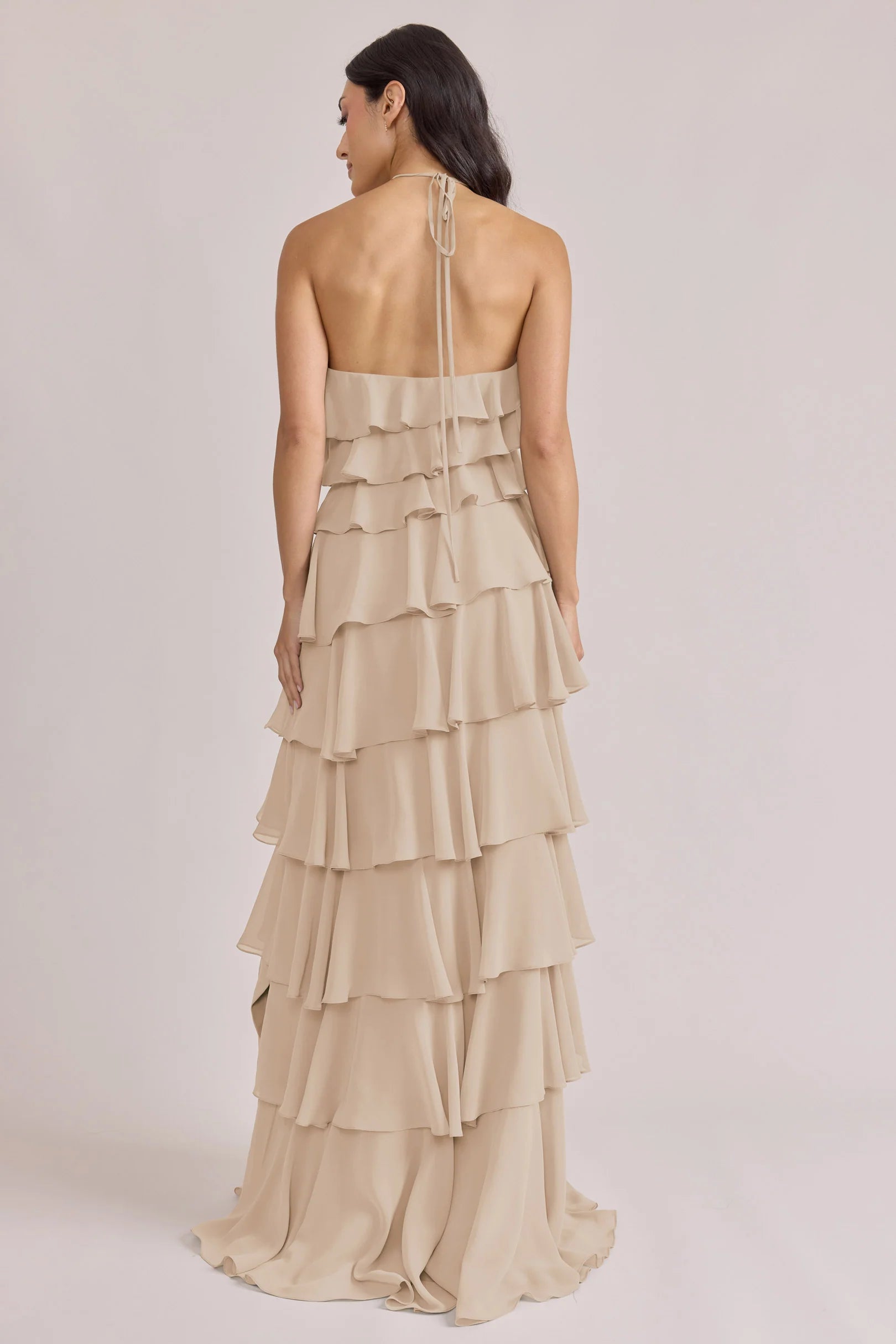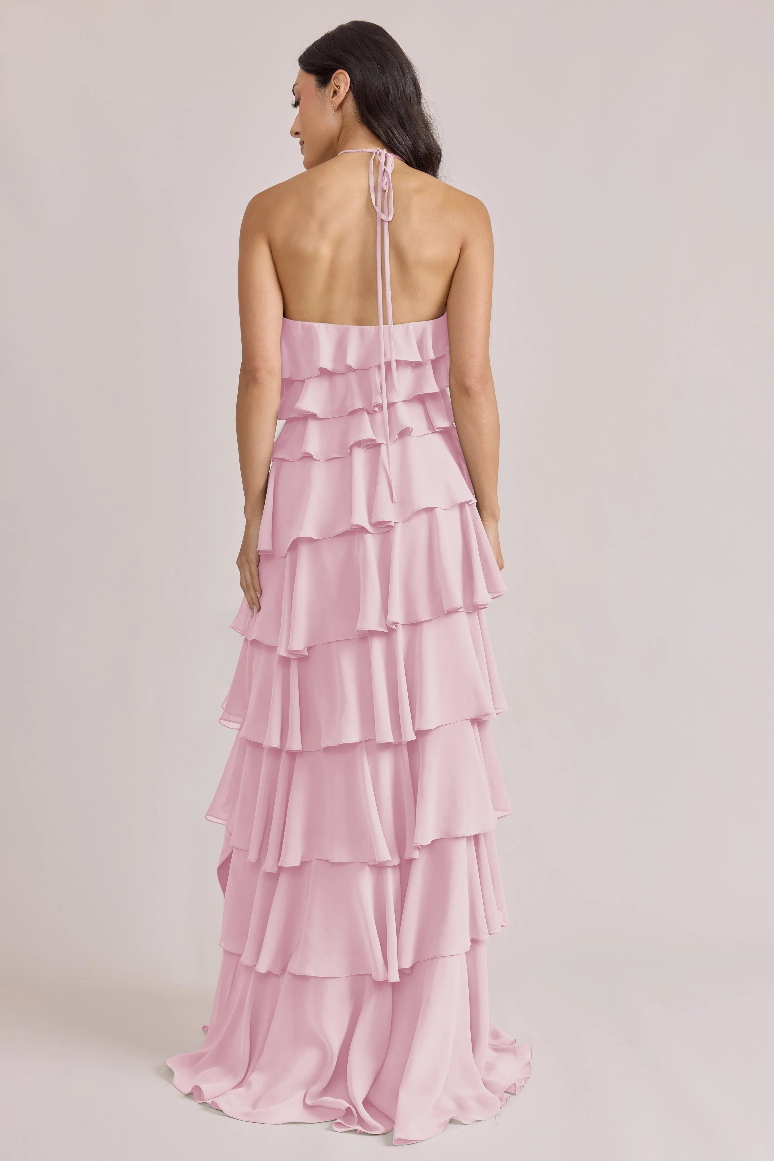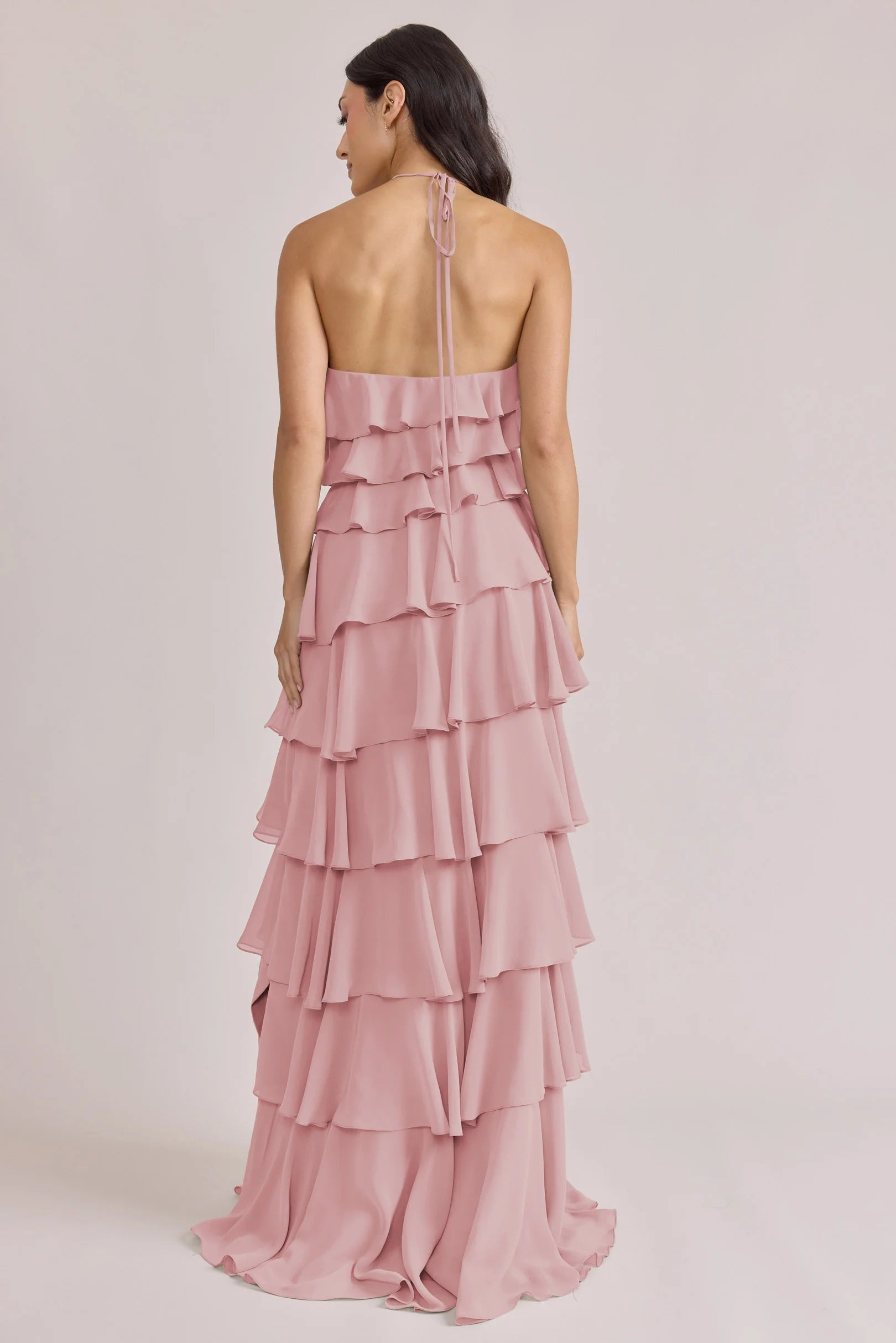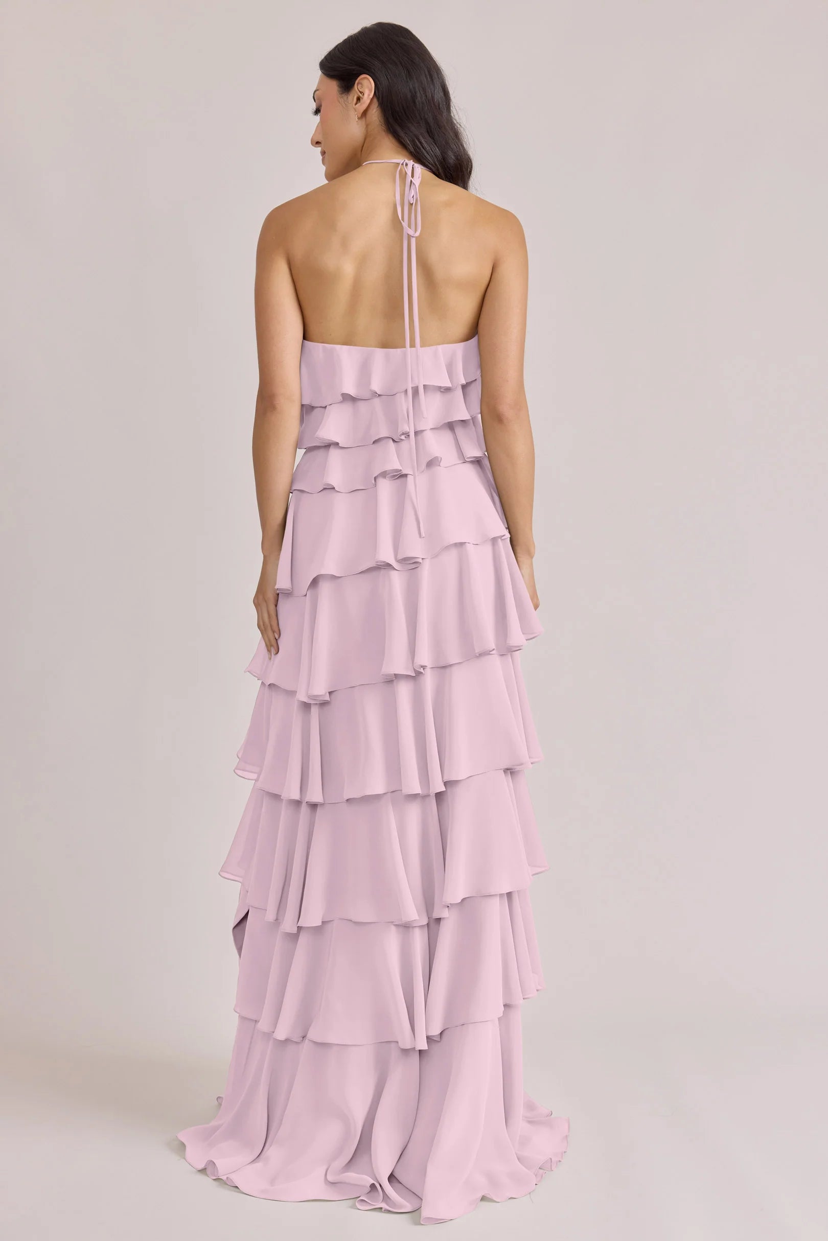 The iconic Tulle Dress reimagined in chiffon. Get ready to turn heads in the Carrie Chiffon Dress! With playful asymmetrical ruffles throughout the length of the dress, this chic and modern dress is perfect for any occasion. Carrie is finished with thin spaghetti halter ties that self-tie at the nape of the neck and a mid-open back for an even flirtier vibe!
