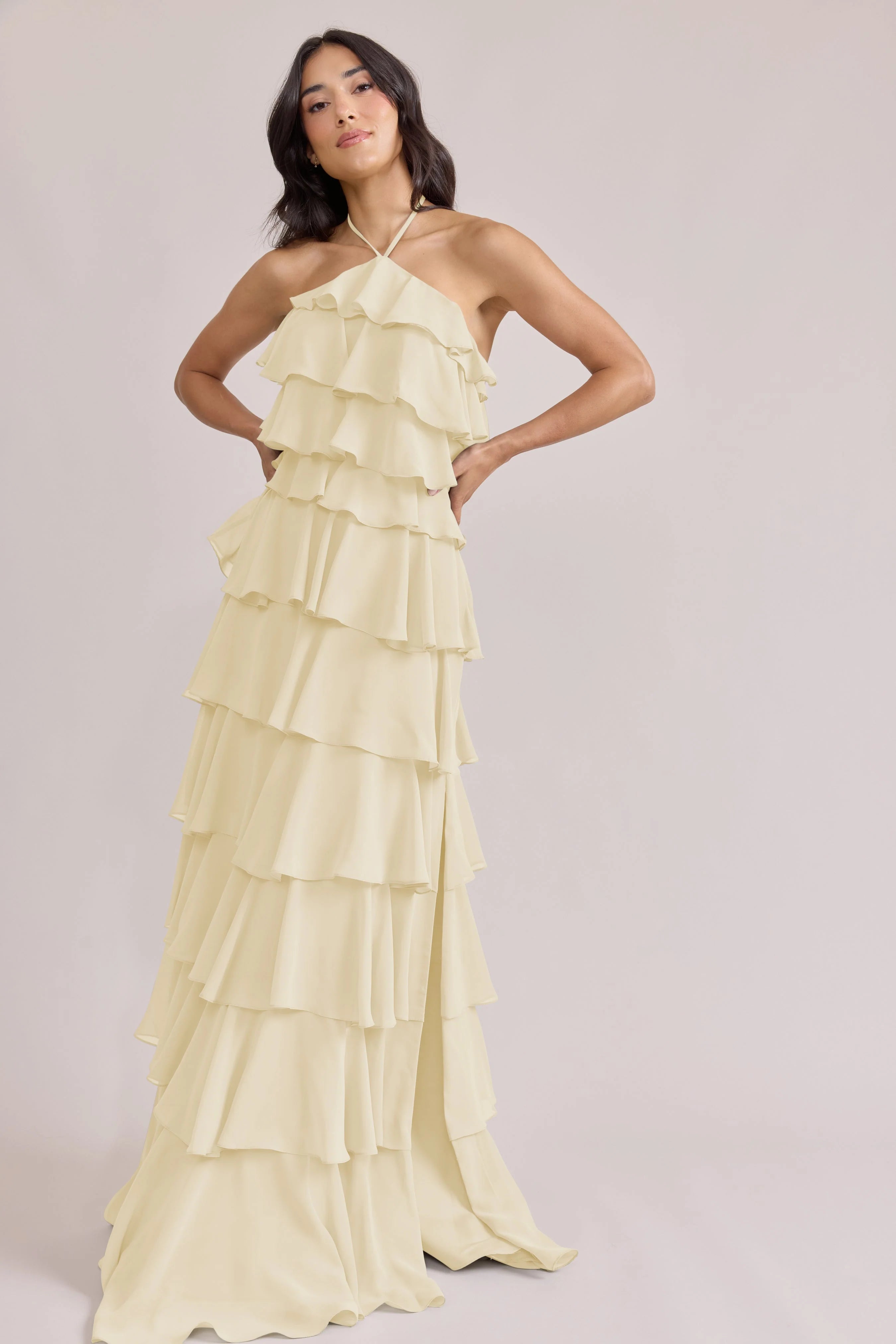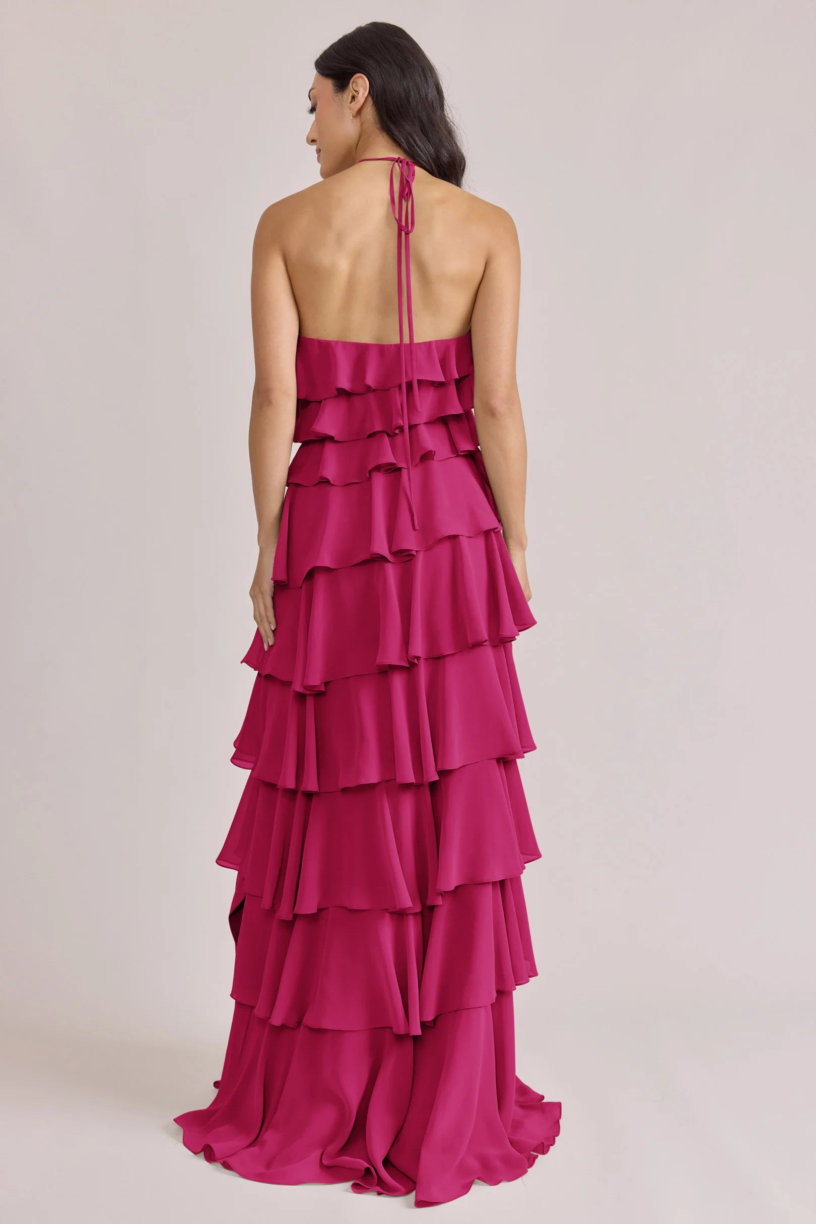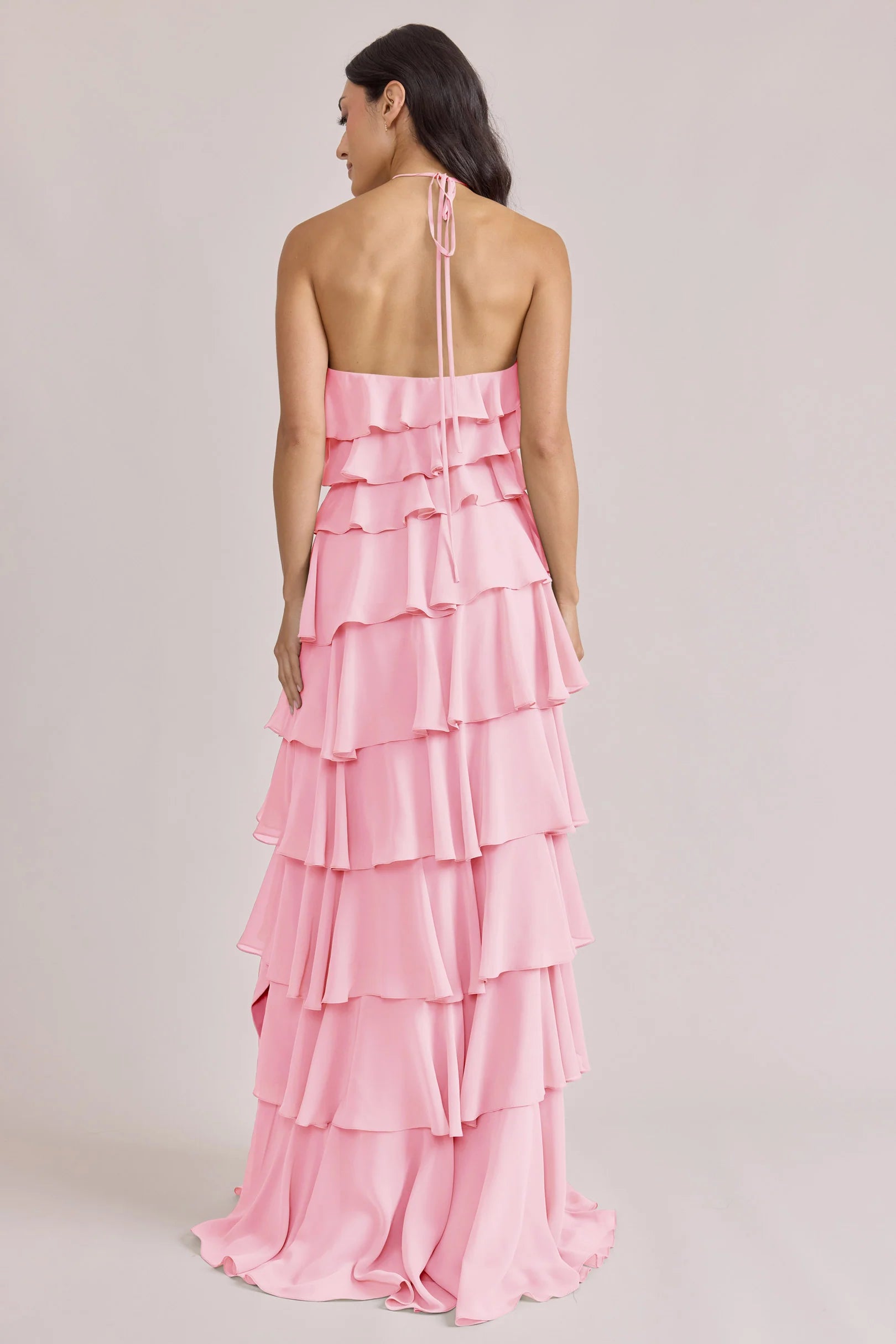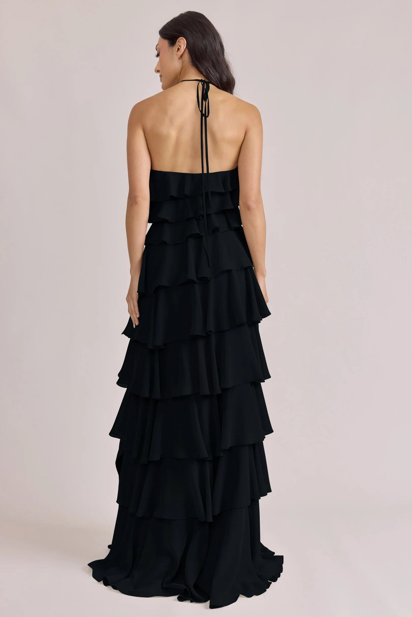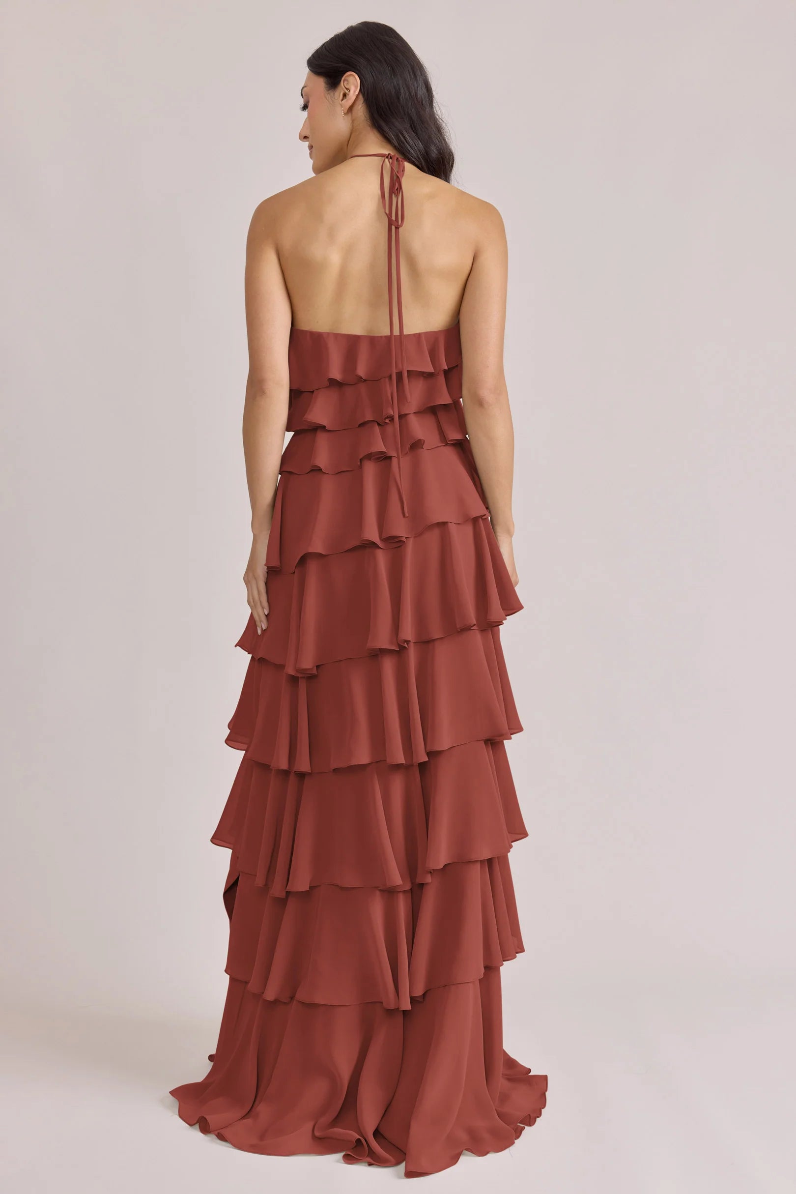 The iconic Tulle Dress reimagined in chiffon. Get ready to turn heads in the Carrie Chiffon Dress! With playful asymmetrical ruffles throughout the length of the dress, this chic and modern dress is perfect for any occasion. Carrie is finished with thin spaghetti halter ties that self-tie at the nape of the neck and a mid-open back for an even flirtier vibe!