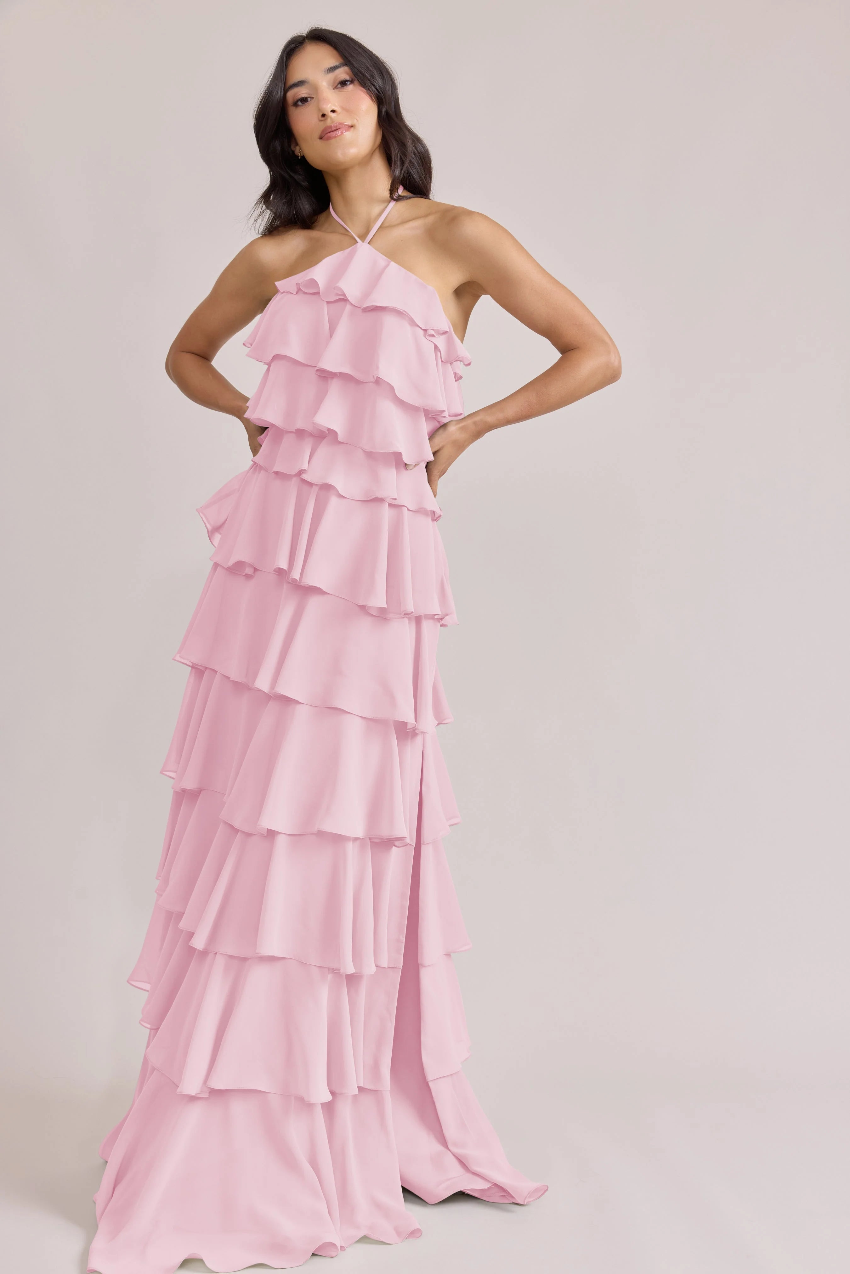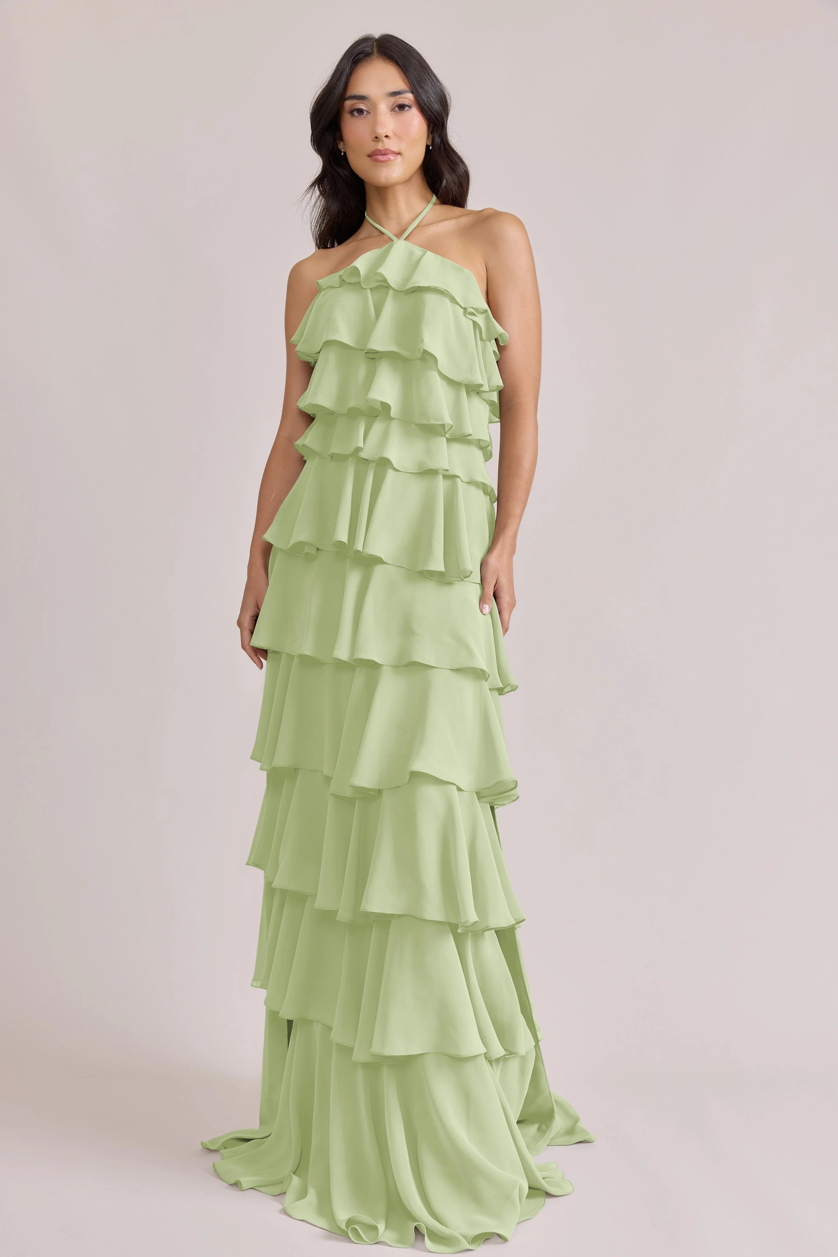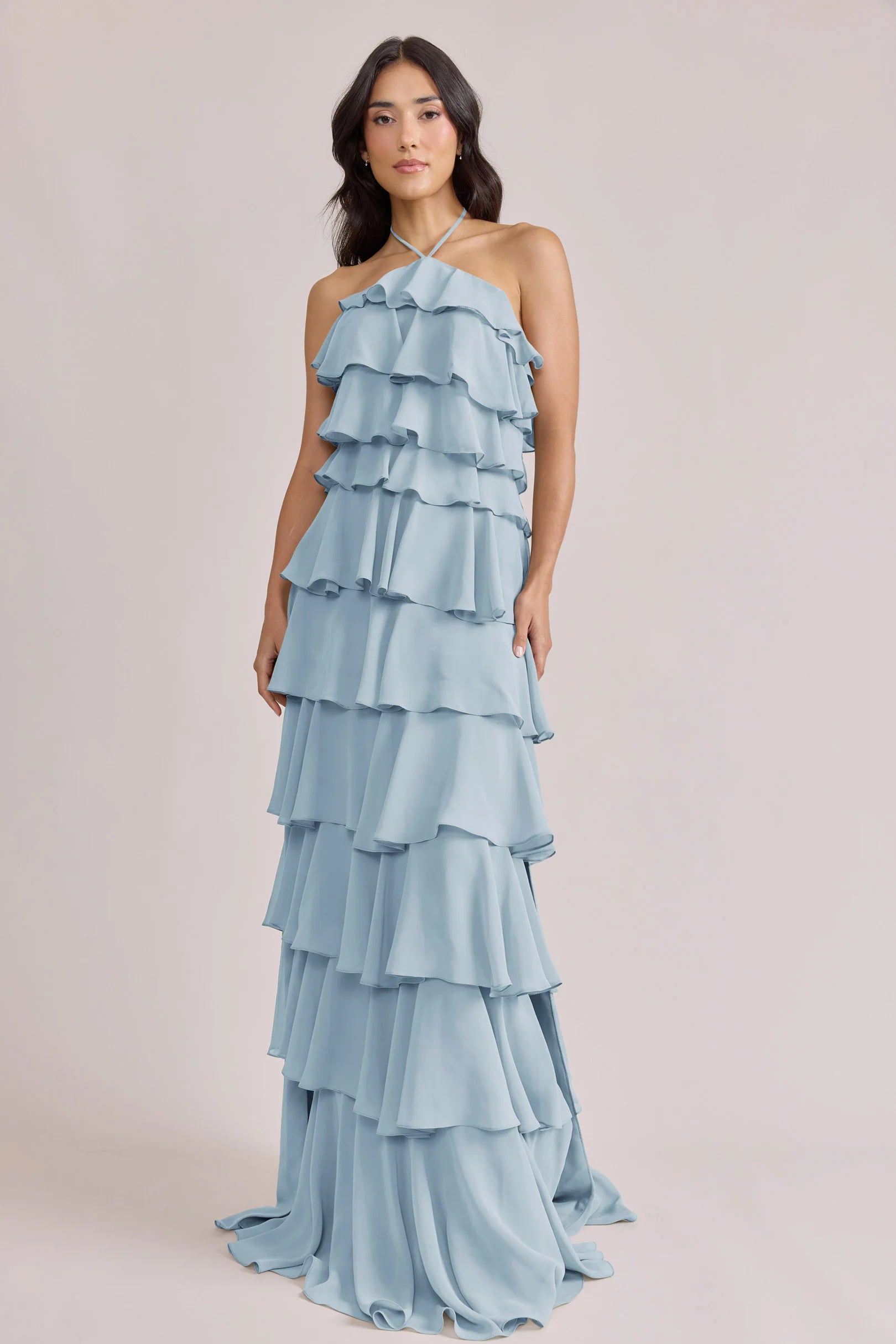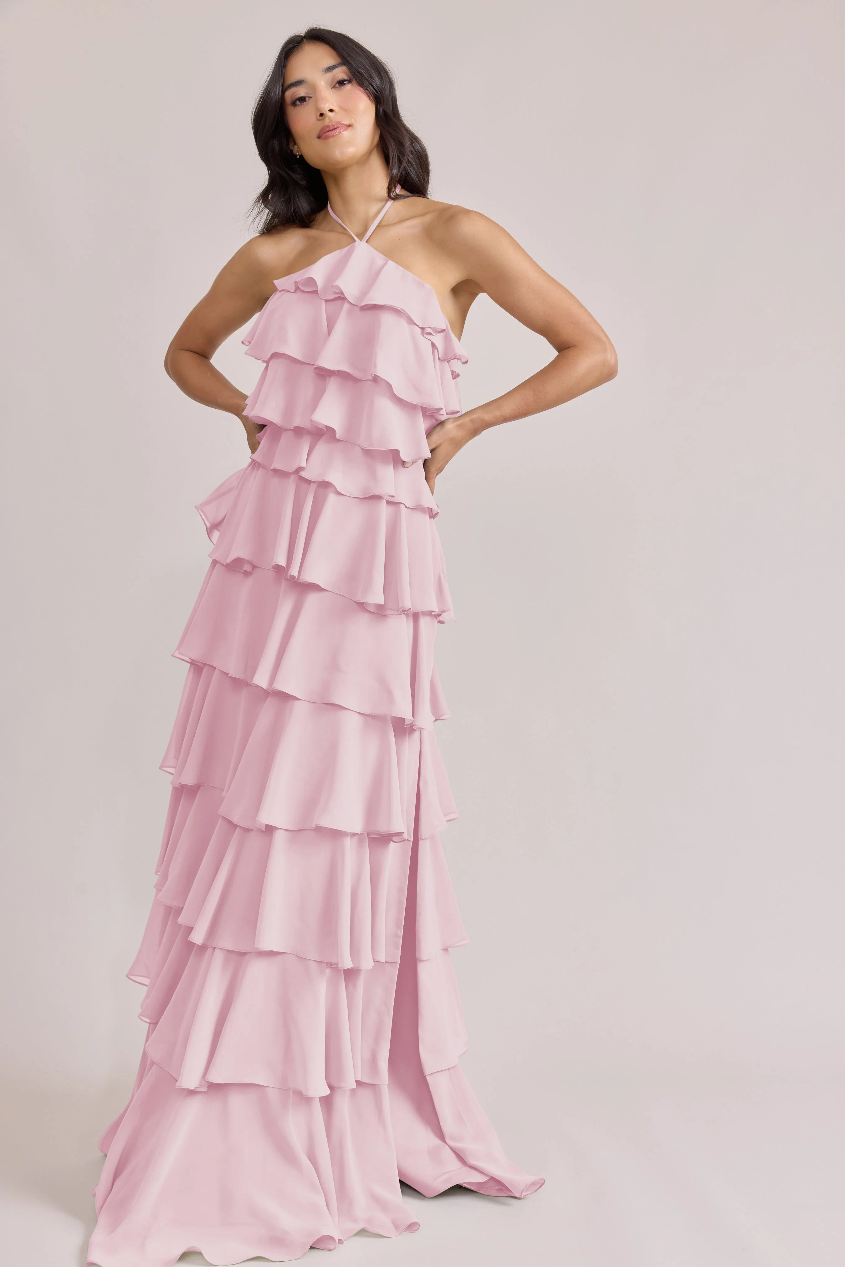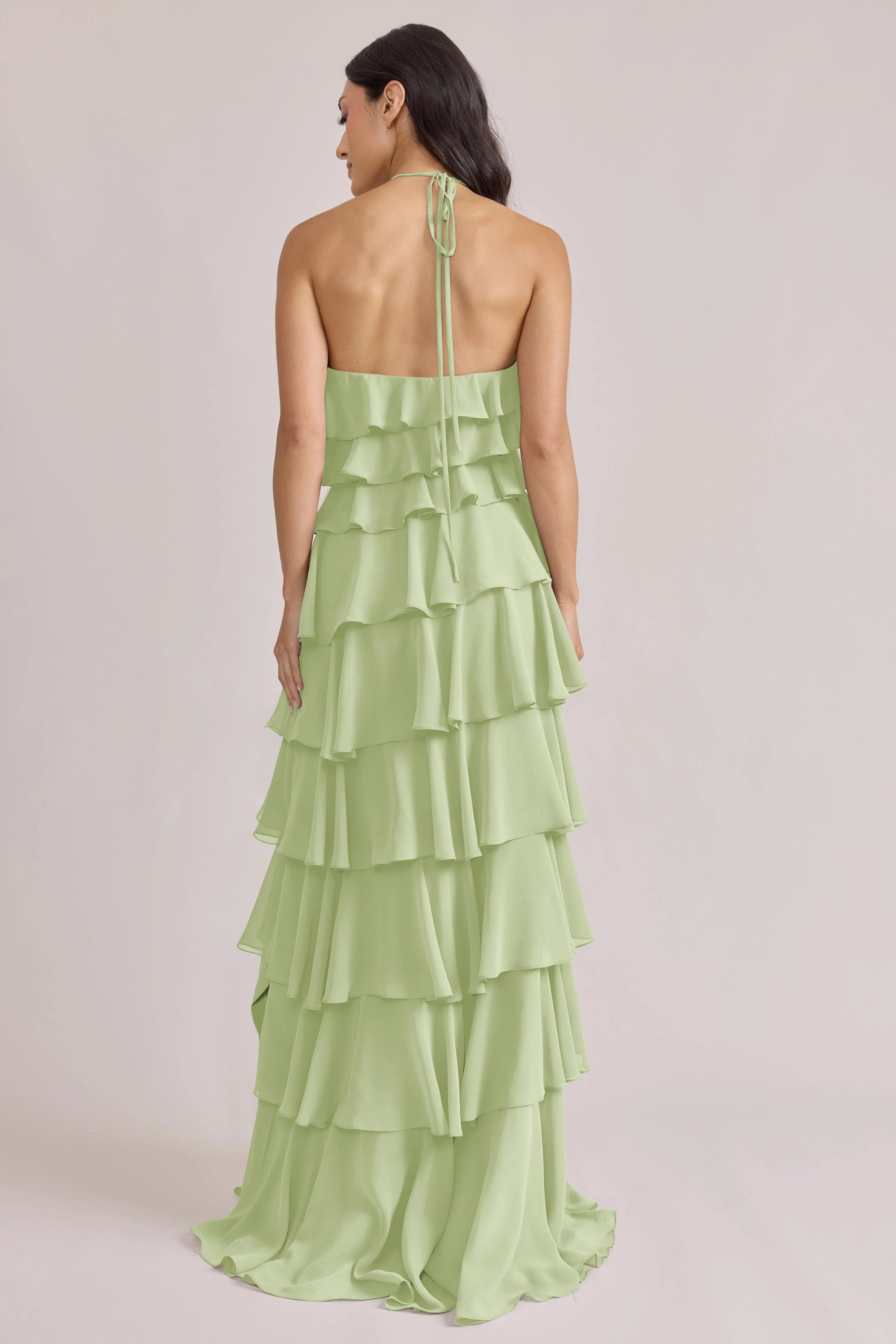 The iconic Tulle Dress reimagined in chiffon. Get ready to turn heads in the Carrie Chiffon Dress! With playful asymmetrical ruffles throughout the length of the dress, this chic and modern dress is perfect for any occasion. Carrie is finished with thin spaghetti halter ties that self-tie at the nape of the neck and a mid-open back for an even flirtier vibe!
