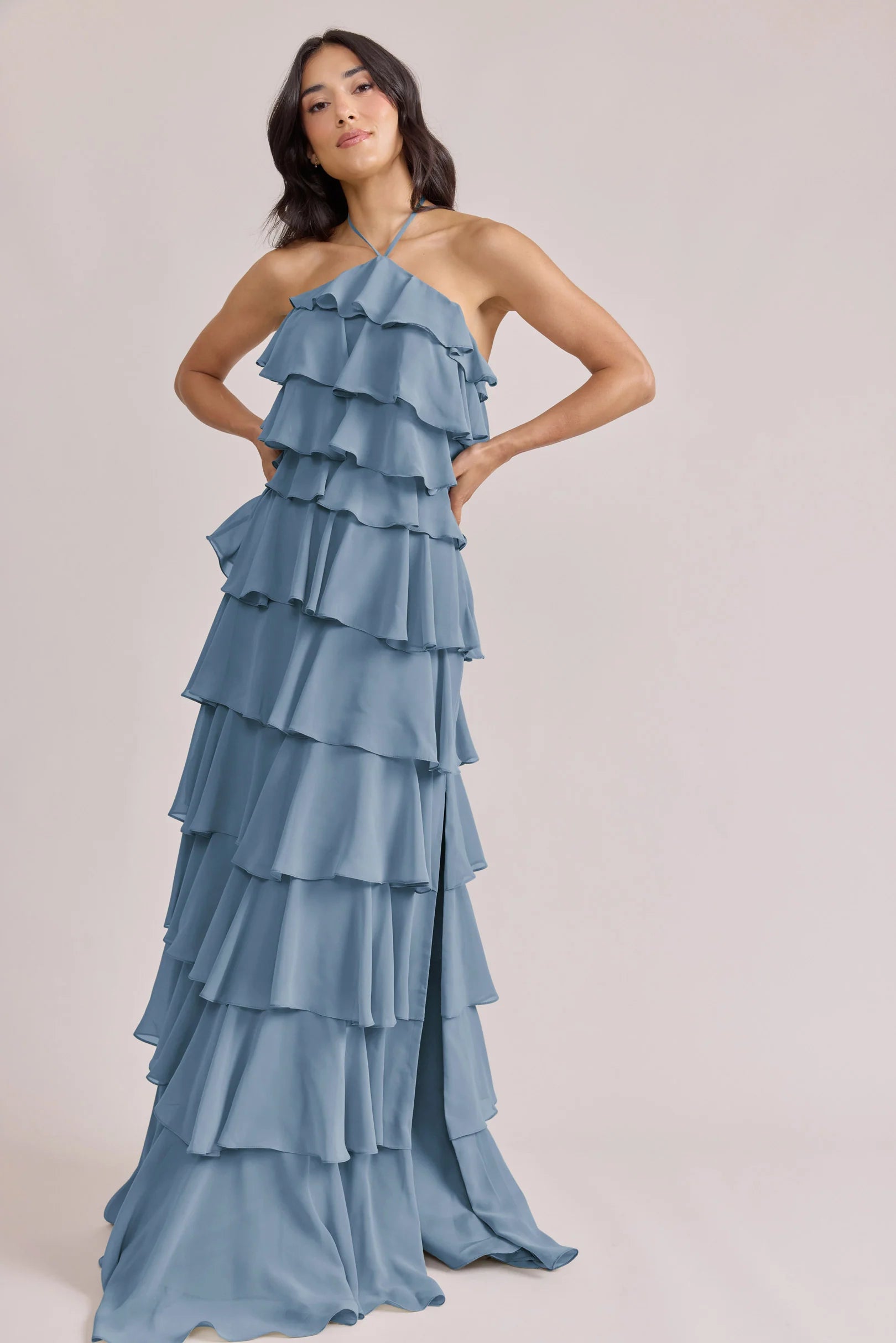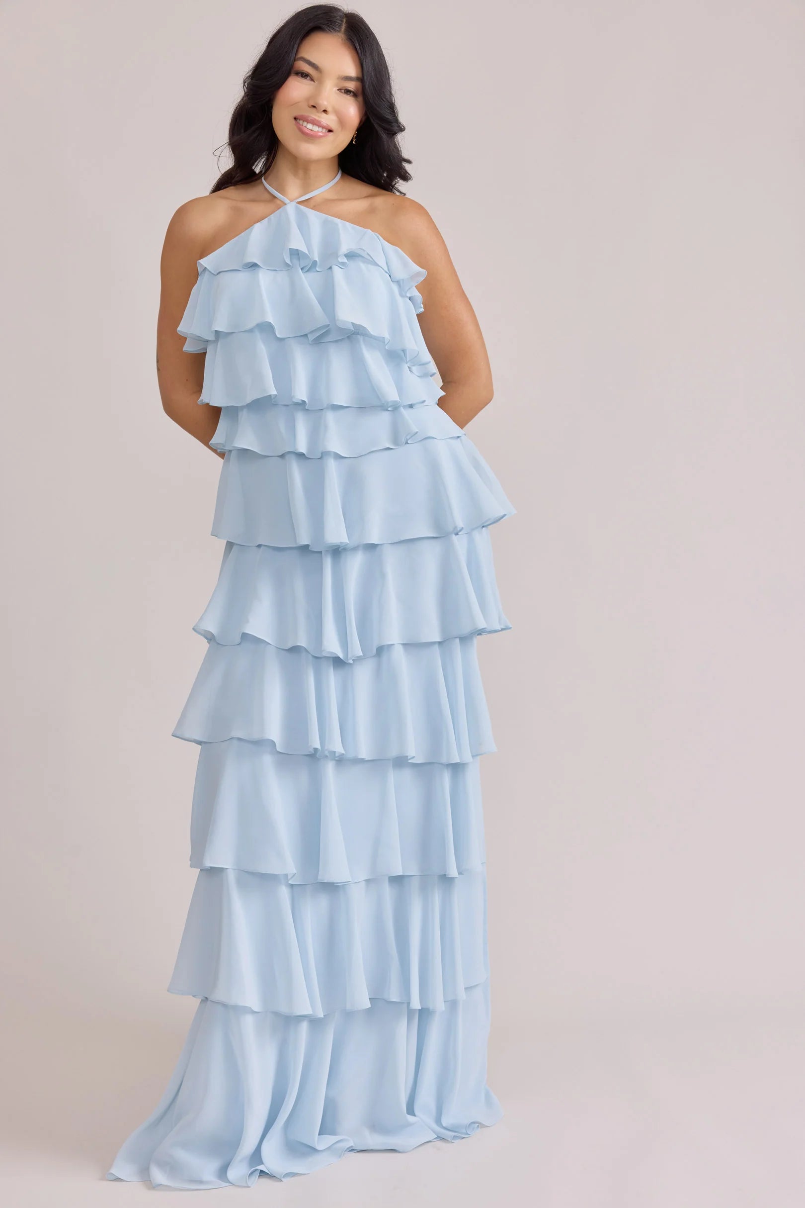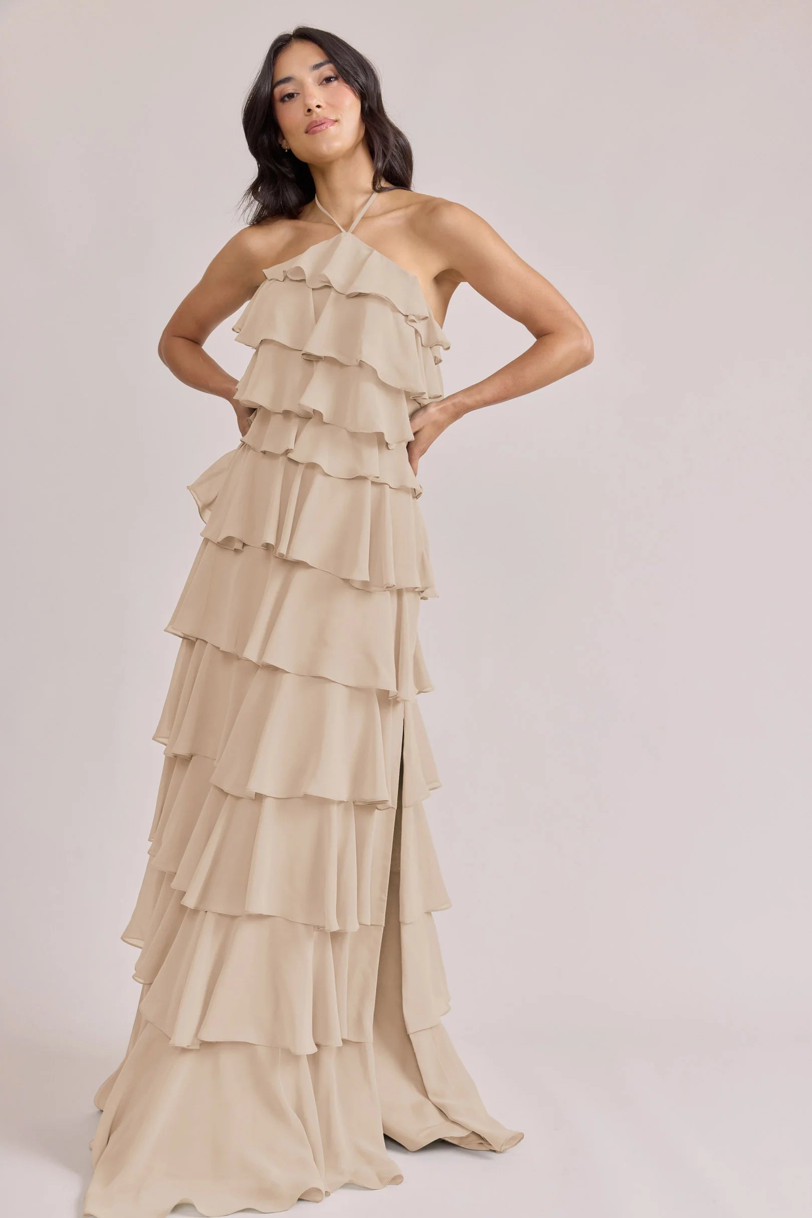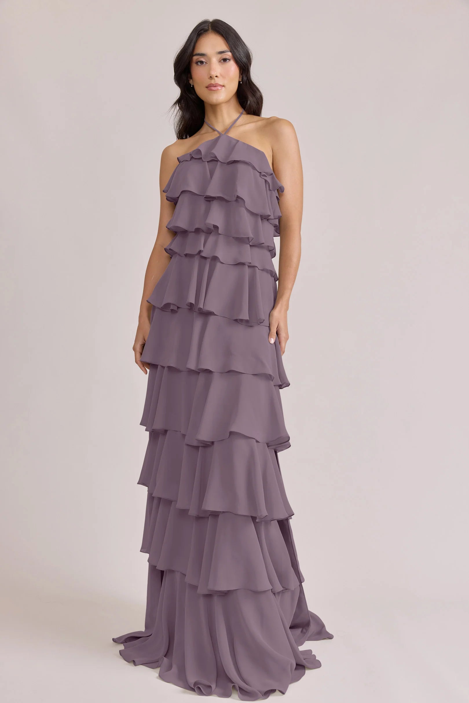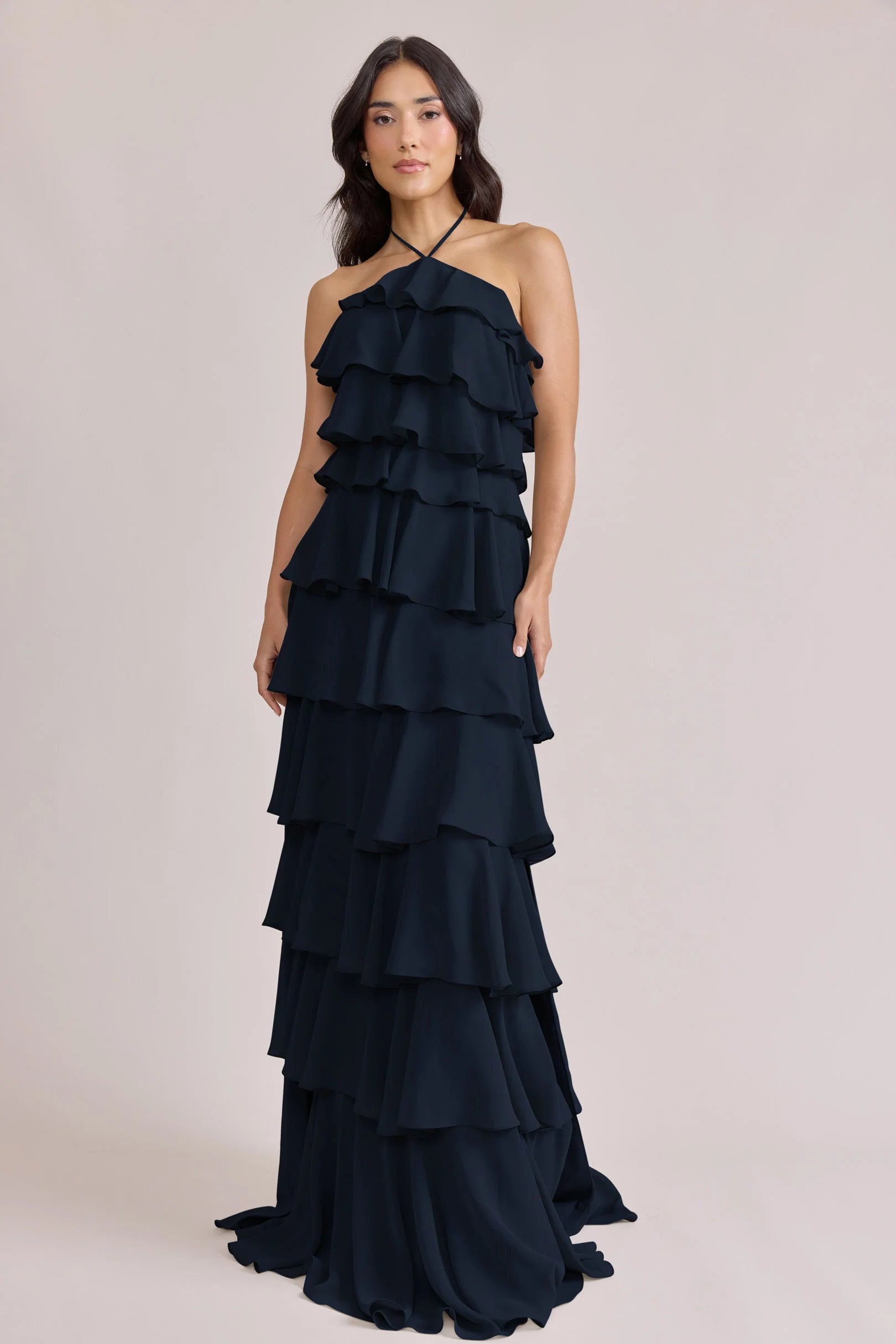 The iconic Tulle Dress reimagined in chiffon. Get ready to turn heads in the Carrie Chiffon Dress! With playful asymmetrical ruffles throughout the length of the dress, this chic and modern dress is perfect for any occasion. Carrie is finished with thin spaghetti halter ties that self-tie at the nape of the neck and a mid-open back for an even flirtier vibe!