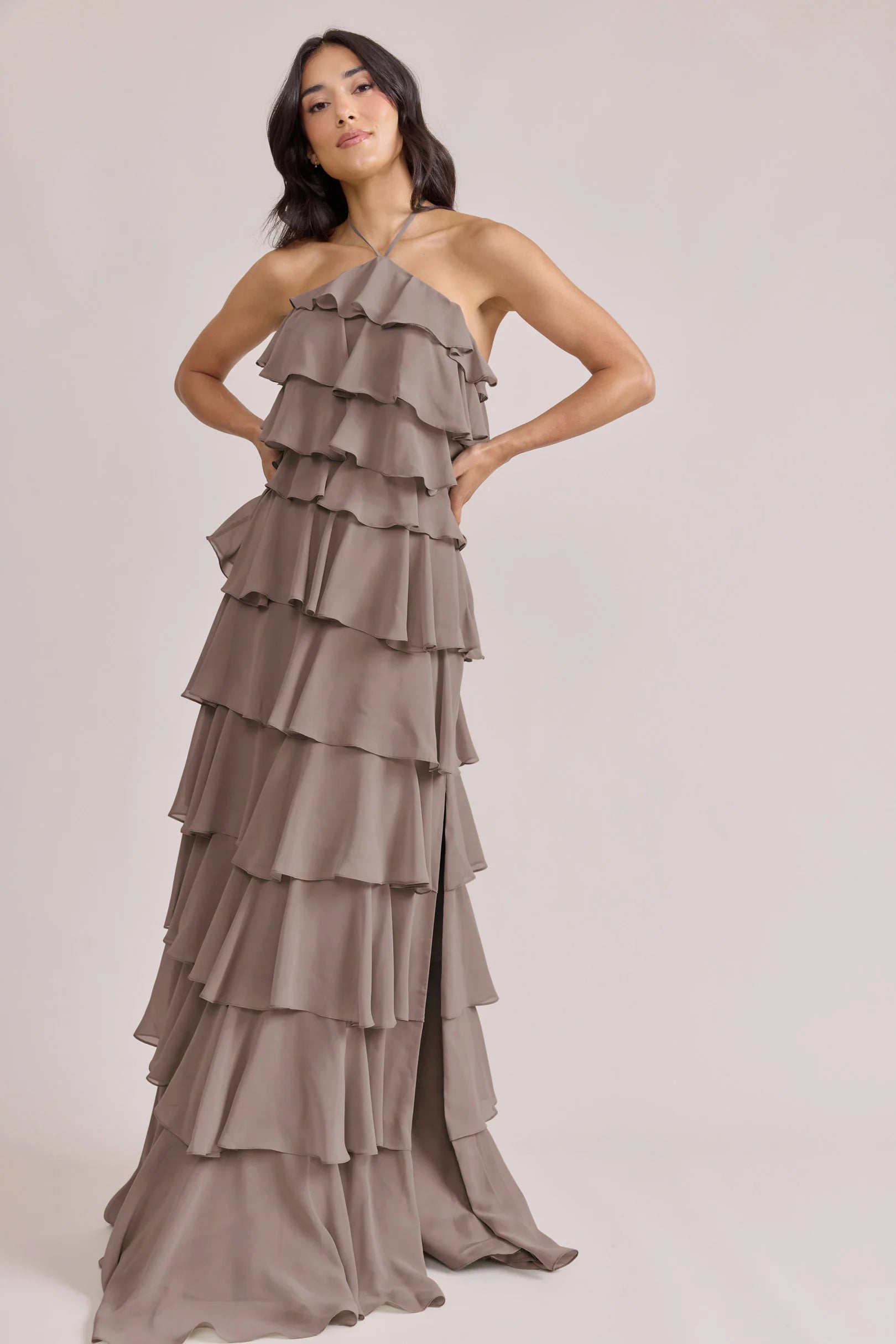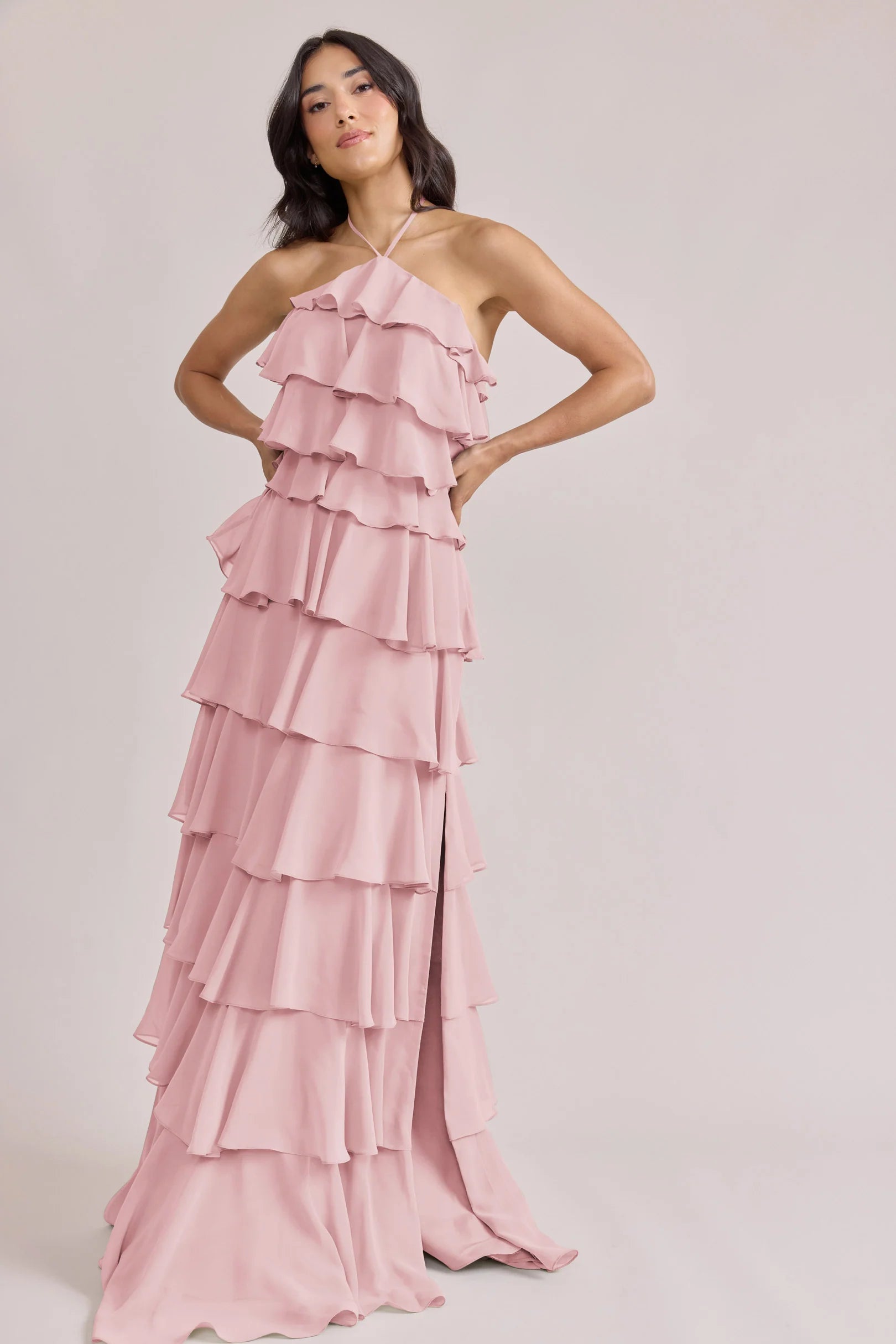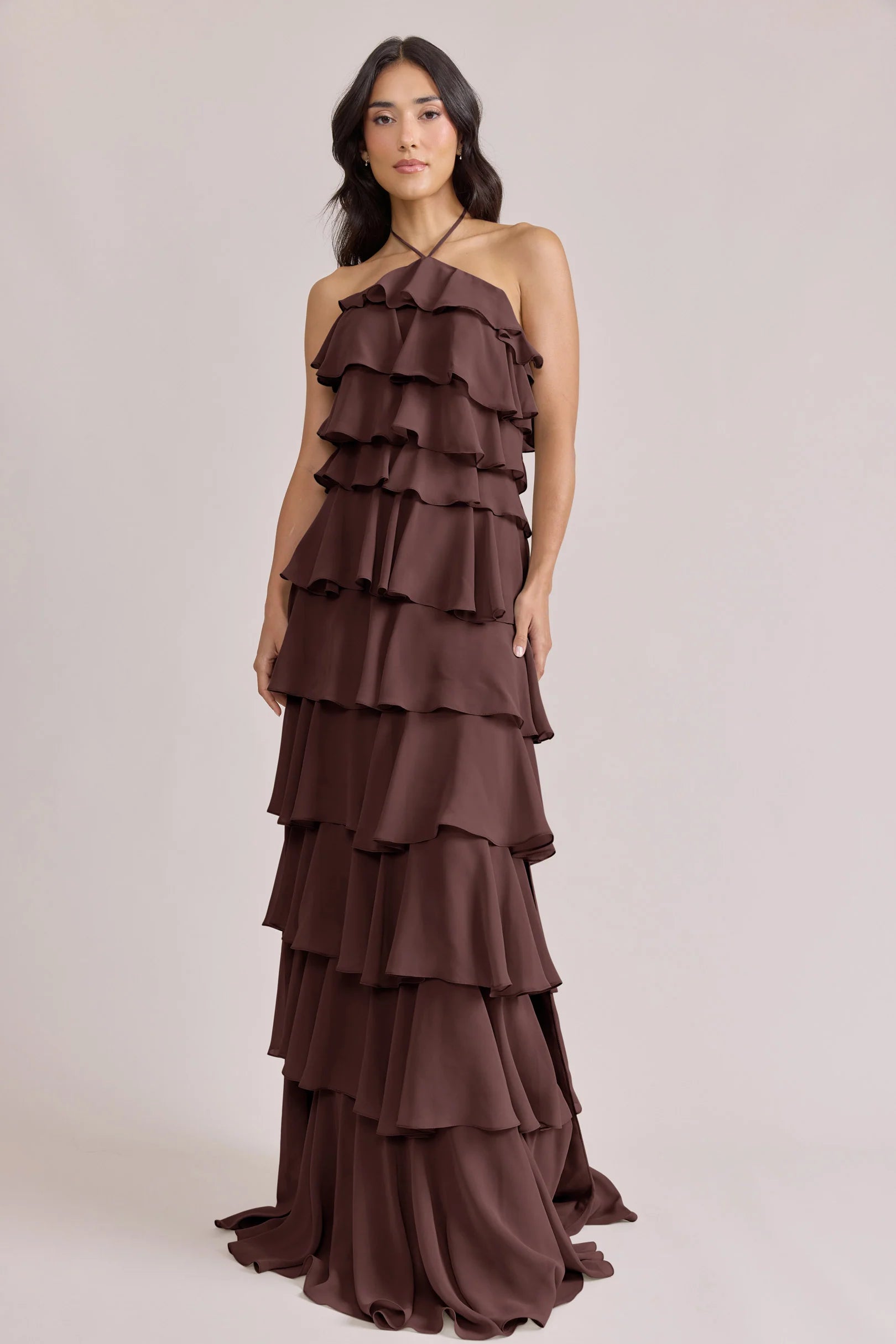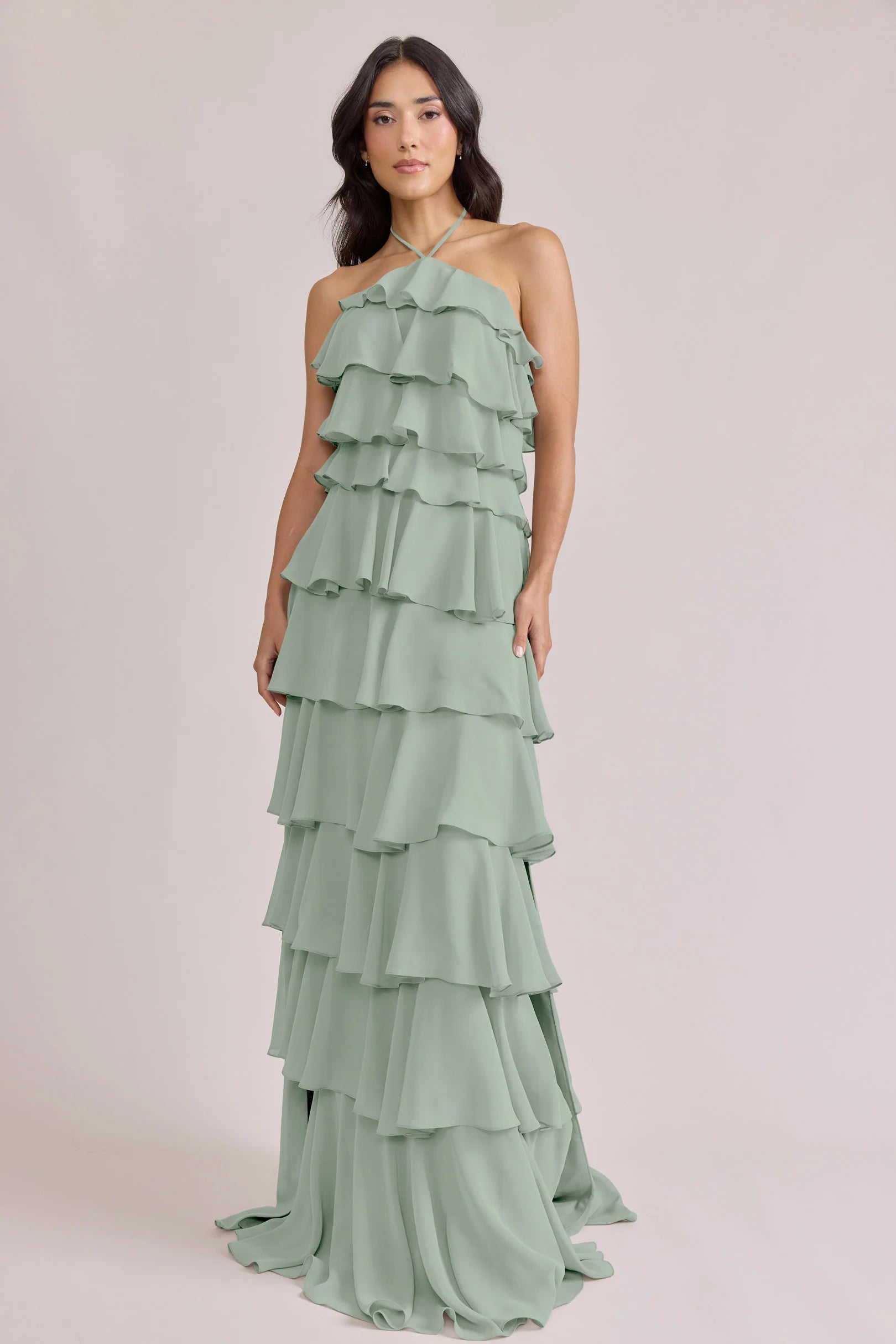 The iconic Tulle Dress reimagined in chiffon. Get ready to turn heads in the Carrie Chiffon Dress! With playful asymmetrical ruffles throughout the length of the dress, this chic and modern dress is perfect for any occasion. Carrie is finished with thin spaghetti halter ties that self-tie at the nape of the neck and a mid-open back for an even flirtier vibe!