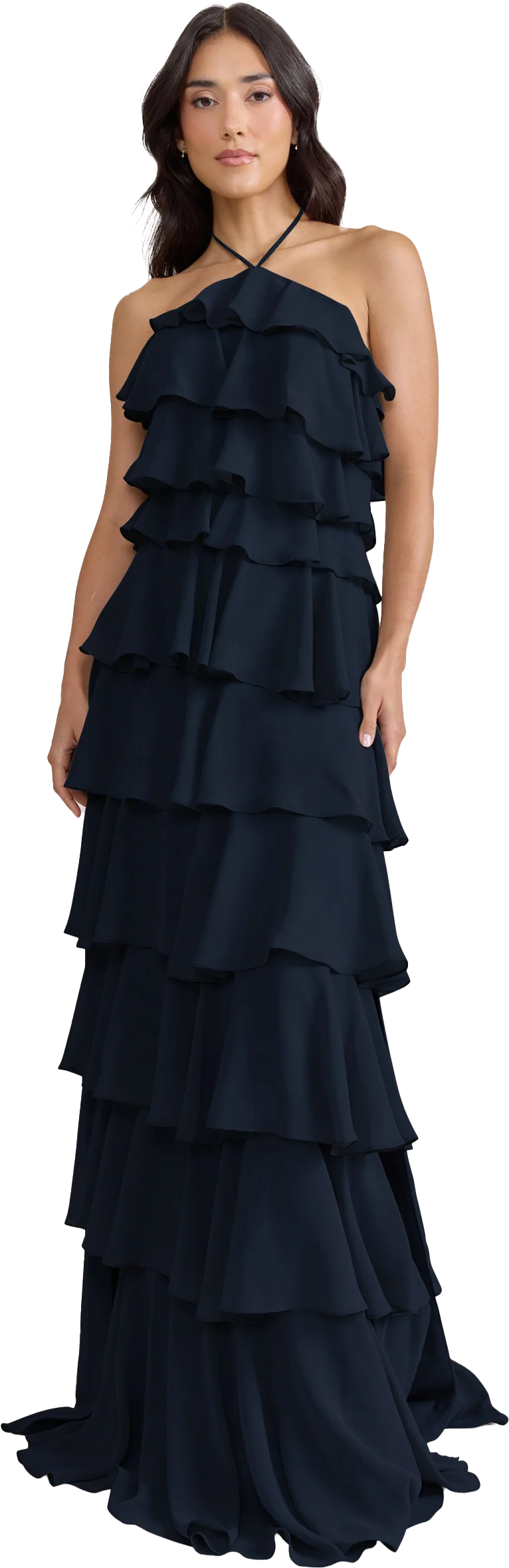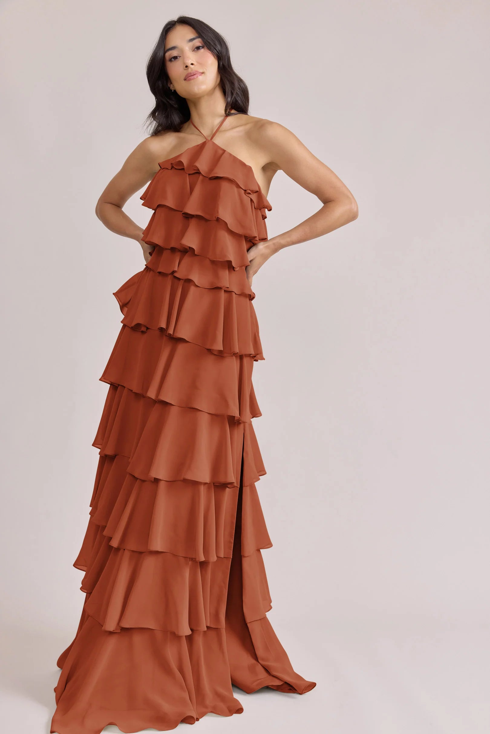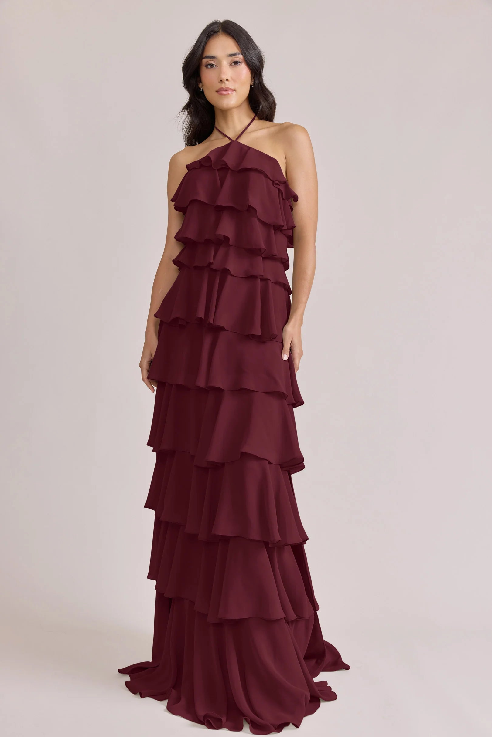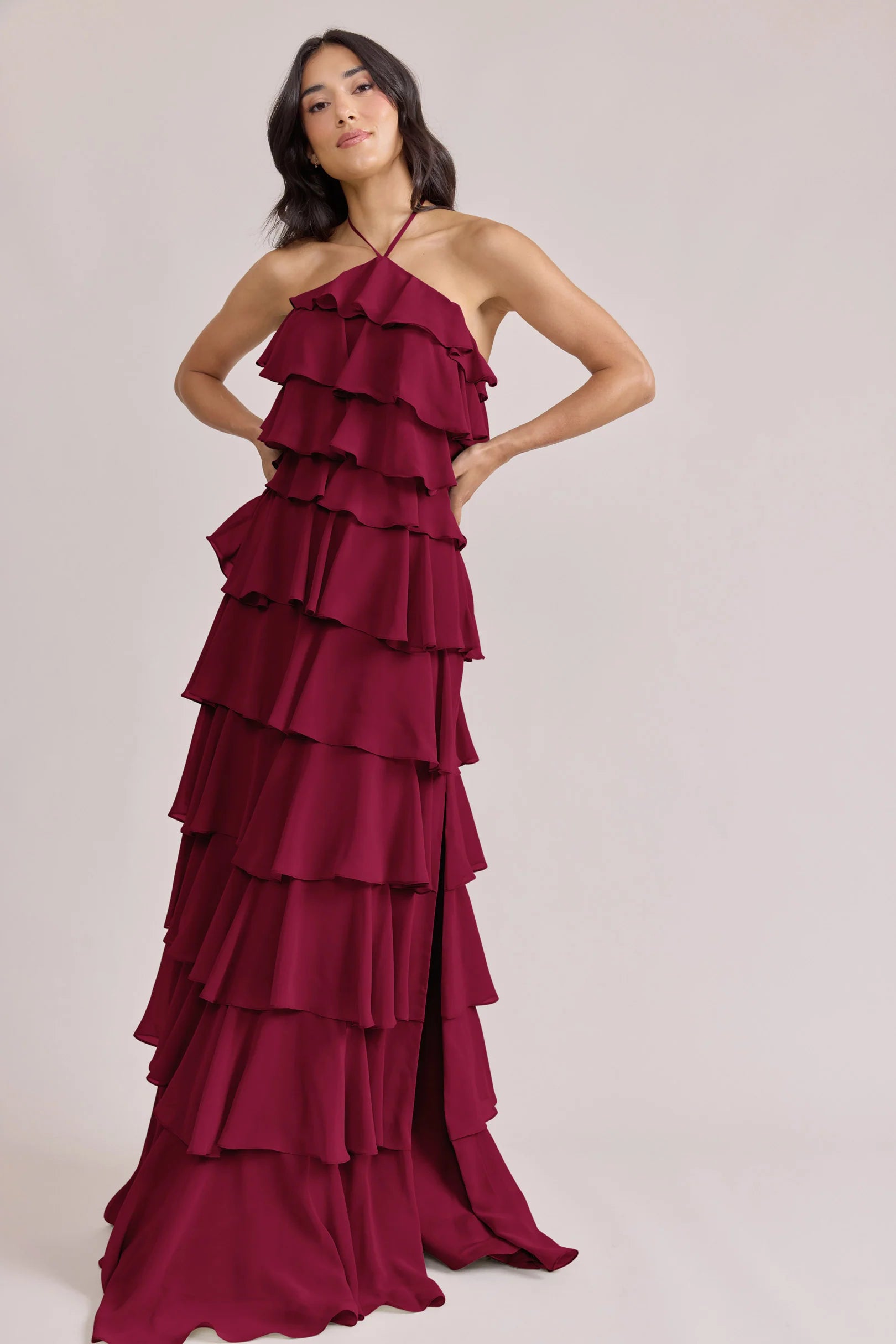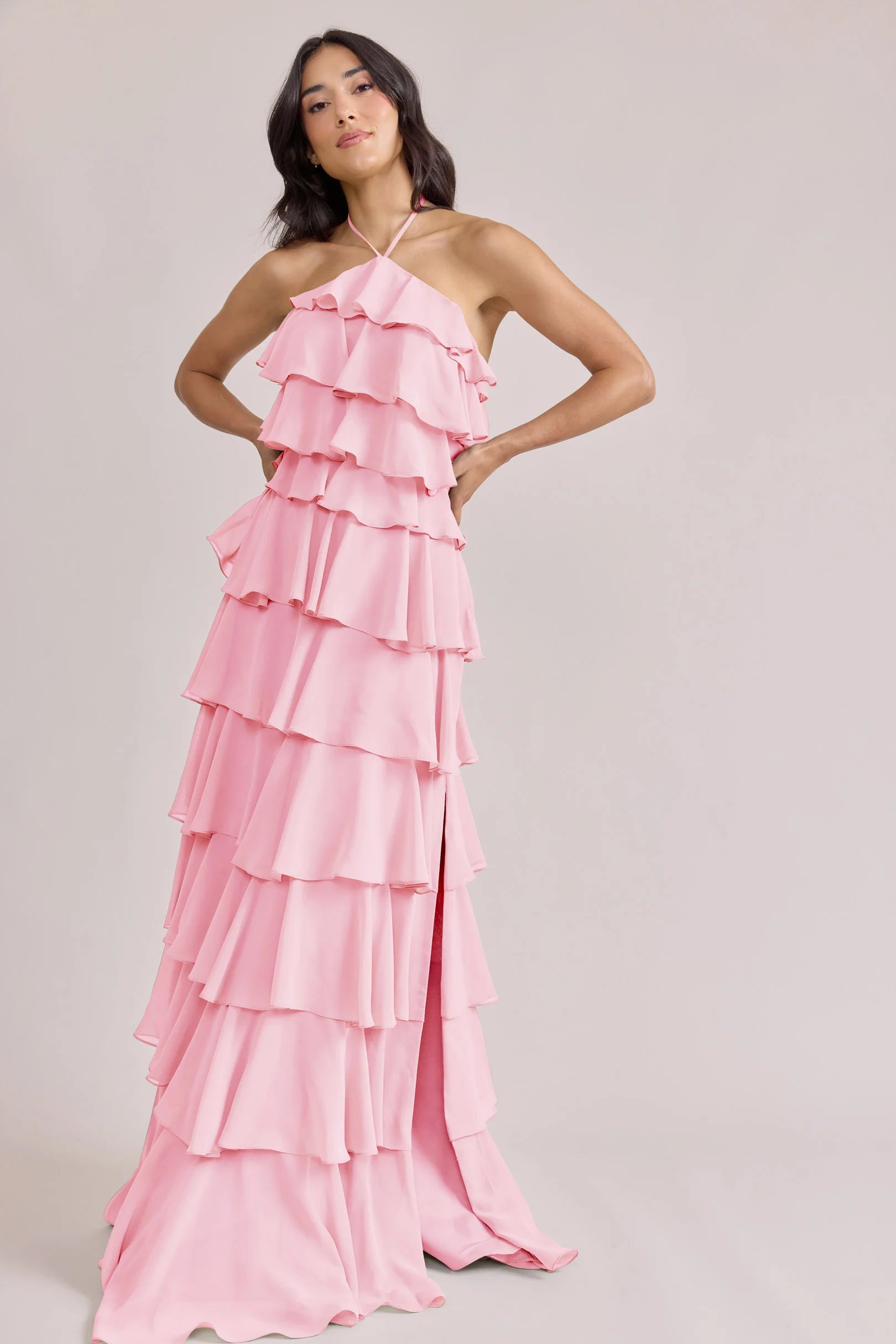 The iconic Tulle Dress reimagined in chiffon. Get ready to turn heads in the Carrie Chiffon Dress! With playful asymmetrical ruffles throughout the length of the dress, this chic and modern dress is perfect for any occasion. Carrie is finished with thin spaghetti halter ties that self-tie at the nape of the neck and a mid-open back for an even flirtier vibe!