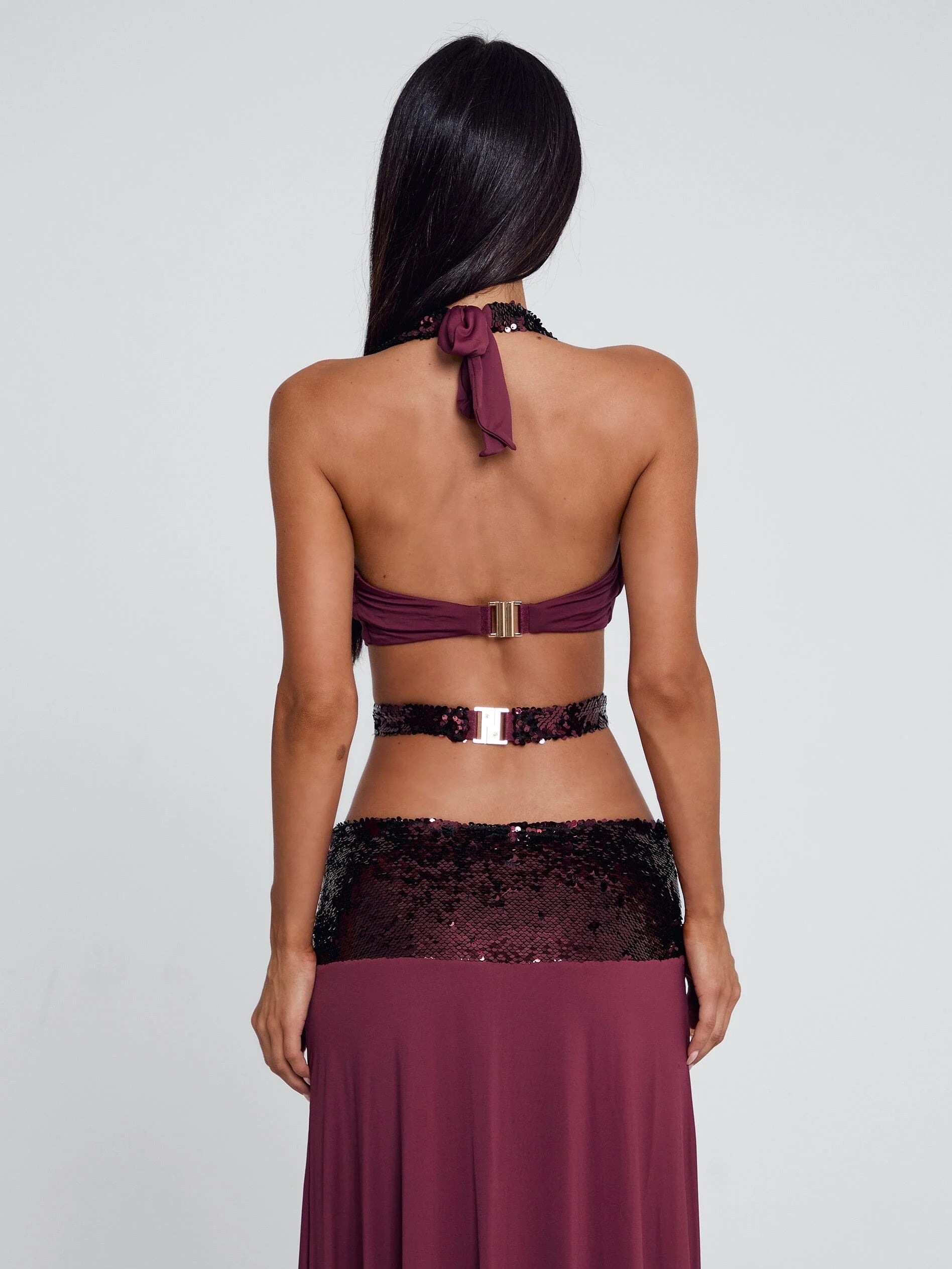 Crafted from a soft jersey fabrication, she features subtle sequin detailing that catches the light with every movement. The micro-cropped silhouette is balanced by a tie-up halter neckline and an open back, finished with a clasp closure for a secure fit.