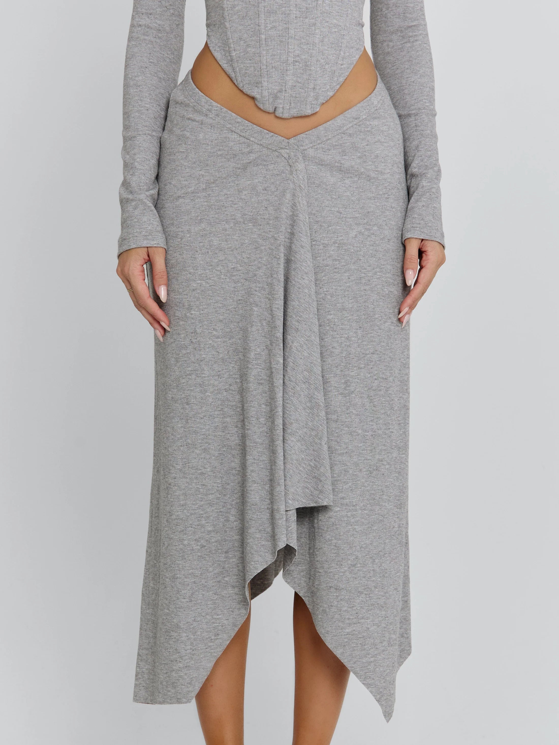 Made from the same soft, stretchy rib fabrication, she sits low on the waist with an angled V-front waistband that flatters the figure. The relaxed fullness and handkerchief hem create a fluid silhouette, while the unlined construction keeps the skirt lightweight and comfortable.