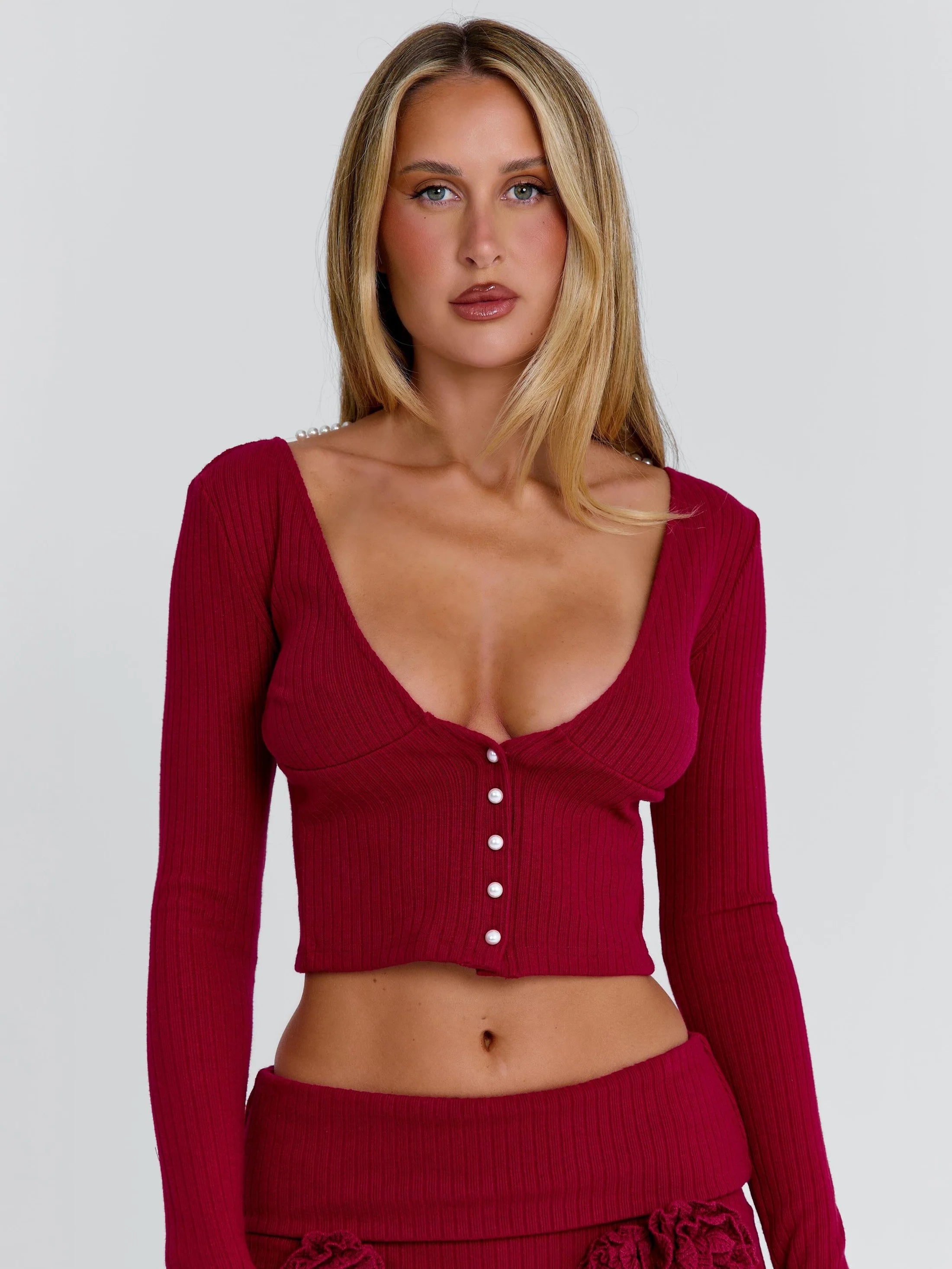 Designed in a stretchy rib knit fabrication with a fitted silhouette, the Cereza Top features a pearl button closure at the front and a pearl strap detail at the back for an elevated finish. Subtle ruffle detailing at the sleeve openings adds a soft touch, making this piece effortless to wear while still feeling special.