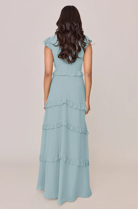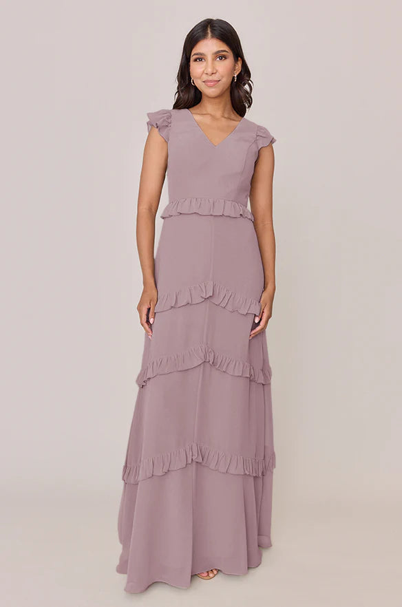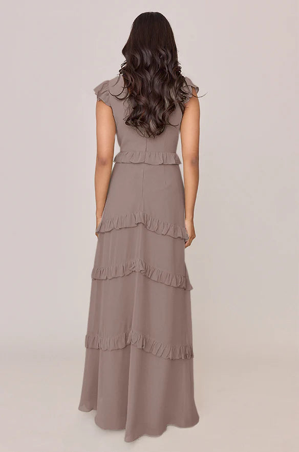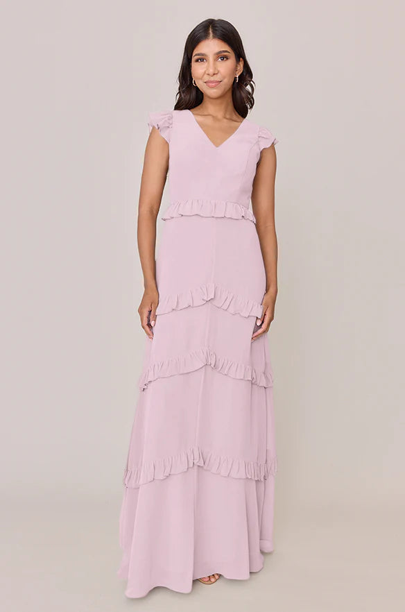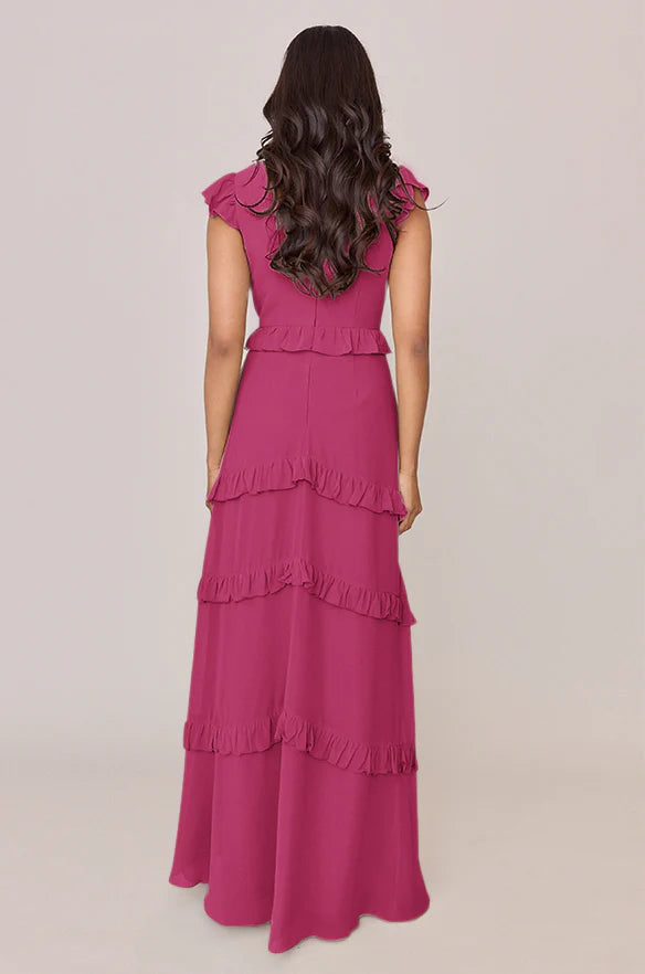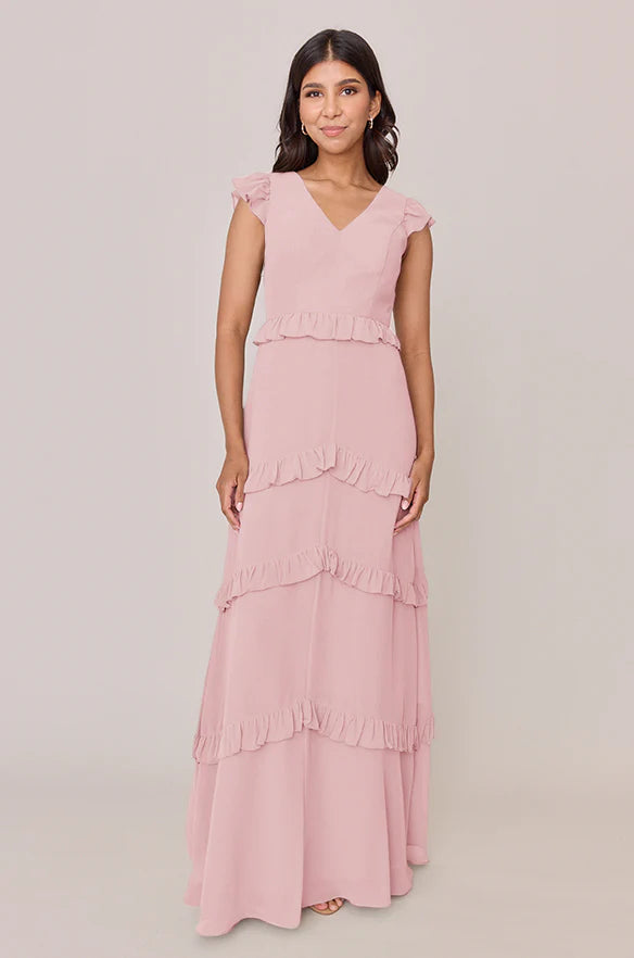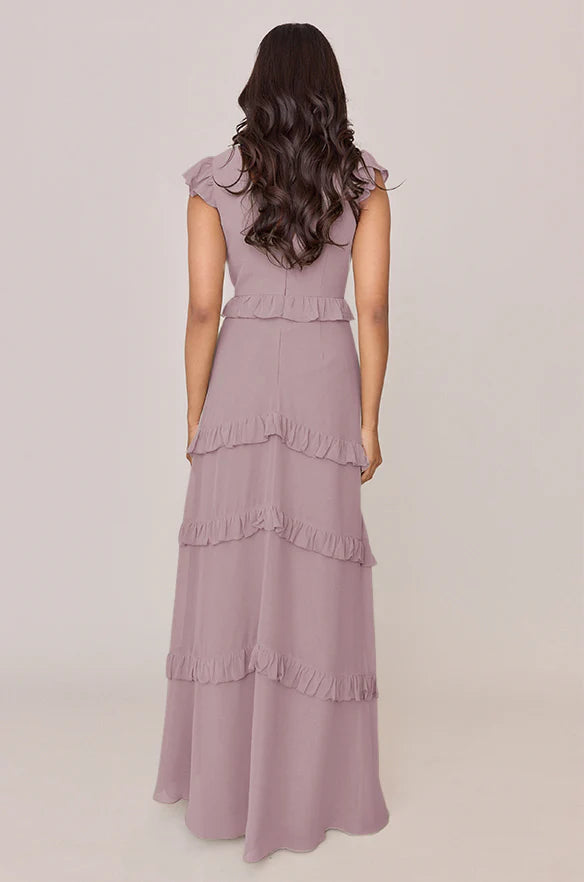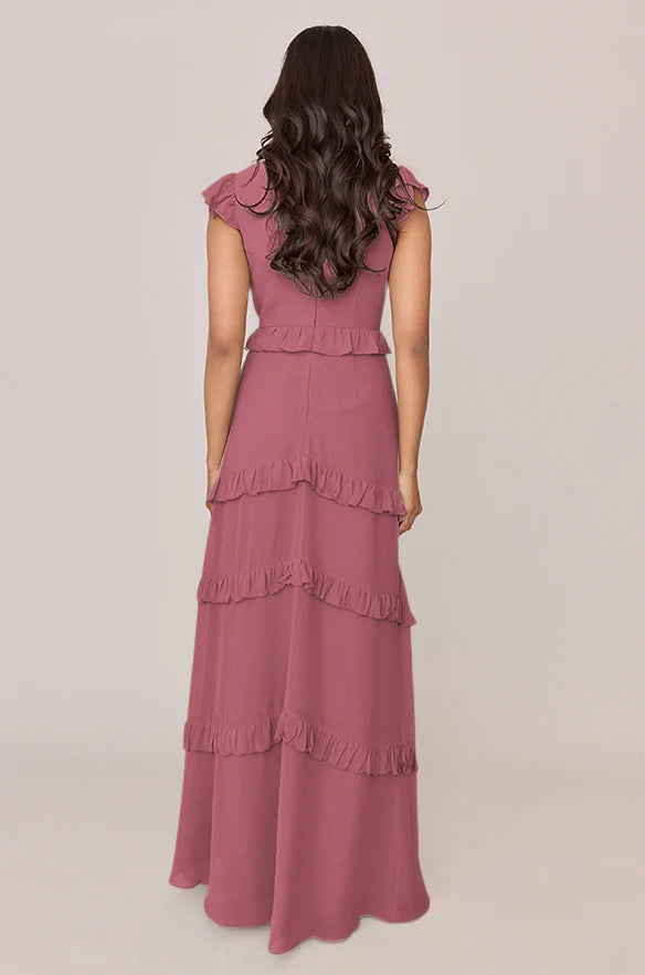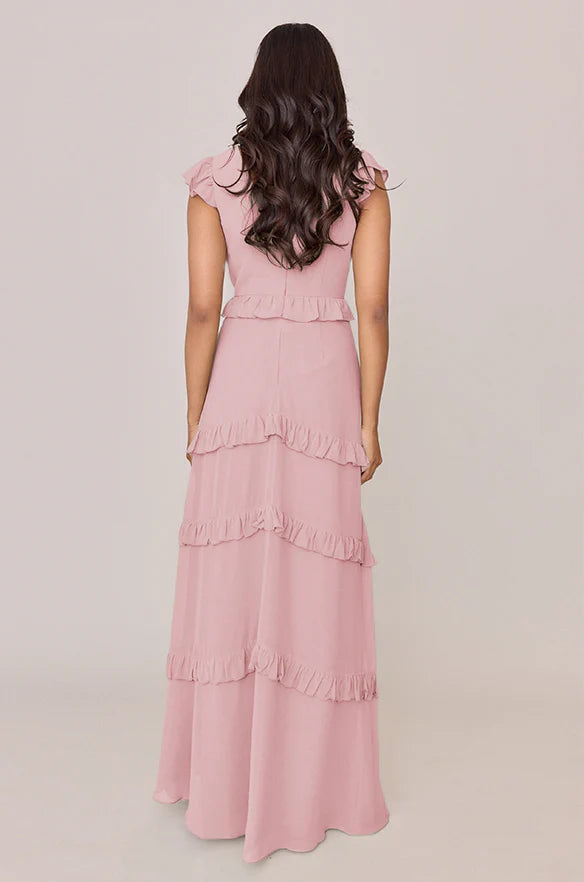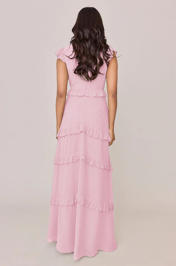 Our Ellapink Chiffon dress is a flawless style that is the missing piece to your bridal lineup! Amelia has divine ruffled tiers, short flutter sleeves, and a moderate v-neck to provide a playful, but romantic style. Pair this style with our Harley Chiffon dress to add some textures to your dreamy wedding look!