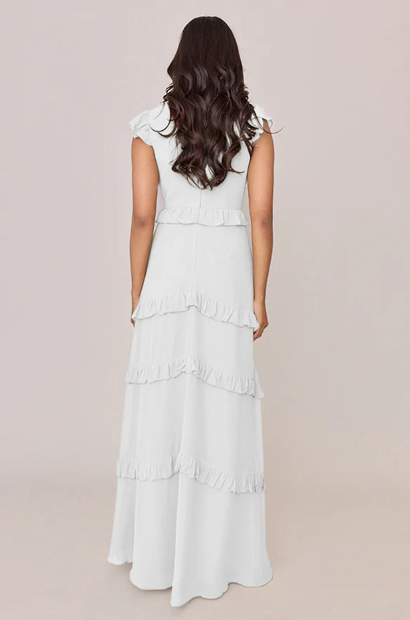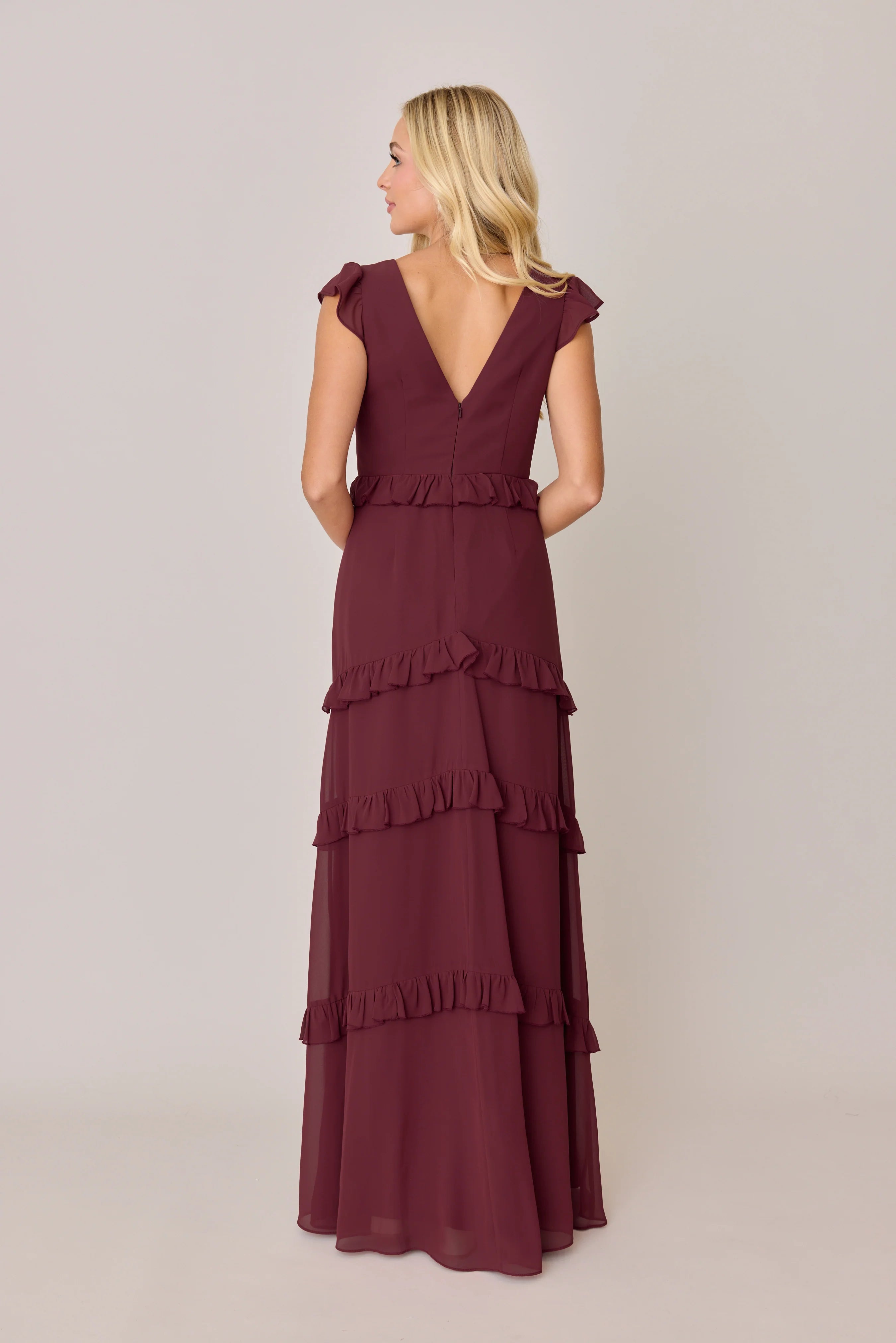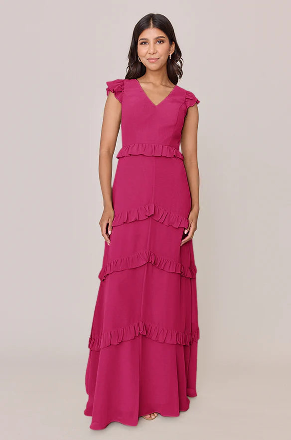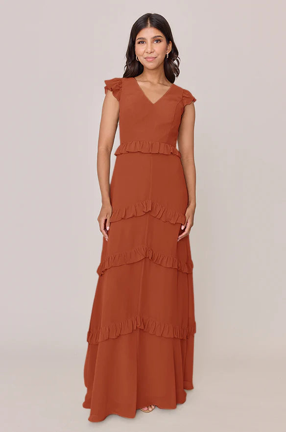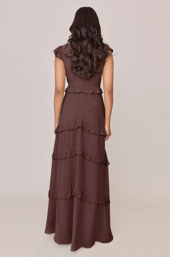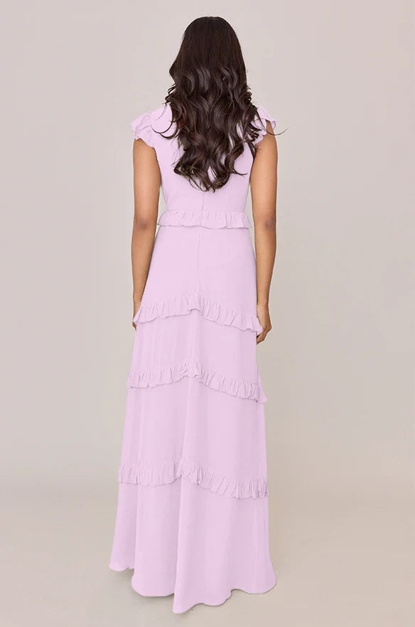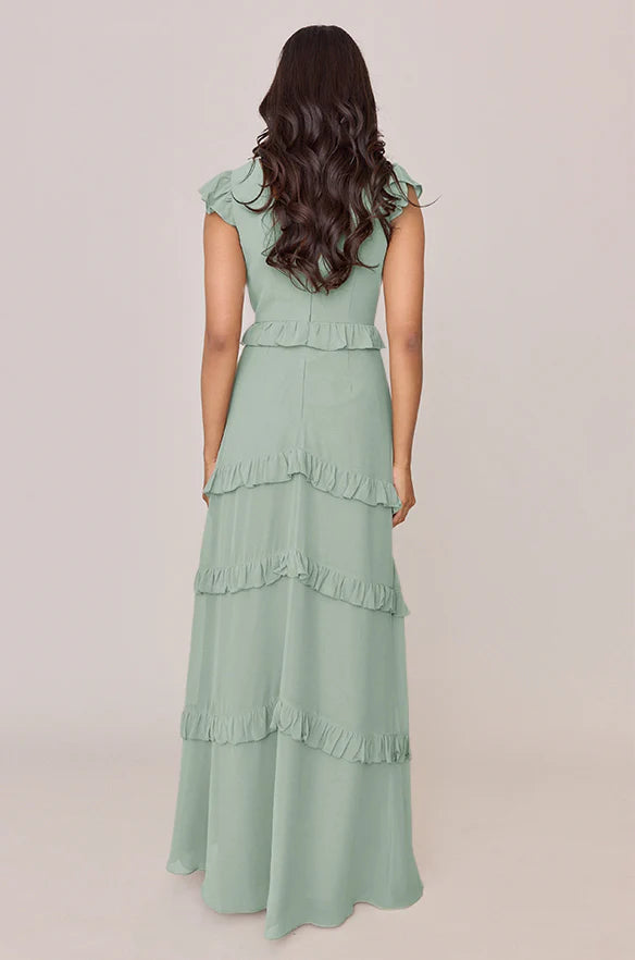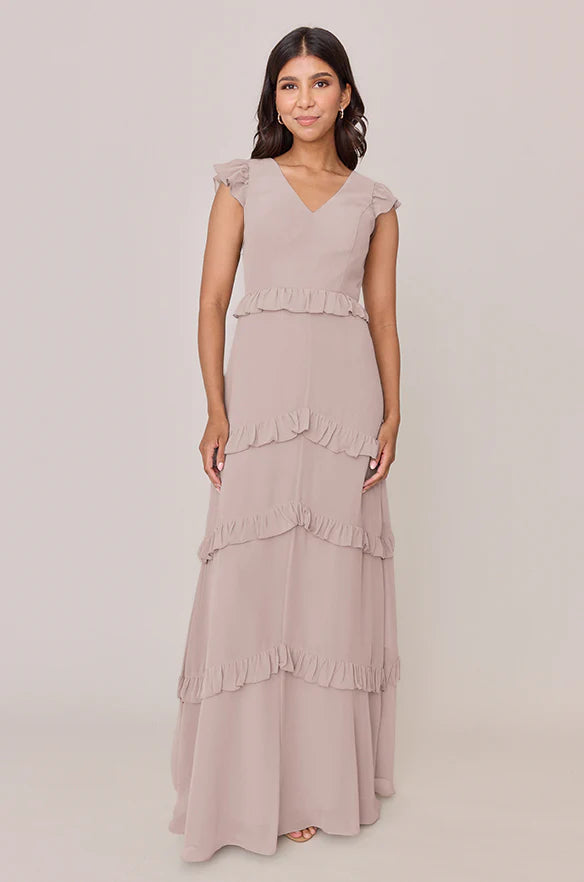Our Ellapink Chiffon dress is a flawless style that is the missing piece to your bridal lineup! Amelia has divine ruffled tiers, short flutter sleeves, and a moderate v-neck to provide a playful, but romantic style. Pair this style with our Harley Chiffon dress to add some textures to your dreamy wedding look!