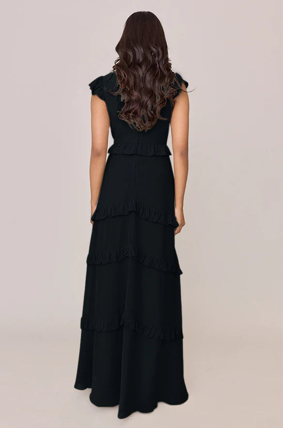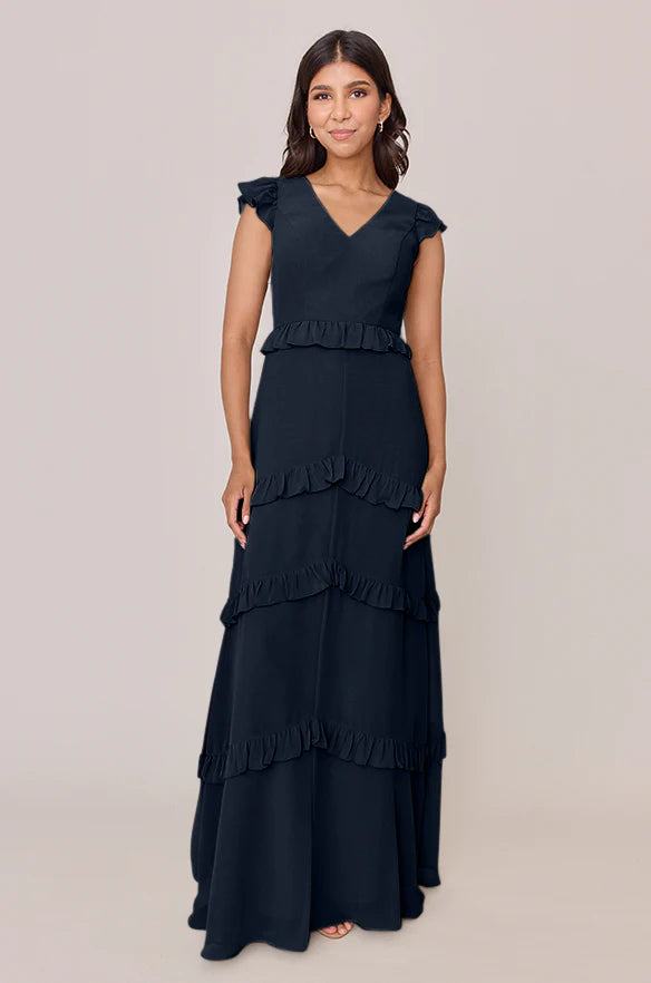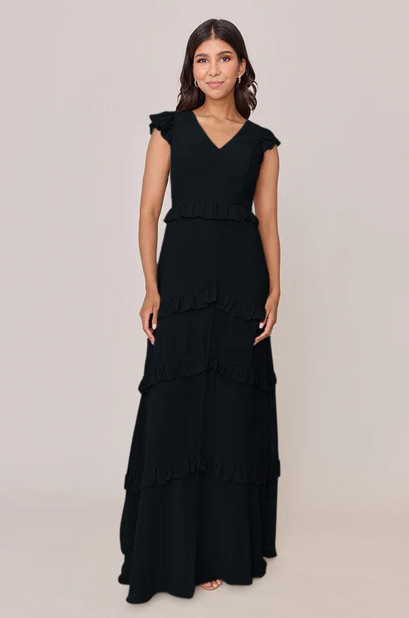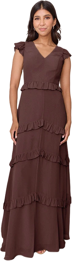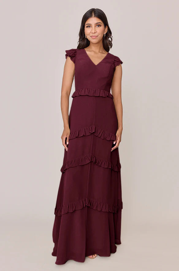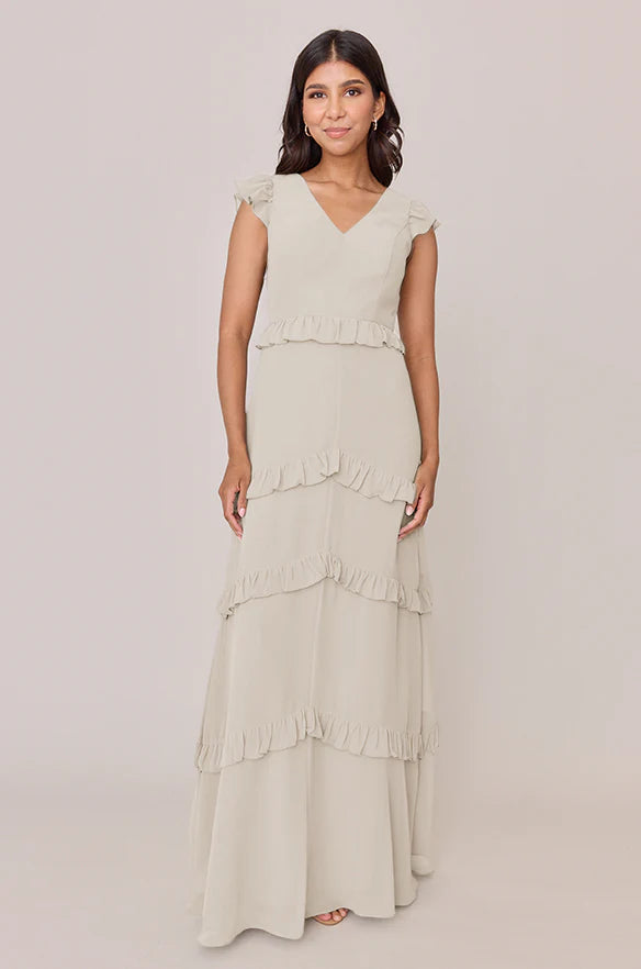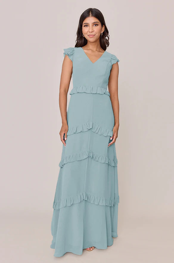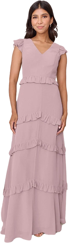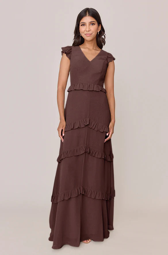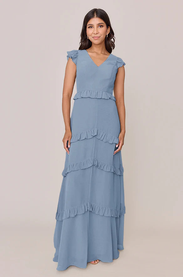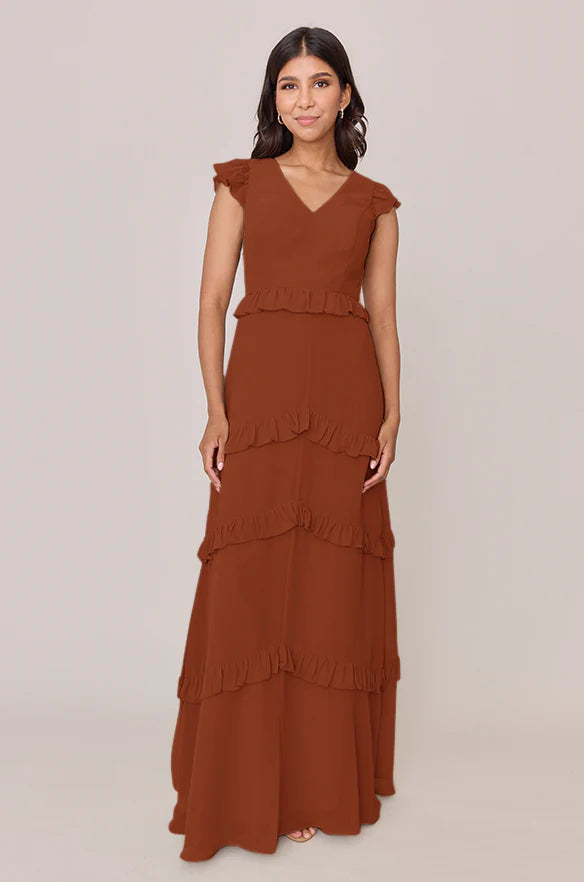 Our Ellapink Chiffon dress is a flawless style that is the missing piece to your bridal lineup! Amelia has divine ruffled tiers, short flutter sleeves, and a moderate v-neck to provide a playful, but romantic style. Pair this style with our Harley Chiffon dress to add some textures to your dreamy wedding look!
