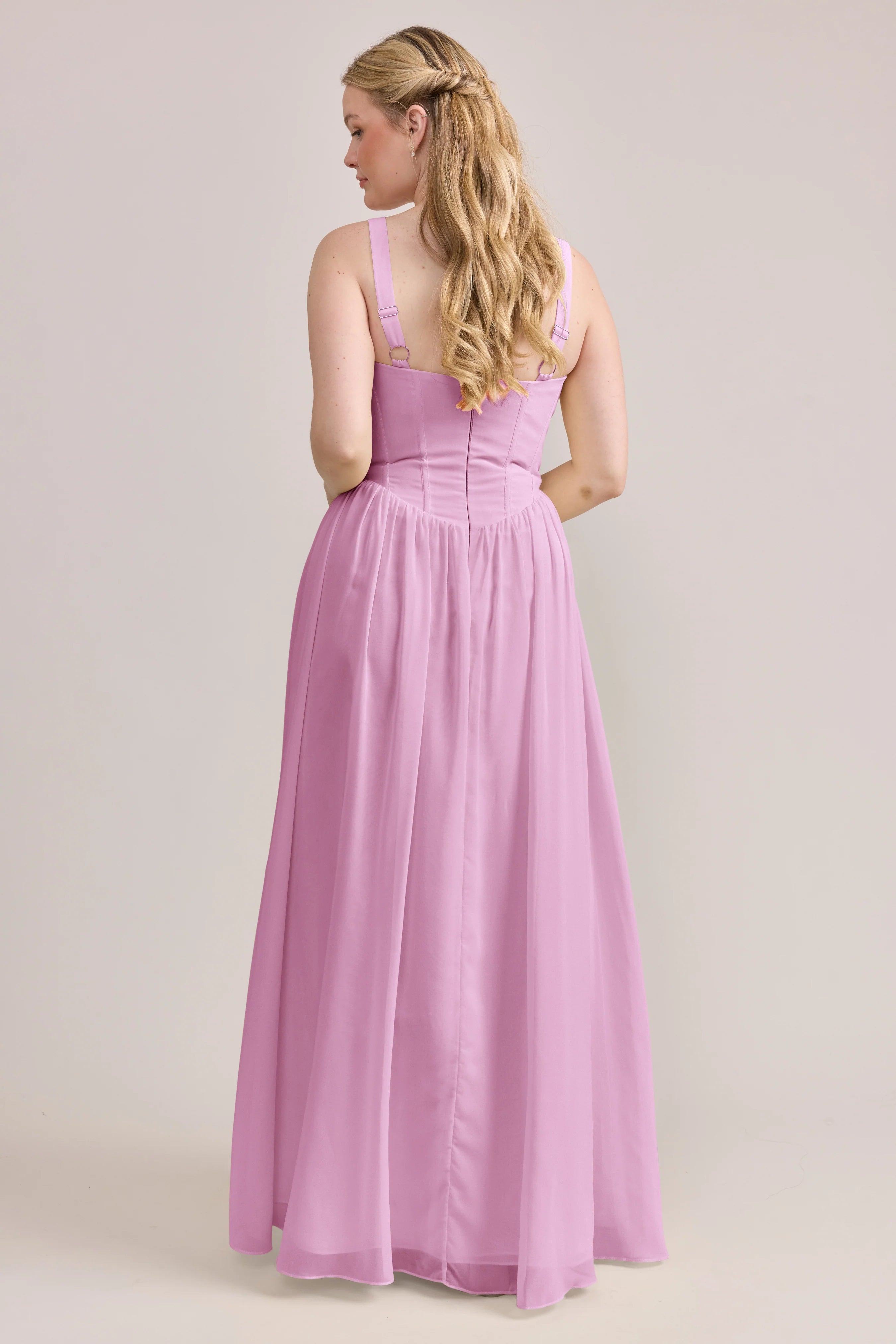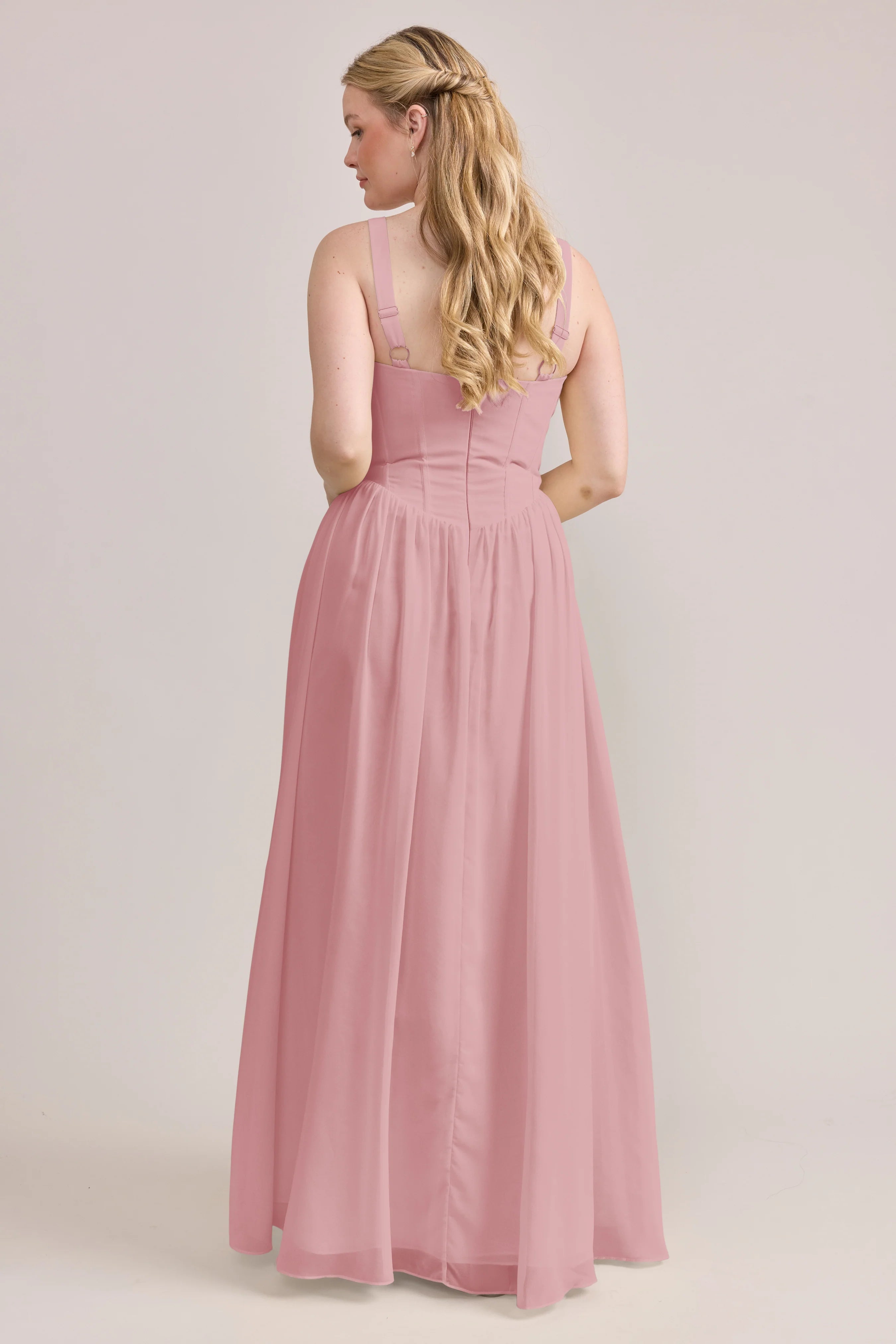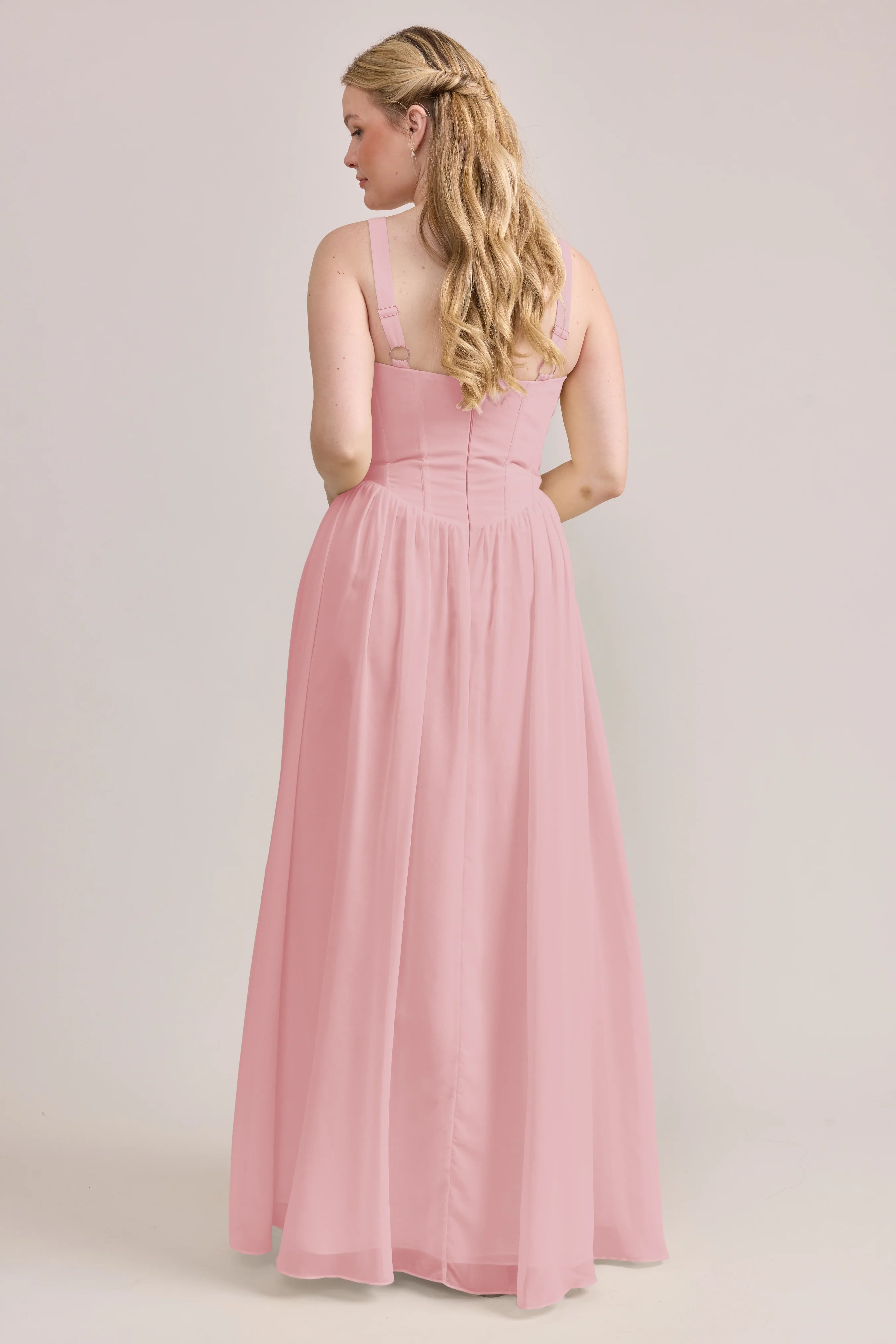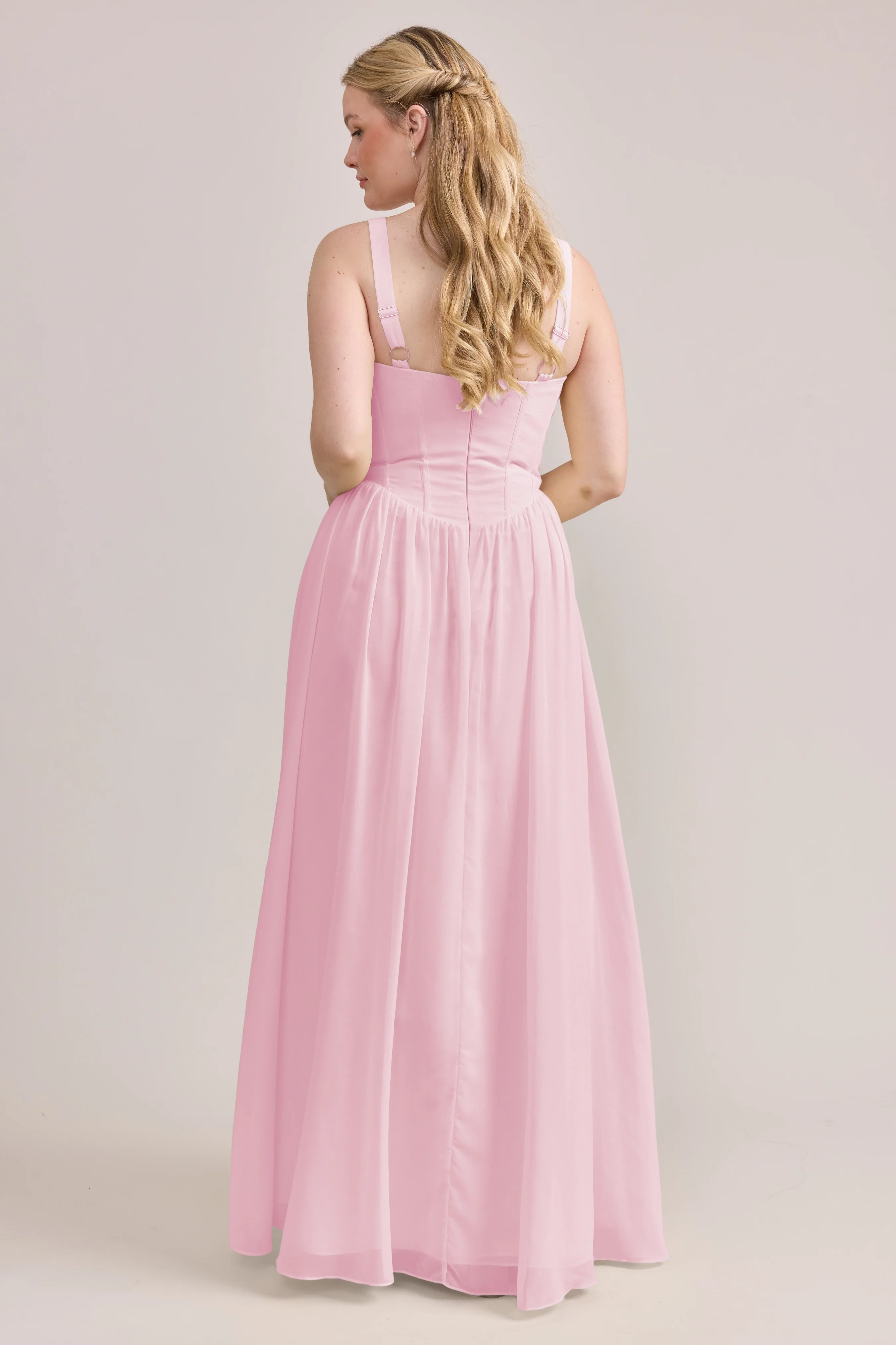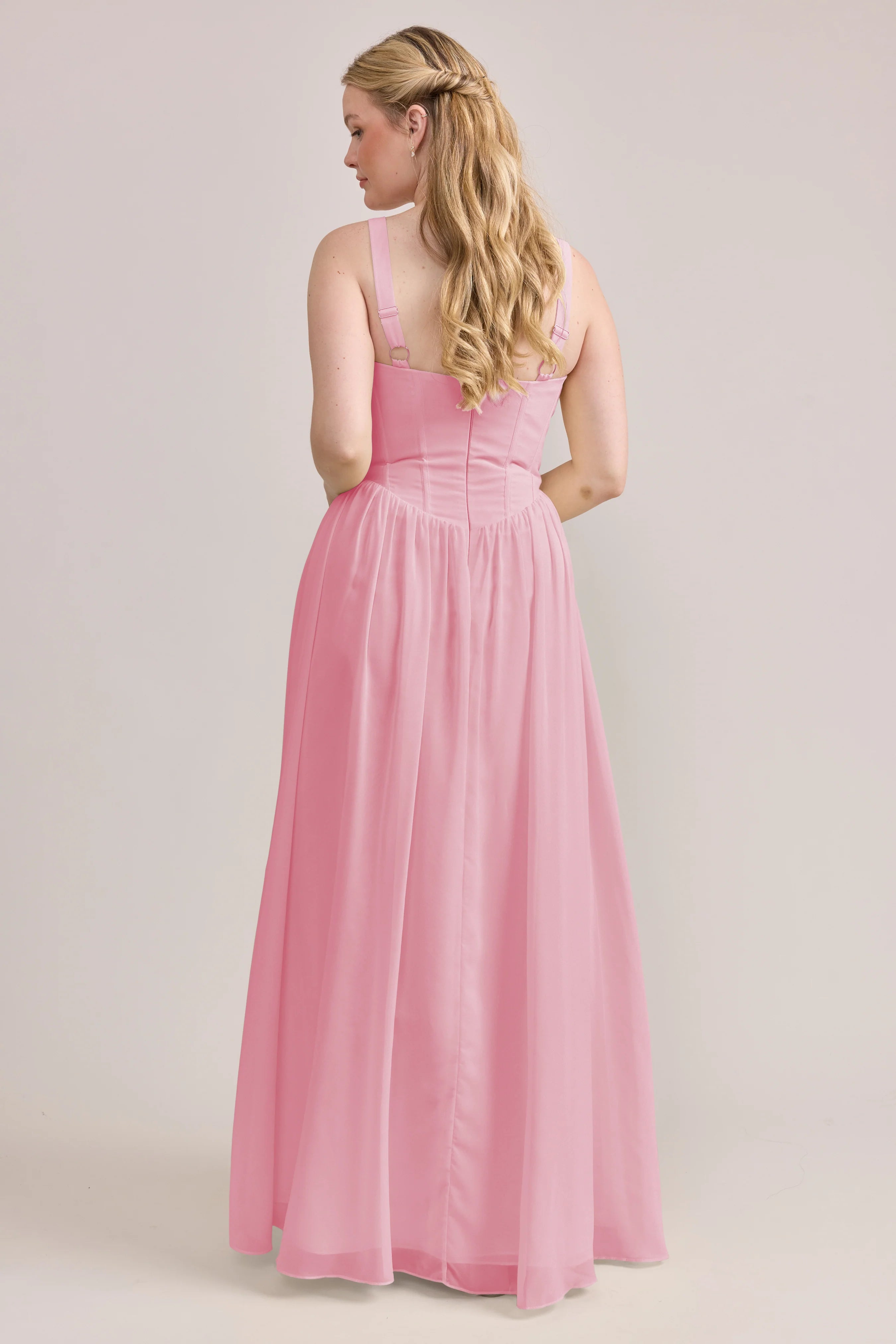 Straight out of a fairytale, the Ellapink Chiffon Dress is a perfect choice for any modern princess. Guaranteed to complement every bridesmaid, she features a flattering basque waistline, dainty corset details throughout, and super supportive adjustable shoulder straps. The best part? She has pockets too.