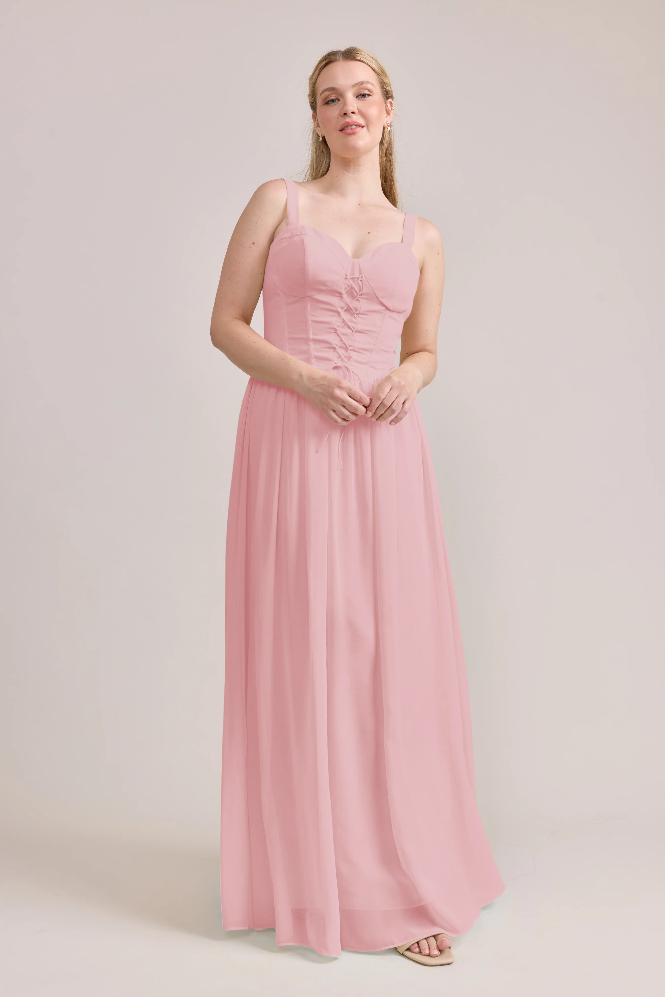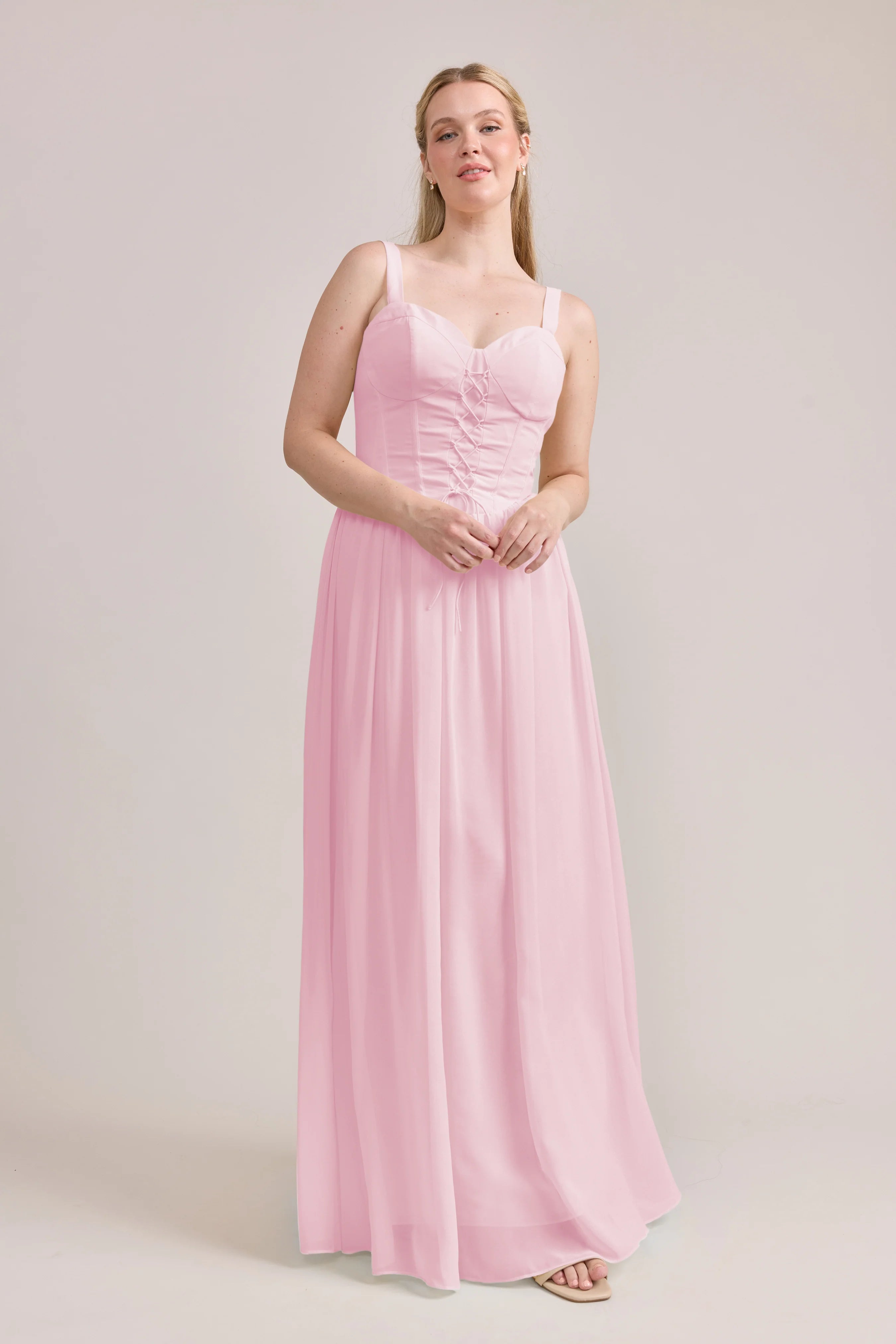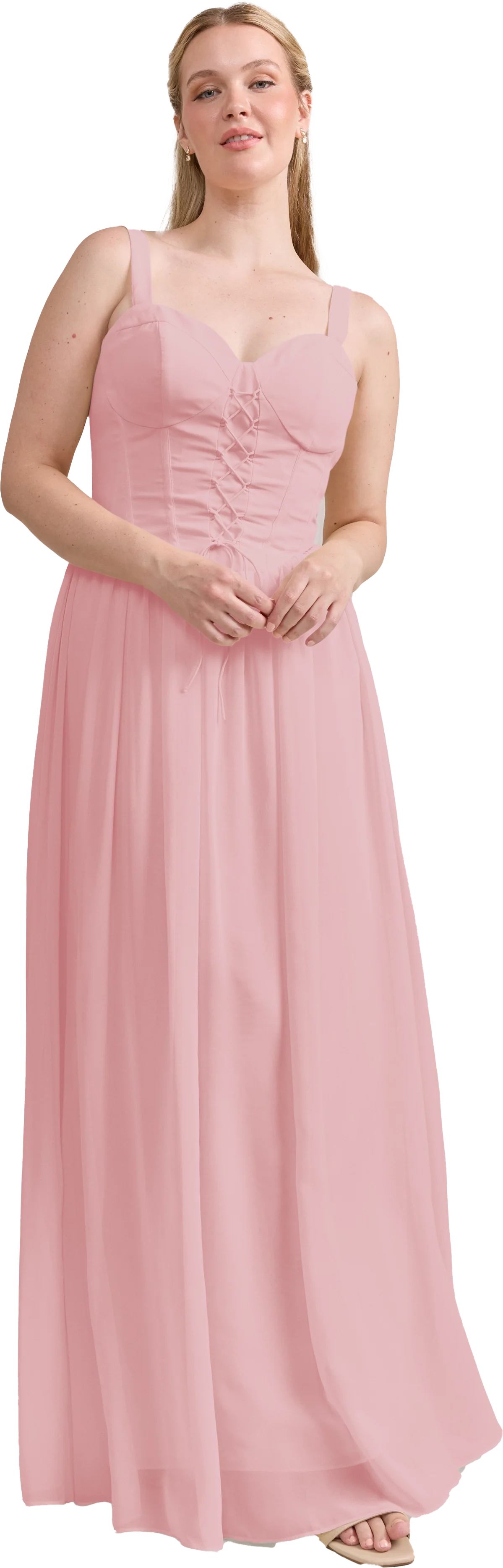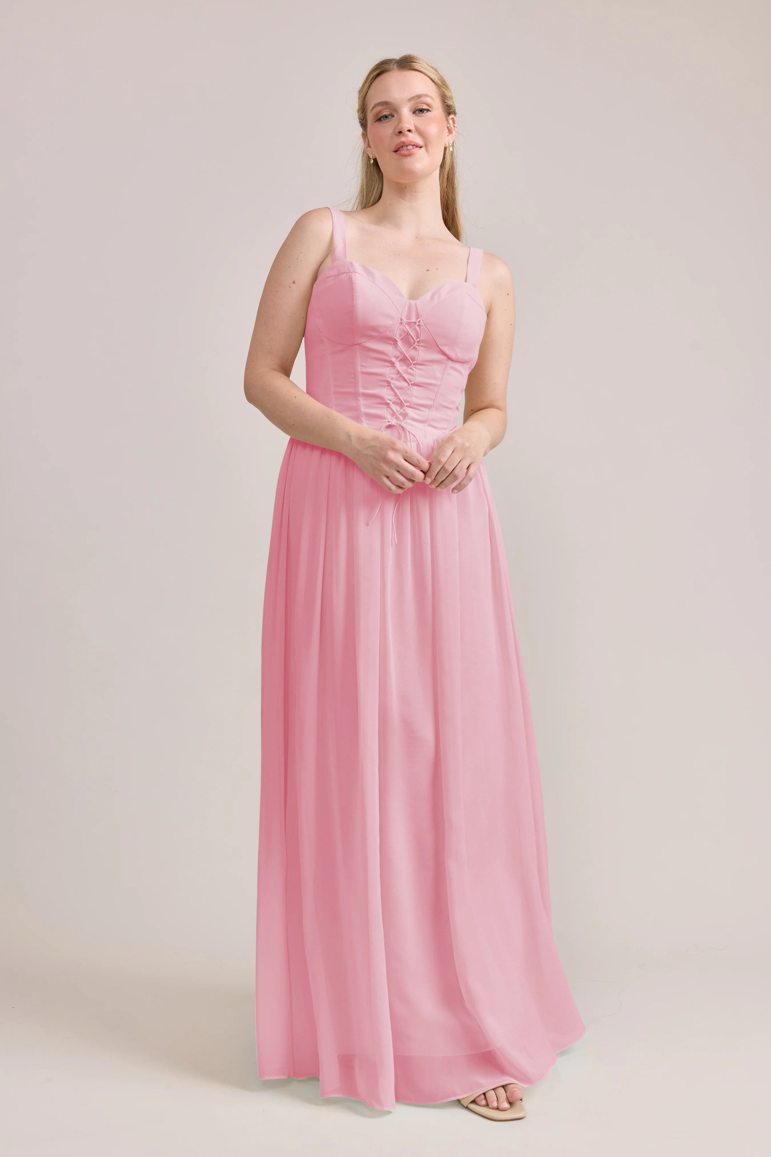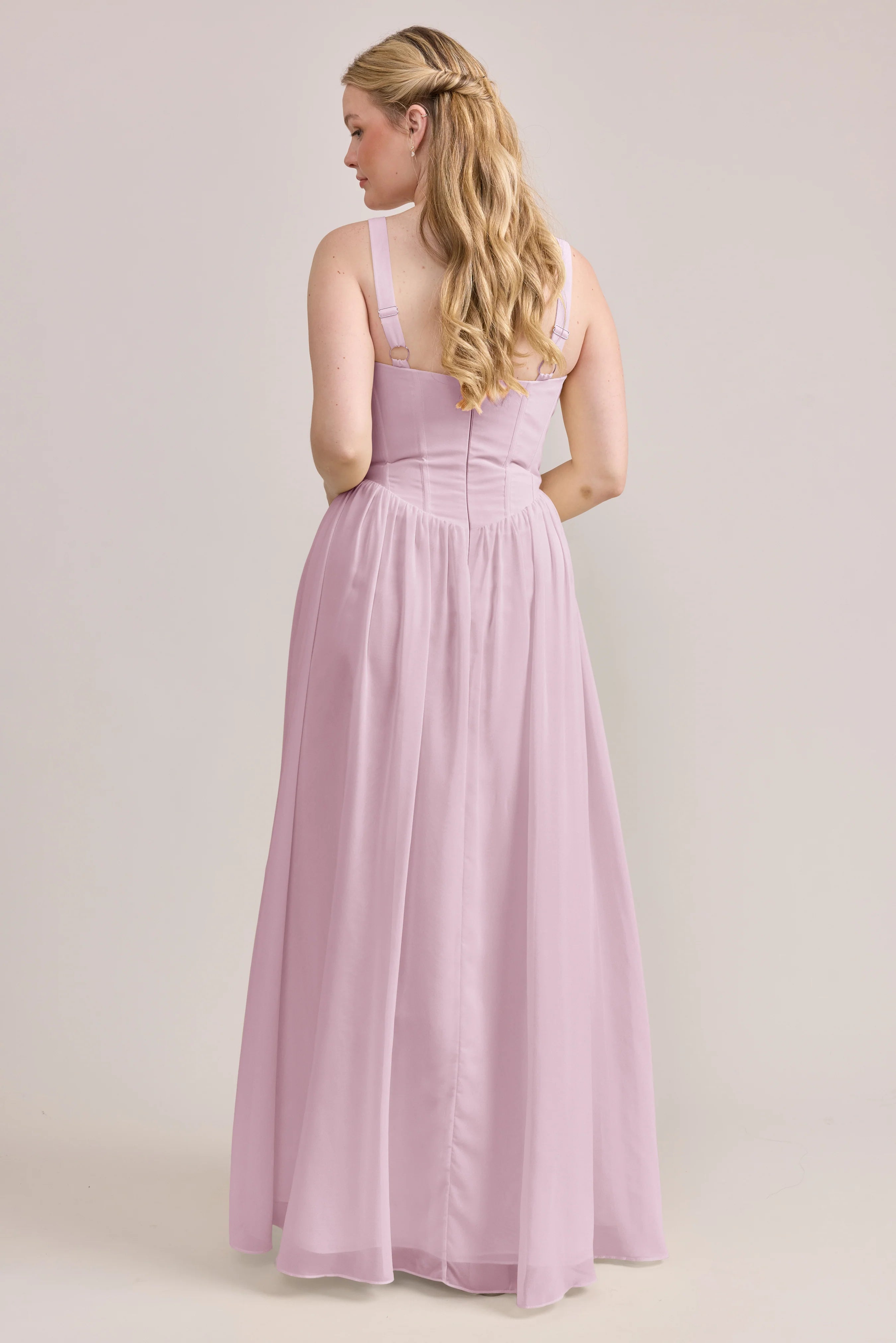 Straight out of a fairytale, the Ellapink Chiffon Dress is a perfect choice for any modern princess. Guaranteed to complement every bridesmaid, she features a flattering basque waistline, dainty corset details throughout, and super supportive adjustable shoulder straps. The best part? She has pockets too.