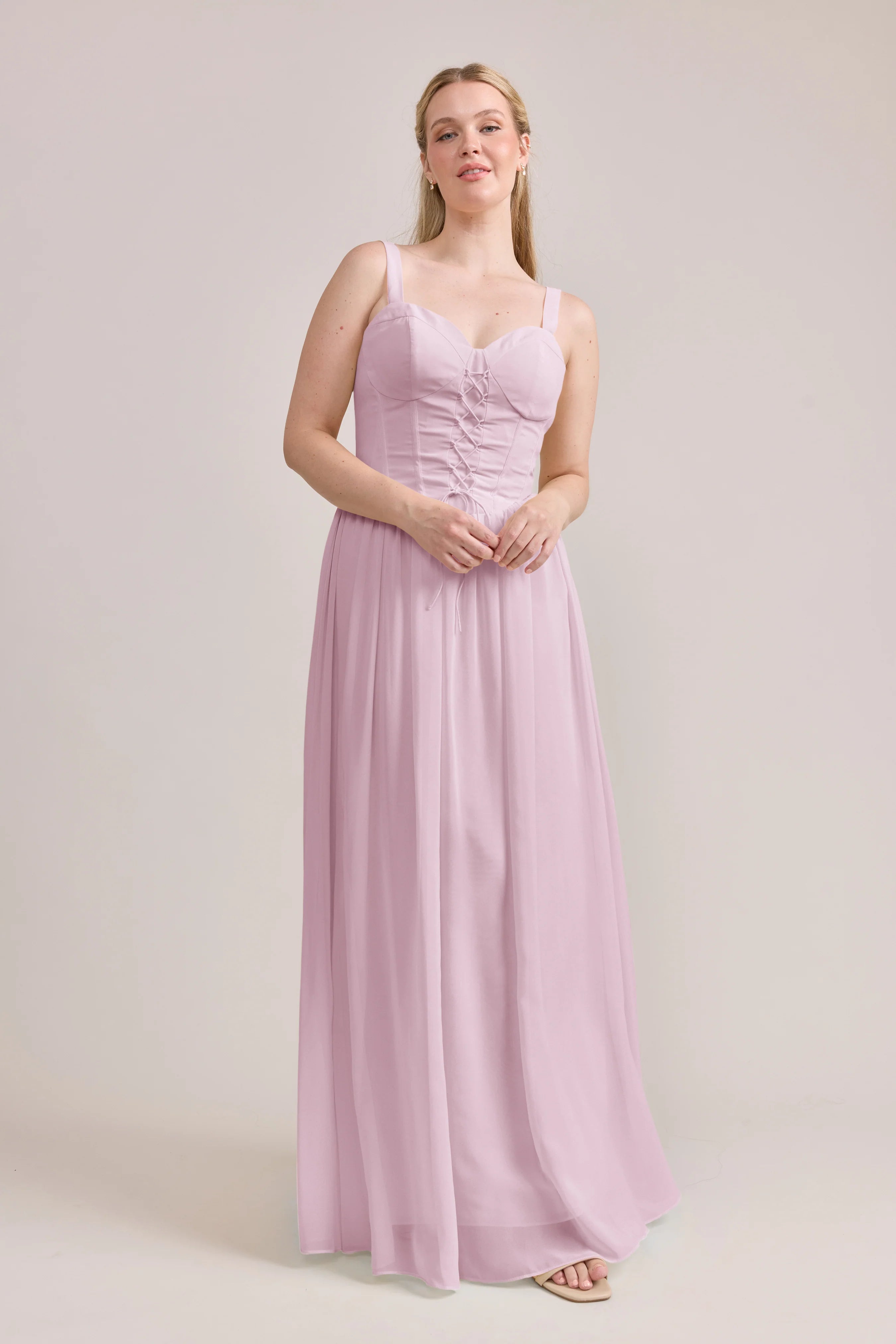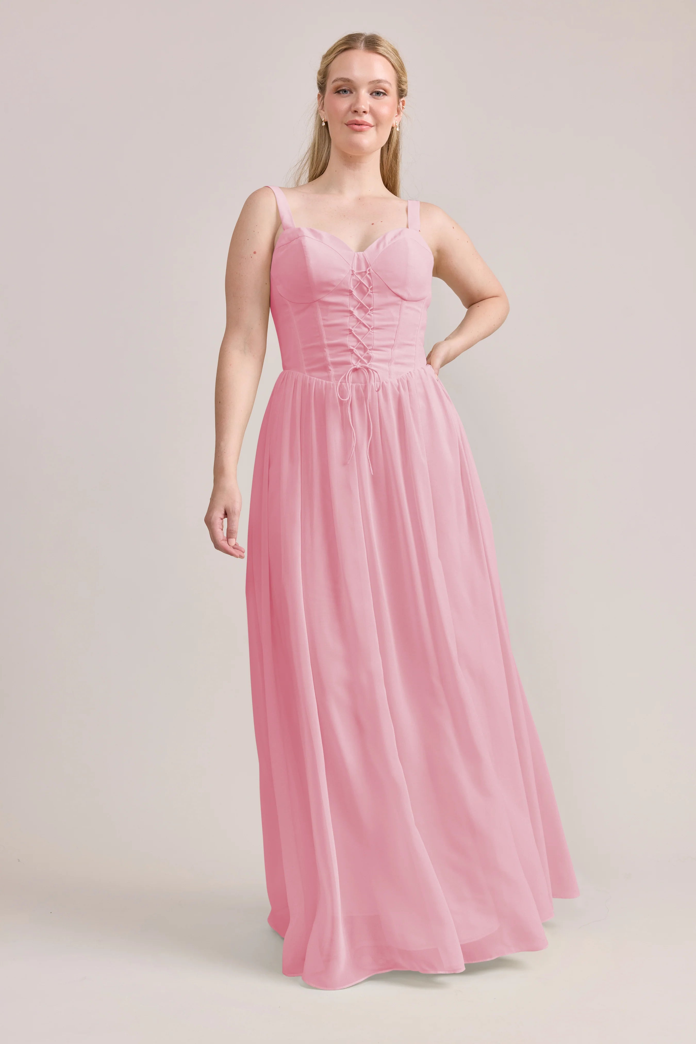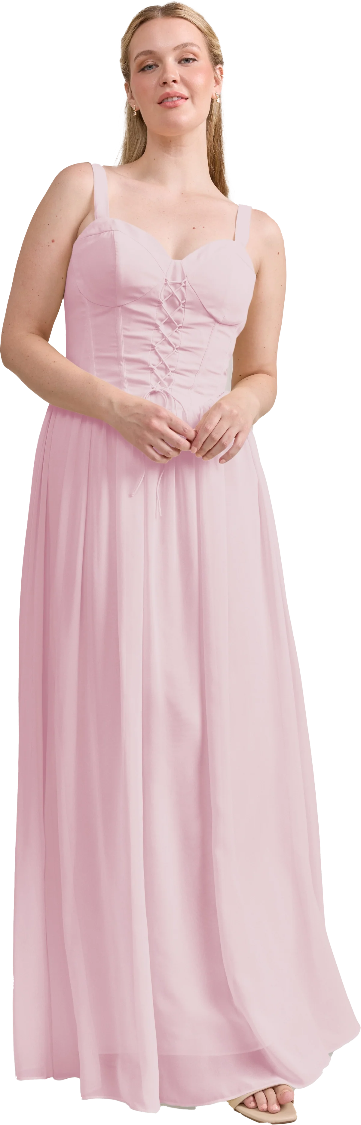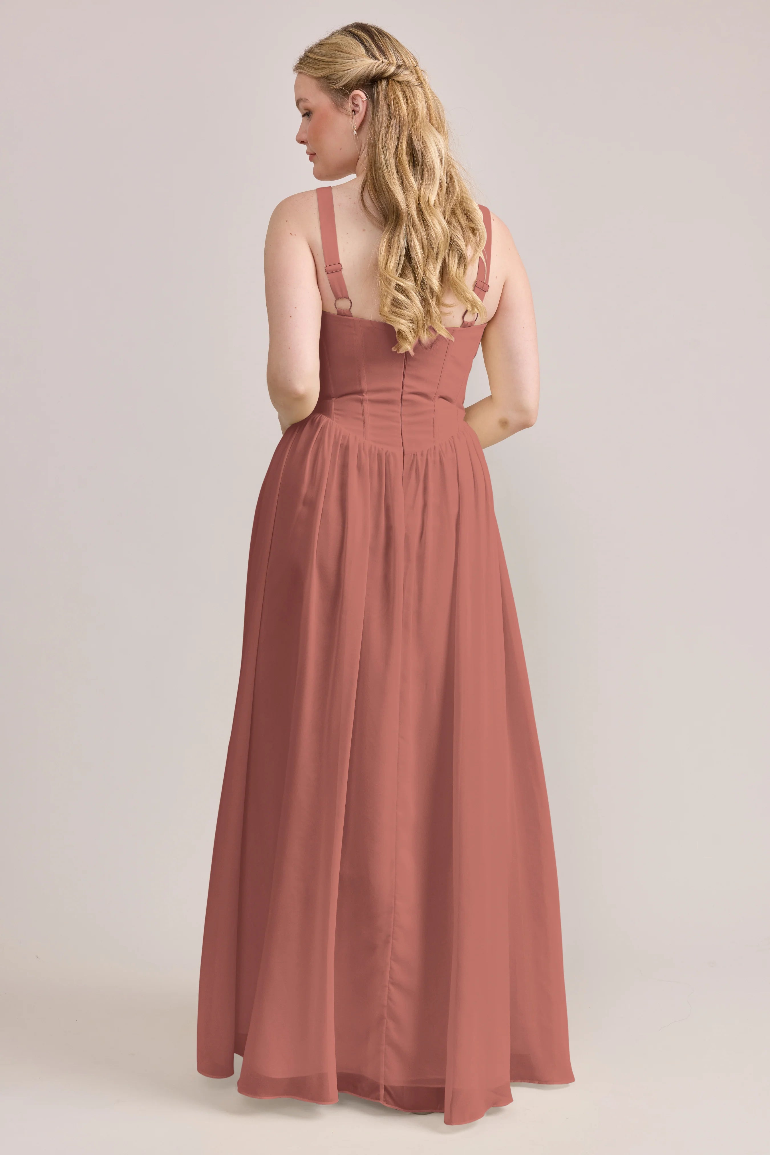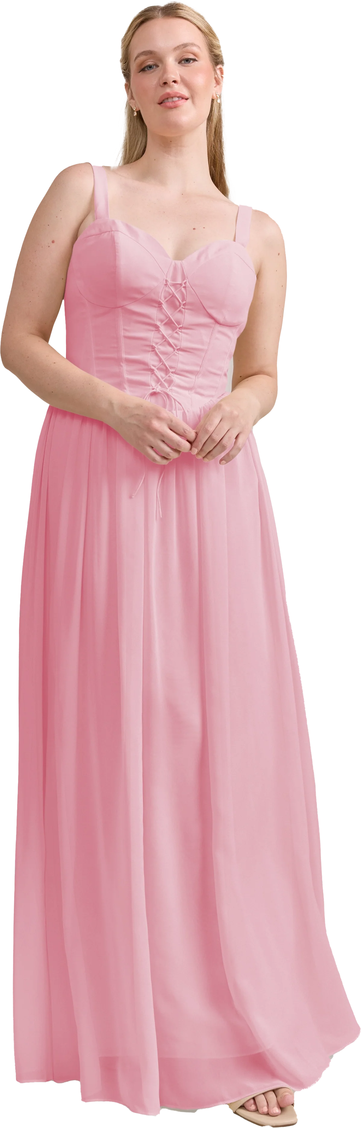 Straight out of a fairytale, the Ellapink Chiffon Dress is a perfect choice for any modern princess. Guaranteed to complement every bridesmaid, she features a flattering basque waistline, dainty corset details throughout, and super supportive adjustable shoulder straps. The best part? She has pockets too.