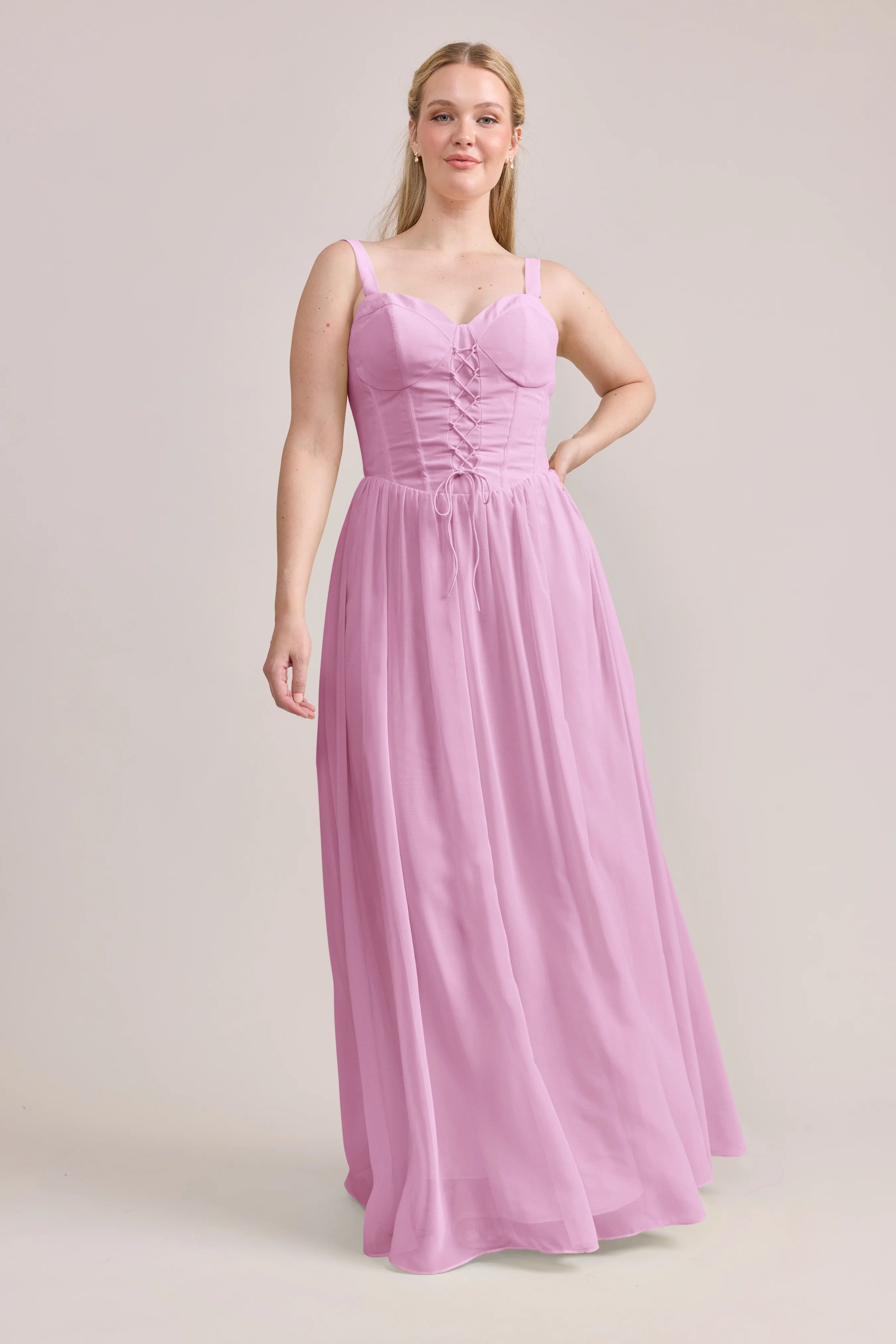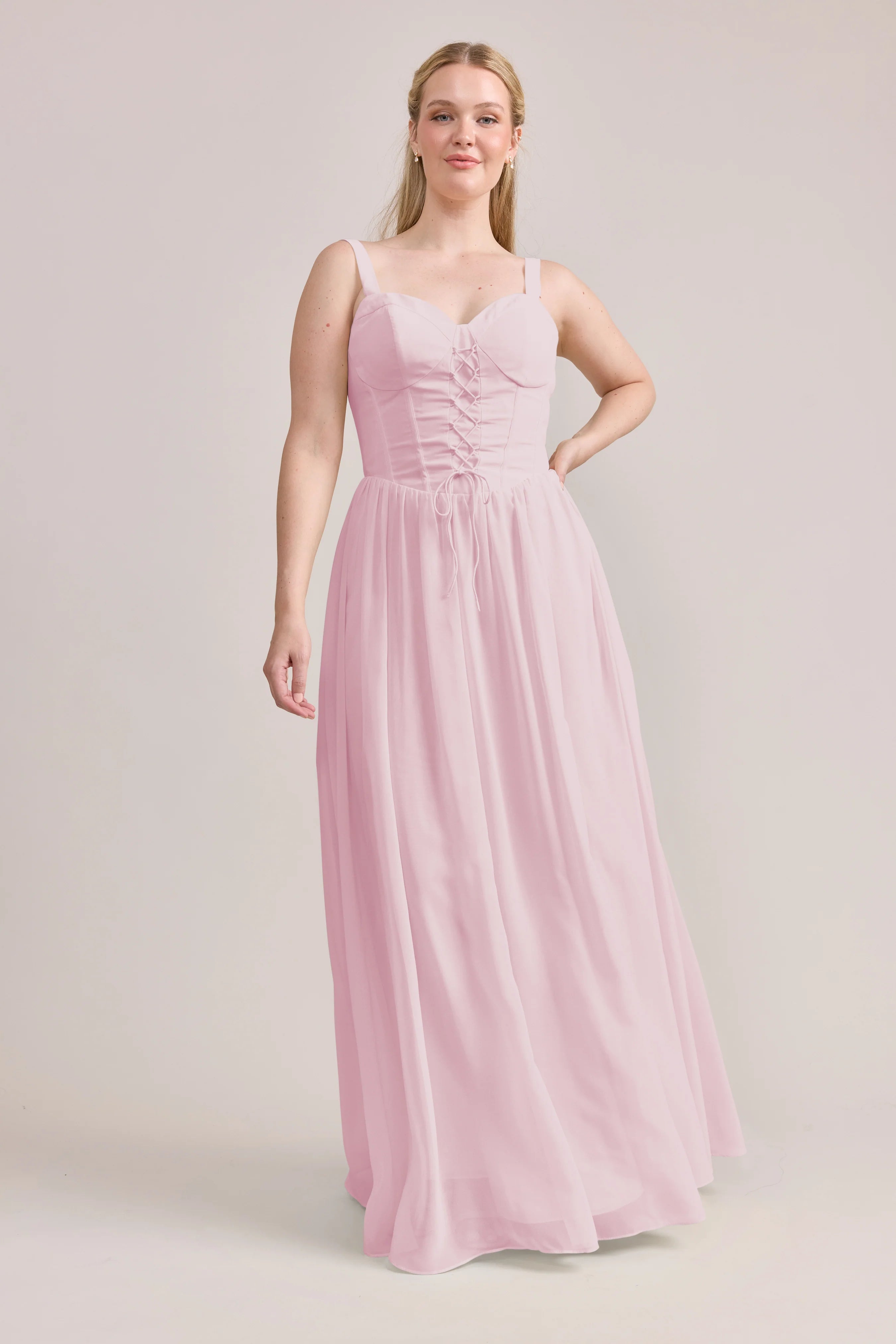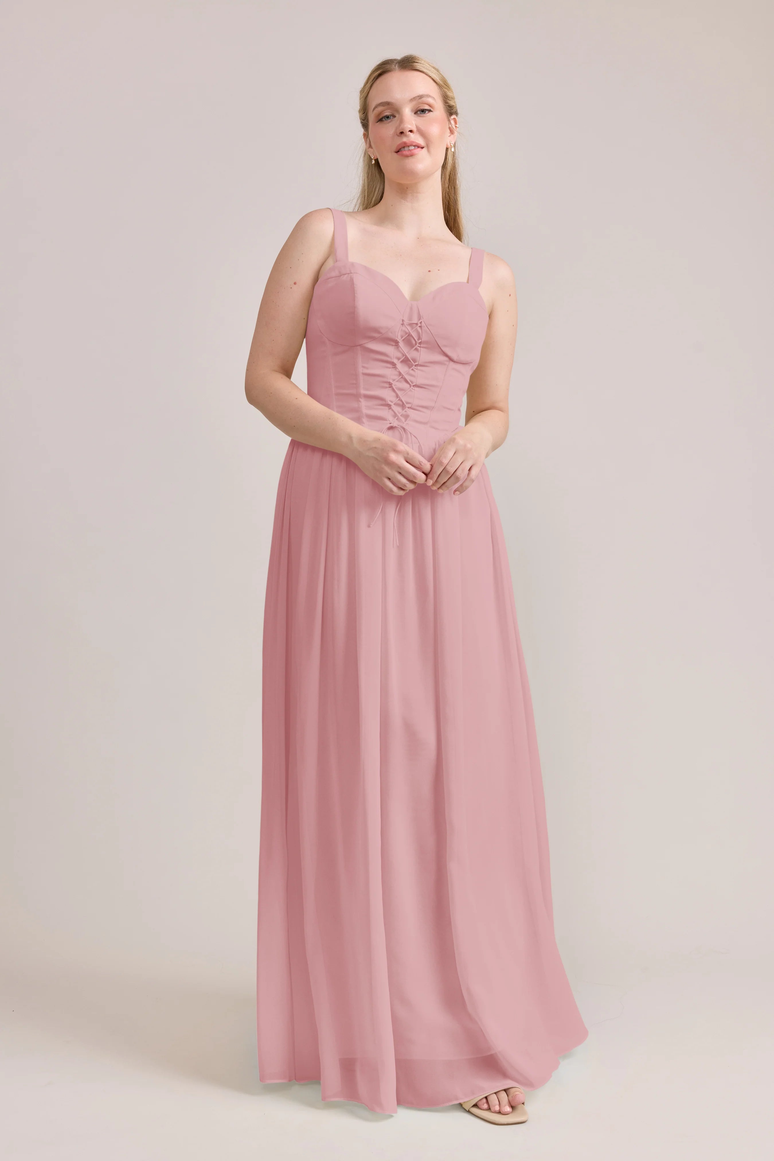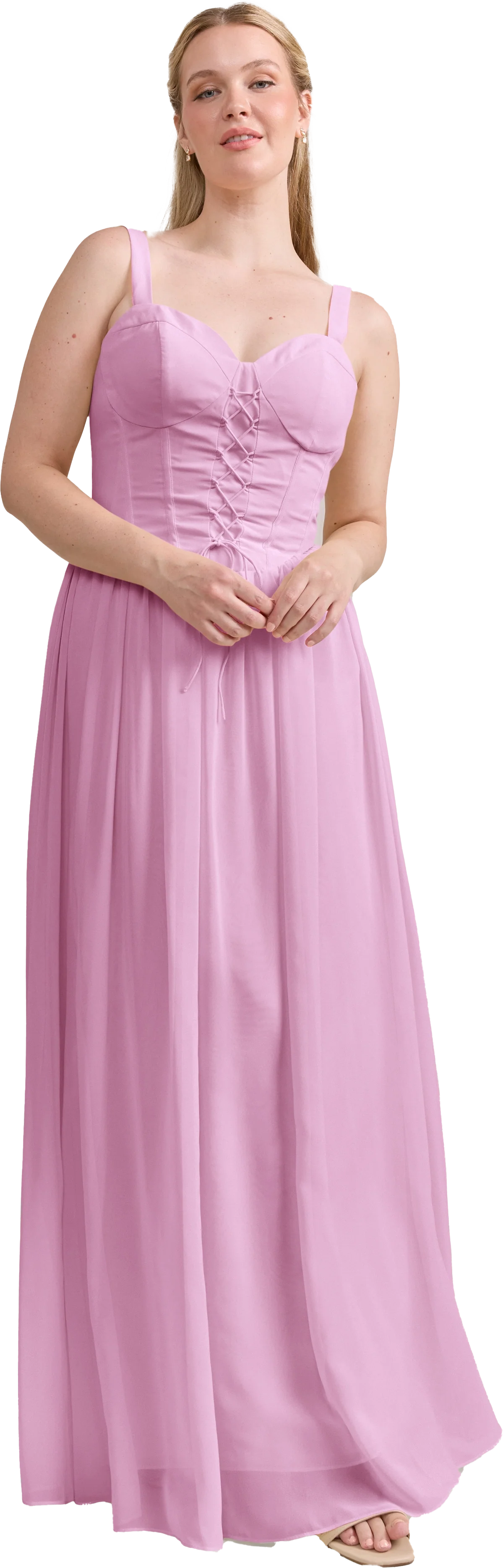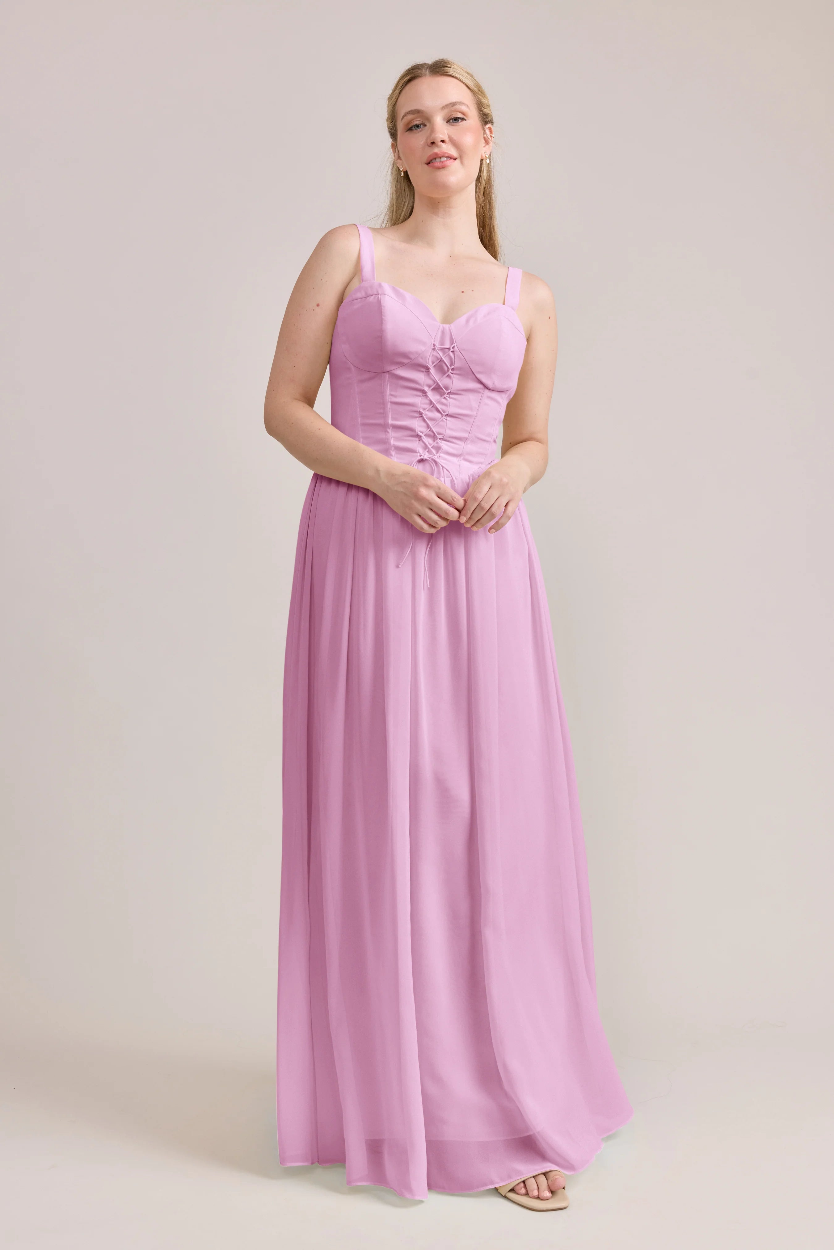 Straight out of a fairytale, the Ellapink Chiffon Dress is a perfect choice for any modern princess. Guaranteed to complement every bridesmaid, she features a flattering basque waistline, dainty corset details throughout, and super supportive adjustable shoulder straps. The best part? She has pockets too.