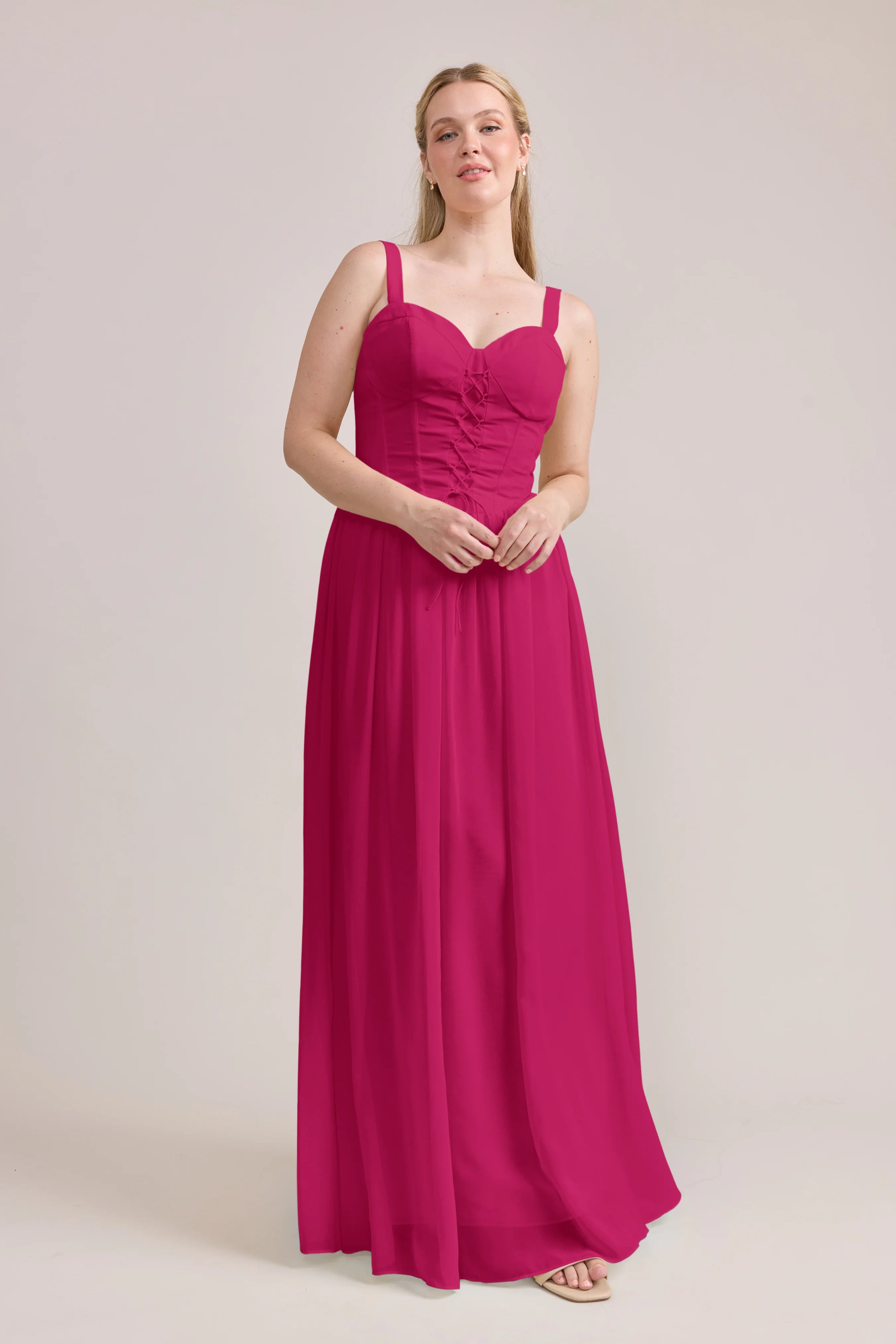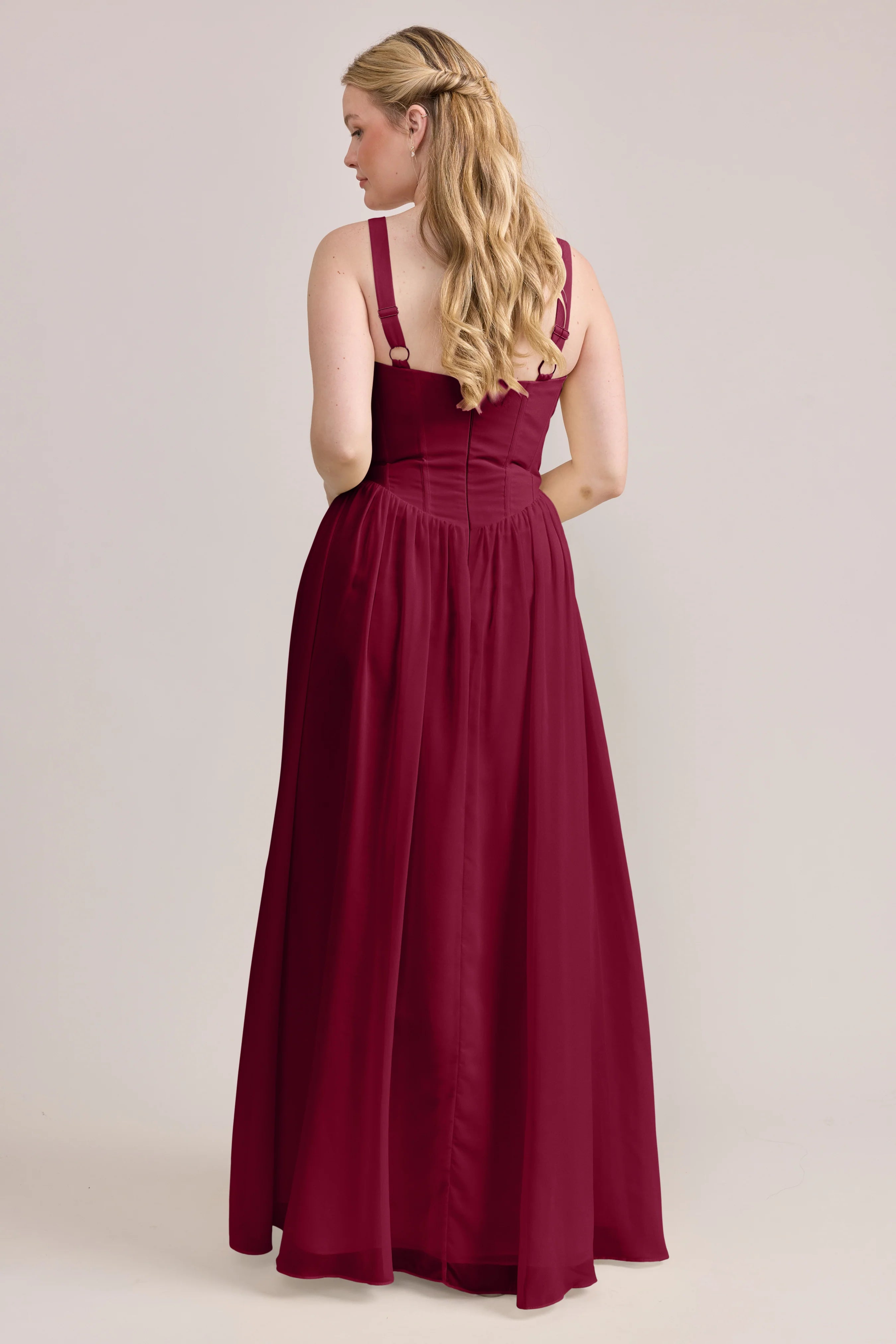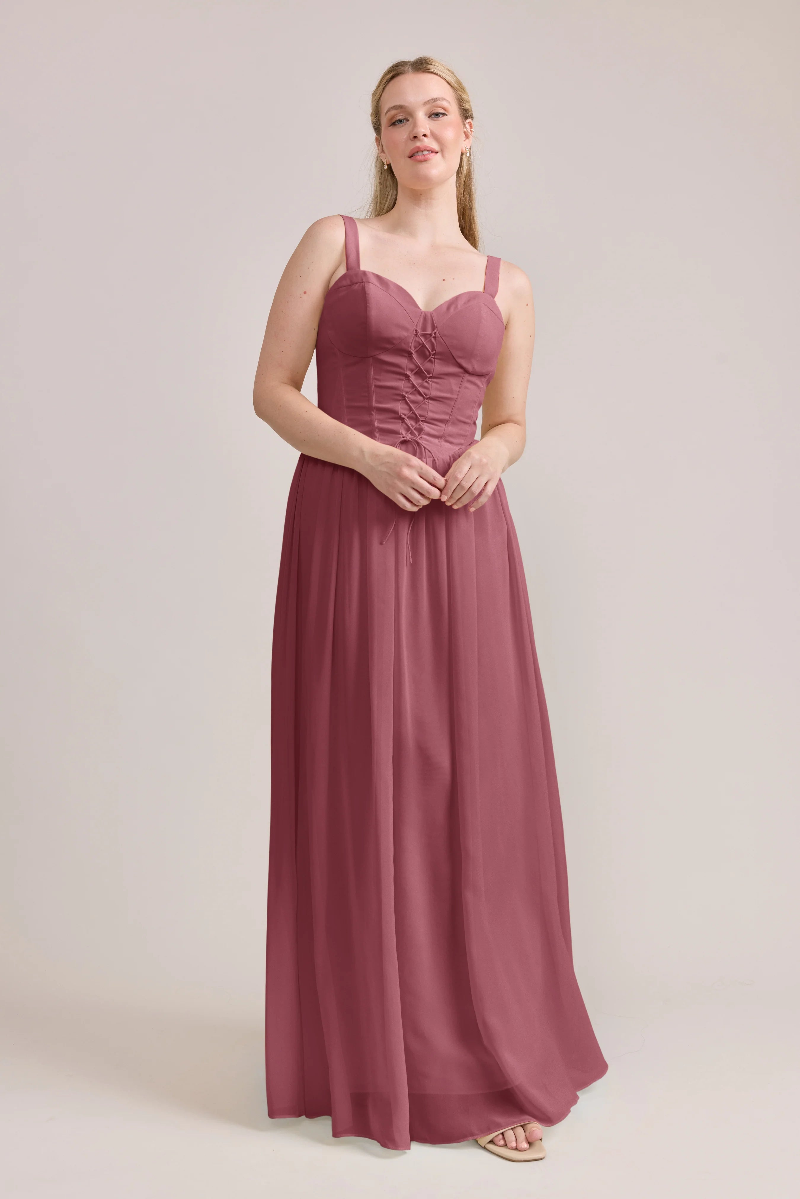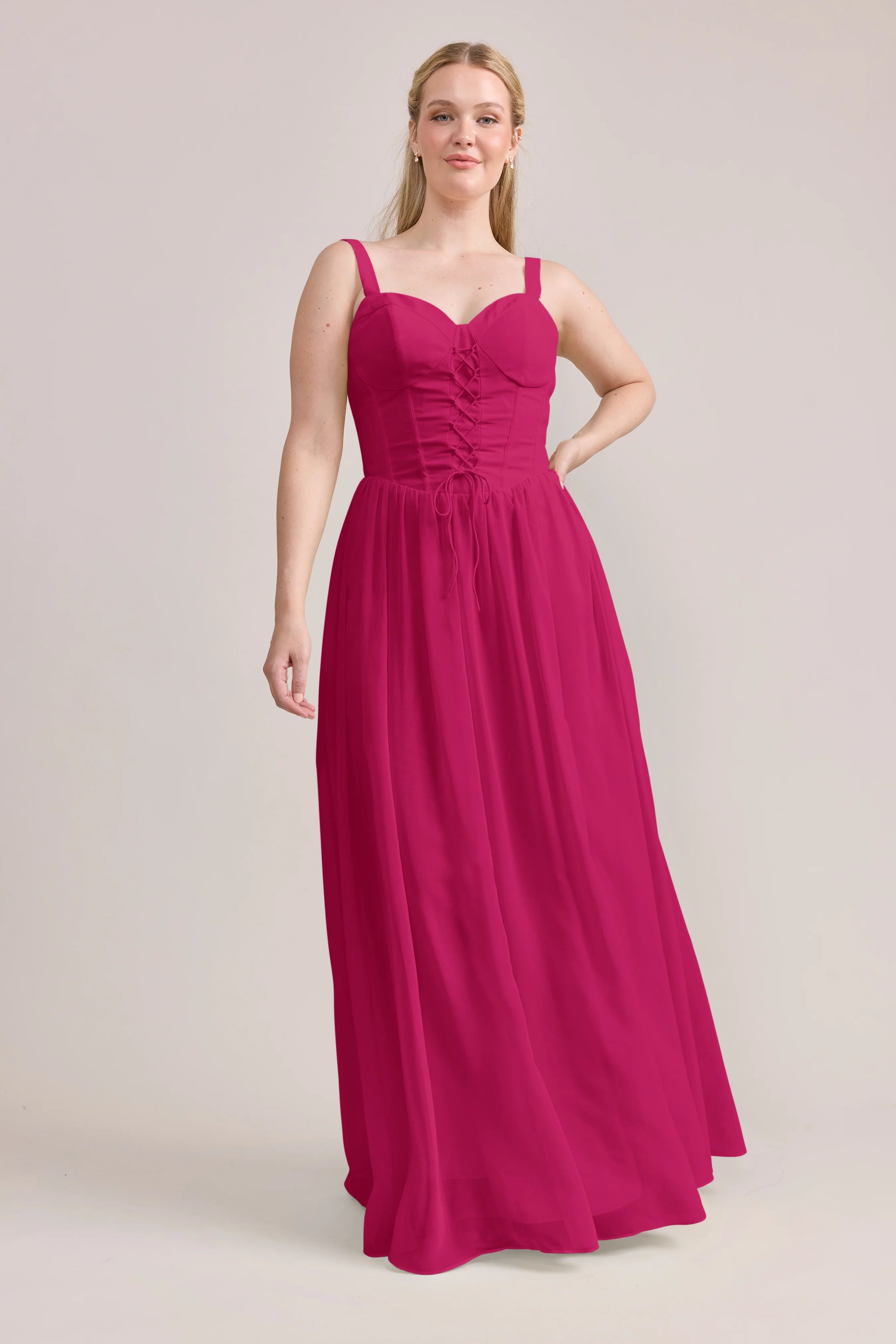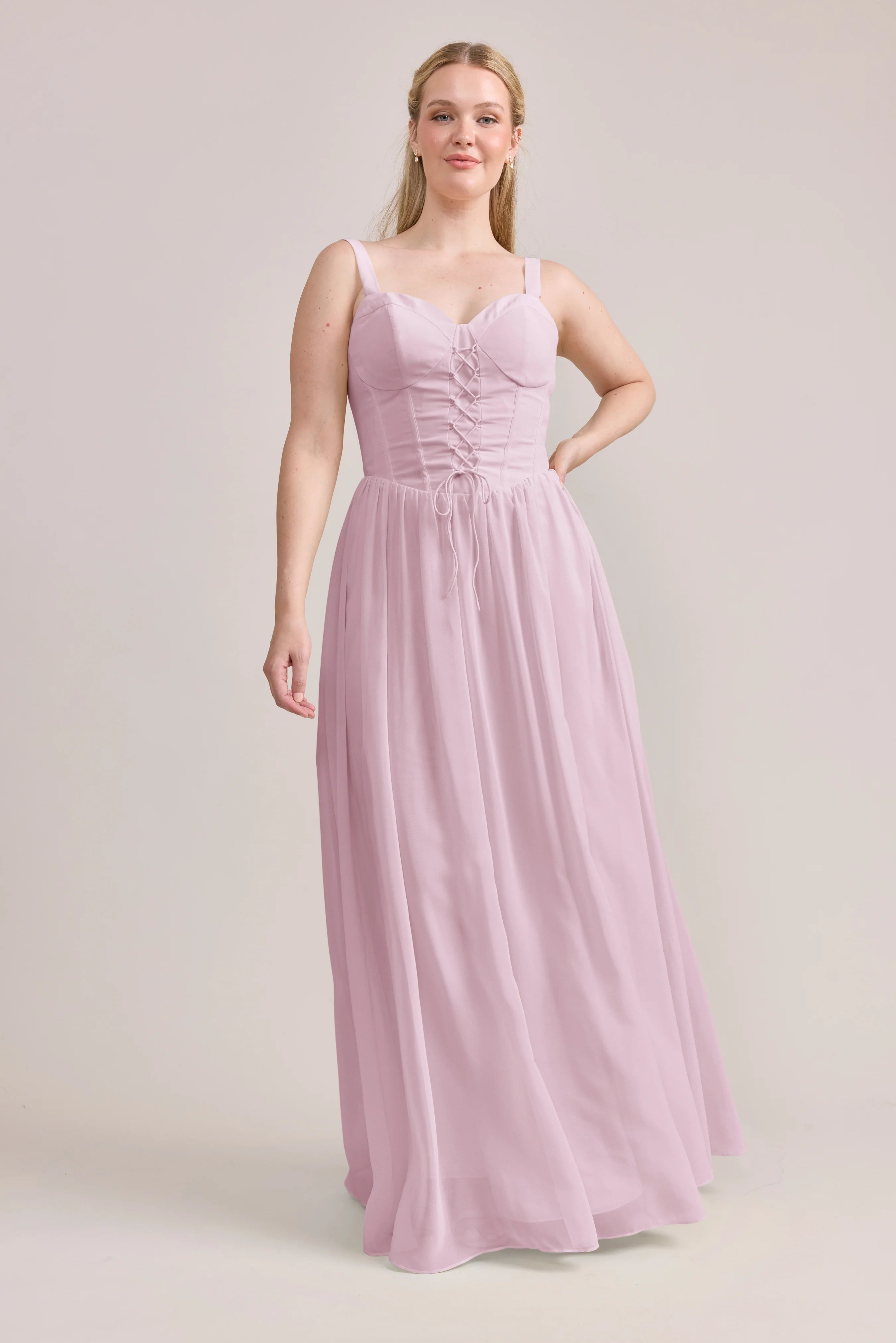 Straight out of a fairytale, the Ellapink Chiffon Dress is a perfect choice for any modern princess. Guaranteed to complement every bridesmaid, she features a flattering basque waistline, dainty corset details throughout, and super supportive adjustable shoulder straps. The best part? She has pockets too.