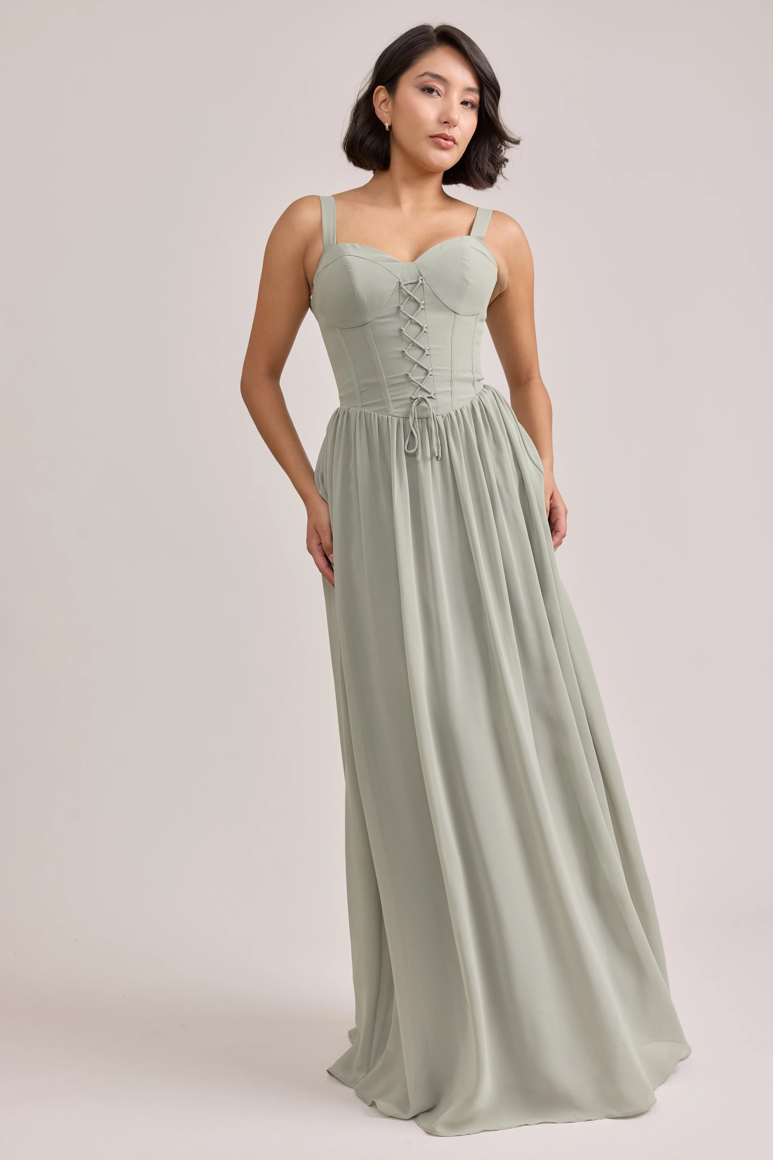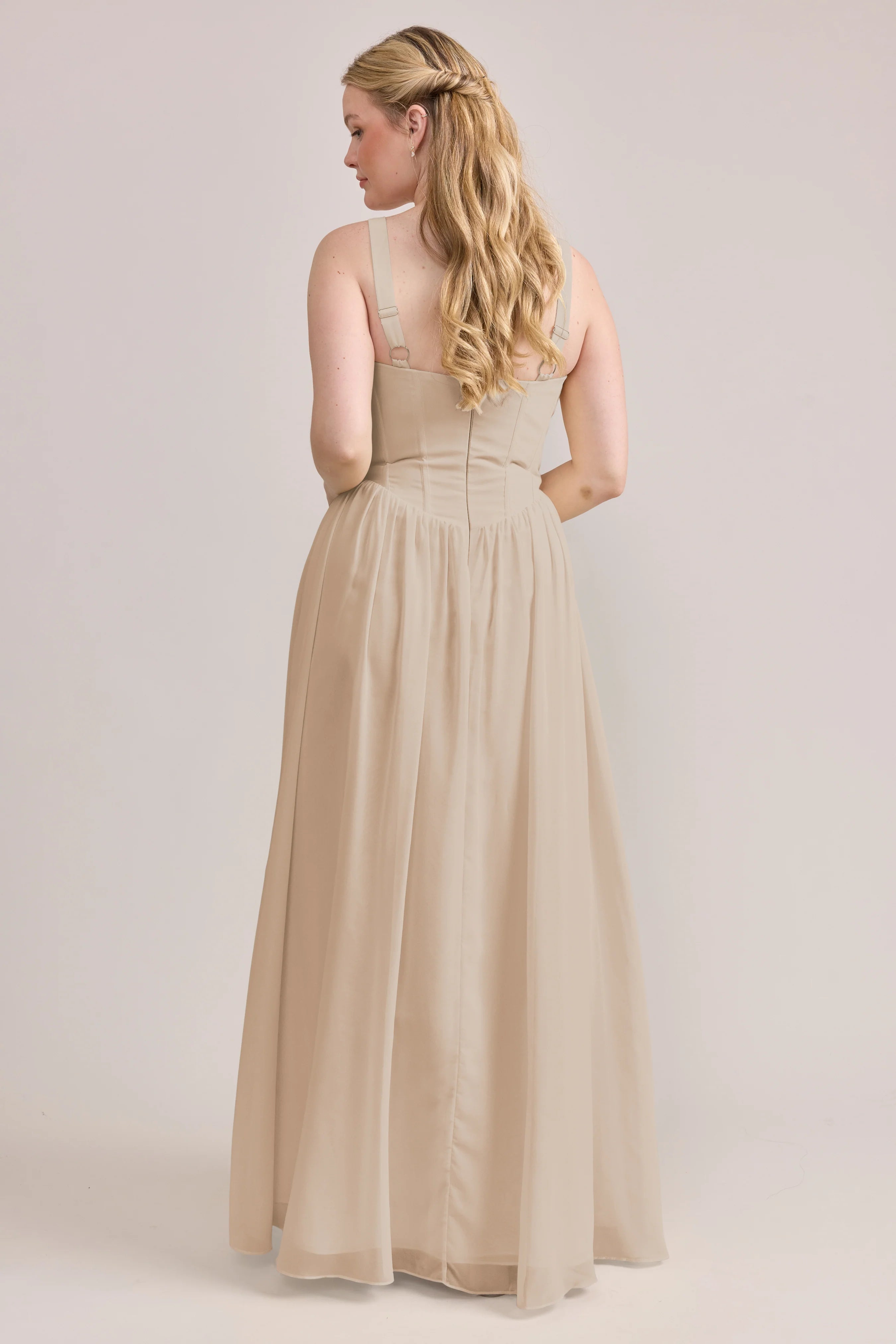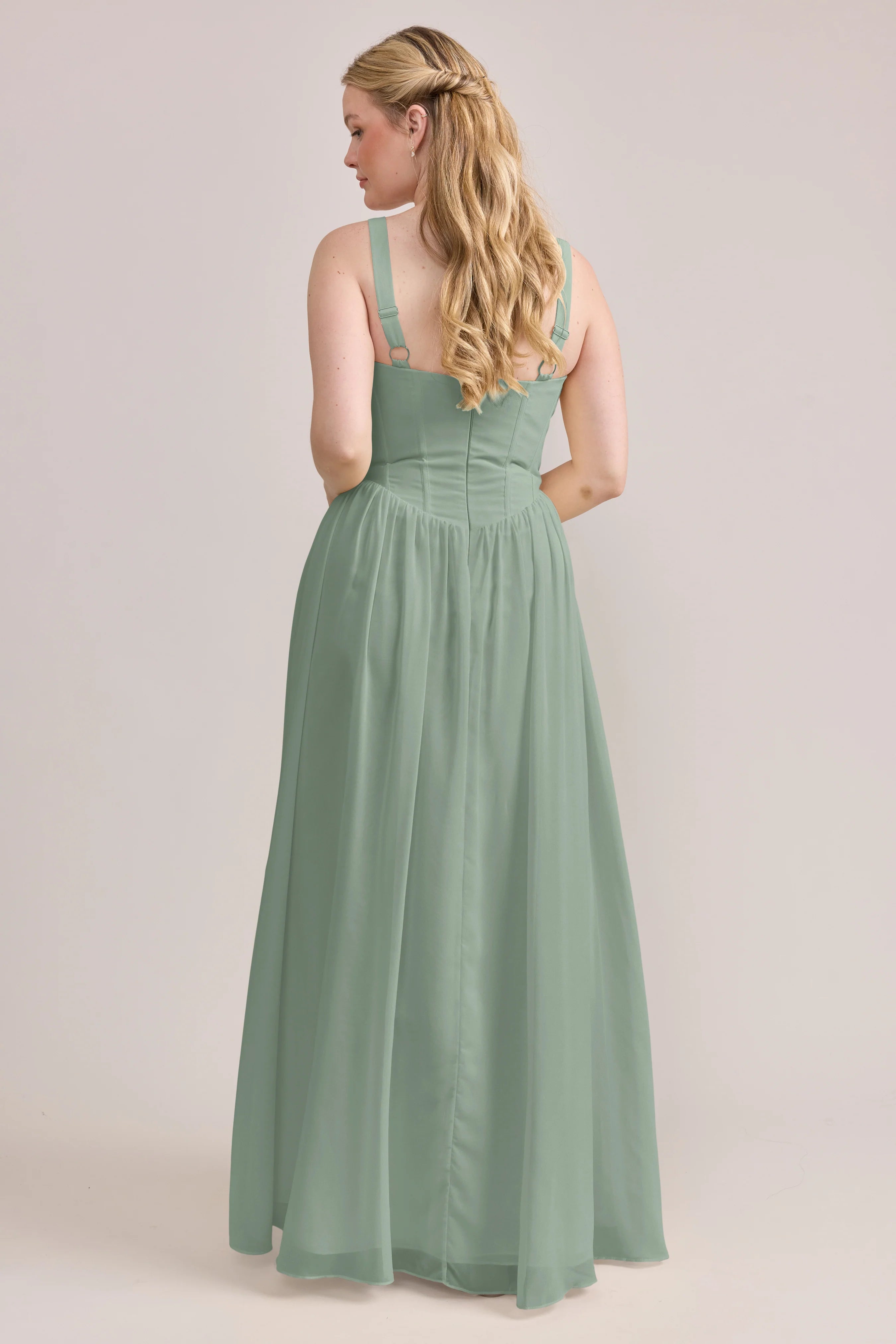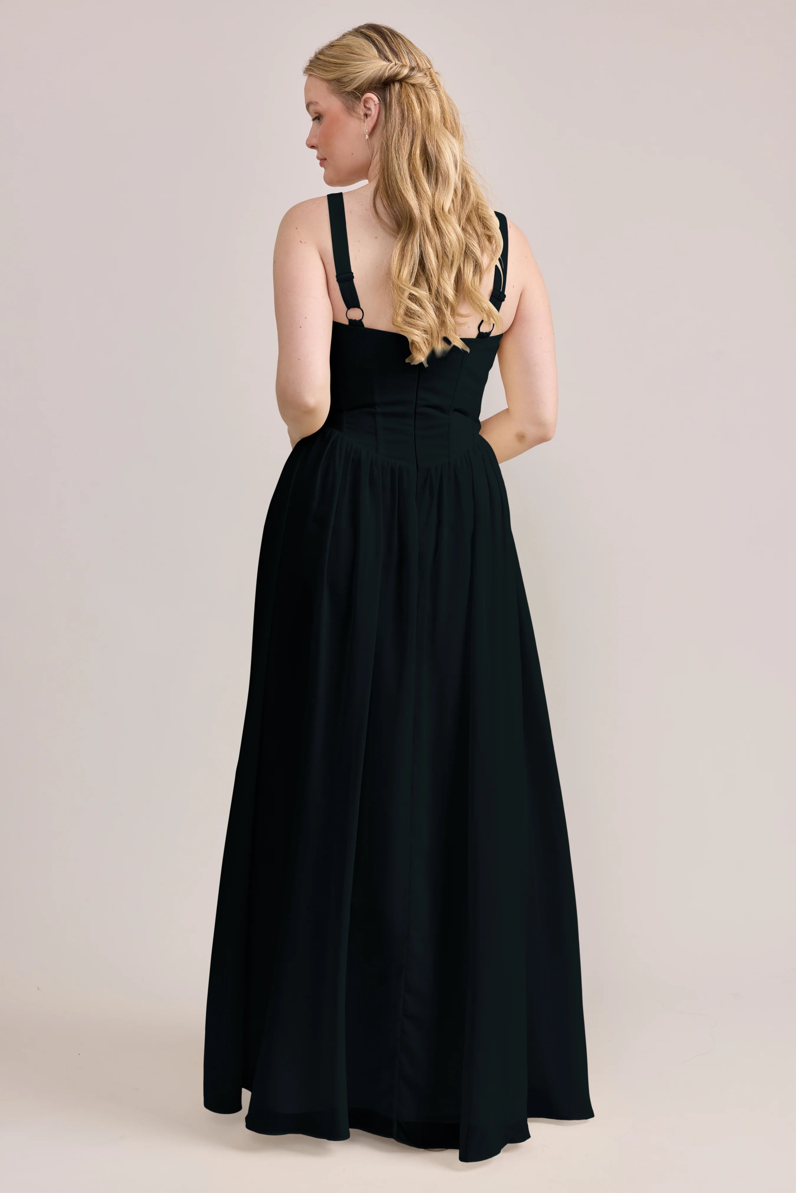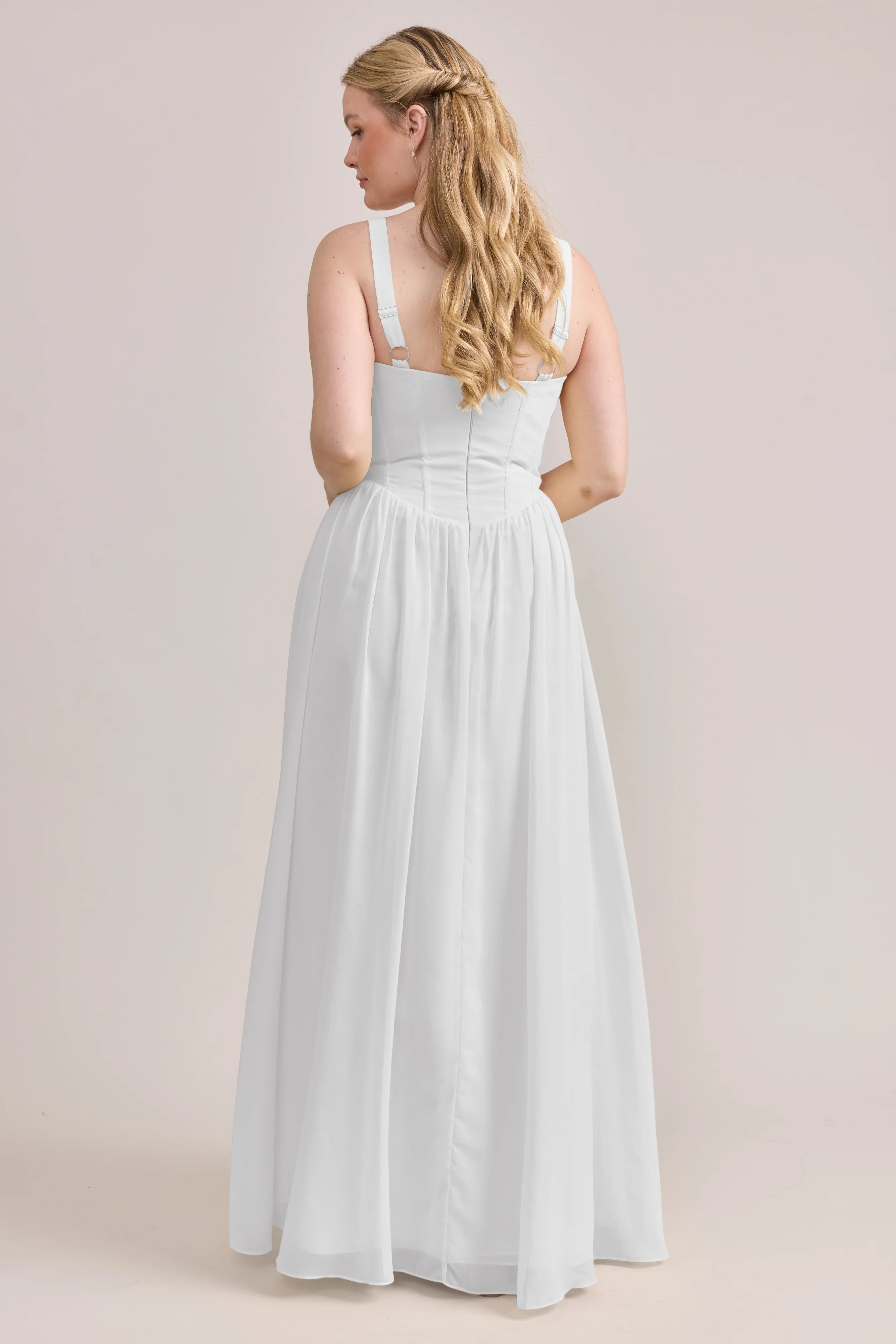 Straight out of a fairytale, the Ellapink Chiffon Dress is a perfect choice for any modern princess. Guaranteed to complement every bridesmaid, she features a flattering basque waistline, dainty corset details throughout, and super supportive adjustable shoulder straps. The best part? She has pockets too.