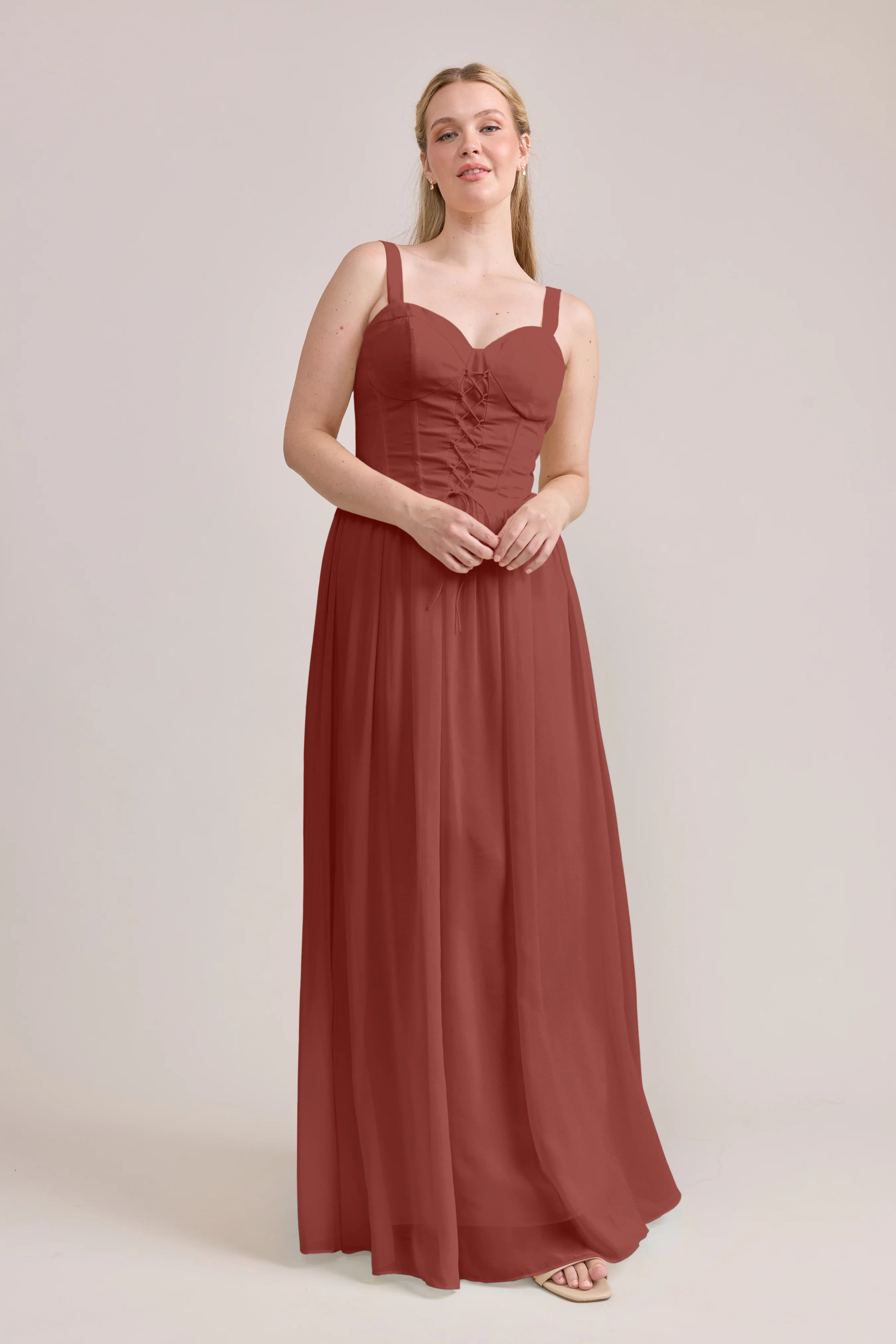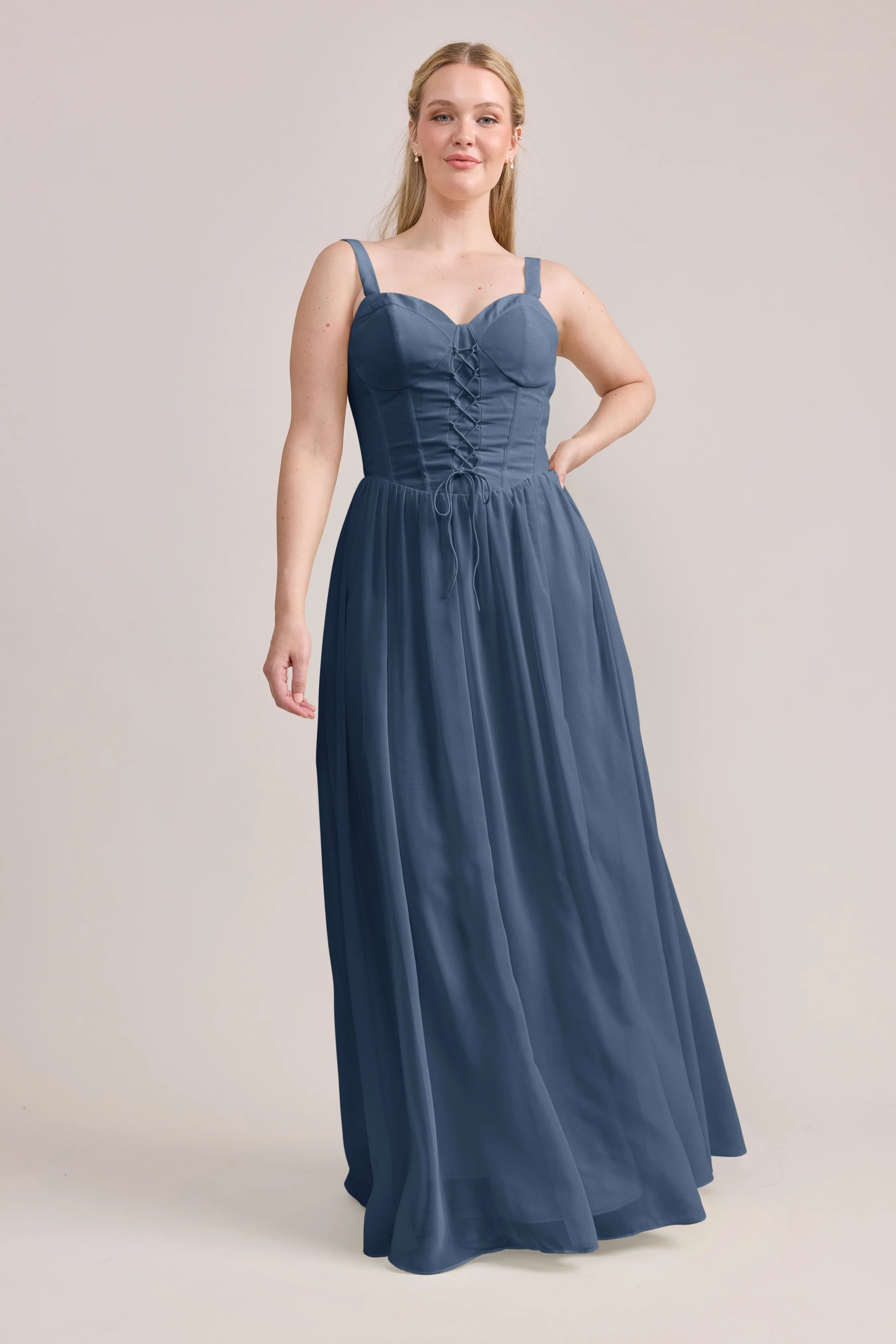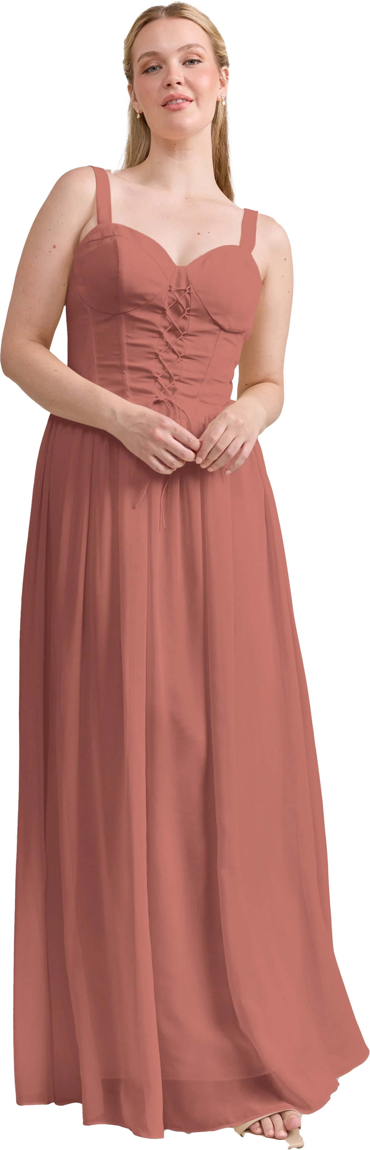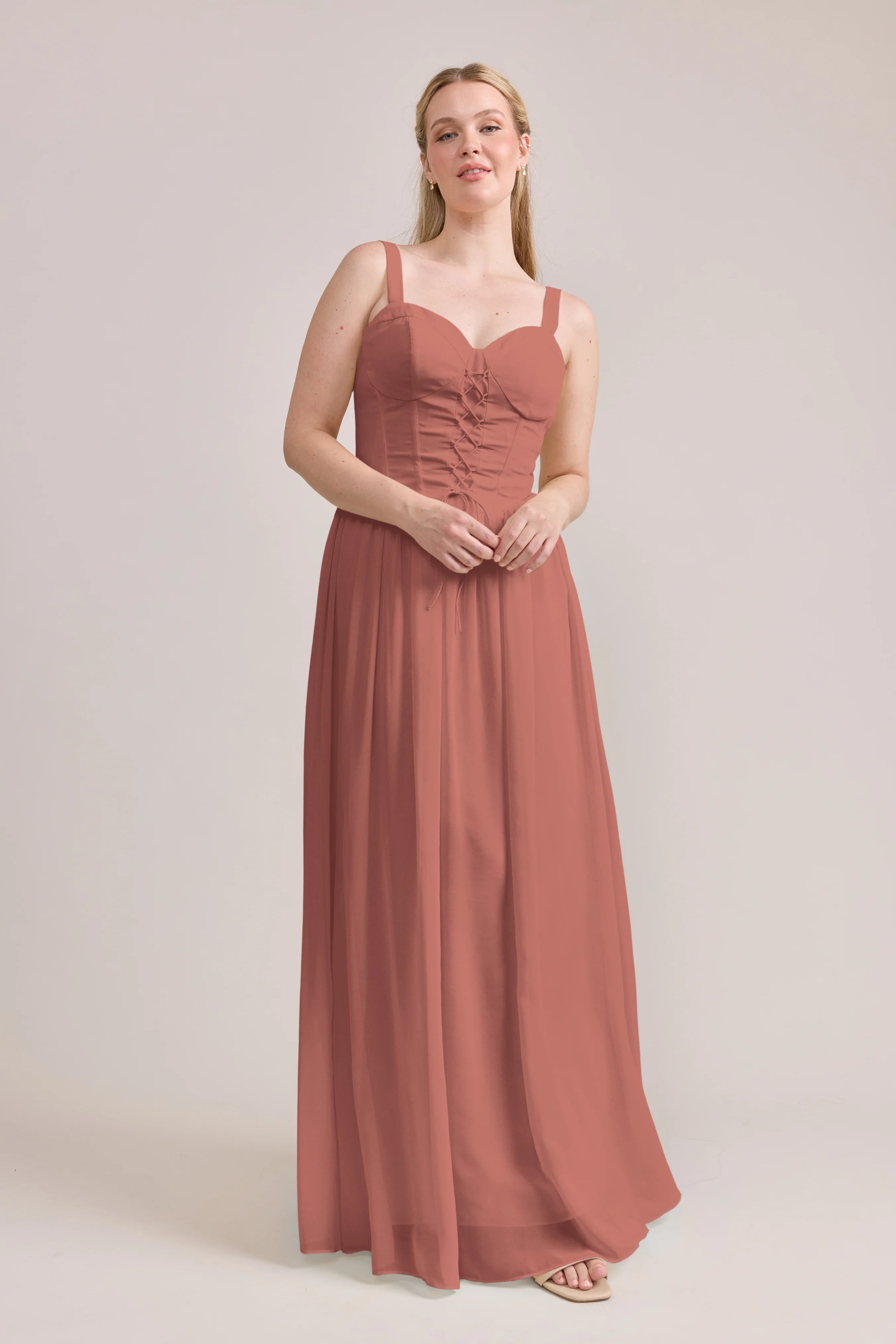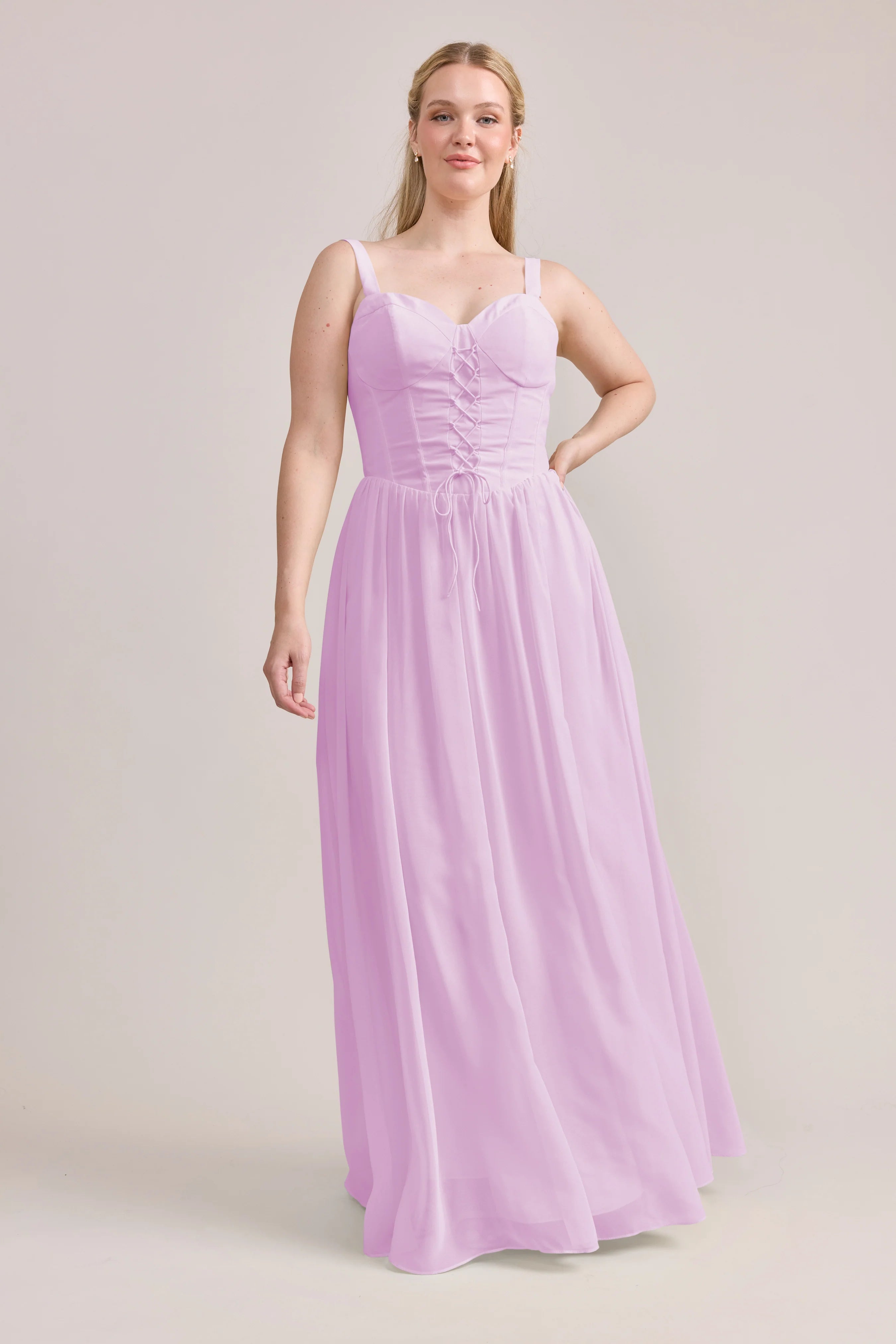 Straight out of a fairytale, the Ellapink Chiffon Dress is a perfect choice for any modern princess. Guaranteed to complement every bridesmaid, she features a flattering basque waistline, dainty corset details throughout, and super supportive adjustable shoulder straps. The best part? She has pockets too.