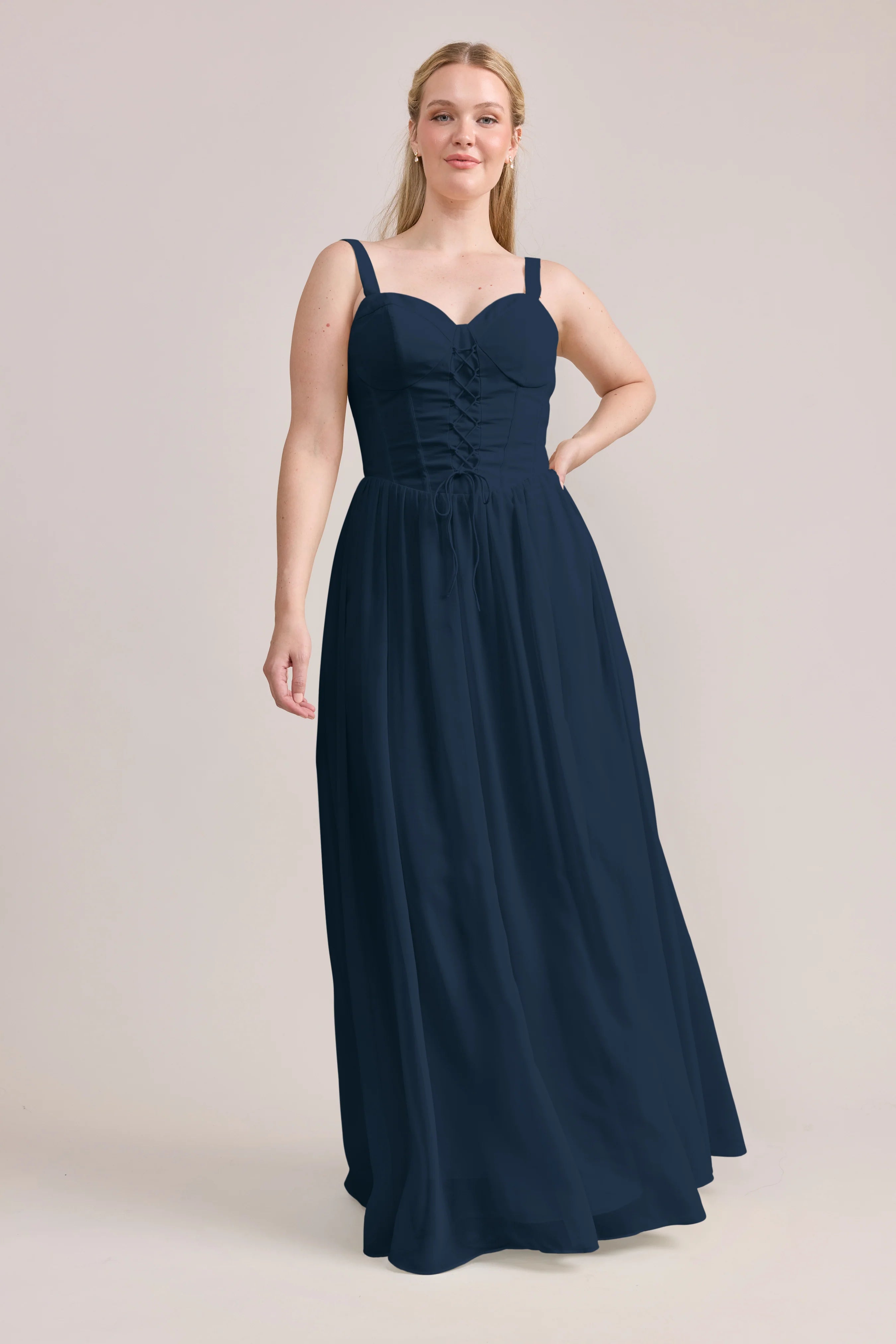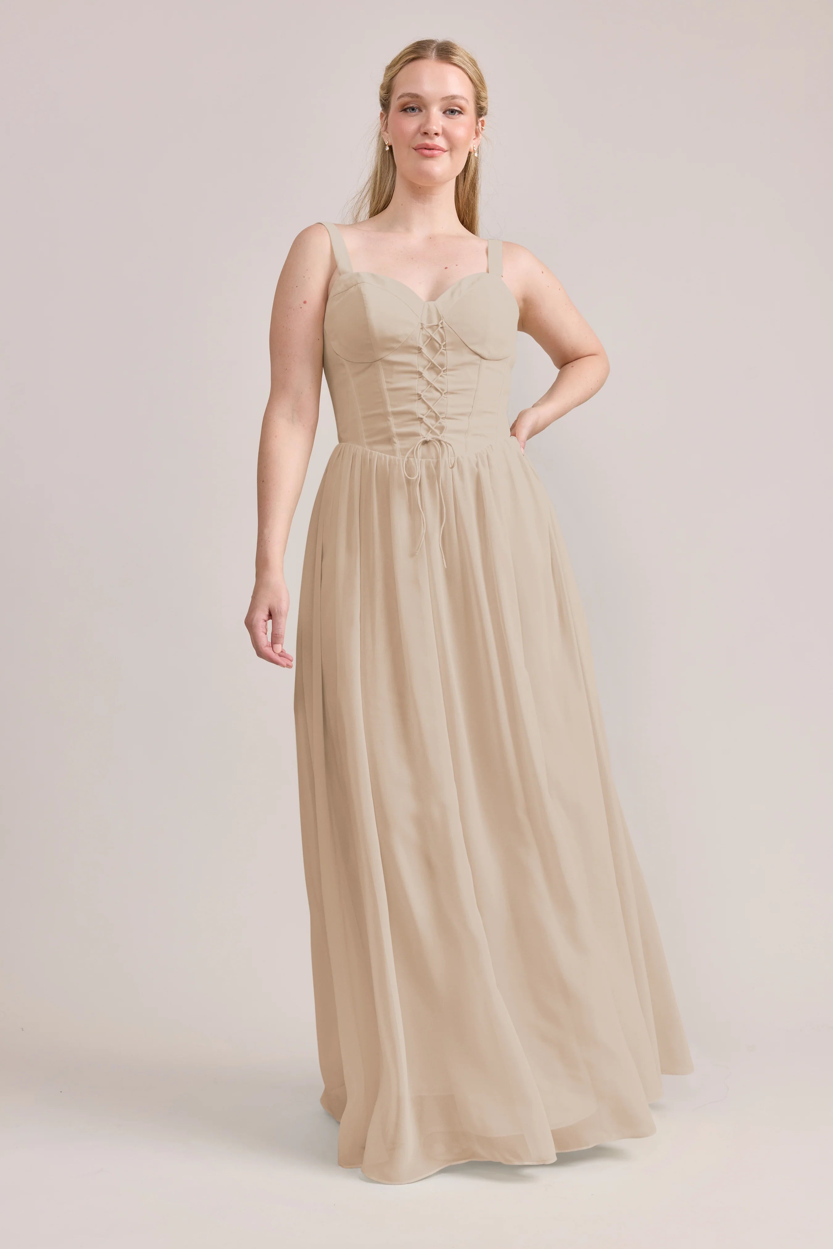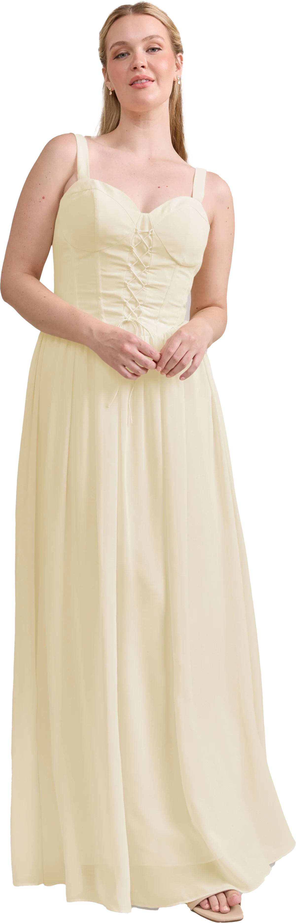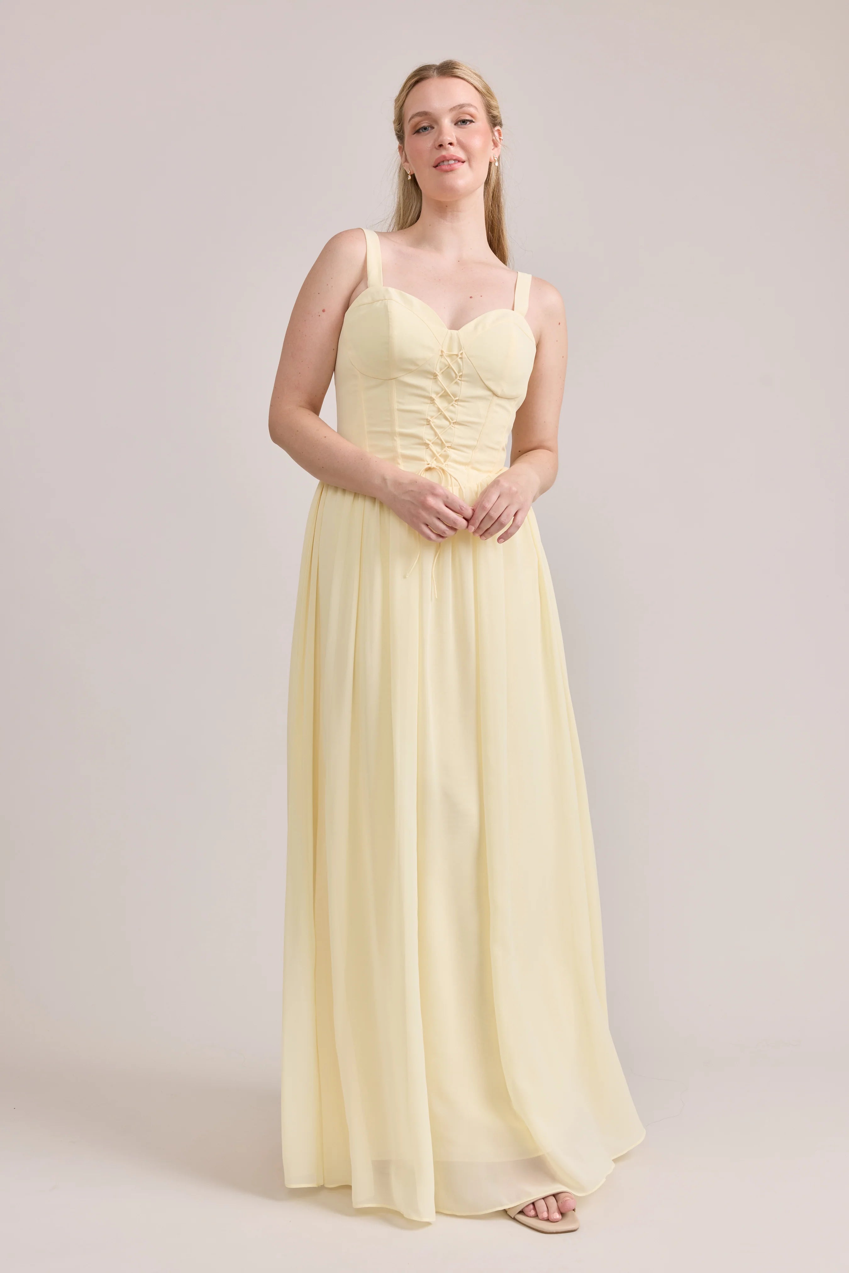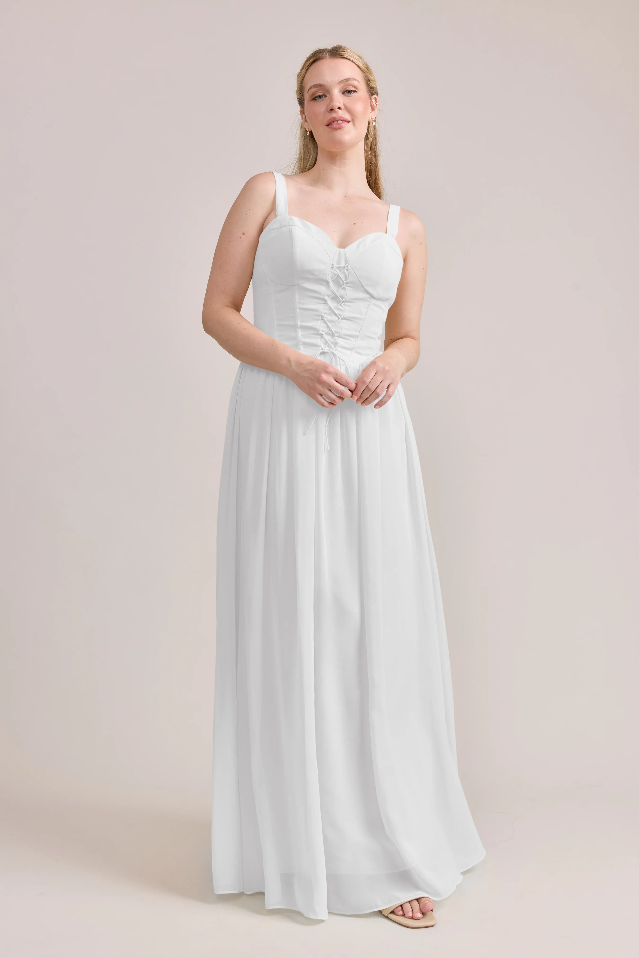 Straight out of a fairytale, the Ellapink Chiffon Dress is a perfect choice for any modern princess. Guaranteed to complement every bridesmaid, she features a flattering basque waistline, dainty corset details throughout, and super supportive adjustable shoulder straps. The best part? She has pockets too.