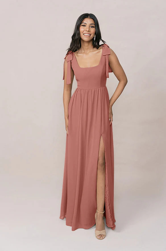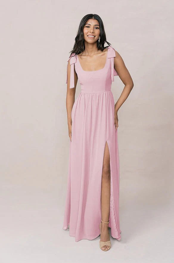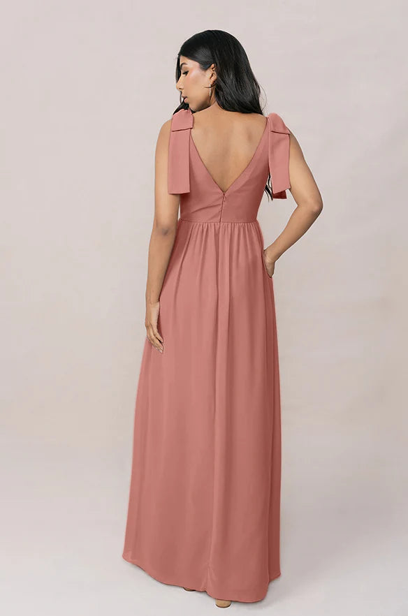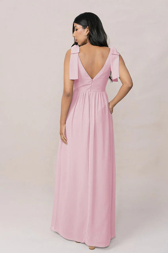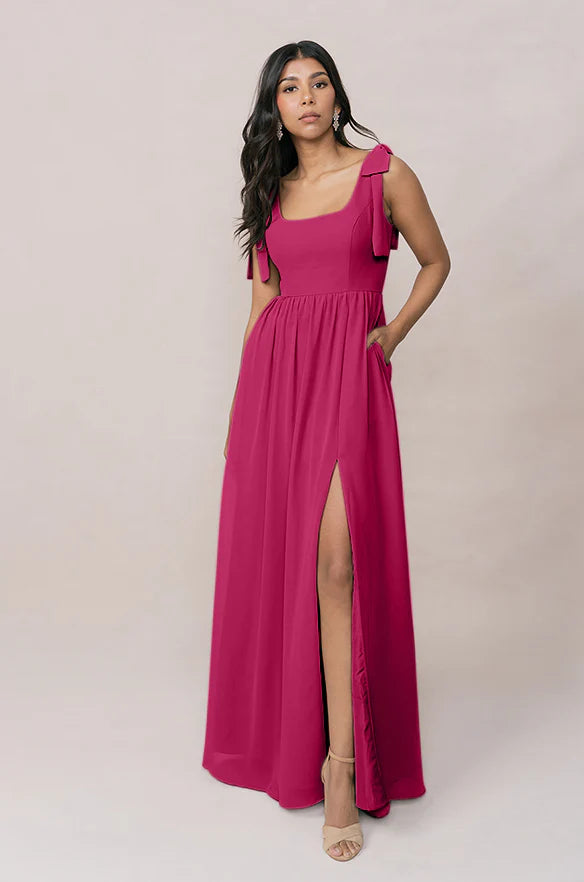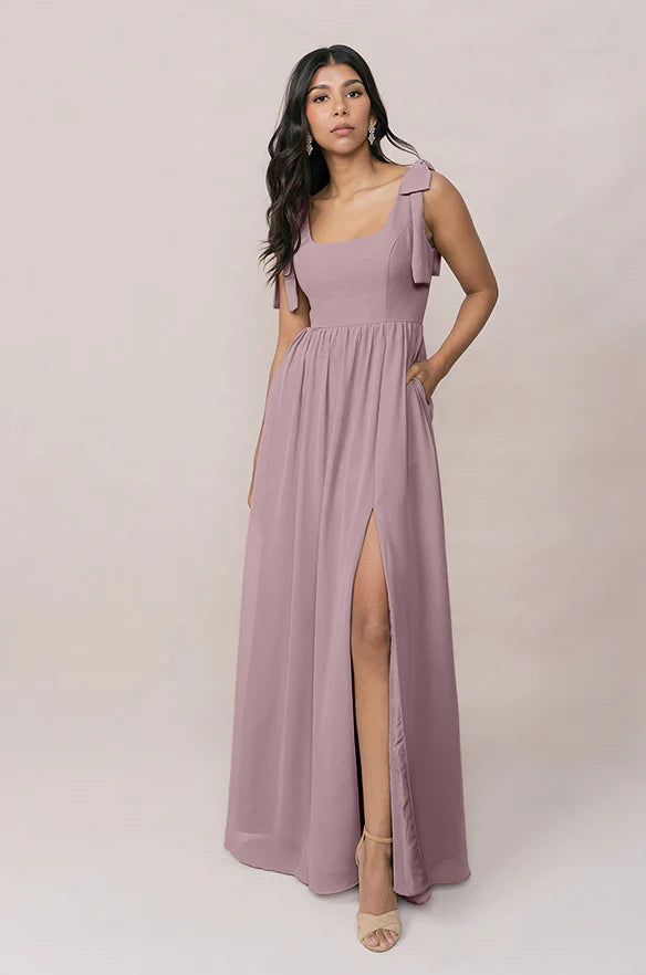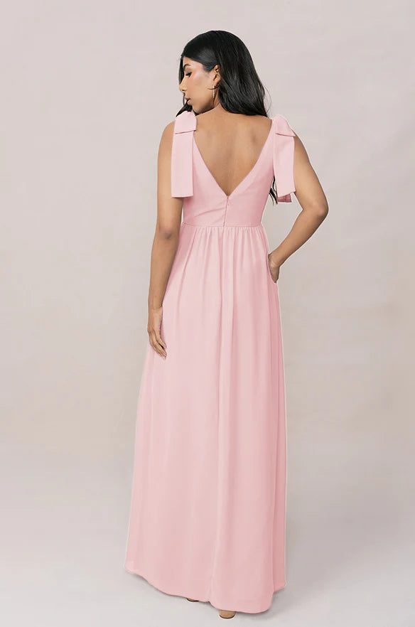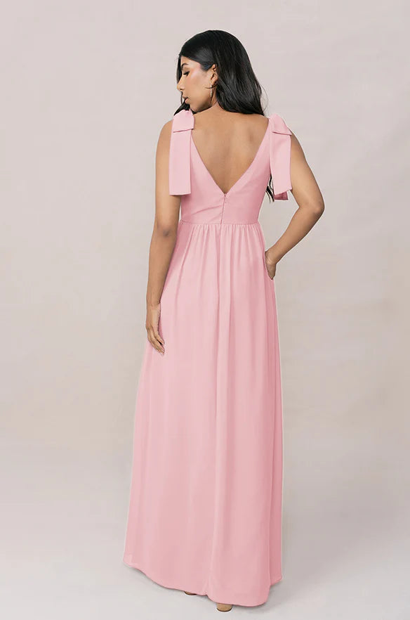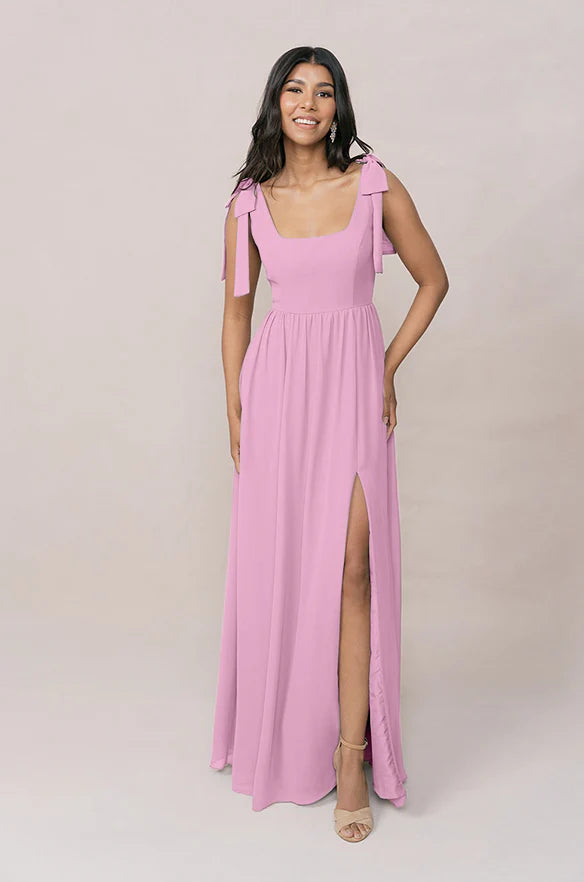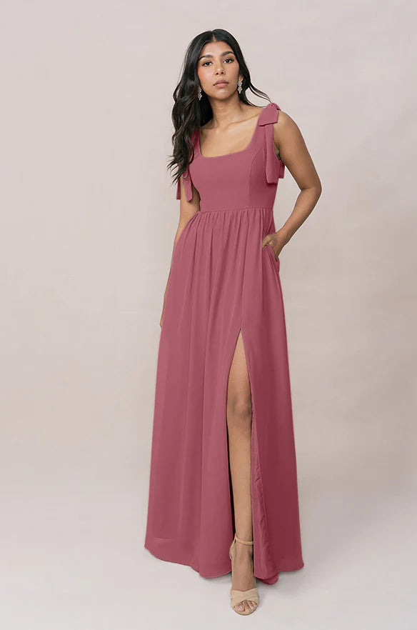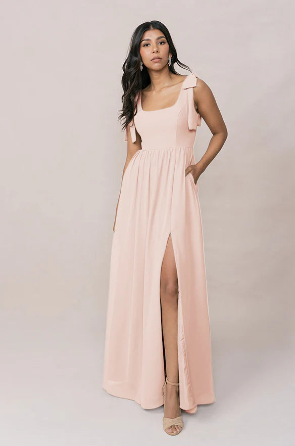The Ellapink Chiffon dress is the perfect fit for the bridesmaid looking to have a modest, yet still flirty dress! Bowie features trendy details like its square neckline, pockets in the skirt, and detachable bows giving all the playful vibes in this design. The detachable bows snap on and off with small buttons centered on the straps.