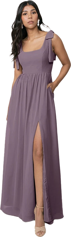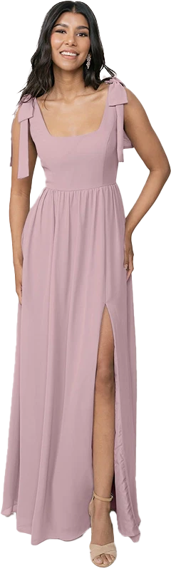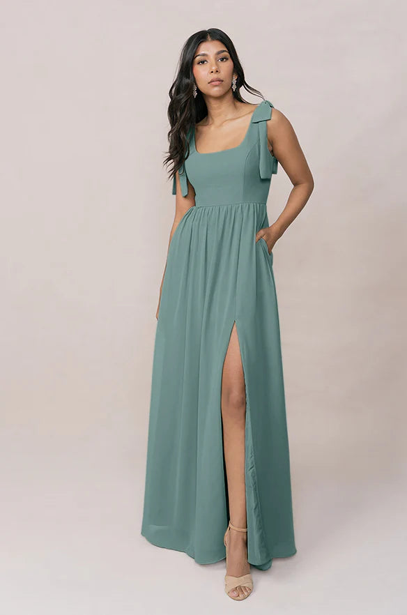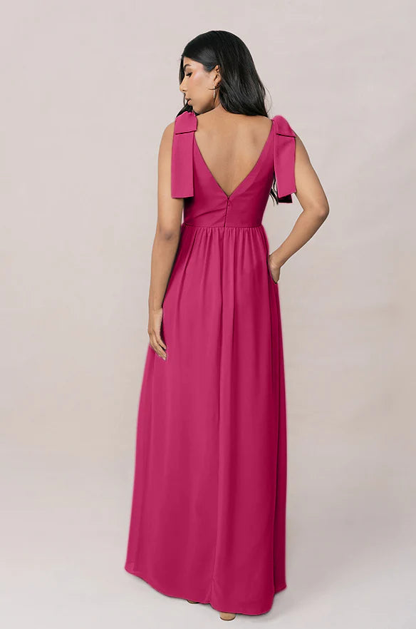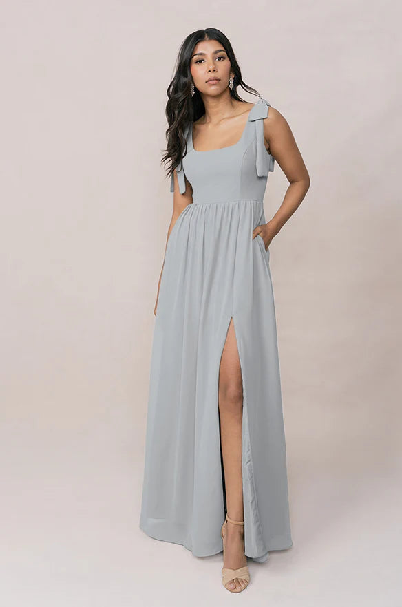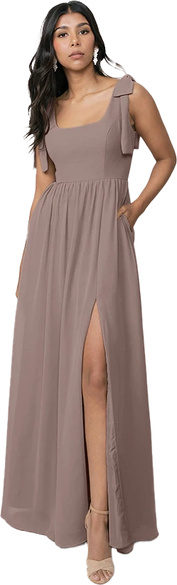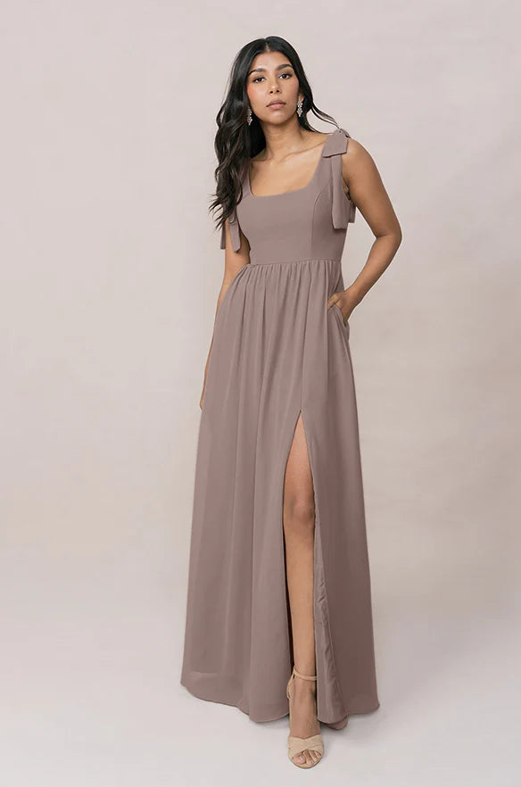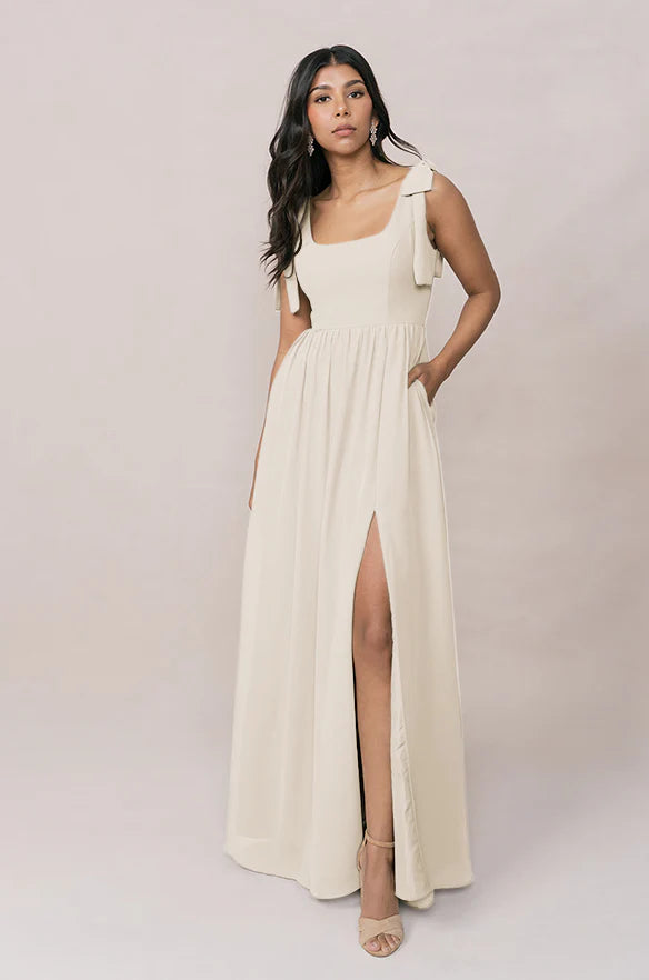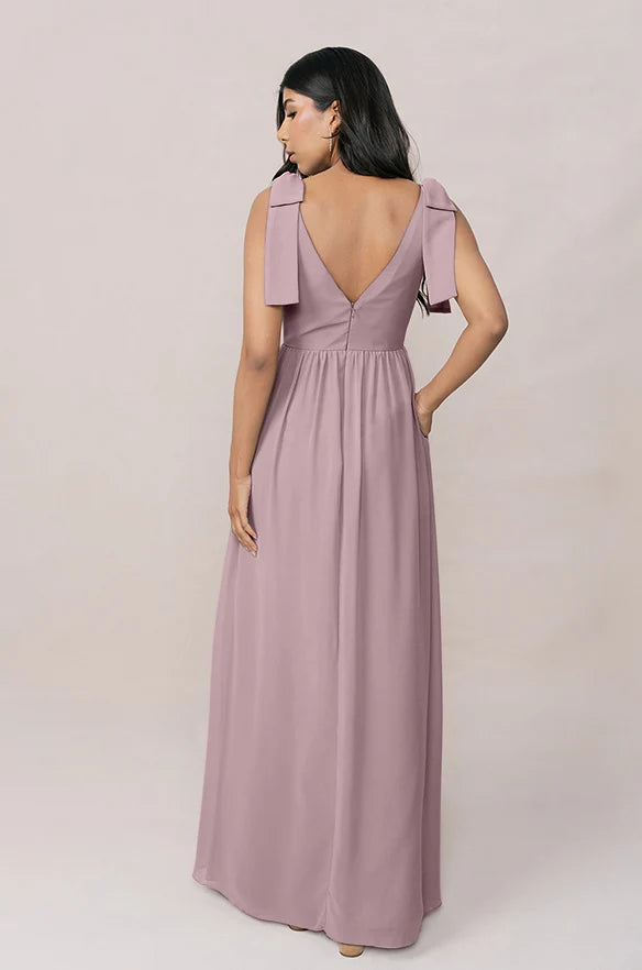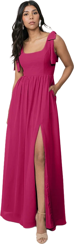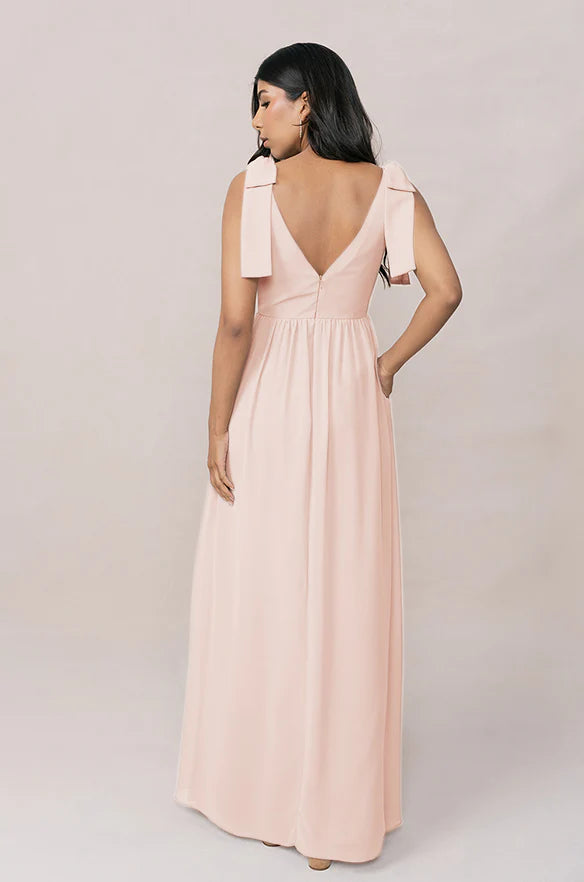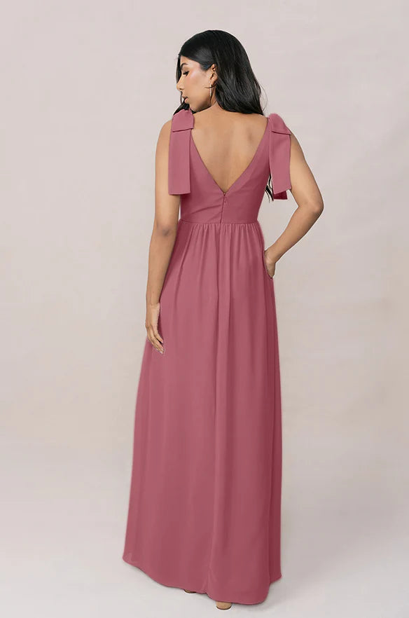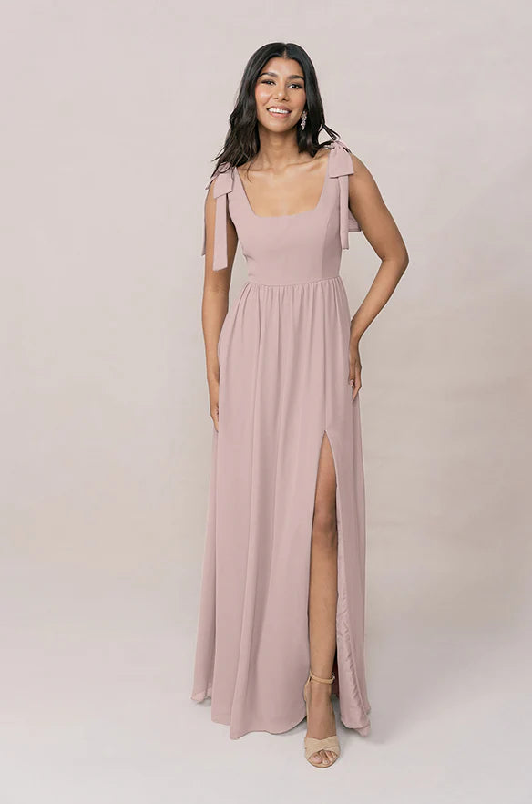 The Ellapink Chiffon dress is the perfect fit for the bridesmaid looking to have a modest, yet still flirty dress! Bowie features trendy details like its square neckline, pockets in the skirt, and detachable bows giving all the playful vibes in this design. The detachable bows snap on and off with small buttons centered on the straps.