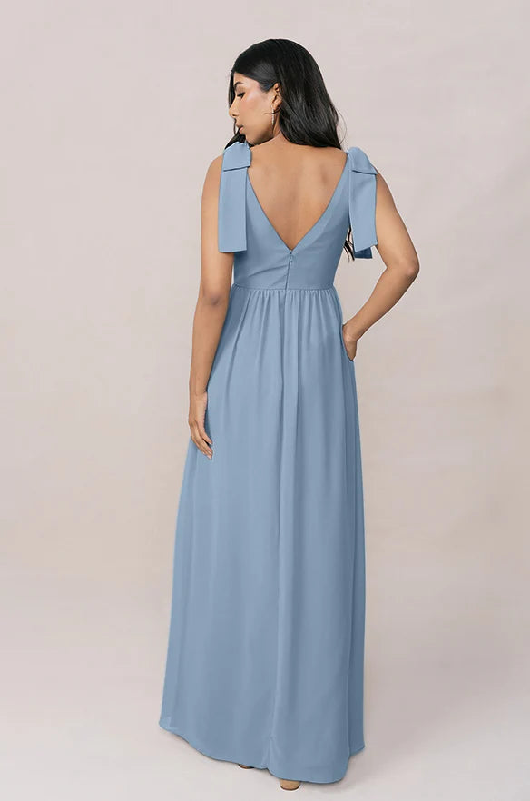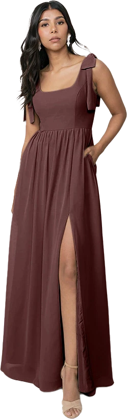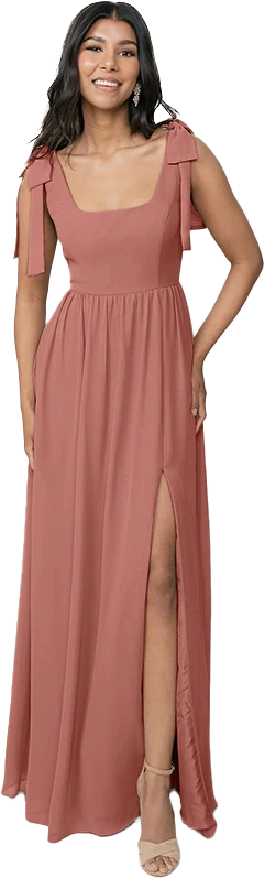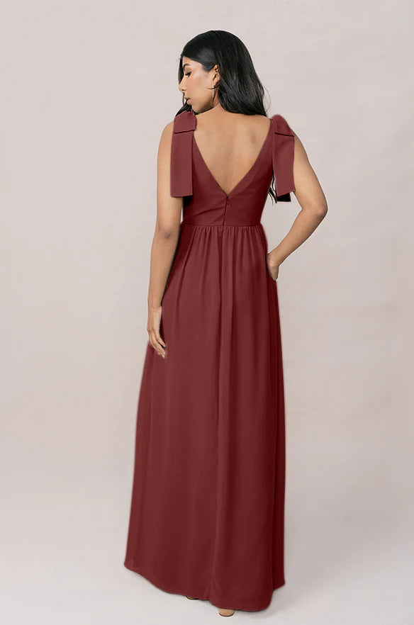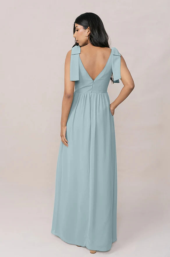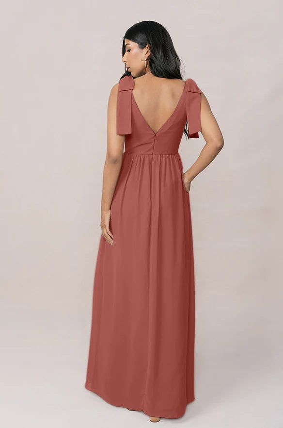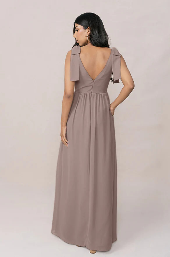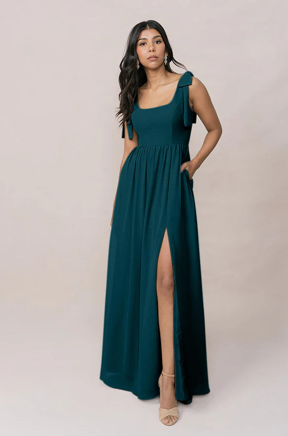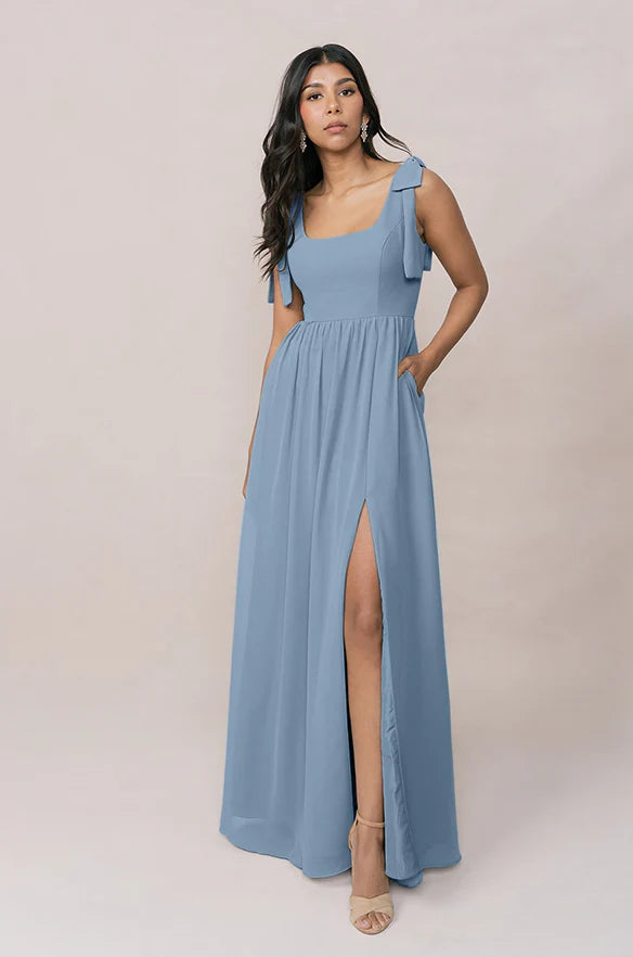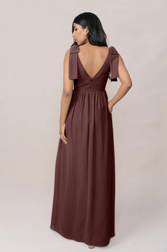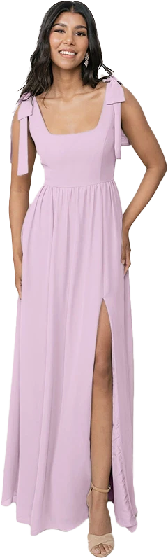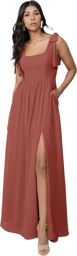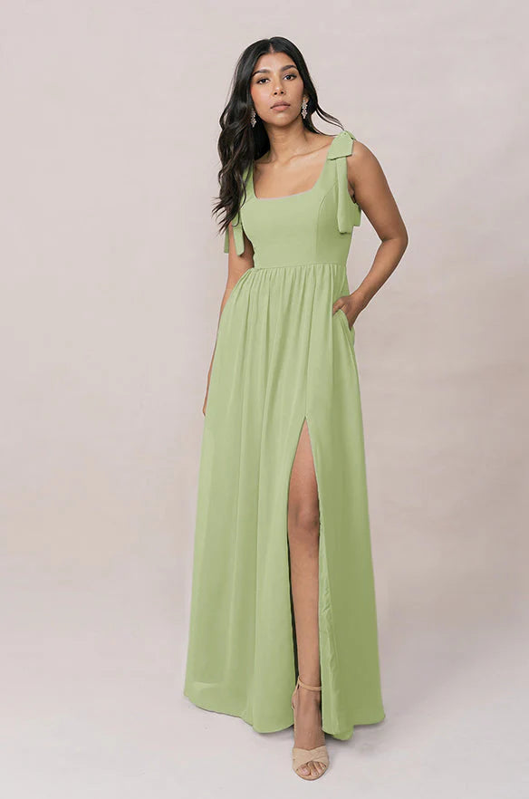 The Ellapink Chiffon dress is the perfect fit for the bridesmaid looking to have a modest, yet still flirty dress! Bowie features trendy details like its square neckline, pockets in the skirt, and detachable bows giving all the playful vibes in this design. The detachable bows snap on and off with small buttons centered on the straps.