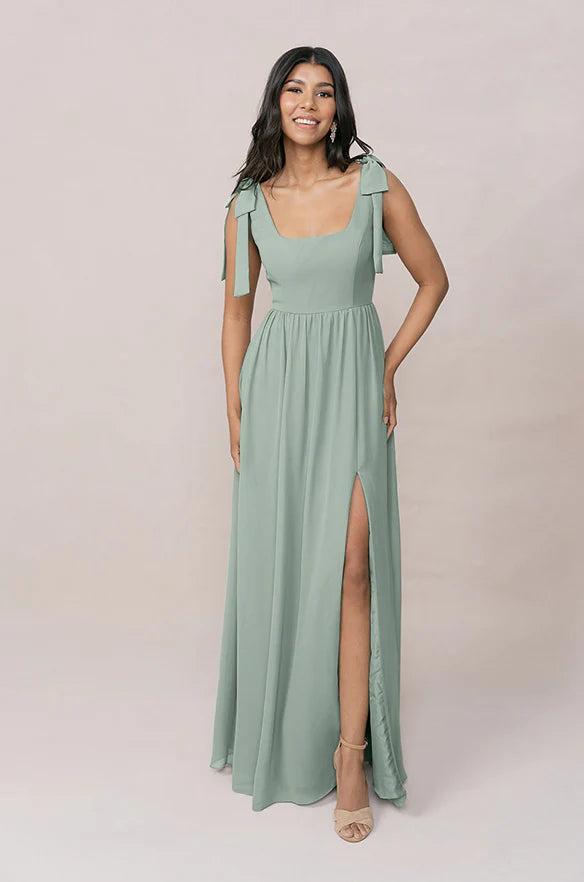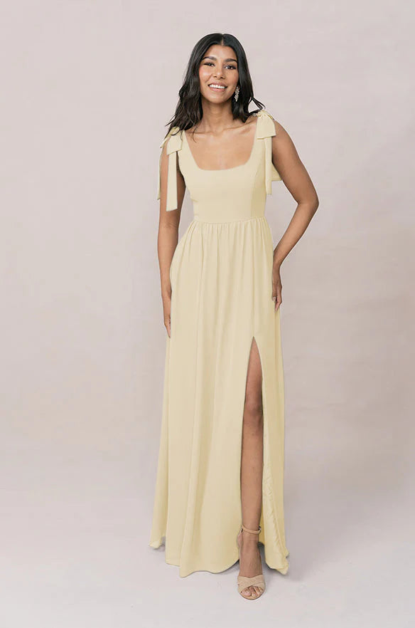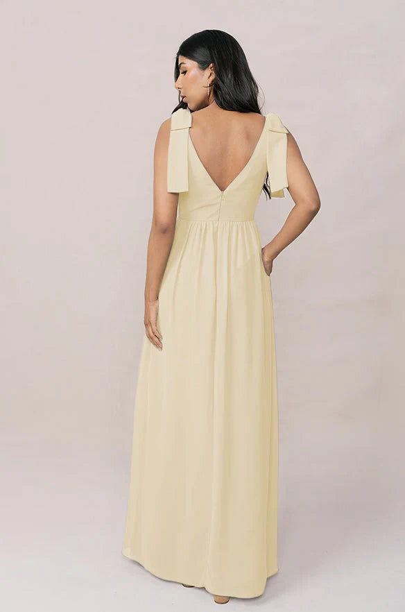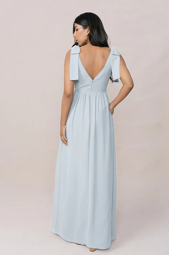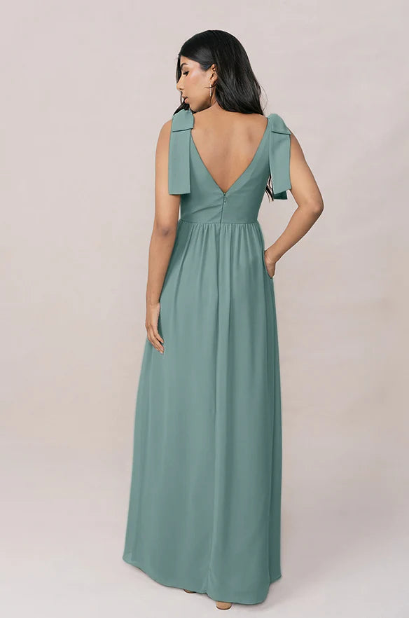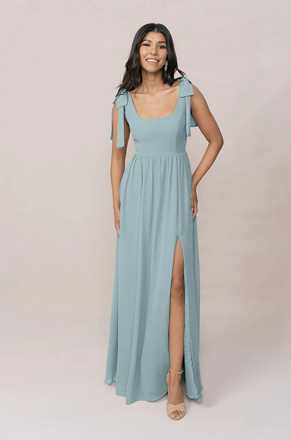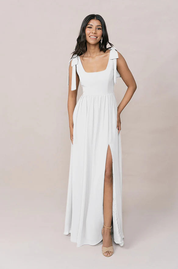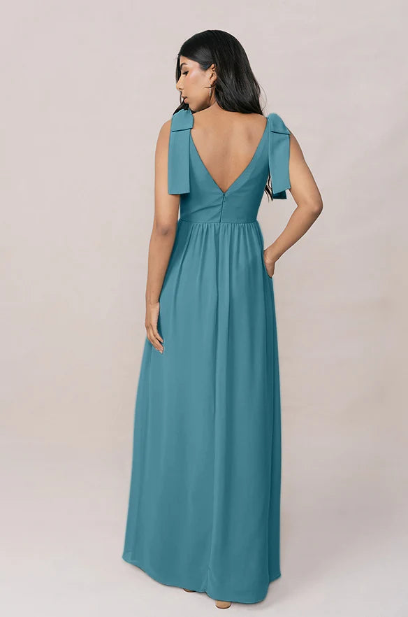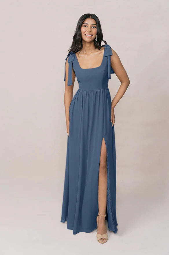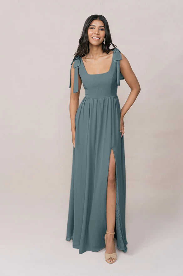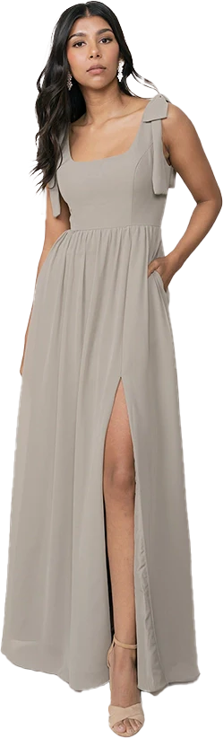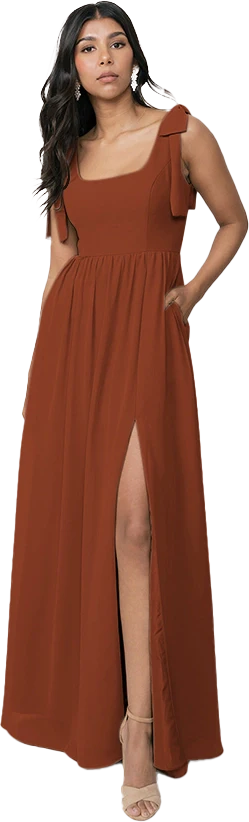 The Ellapink Chiffon dress is the perfect fit for the bridesmaid looking to have a modest, yet still flirty dress! Bowie features trendy details like its square neckline, pockets in the skirt, and detachable bows giving all the playful vibes in this design. The detachable bows snap on and off with small buttons centered on the straps.