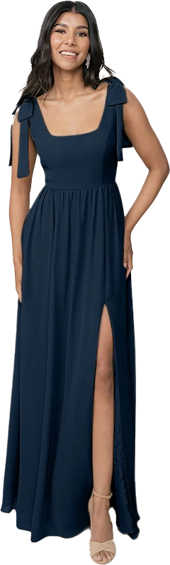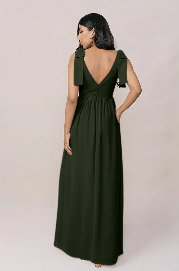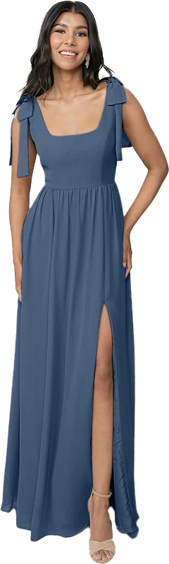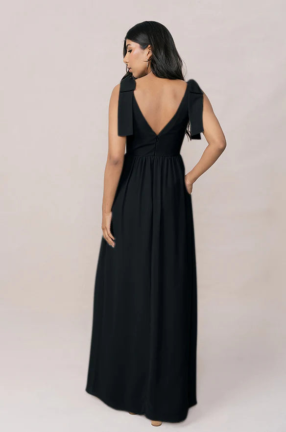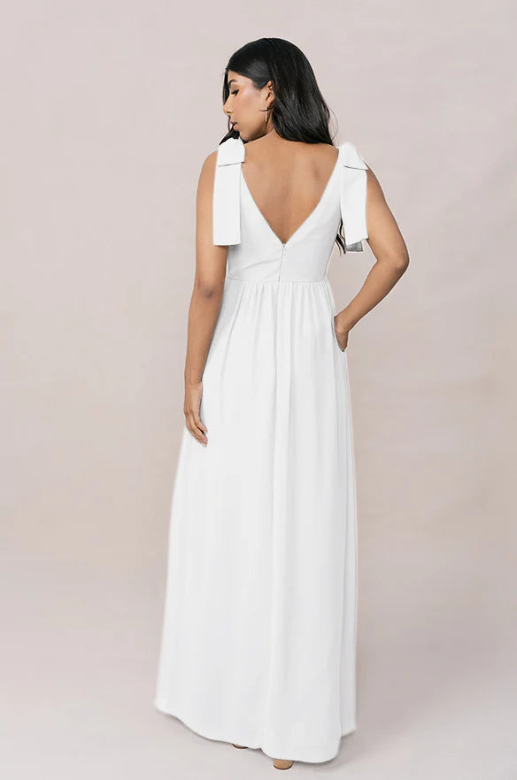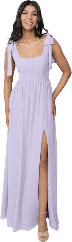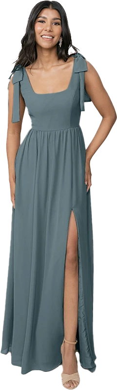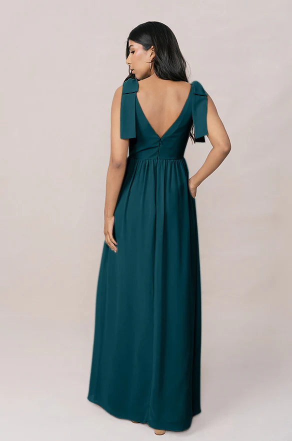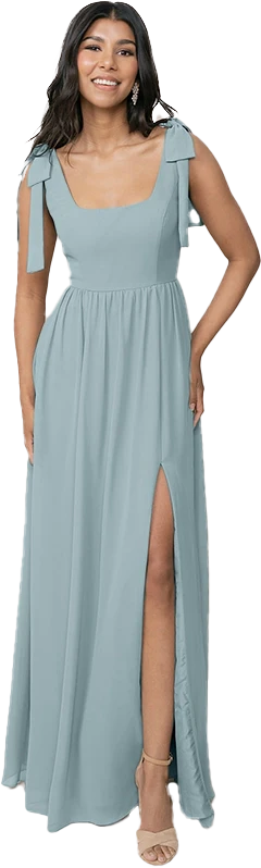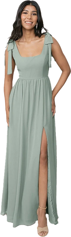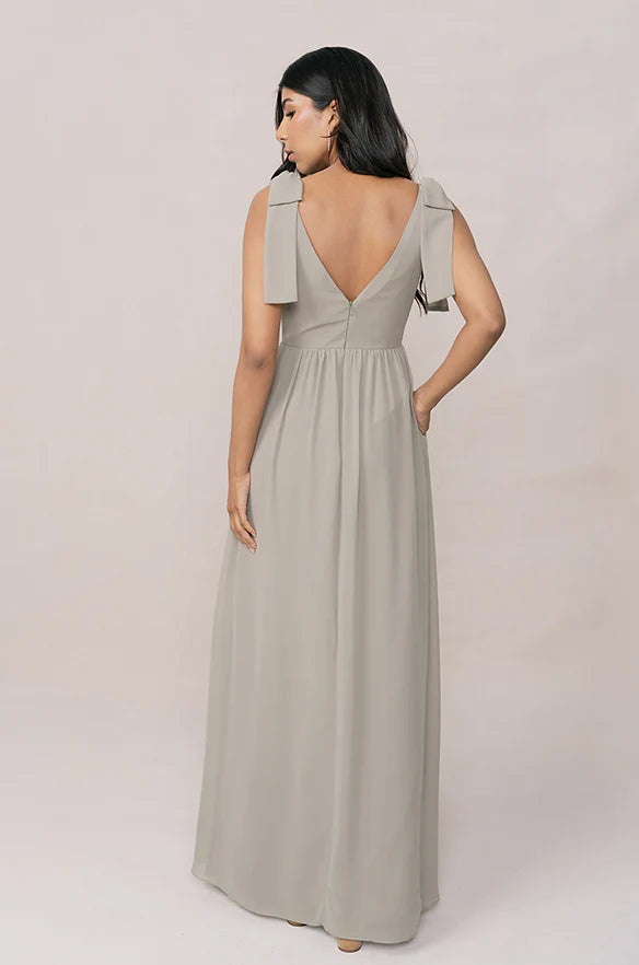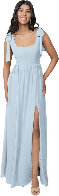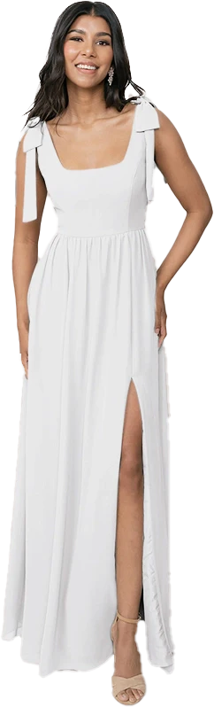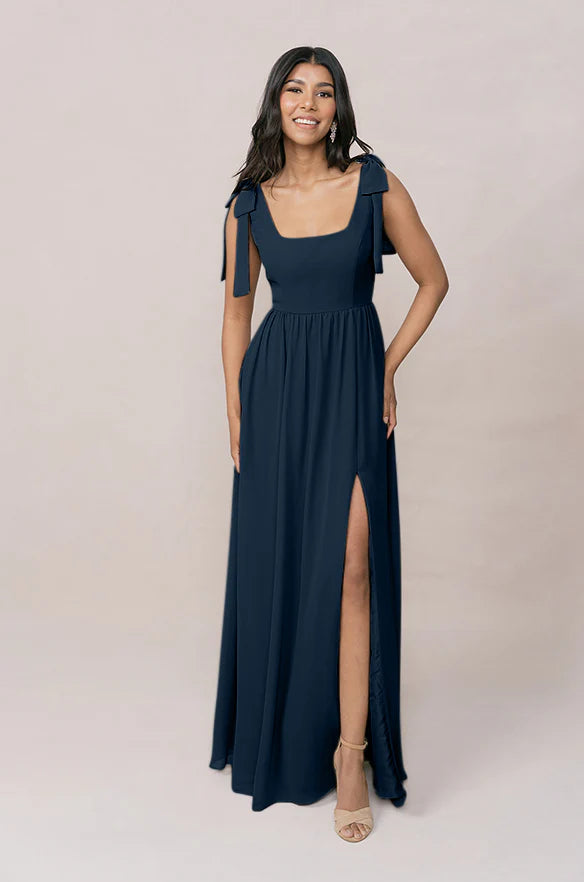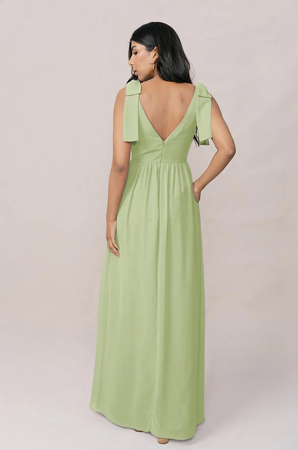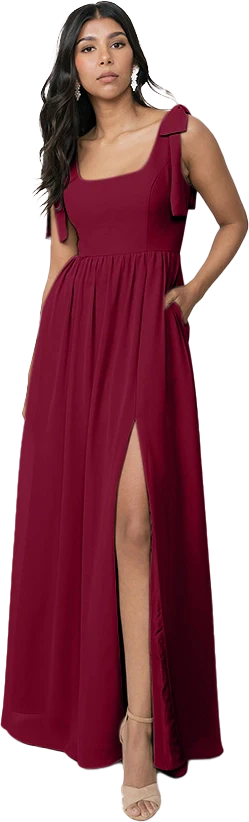 The Ellapink Chiffon dress is the perfect fit for the bridesmaid looking to have a modest, yet still flirty dress! Bowie features trendy details like its square neckline, pockets in the skirt, and detachable bows giving all the playful vibes in this design. The detachable bows snap on and off with small buttons centered on the straps.