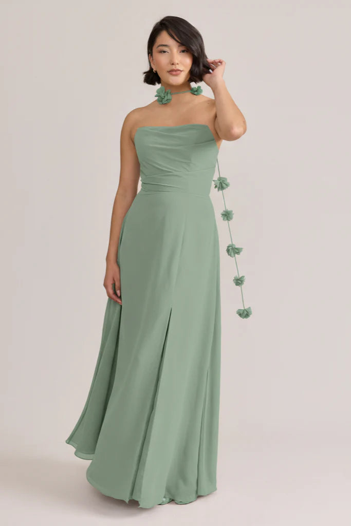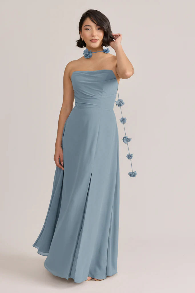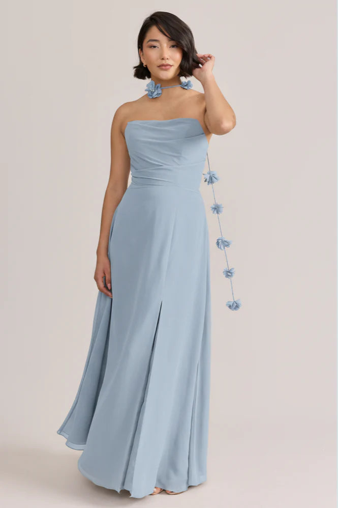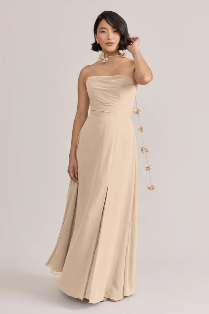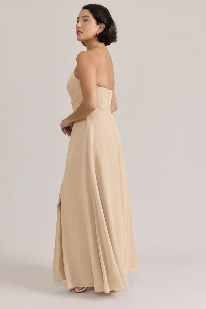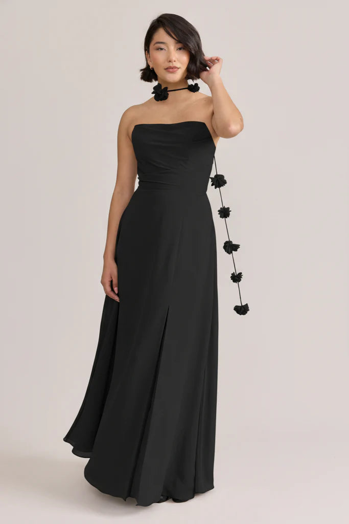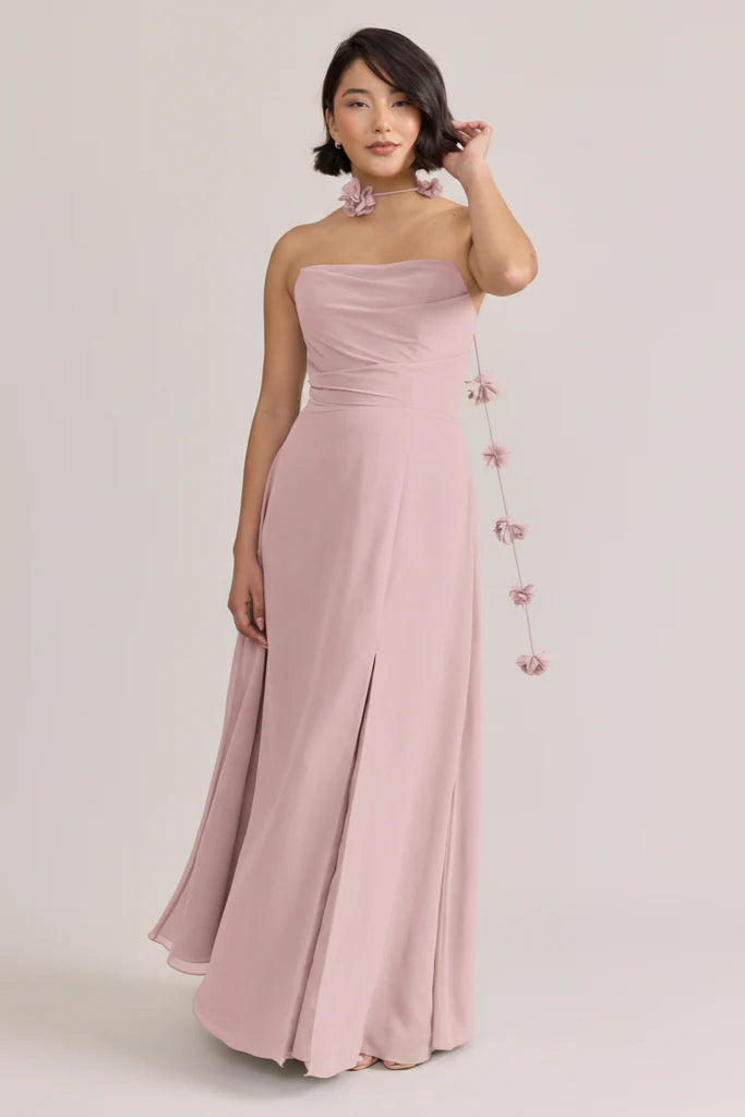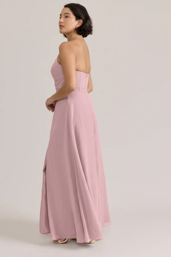 Fiercely sweet, our Ellapink Chiffon dress will have you slaying hearts, featuring a pointed strapless neckline and flowing satin skirt.