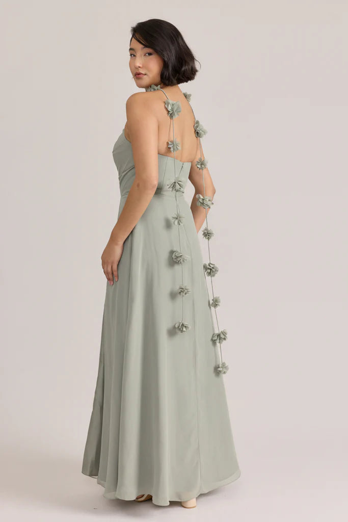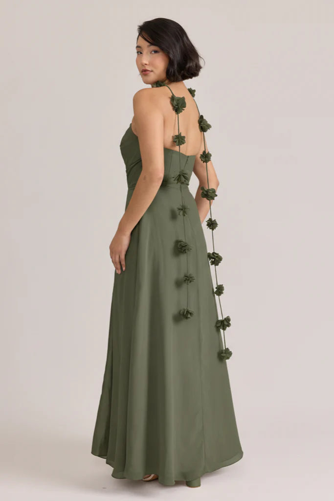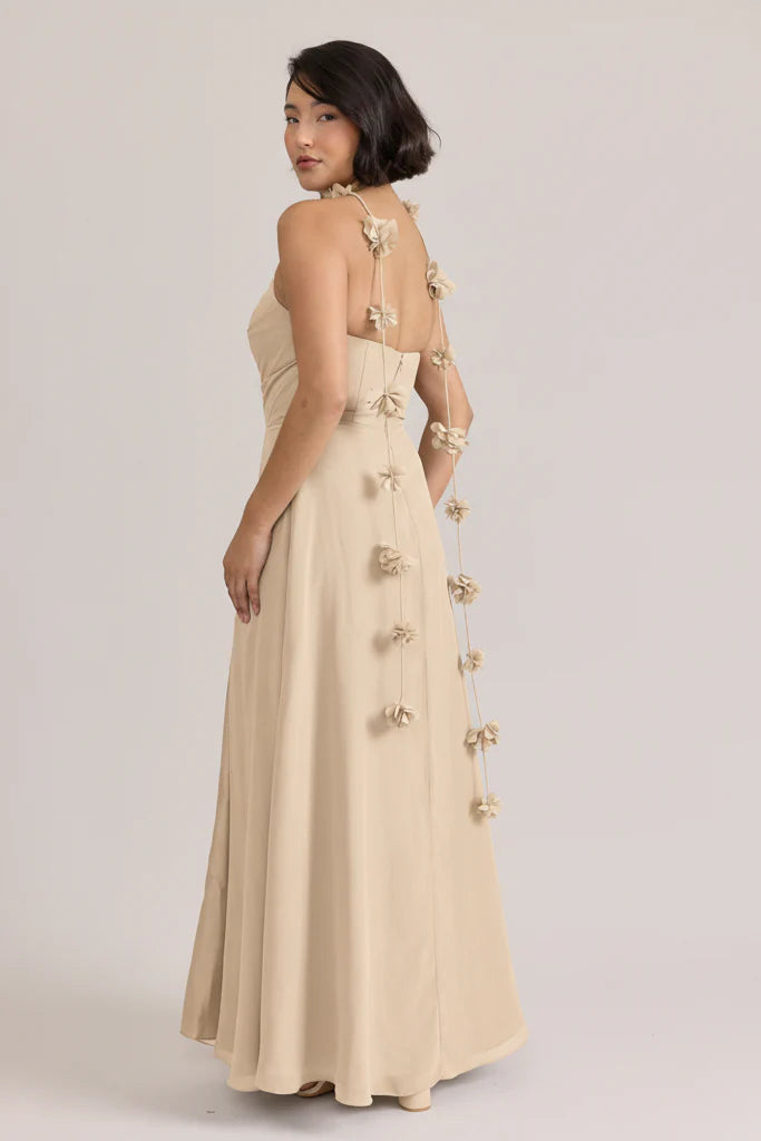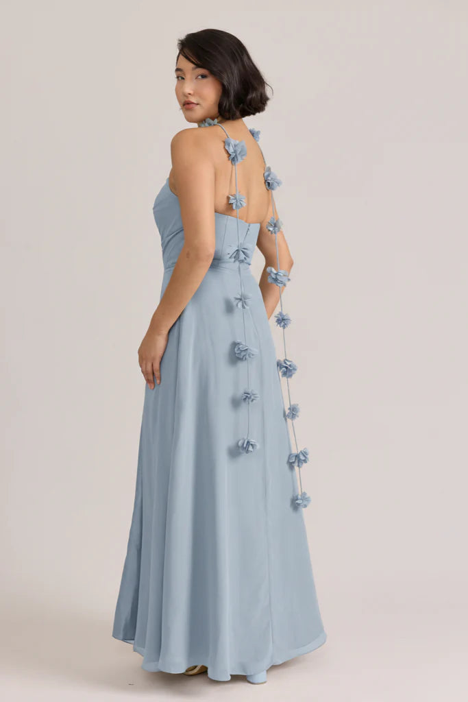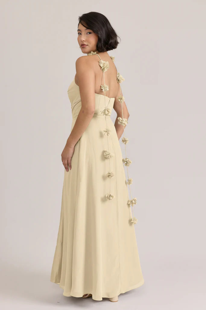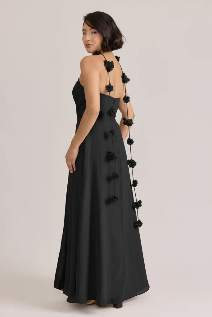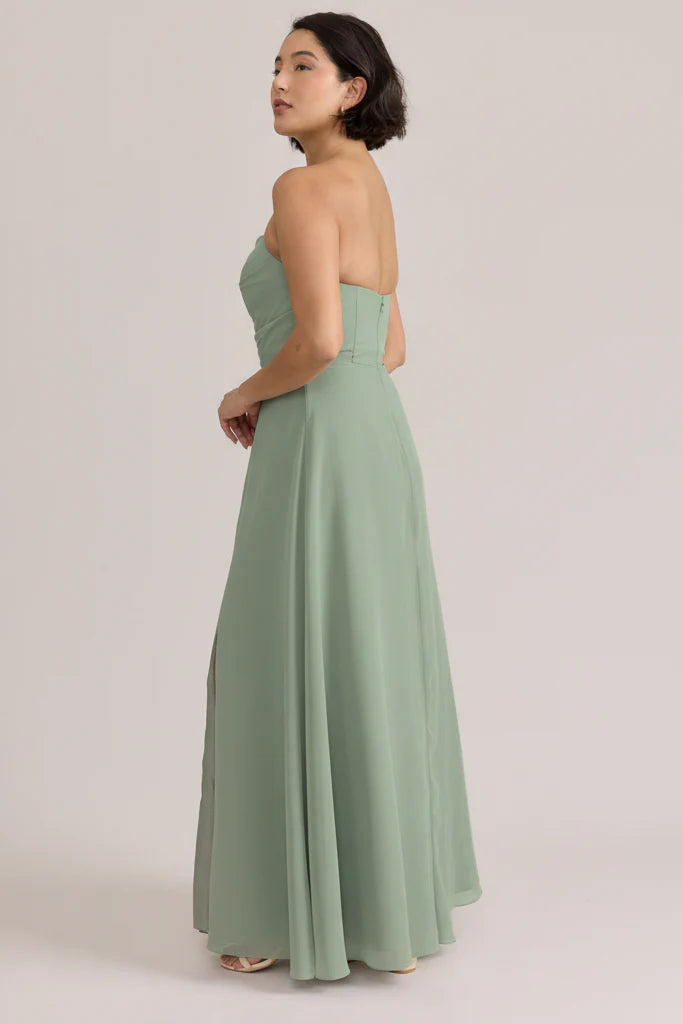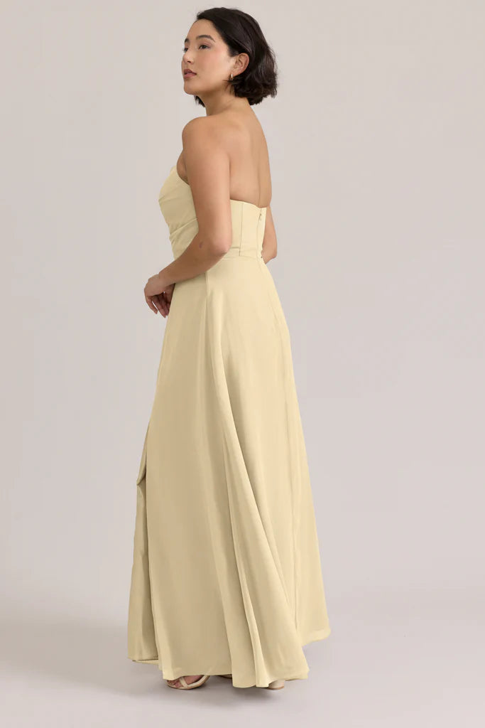 Fiercely sweet, our Ellapink Chiffon dress will have you slaying hearts, featuring a pointed strapless neckline and flowing satin skirt.
