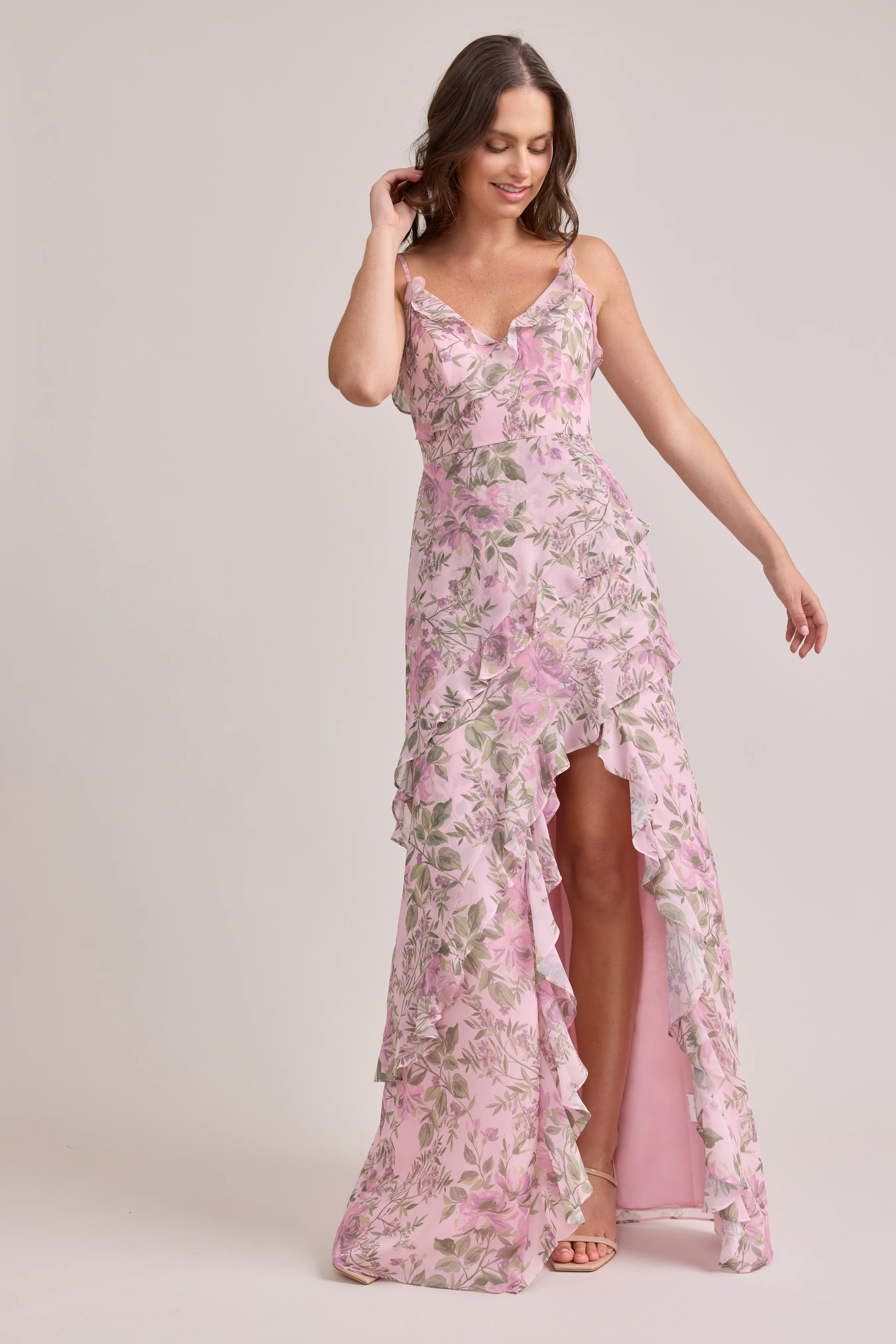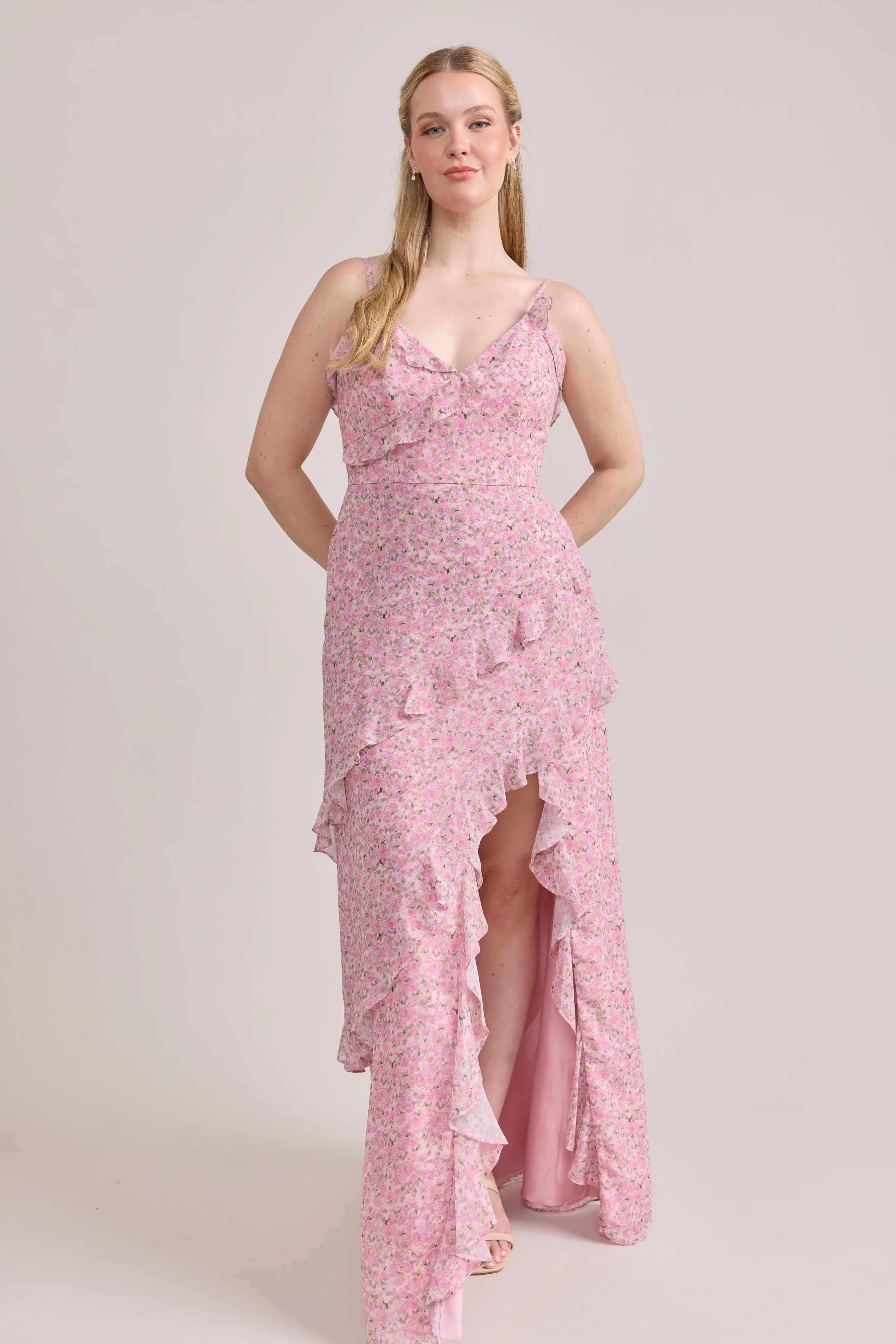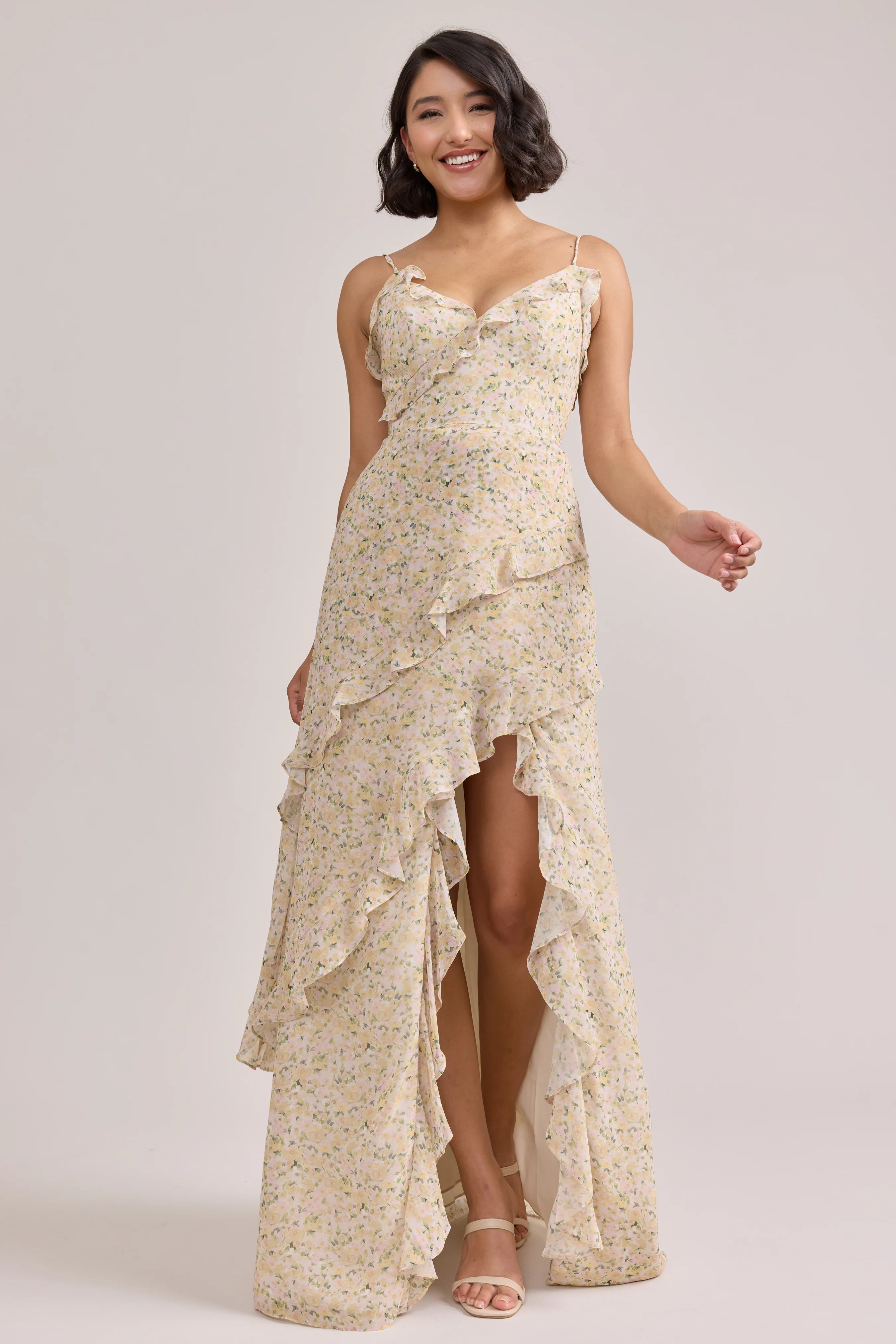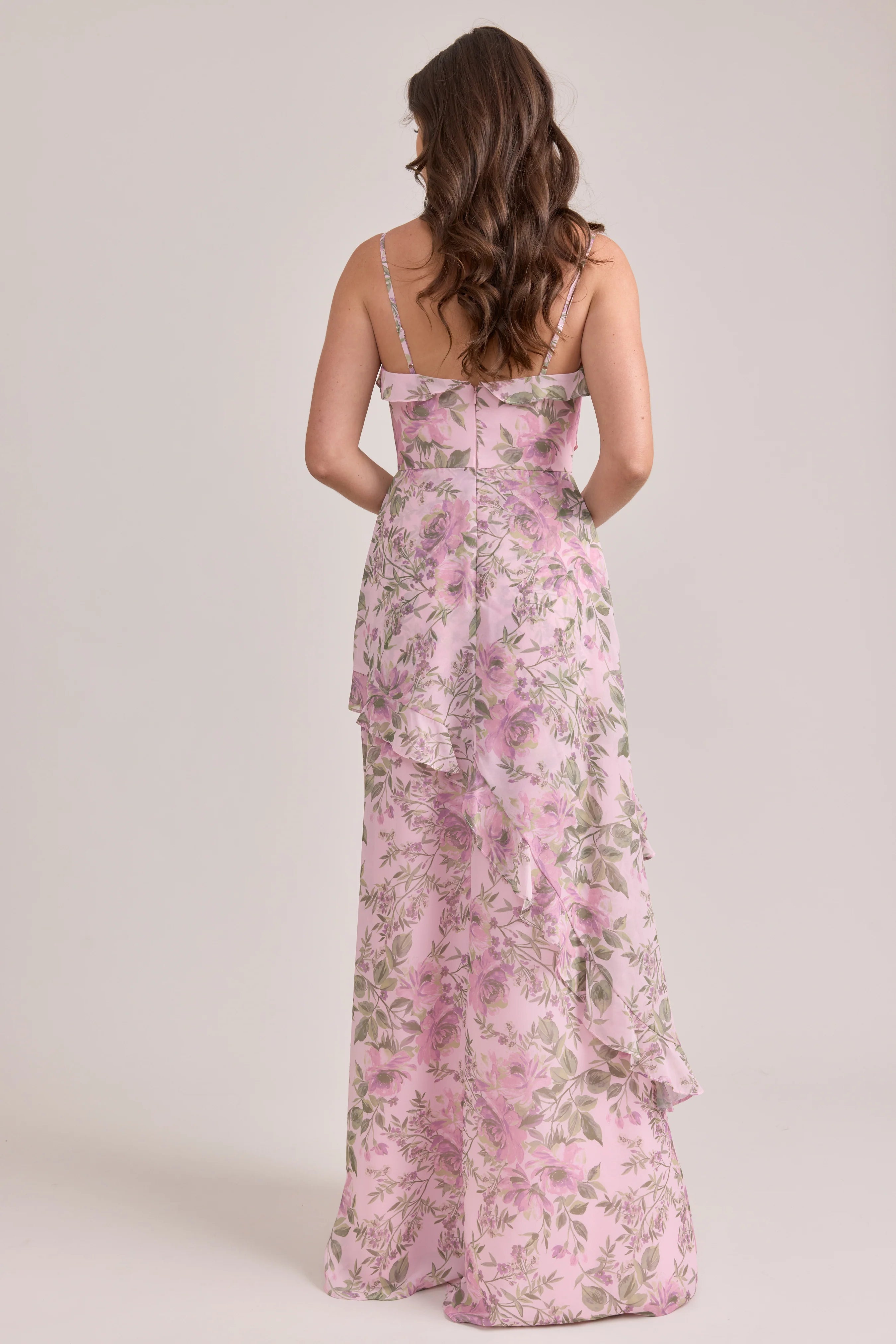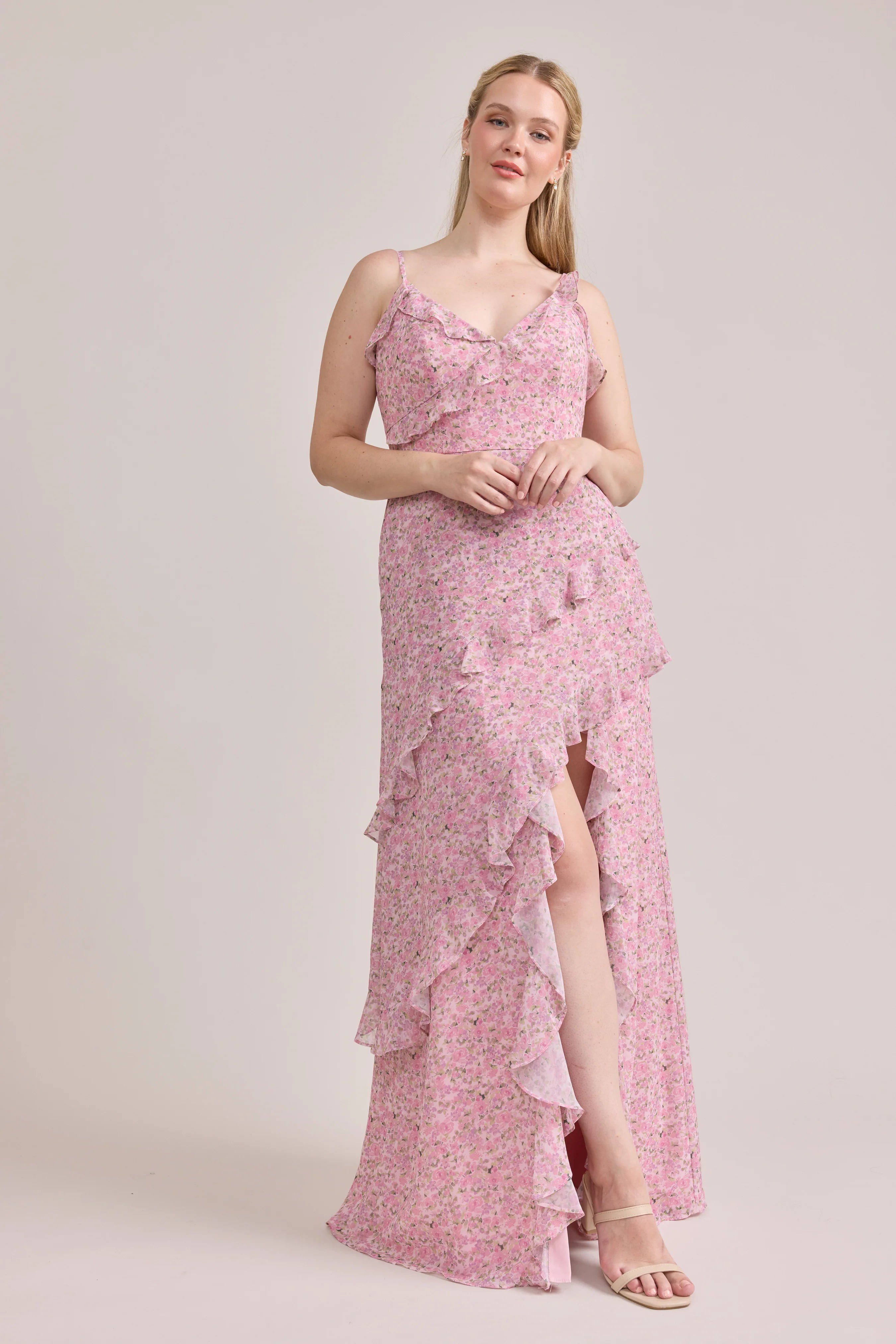 Ellapink will have you smiling the day away with its abundance of ruffles and playful vibes, now available in the new petit rose prints! The Jules Chiffon dress features asymmetrical ruffle details throughout the bodice and skirt. The ruffle lined-slit and multiple layers create tons of movement and texture in every moment, sure to be a stand-out for your wedding line-up!