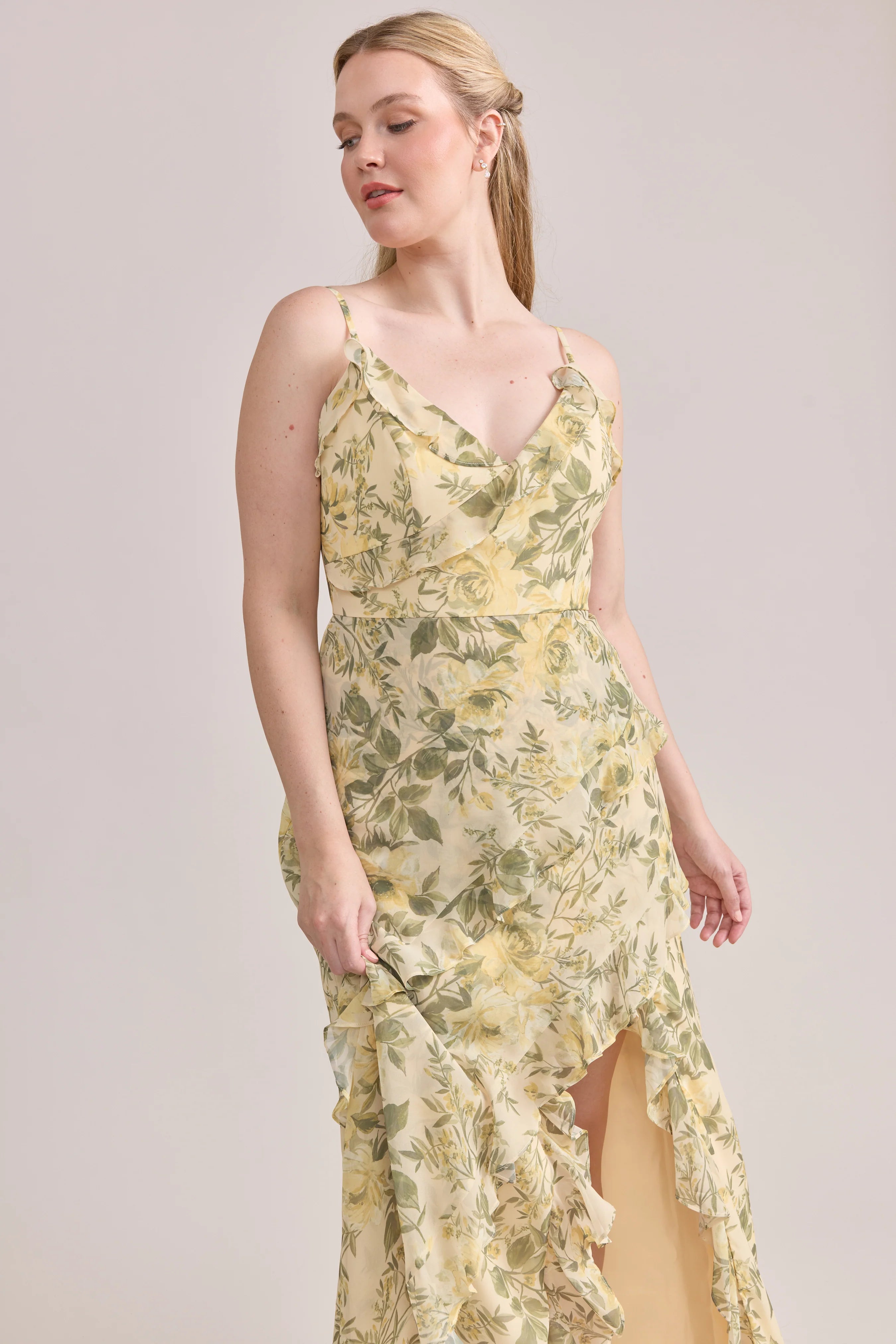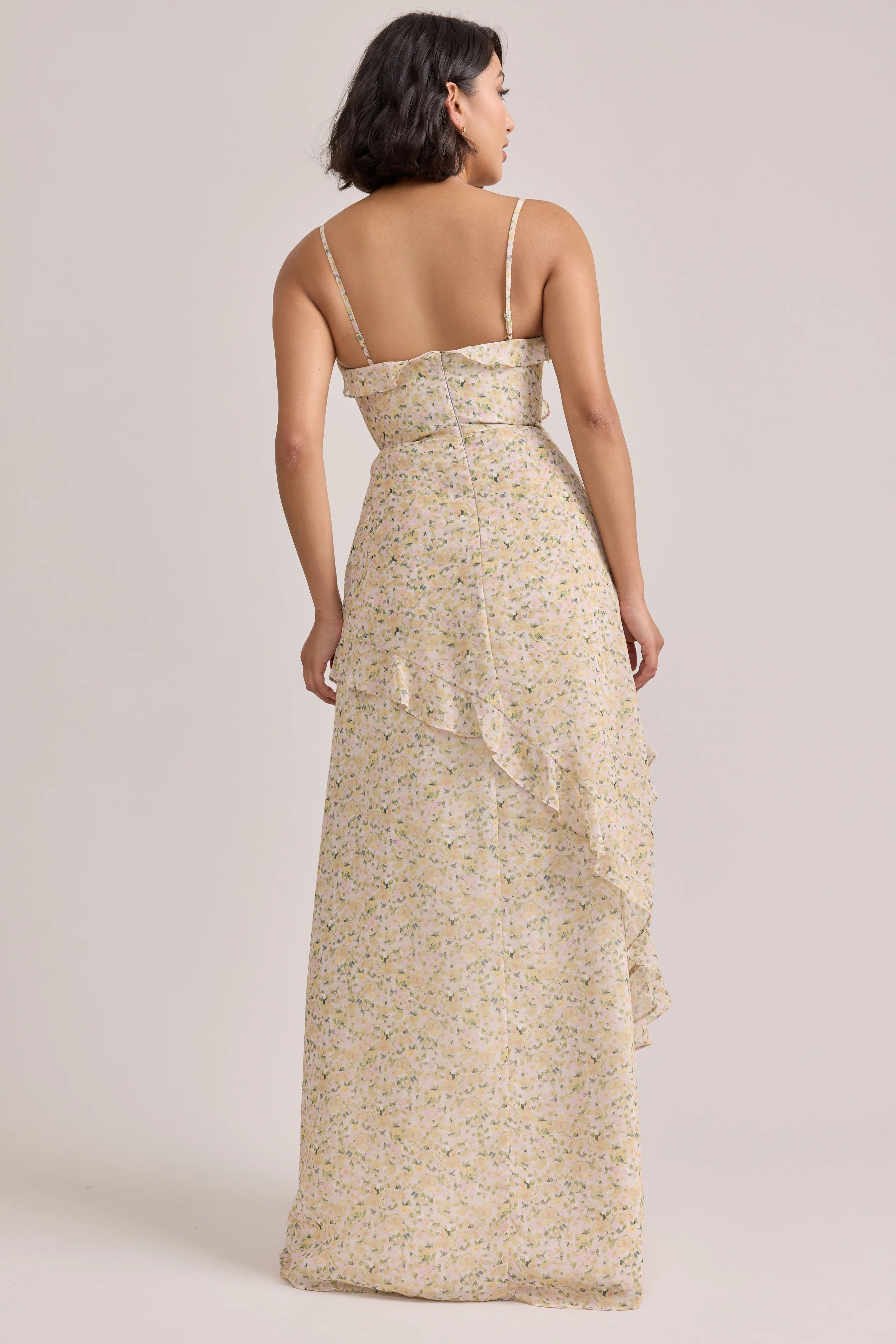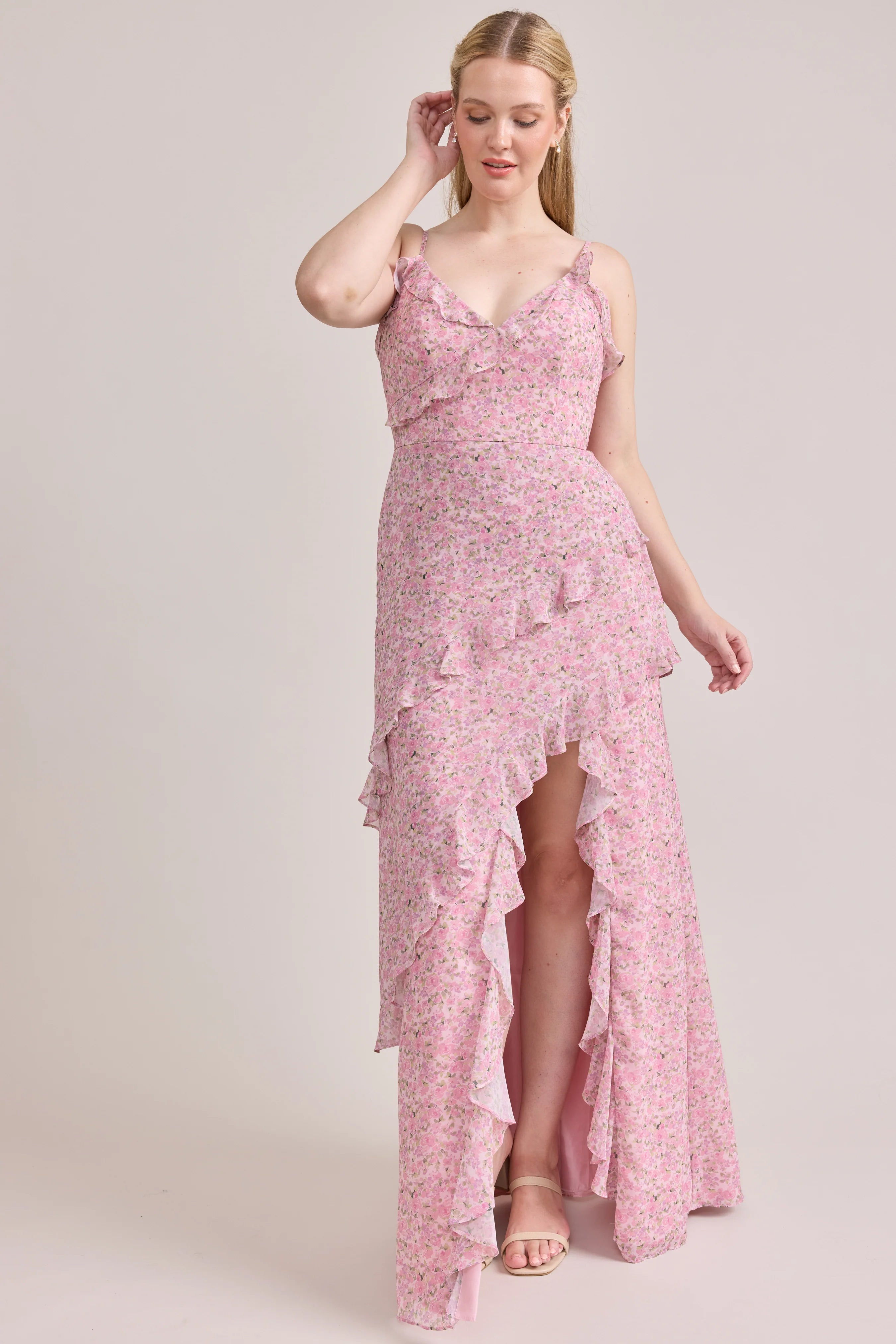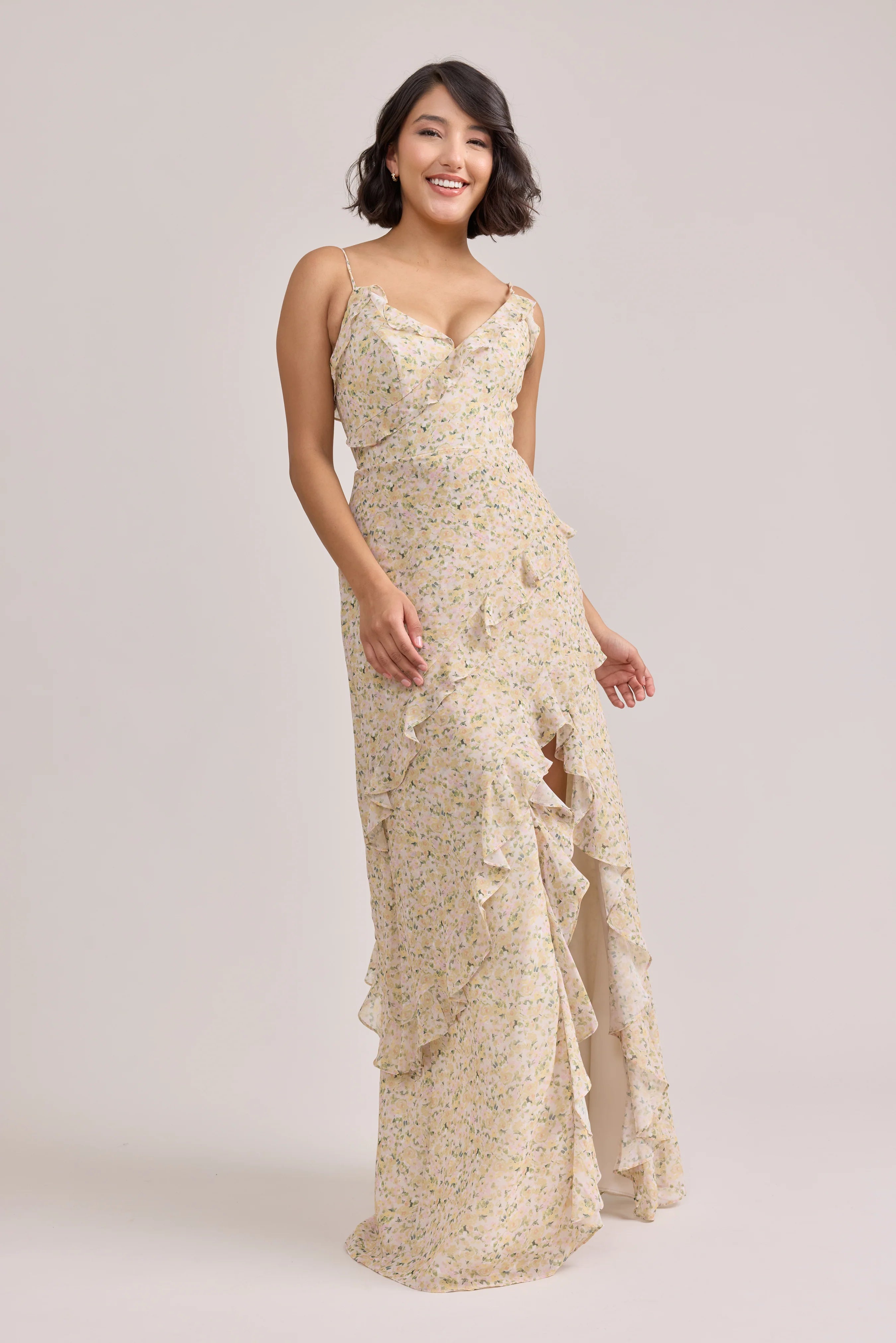 Ellapink will have you smiling the day away with its abundance of ruffles and playful vibes, now available in the new petit rose prints! The Jules Chiffon dress features asymmetrical ruffle details throughout the bodice and skirt. The ruffle lined-slit and multiple layers create tons of movement and texture in every moment, sure to be a stand-out for your wedding line-up!