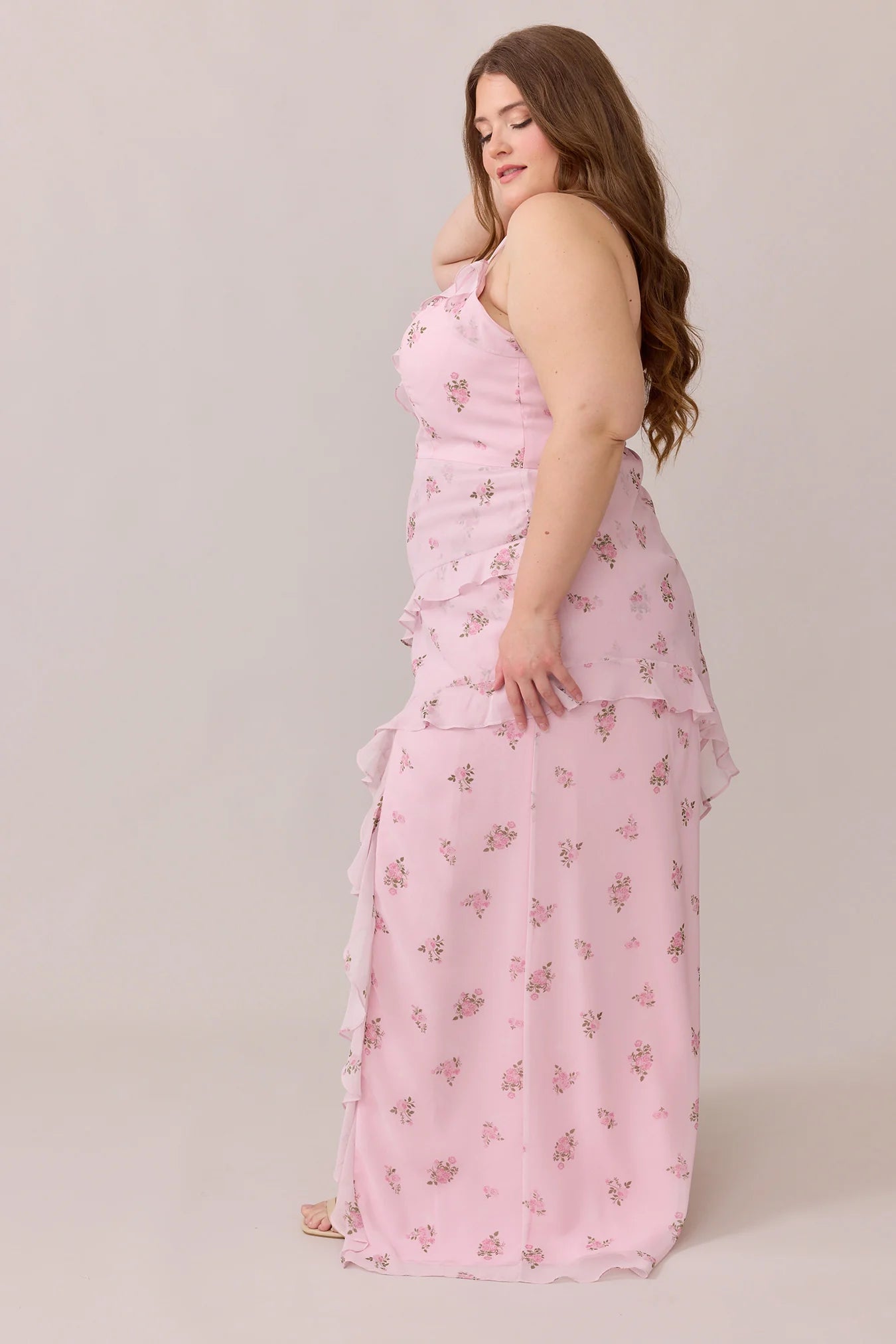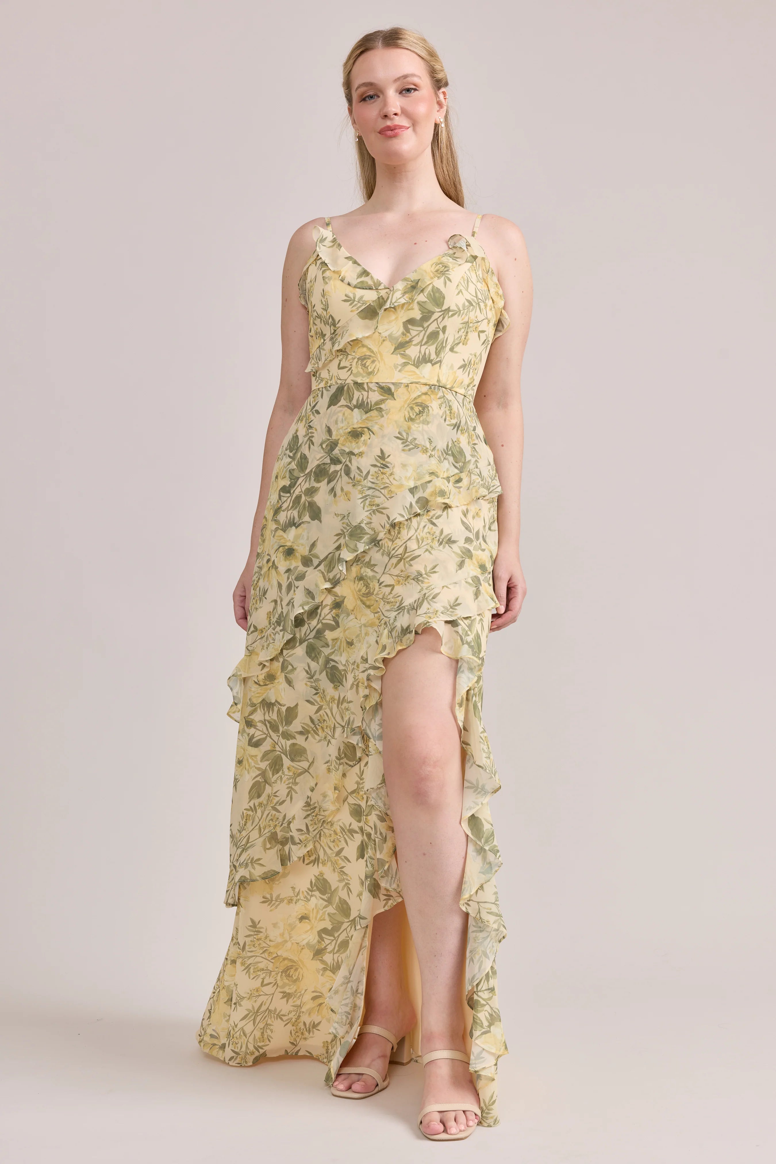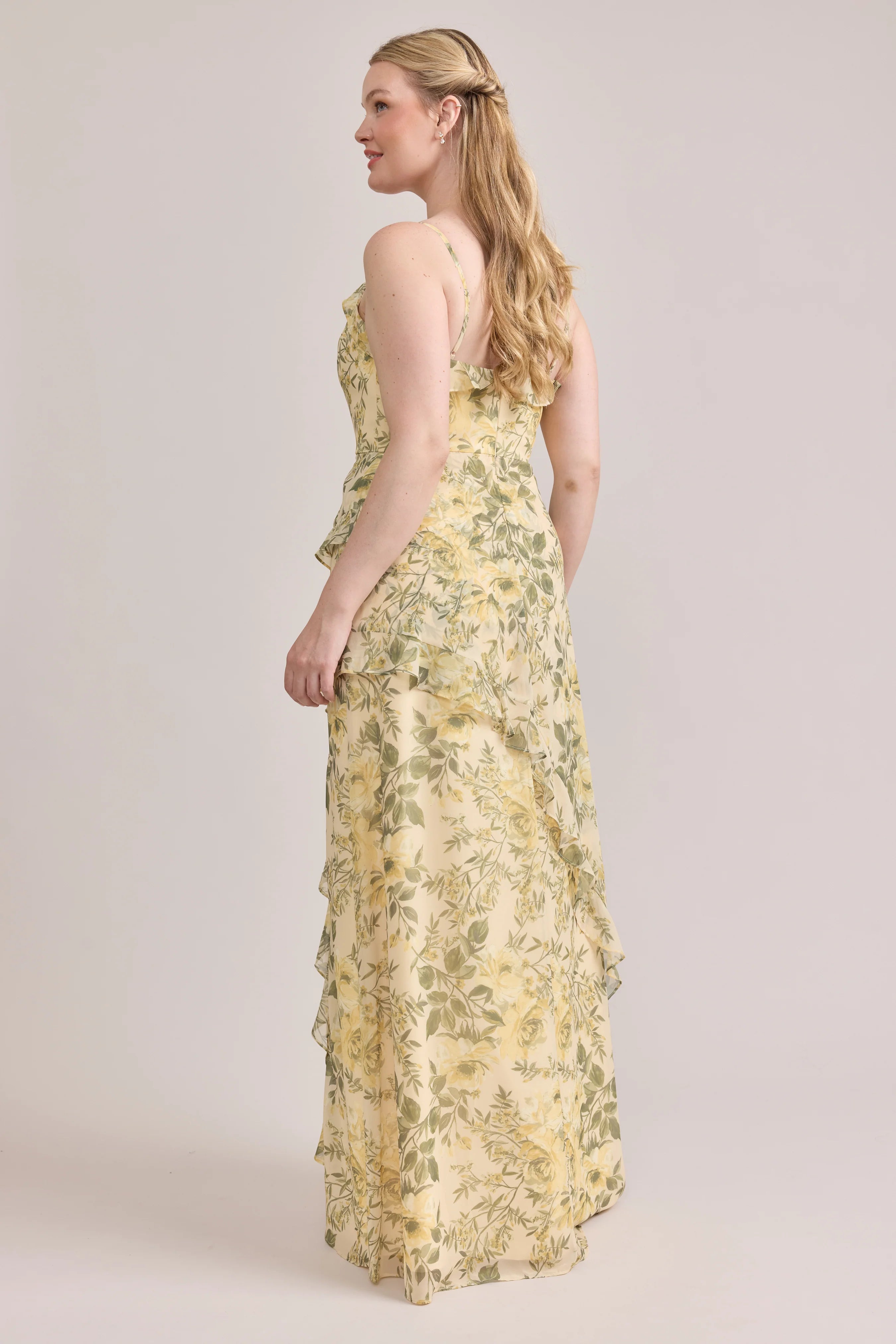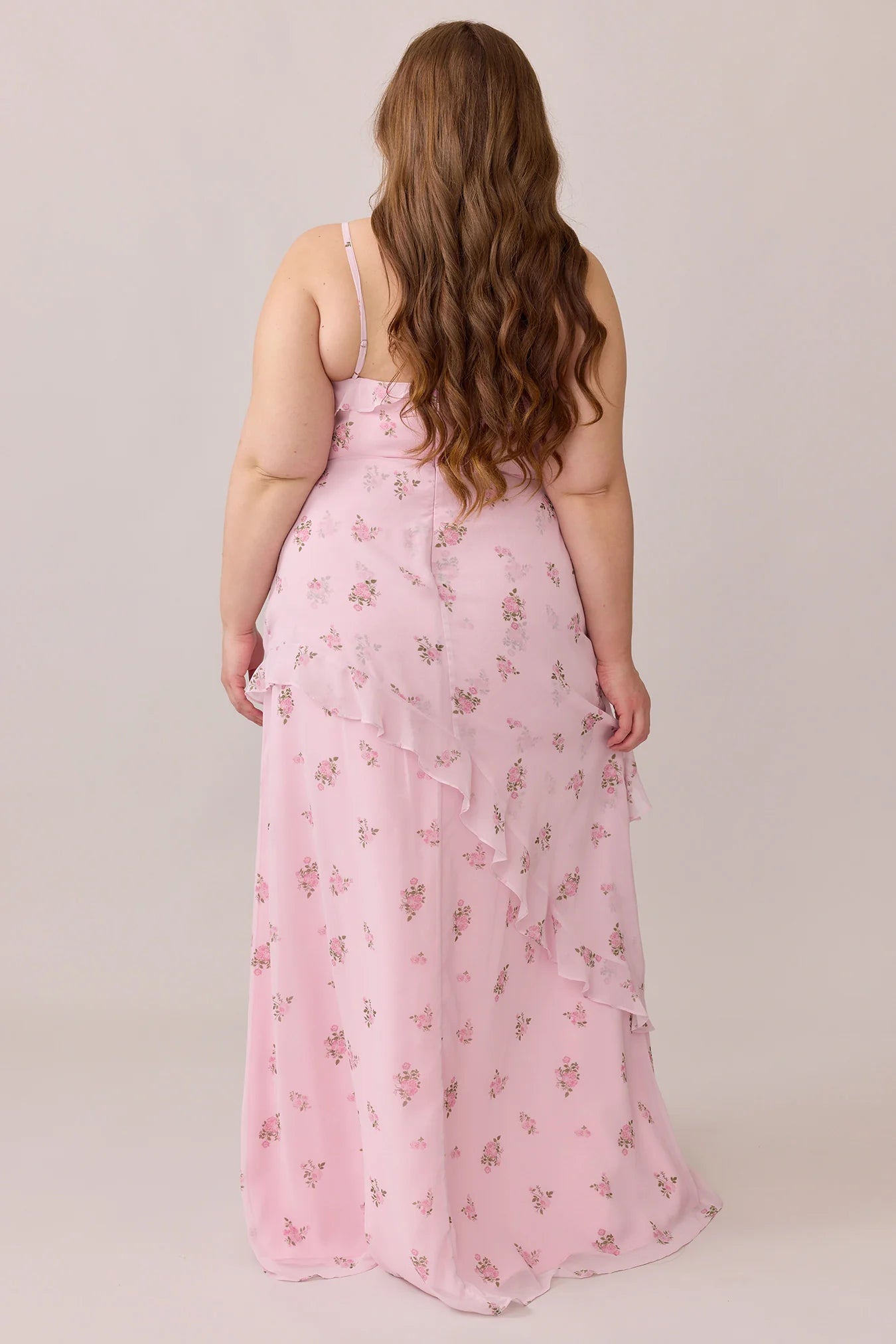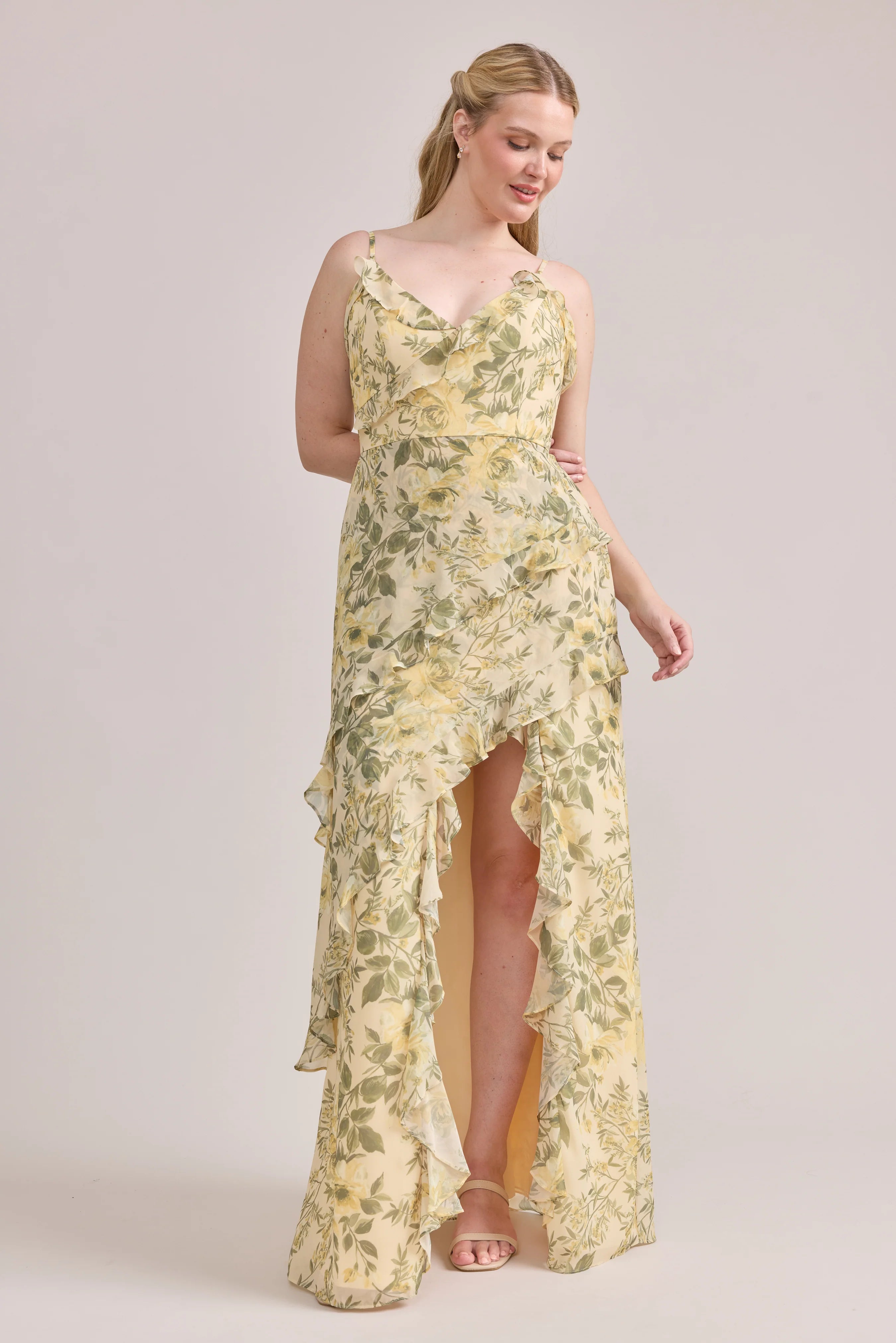 Ellapink will have you smiling the day away with its abundance of ruffles and playful vibes, now available in the new petit rose prints! The Jules Chiffon dress features asymmetrical ruffle details throughout the bodice and skirt. The ruffle lined-slit and multiple layers create tons of movement and texture in every moment, sure to be a stand-out for your wedding line-up!