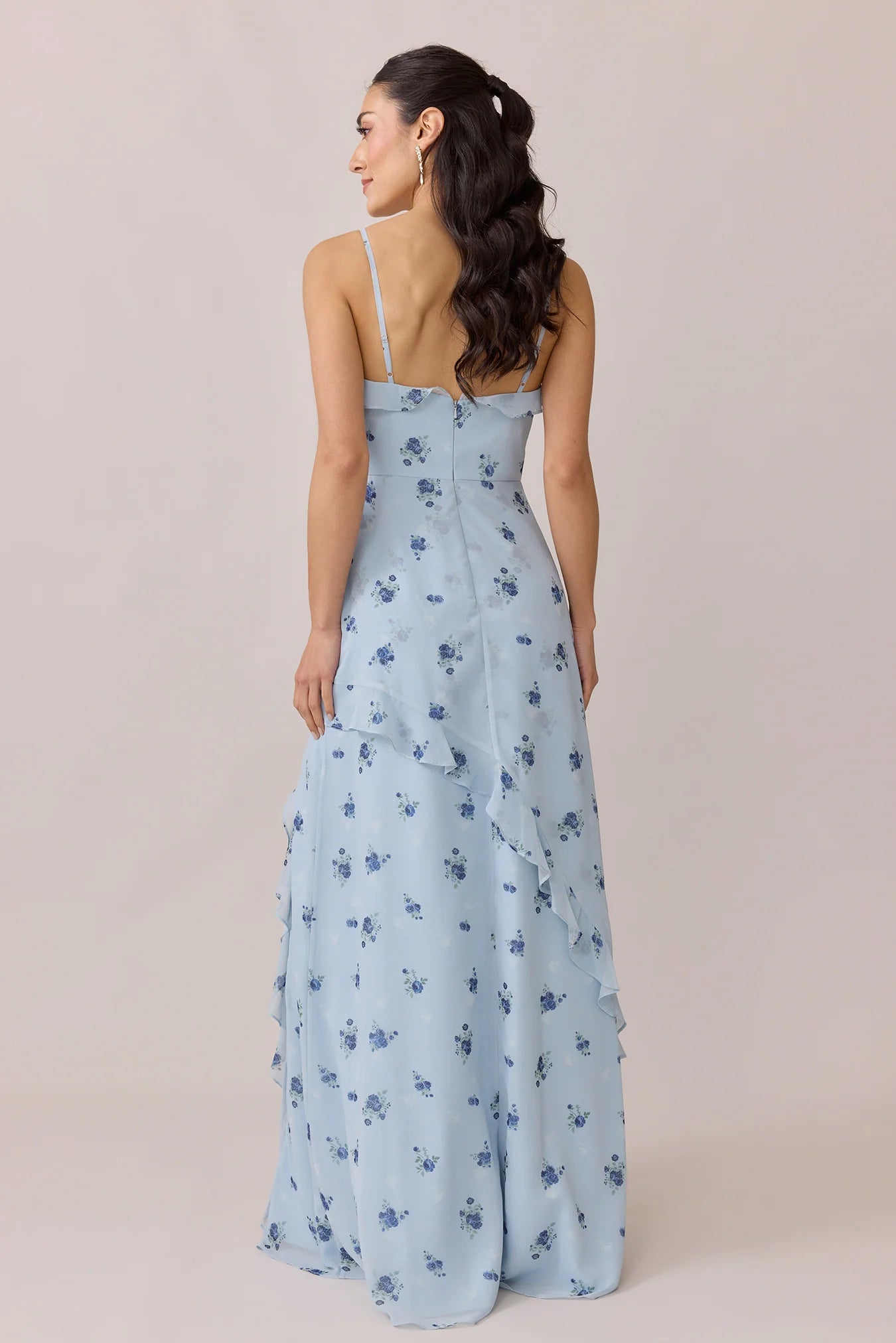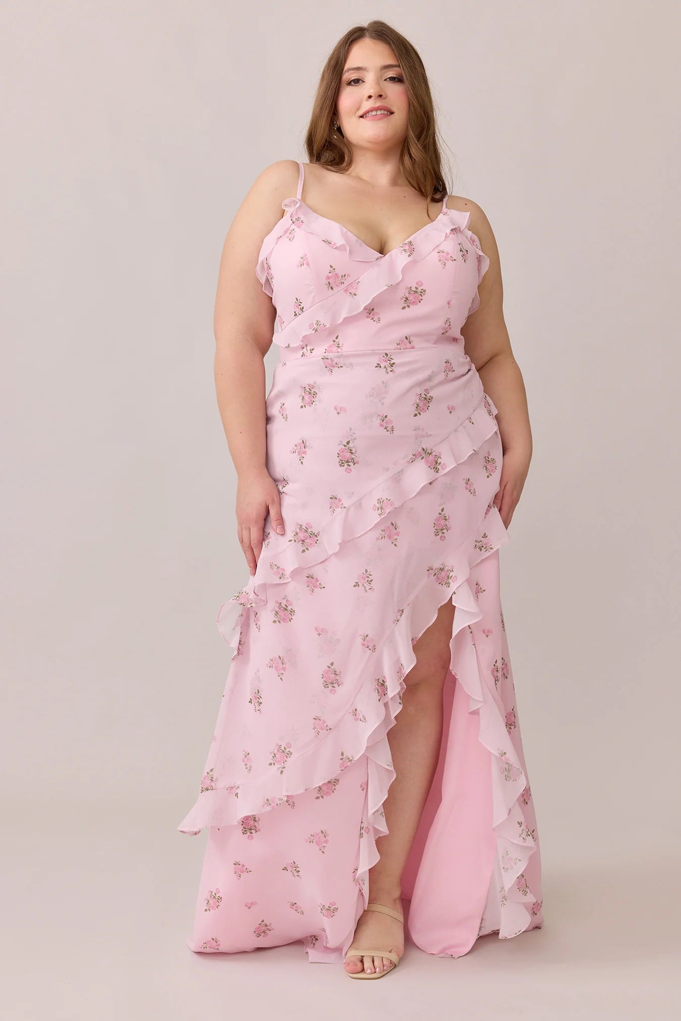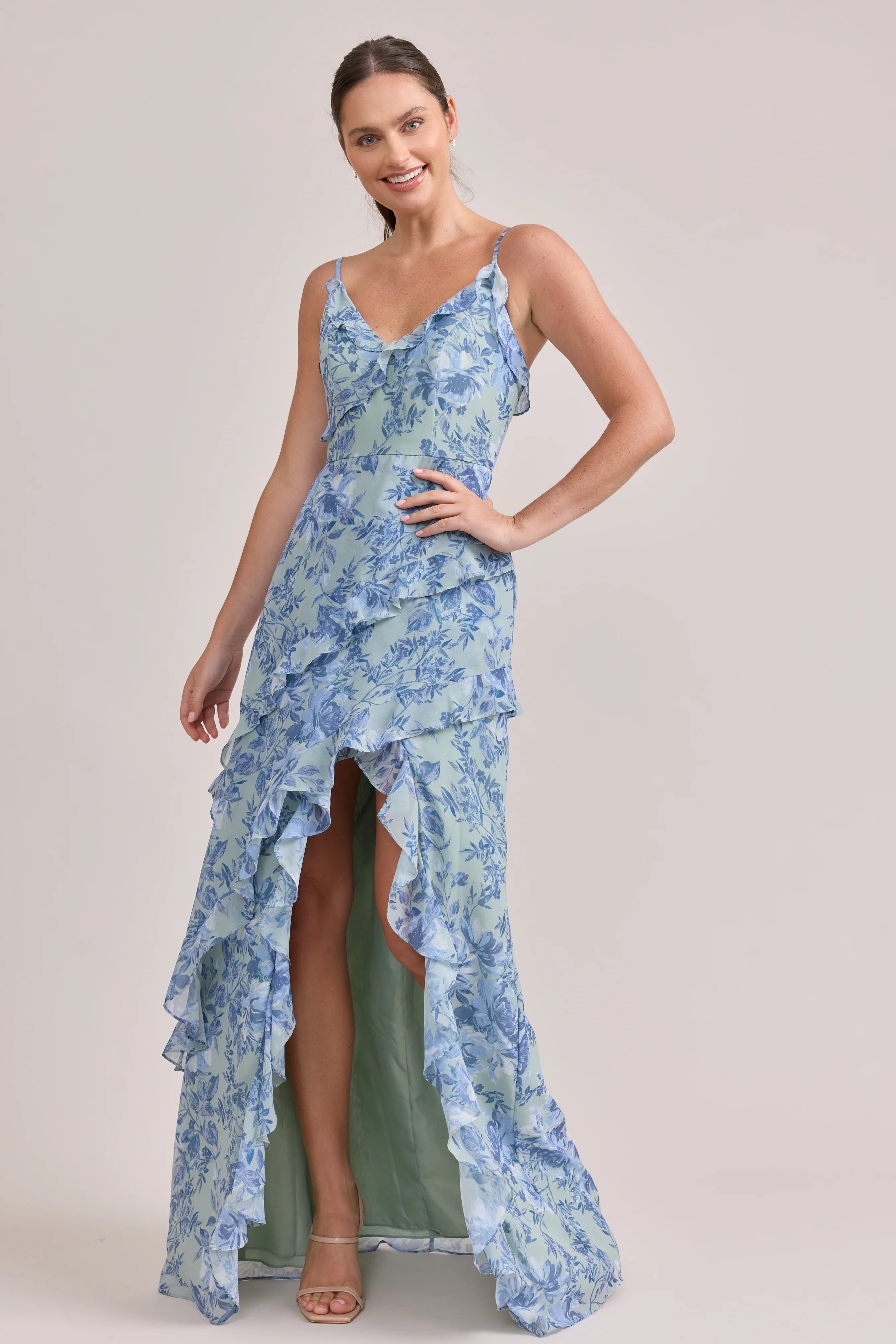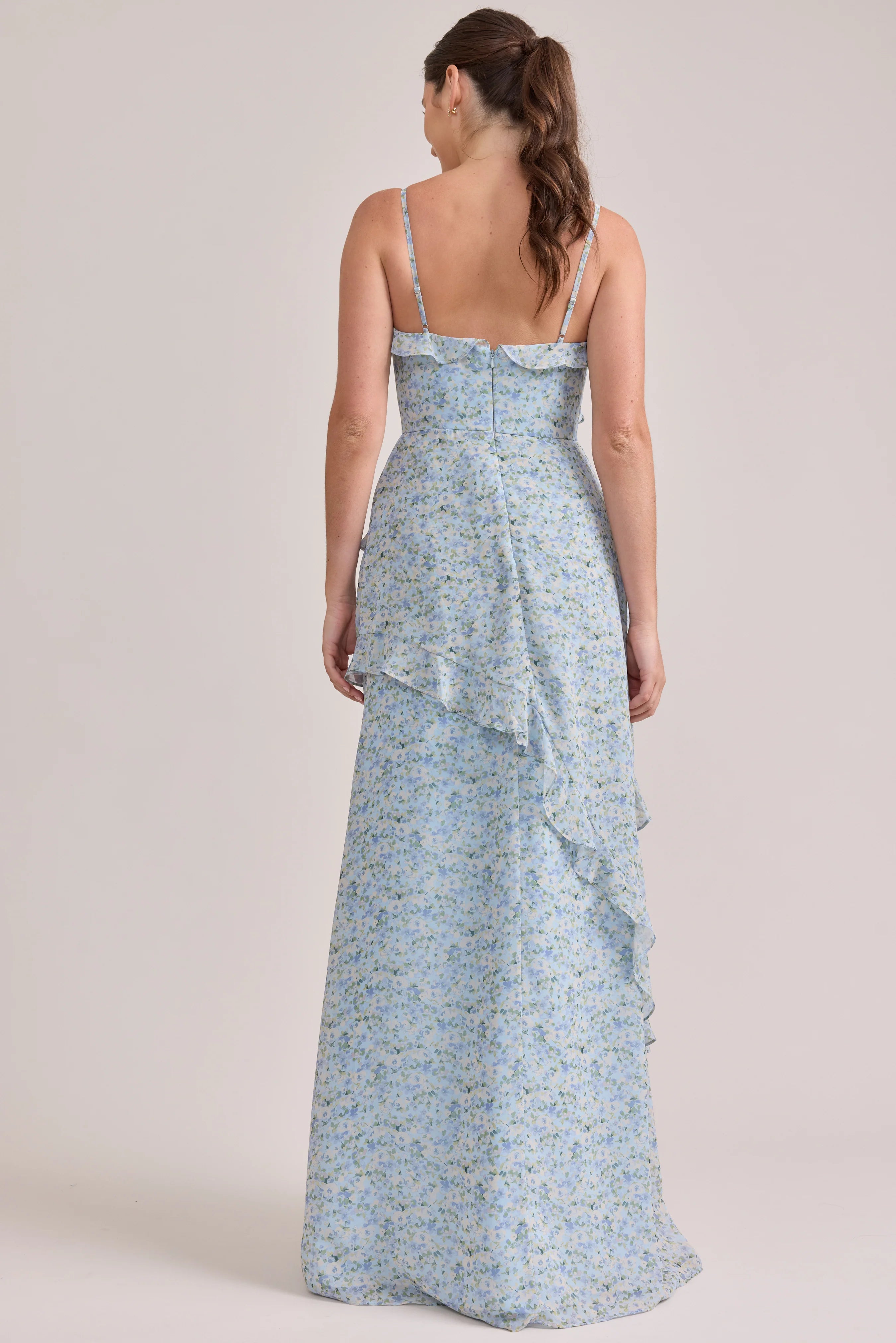 Ellapink will have you smiling the day away with its abundance of ruffles and playful vibes, now available in the new petit rose prints! The Jules Chiffon dress features asymmetrical ruffle details throughout the bodice and skirt. The ruffle lined-slit and multiple layers create tons of movement and texture in every moment, sure to be a stand-out for your wedding line-up!