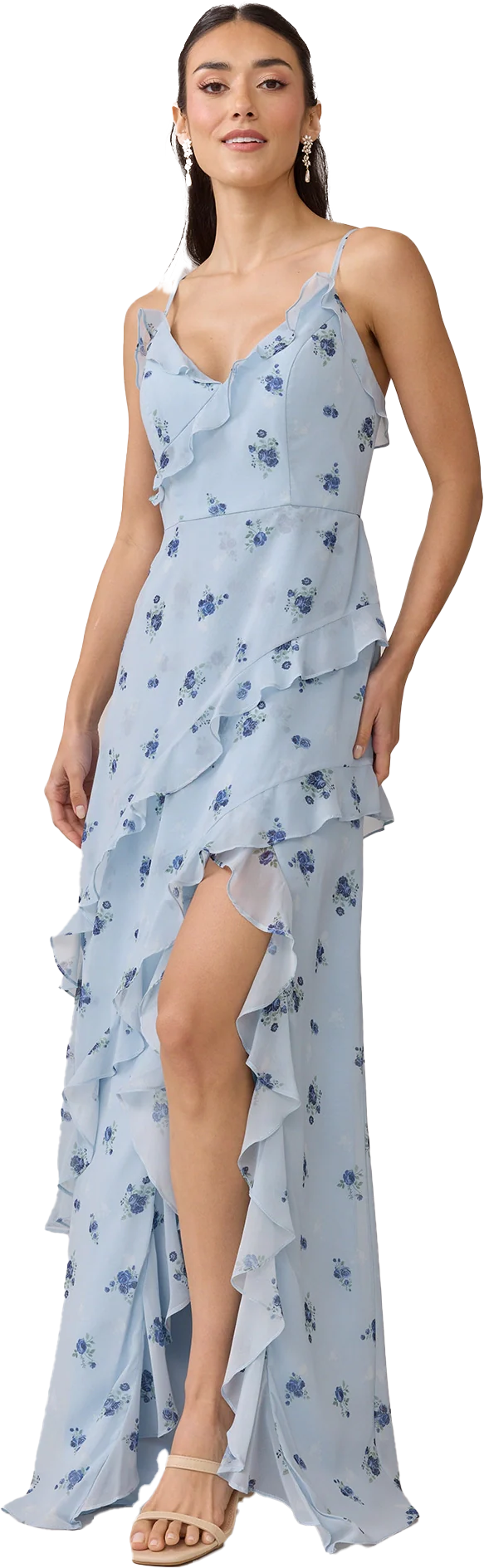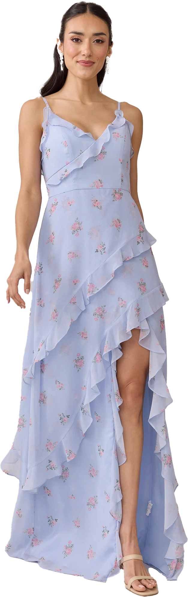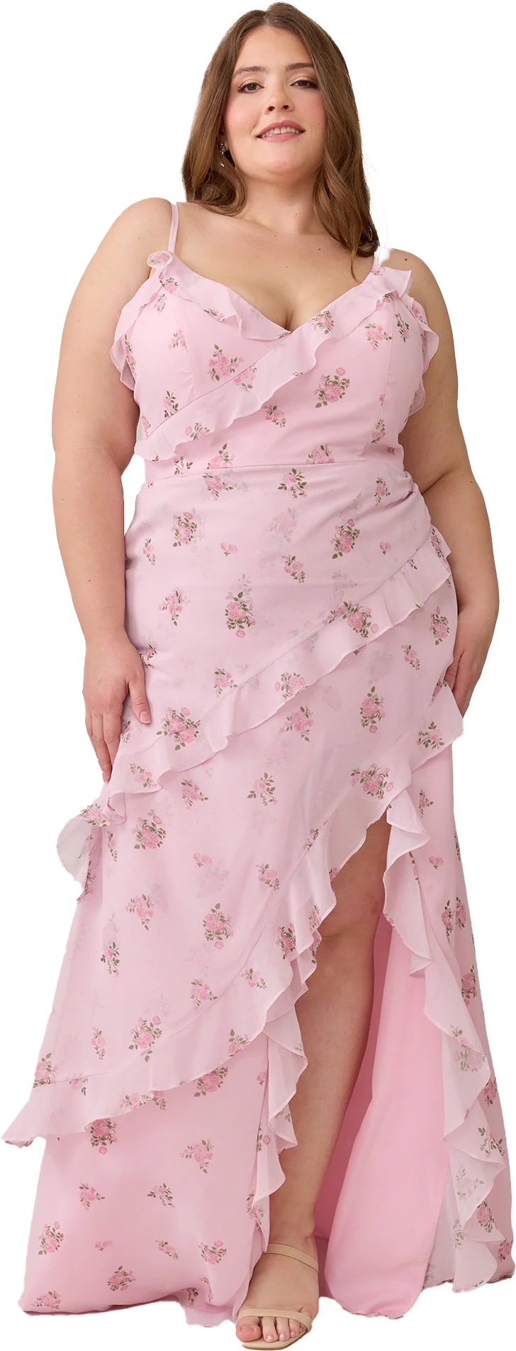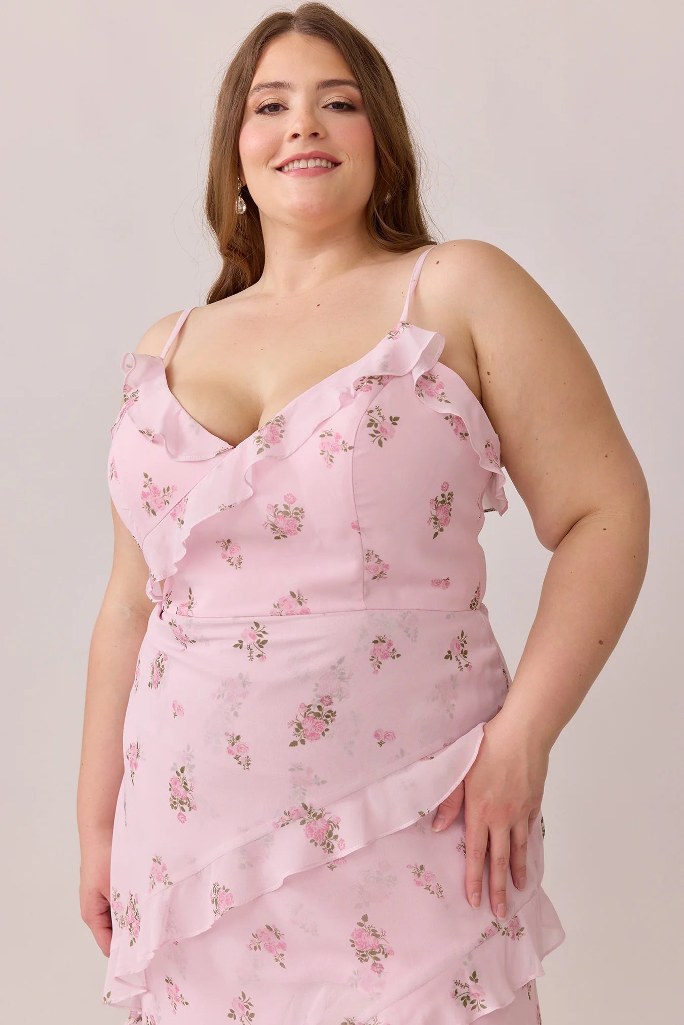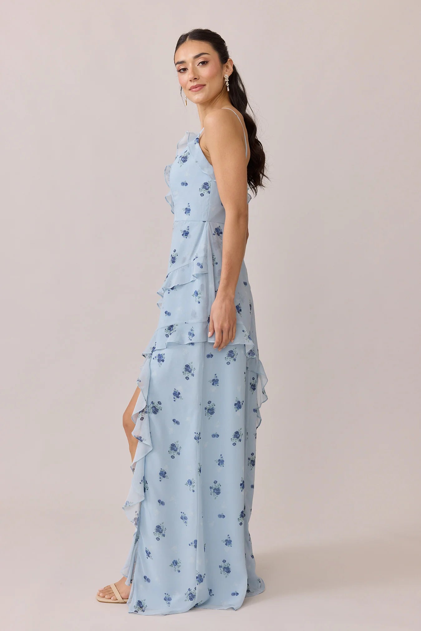 Ellapink will have you smiling the day away with its abundance of ruffles and playful vibes, now available in the new petit rose prints! The Jules Chiffon dress features asymmetrical ruffle details throughout the bodice and skirt. The ruffle lined-slit and multiple layers create tons of movement and texture in every moment, sure to be a stand-out for your wedding line-up!